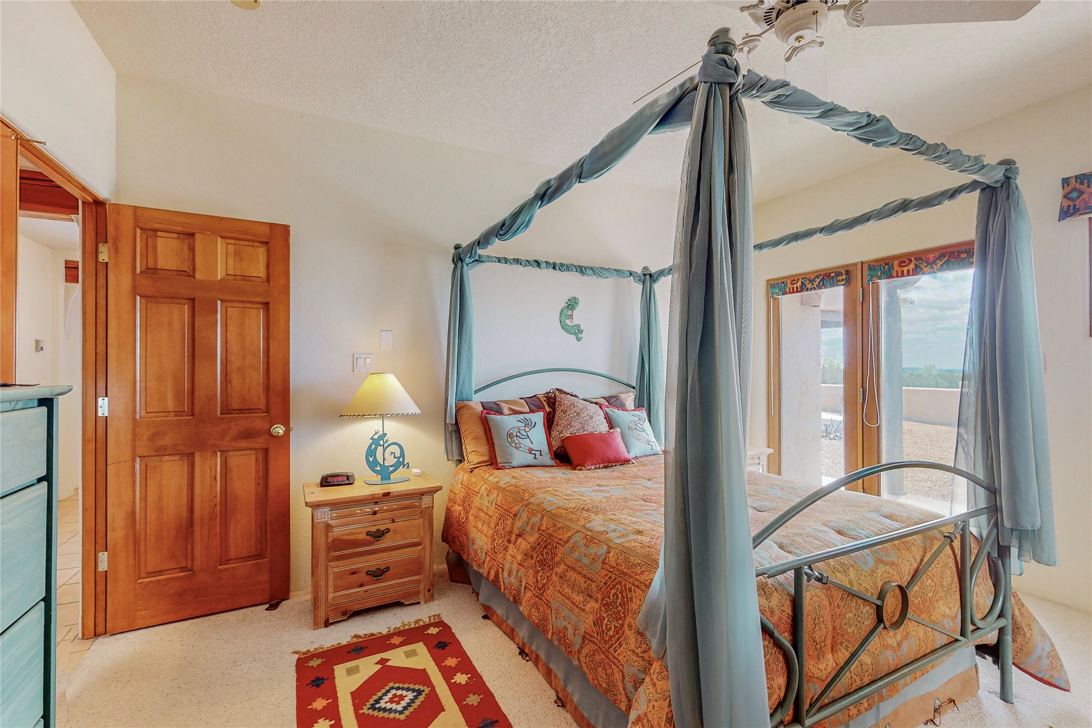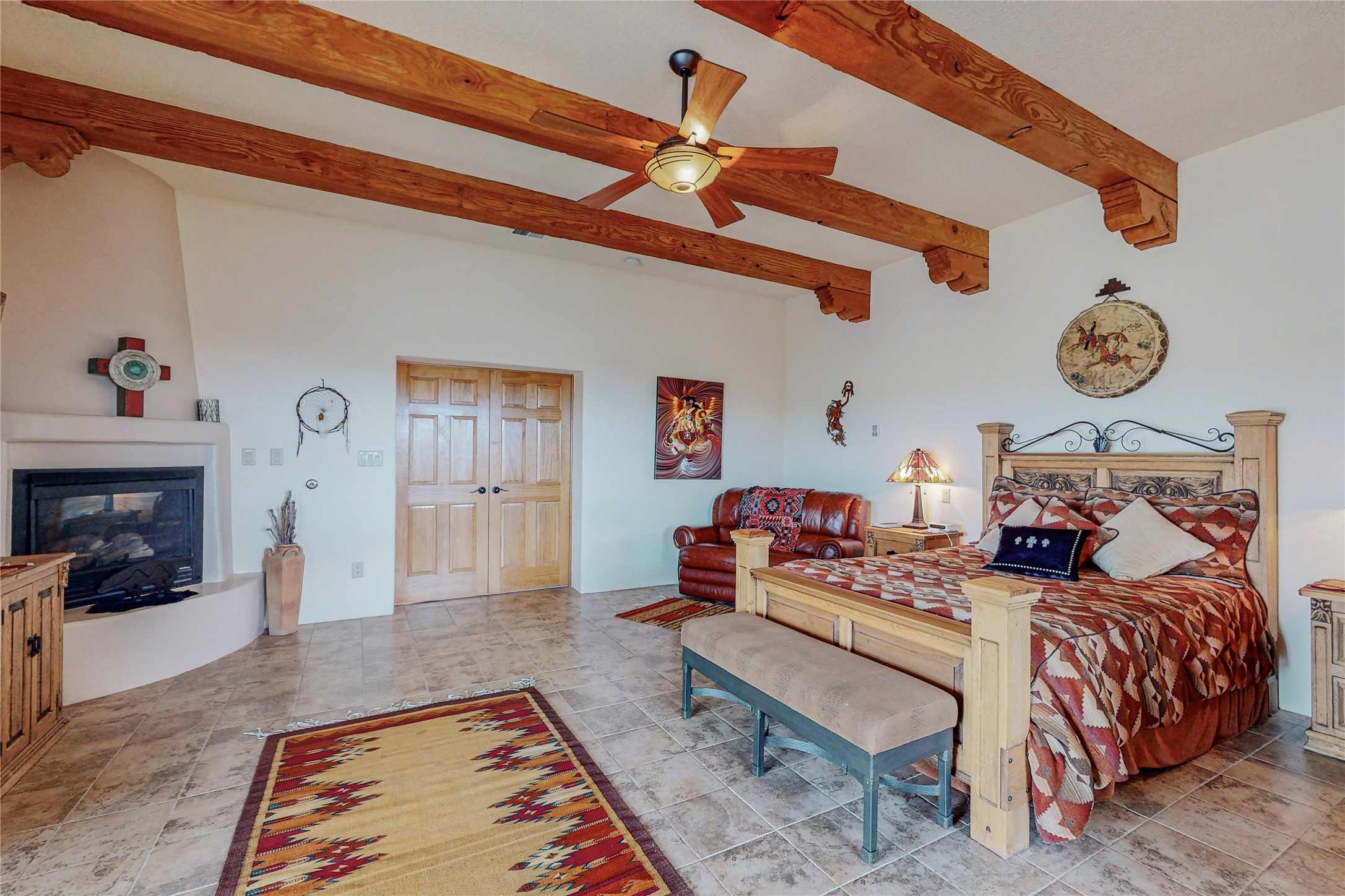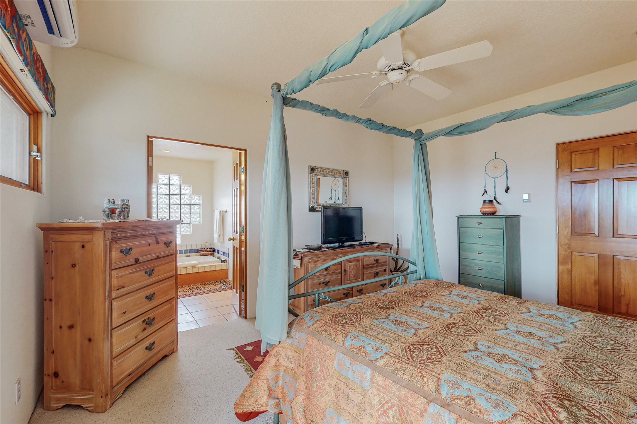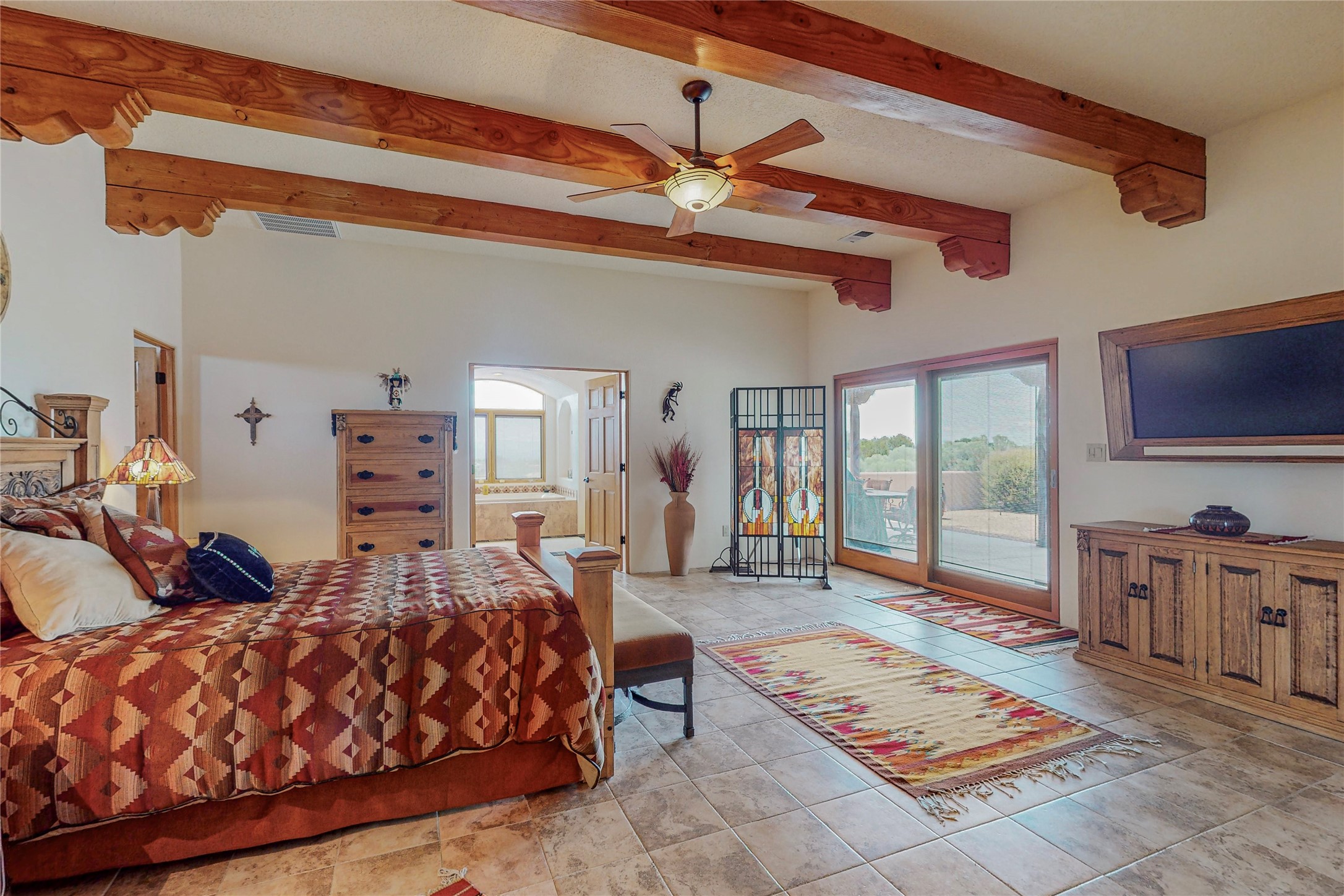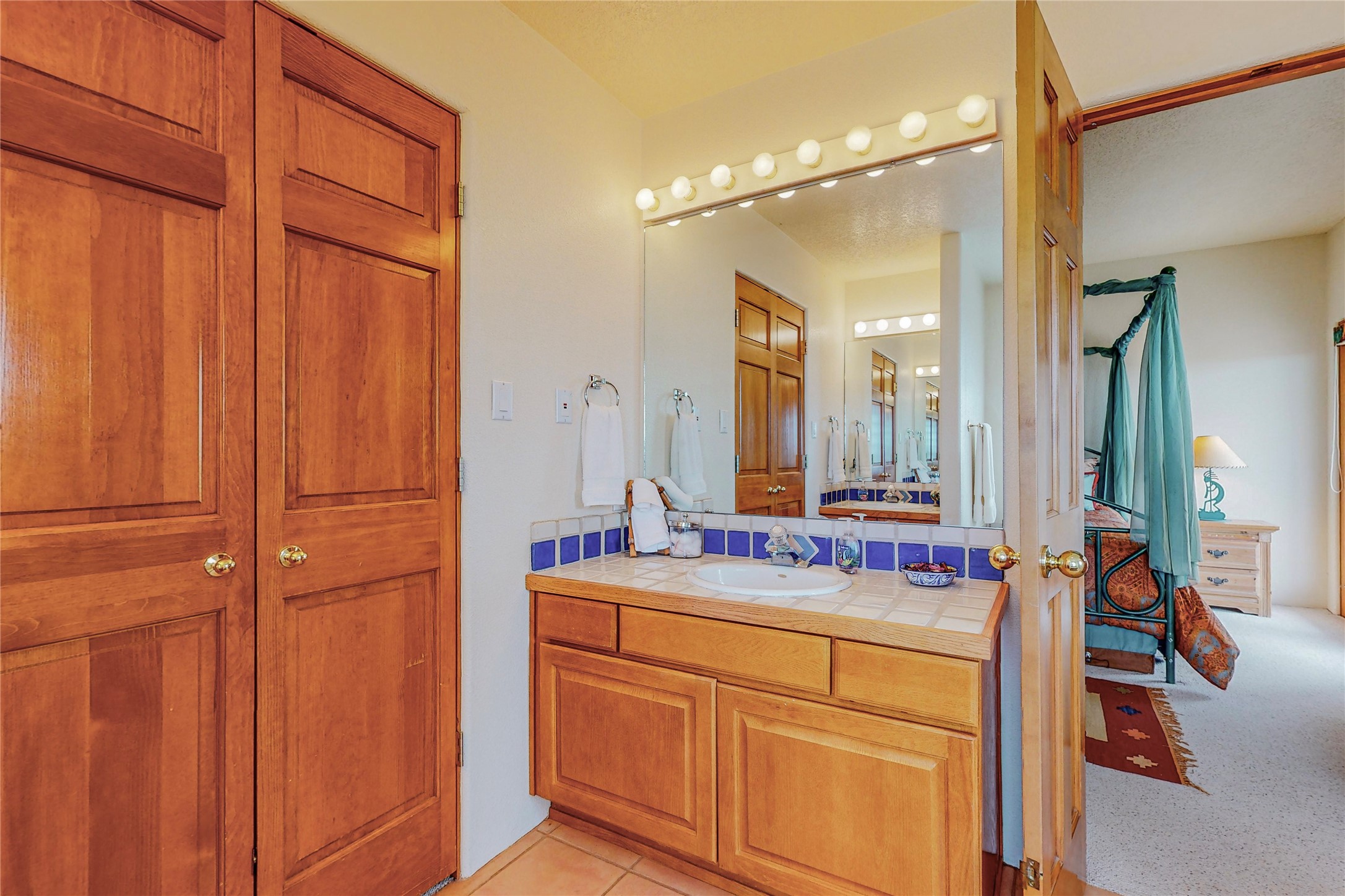 This lovely one owner home was carefully sited and built by Homes by Marie to access expansive mountain views. Lovely light and spacious open plan contemporary pueblo design. The split 3 bedroom design has been enlarged to add a den on one side and an exquisite expansive main bedroom suite with a spa like bathroom and large walk in closet on the other. 3 mini-splits have been added for summer cool, natural gas radiant heating in the original home and gas forced air in the newer wing. A large portal for summer sunset dining overlooking a privately walled garden and an easterly front view portal for early coffee or breakfast. This home is ideally located close to the Eldorado Community Center and amenities, 2 local shopping centers, a school, library and senior center. It is on a paved road close to the exits making it an easy few minutes into Santa Fe or to the train station in historic Lamy village.