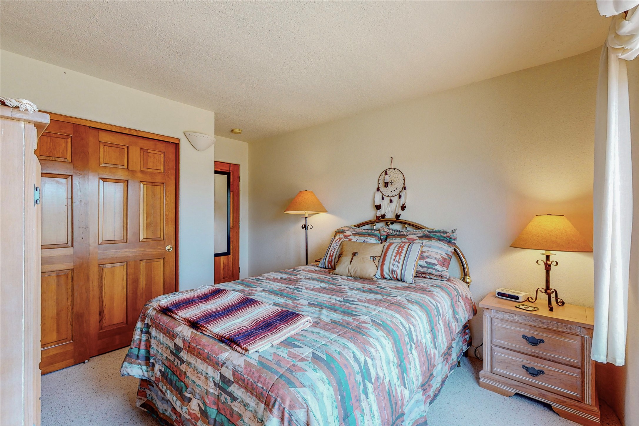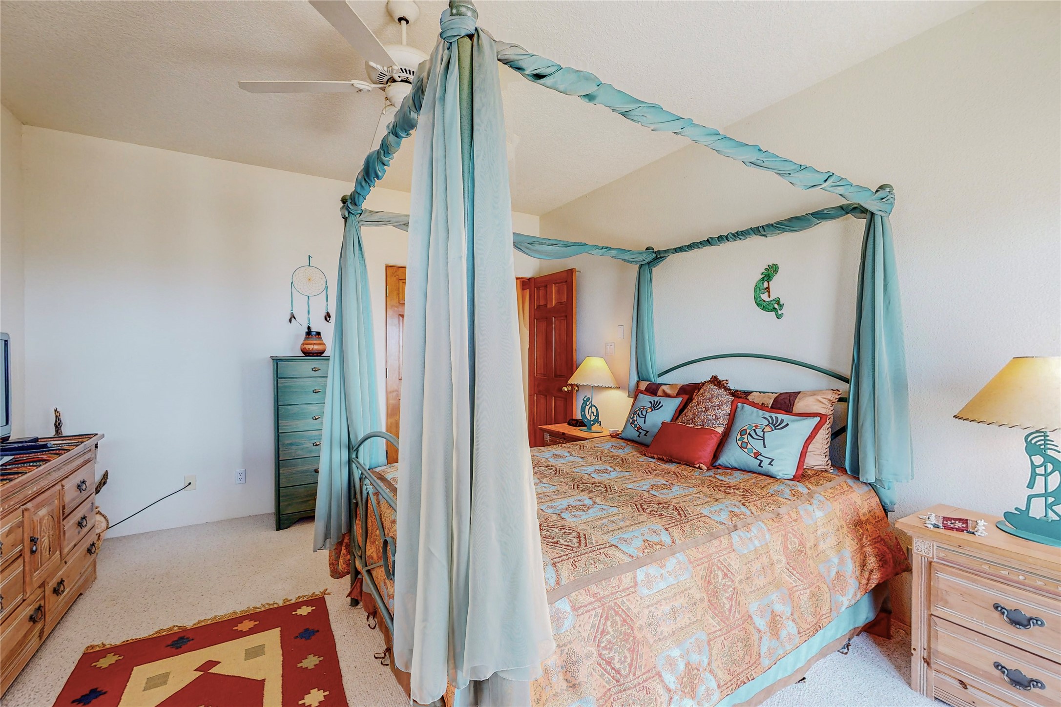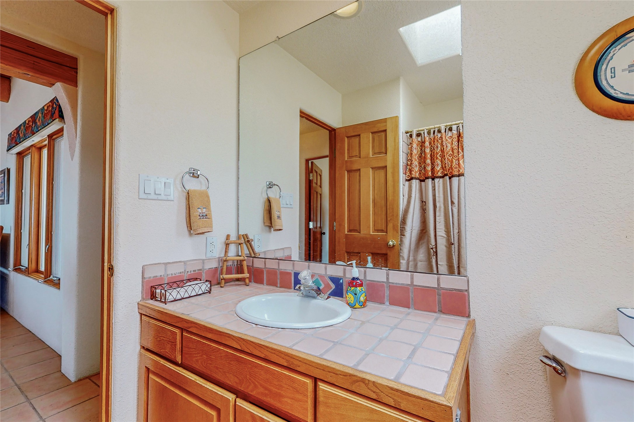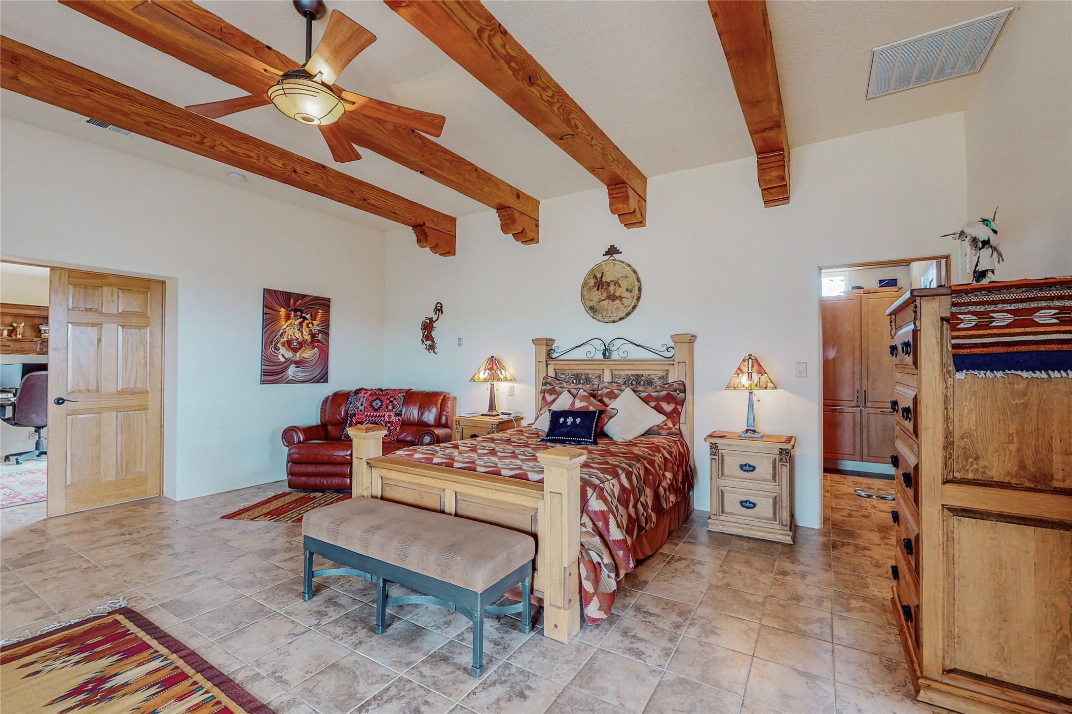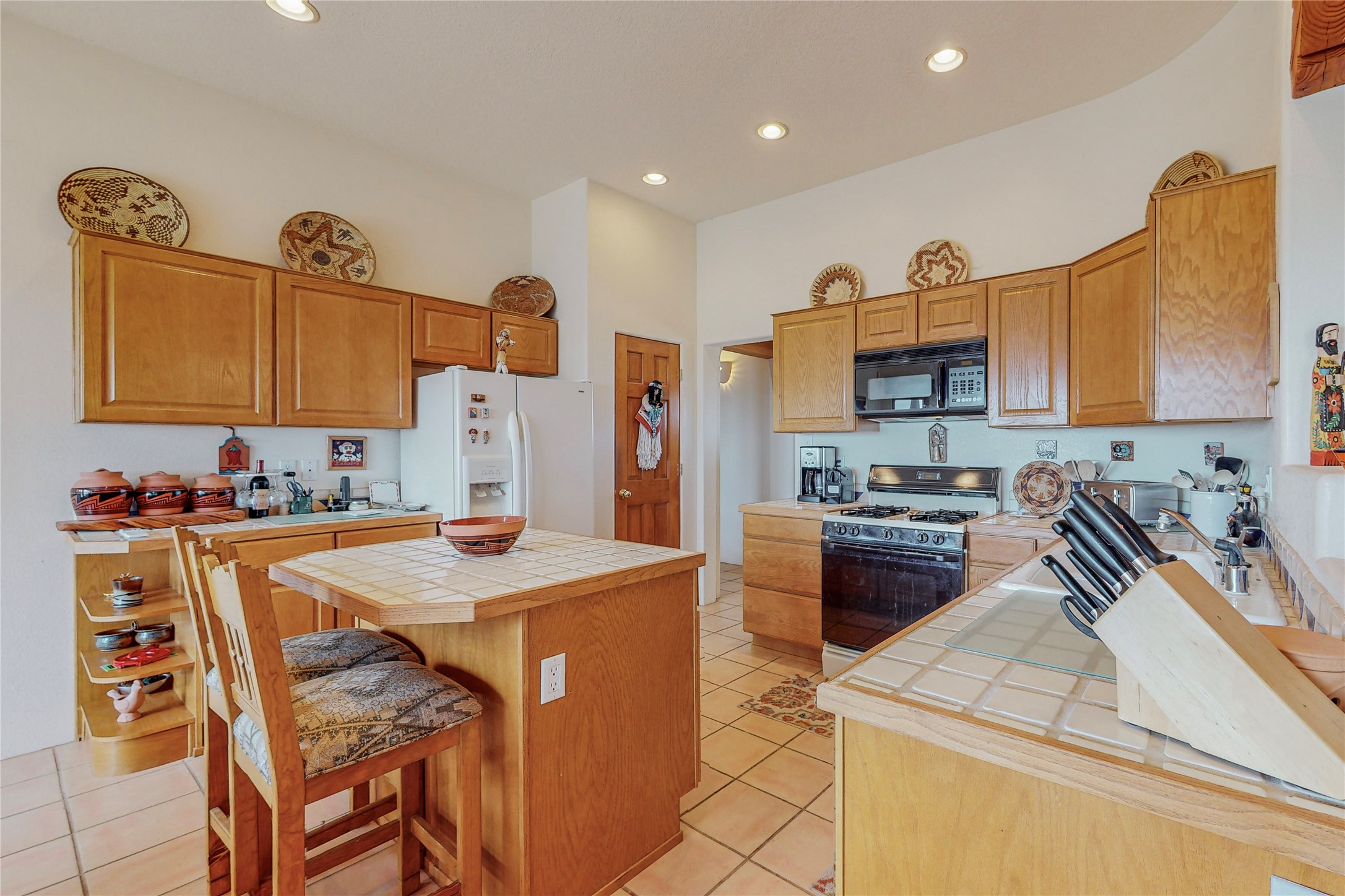 This lovely one owner home was carefully sited and built by Homes by Marie to access expansive mountain views. Lovely light and spacious open plan contemporary pueblo design. The split 3 bedroom design has been enlarged to add a den on one side and an exquisite expansive main bedroom suite with a spa like bathroom and large walk in closet on the other. 3 mini-splits have been added for summer cool, natural gas radiant heating in the original home and gas forced air in the newer wing. A large portal for summer sunset dining overlooking a privately walled garden and an easterly front view portal for early coffee or breakfast. This home is ideally located close to the Eldorado Community Center and amenities, 2 local shopping centers, a school, library and senior center. It is on a paved road close to the exits making it an easy few minutes into Santa Fe or to the train station in historic Lamy village.