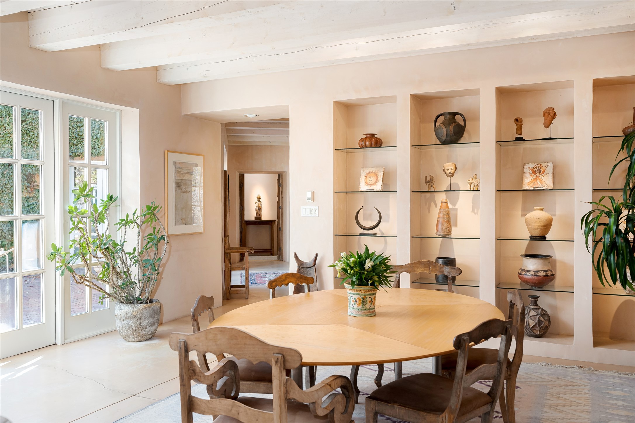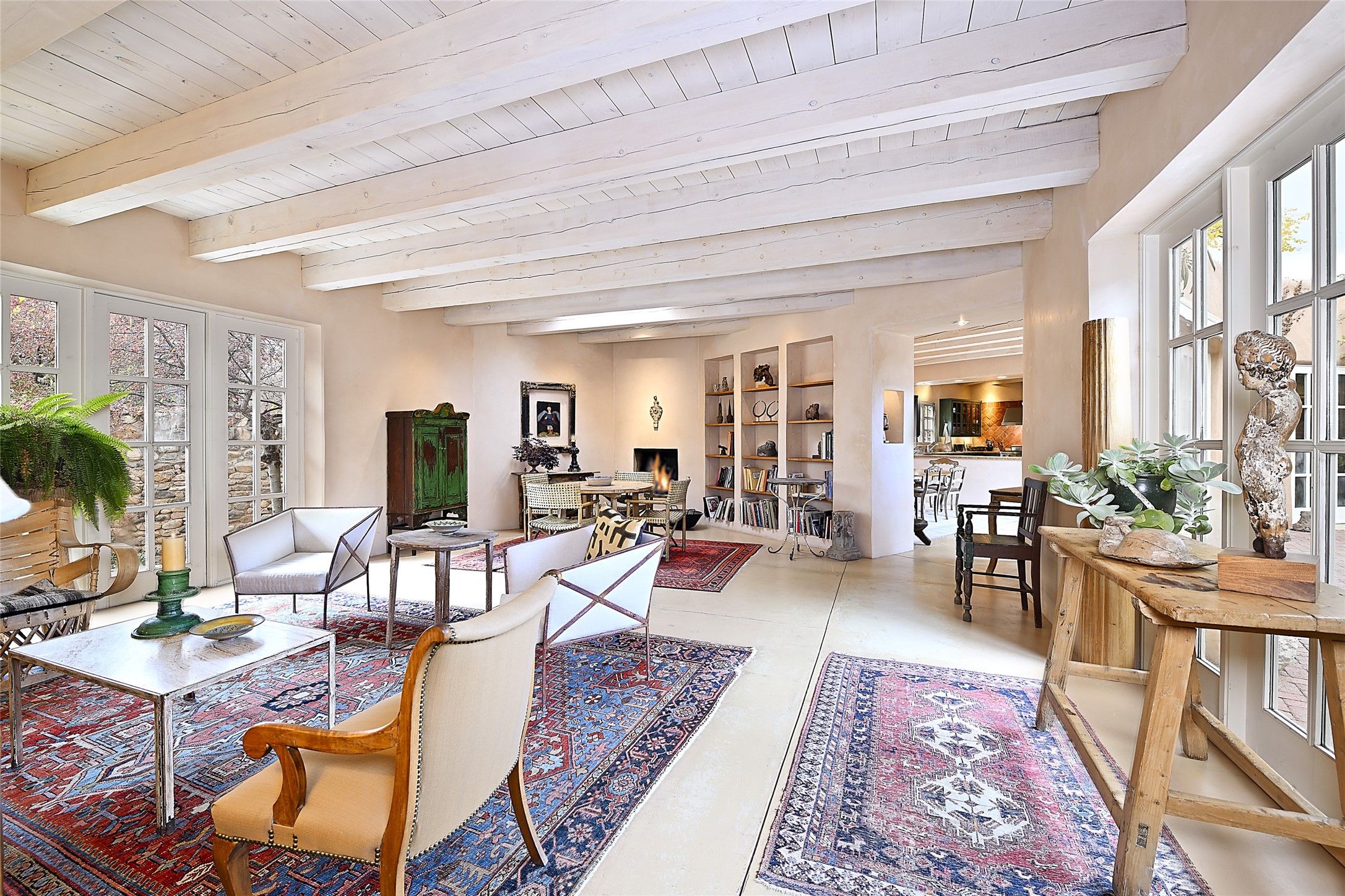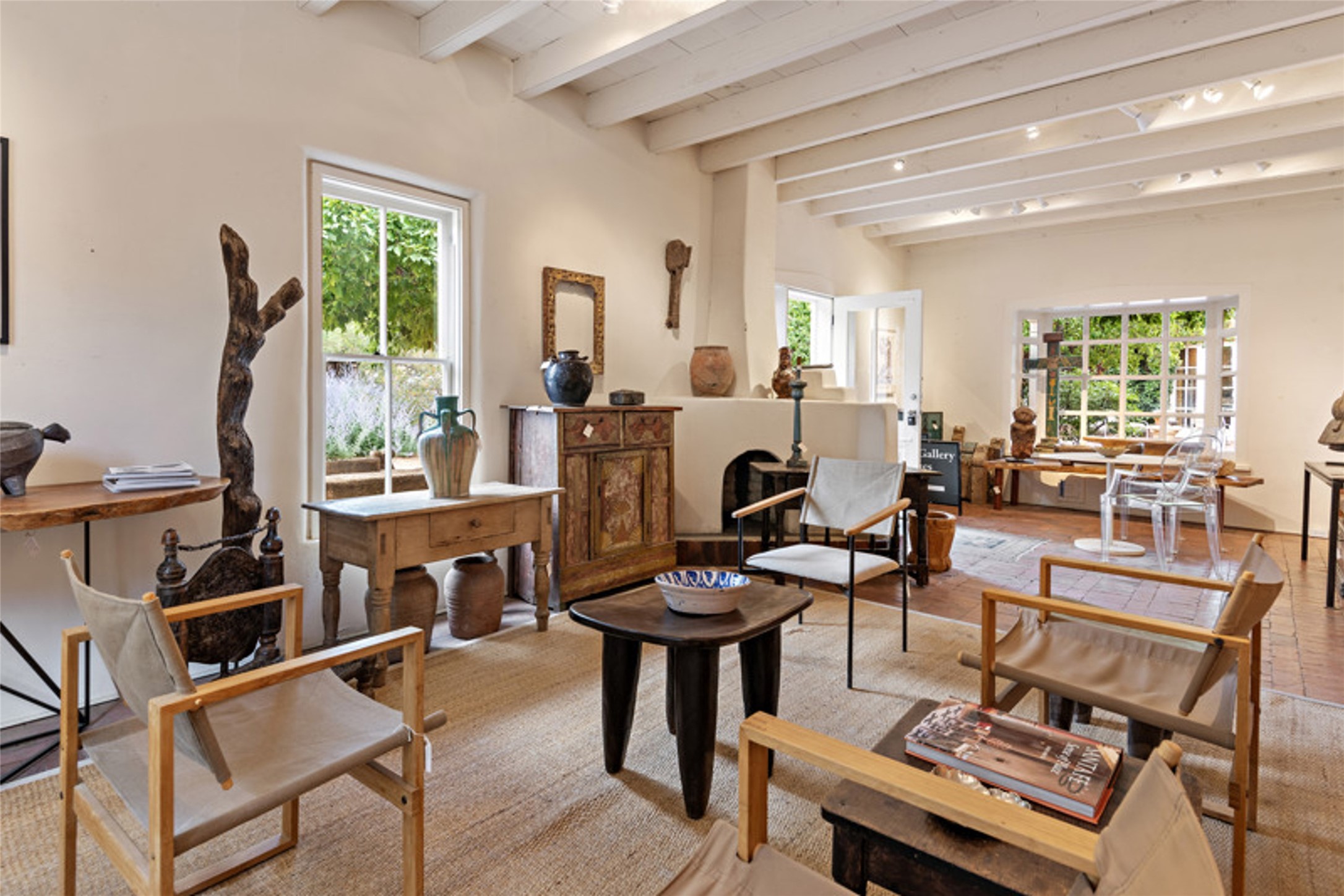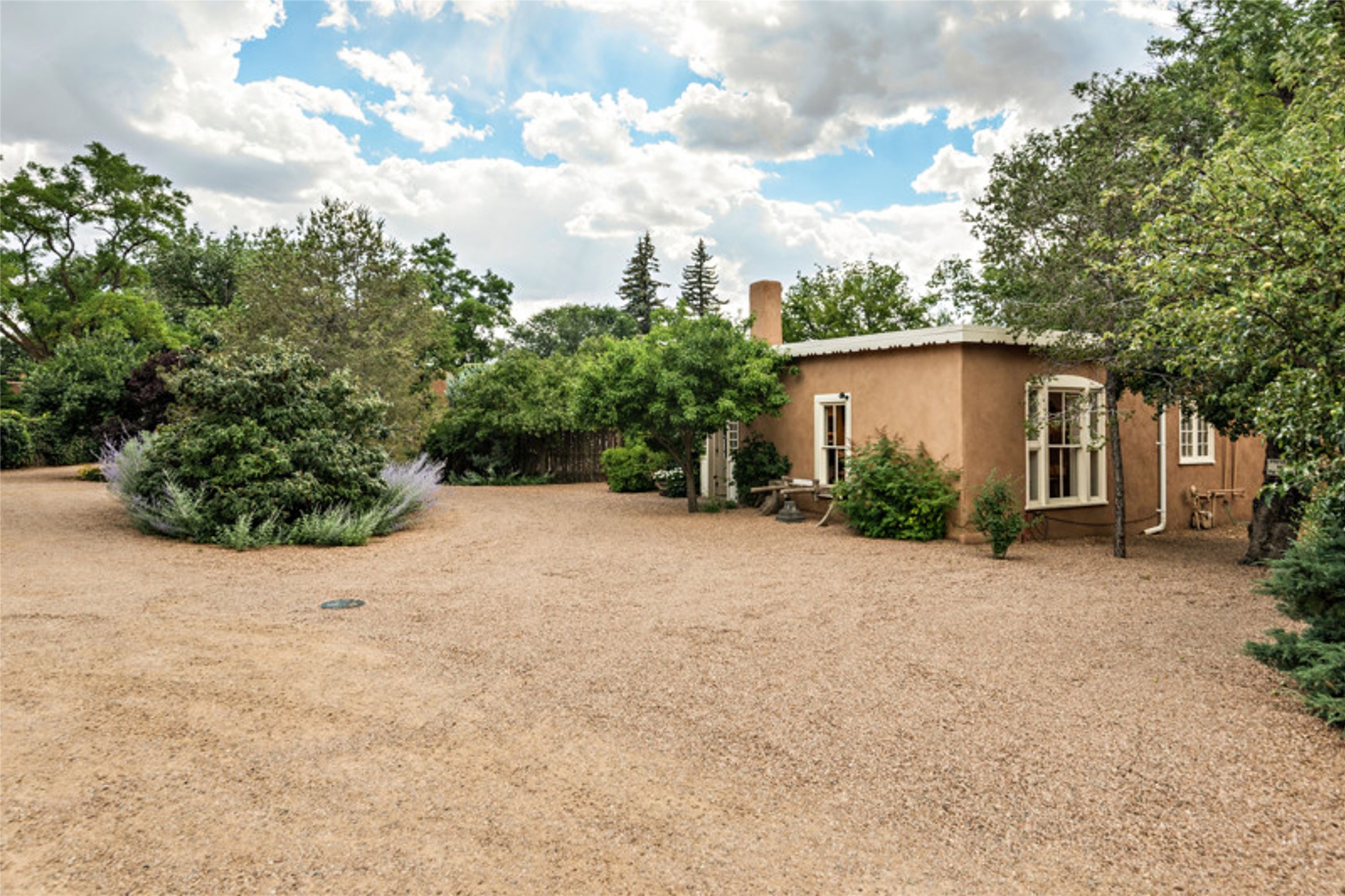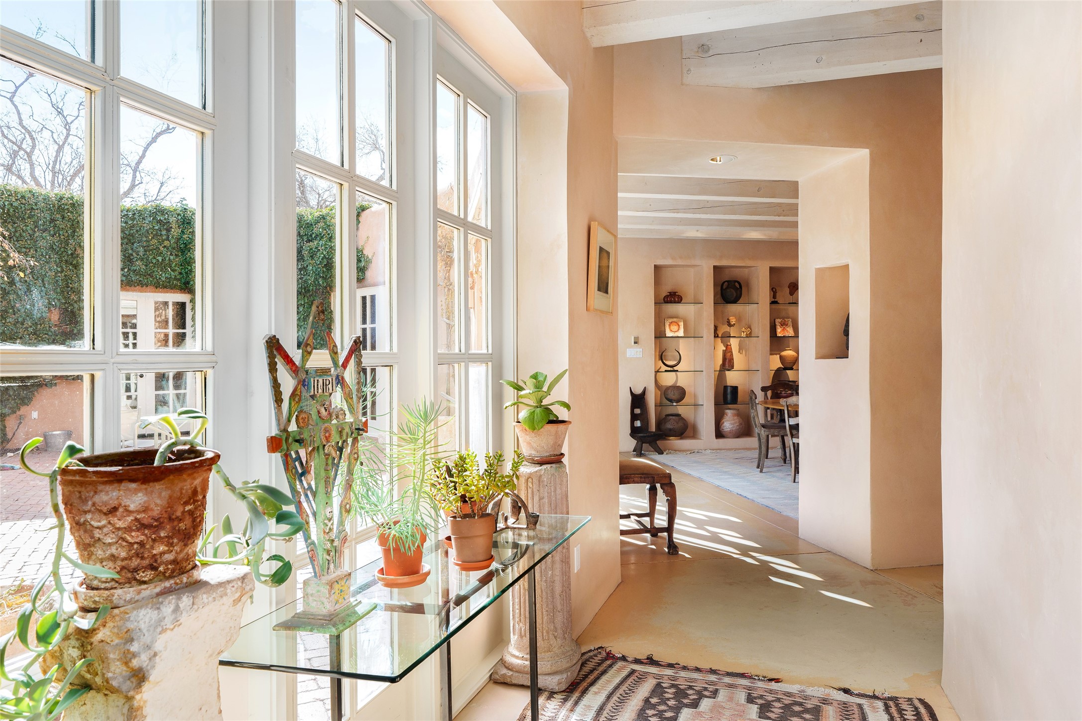 Home of the noted collector and beloved Santa Fe icon , the late Omer Claiborne- this lovely compound is tucked down a quiet lane off Canyon Road. The original home and guest house were built by Agnes Sims in 1947- 1948 . Omer designed the elegant main house in 1997 , attaching it to the original structure . This single level home has a clean , modernist aesthetic and features many architectural details , including lighted , recessed shelves for his museum quality artifacts , multiple fireplaces , concrete floors , French doors throughout , and 12' beamed ceilings. The 2 bedroom main house opens to a gracious entry courtyard, and flows seamlessly into the original house. The original adobe building is currently used as a gallery but can easily be converted into 2 bedrooms with an existing bath and a sitting area. The detached guest house is accessed through a brick courtyard , and offers privacy and charm. The established landscaping ,coveted location and flexible spaces add to the magic of this special property.