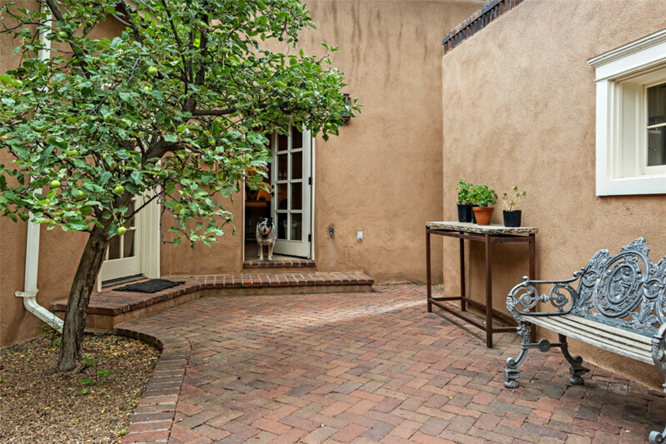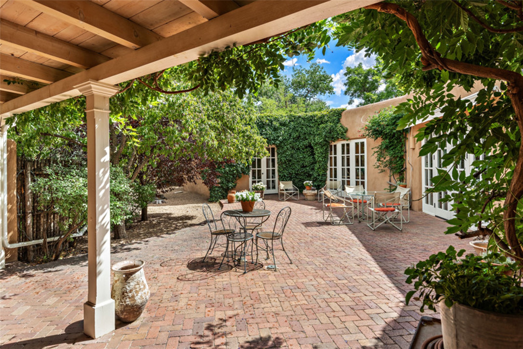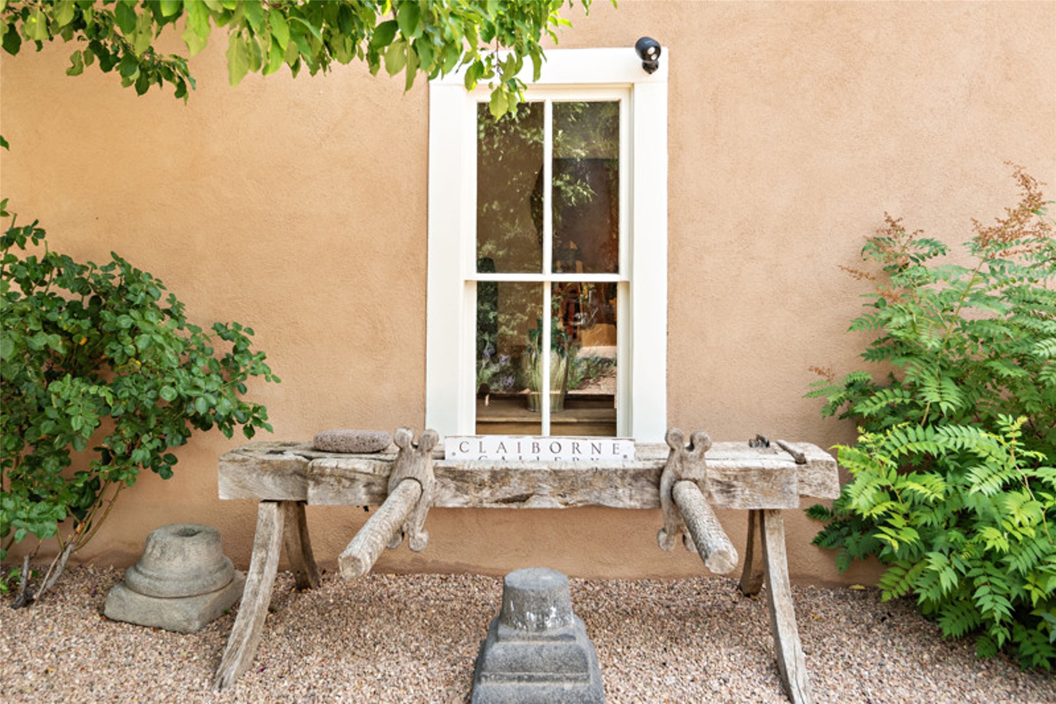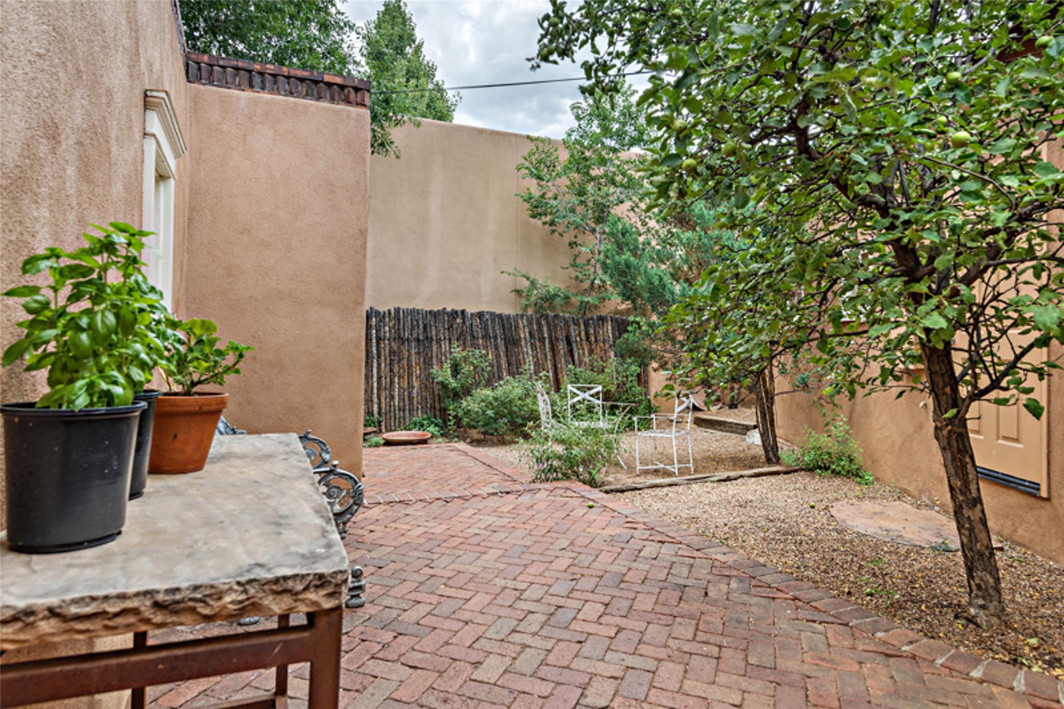 Home of the noted collector and beloved Santa Fe icon , the late Omer Claiborne- this lovely compound is tucked down a quiet lane off Canyon Road. The original home and guest house were built by Agnes Sims in 1947- 1948 . Omer designed the elegant main house in 1997 , attaching it to the original structure . This single level home has a clean , modernist aesthetic and features many architectural details , including lighted , recessed shelves for his museum quality artifacts , multiple fireplaces , concrete floors , French doors throughout , and 12' beamed ceilings. The 2 bedroom main house opens to a gracious entry courtyard, and flows seamlessly into the original house. The original adobe building is currently used as a gallery but can easily be converted into 2 bedrooms with an existing bath and a sitting area. The detached guest house is accessed through a brick courtyard , and offers privacy and charm. The established landscaping ,coveted location and flexible spaces add to the magic of this special property.