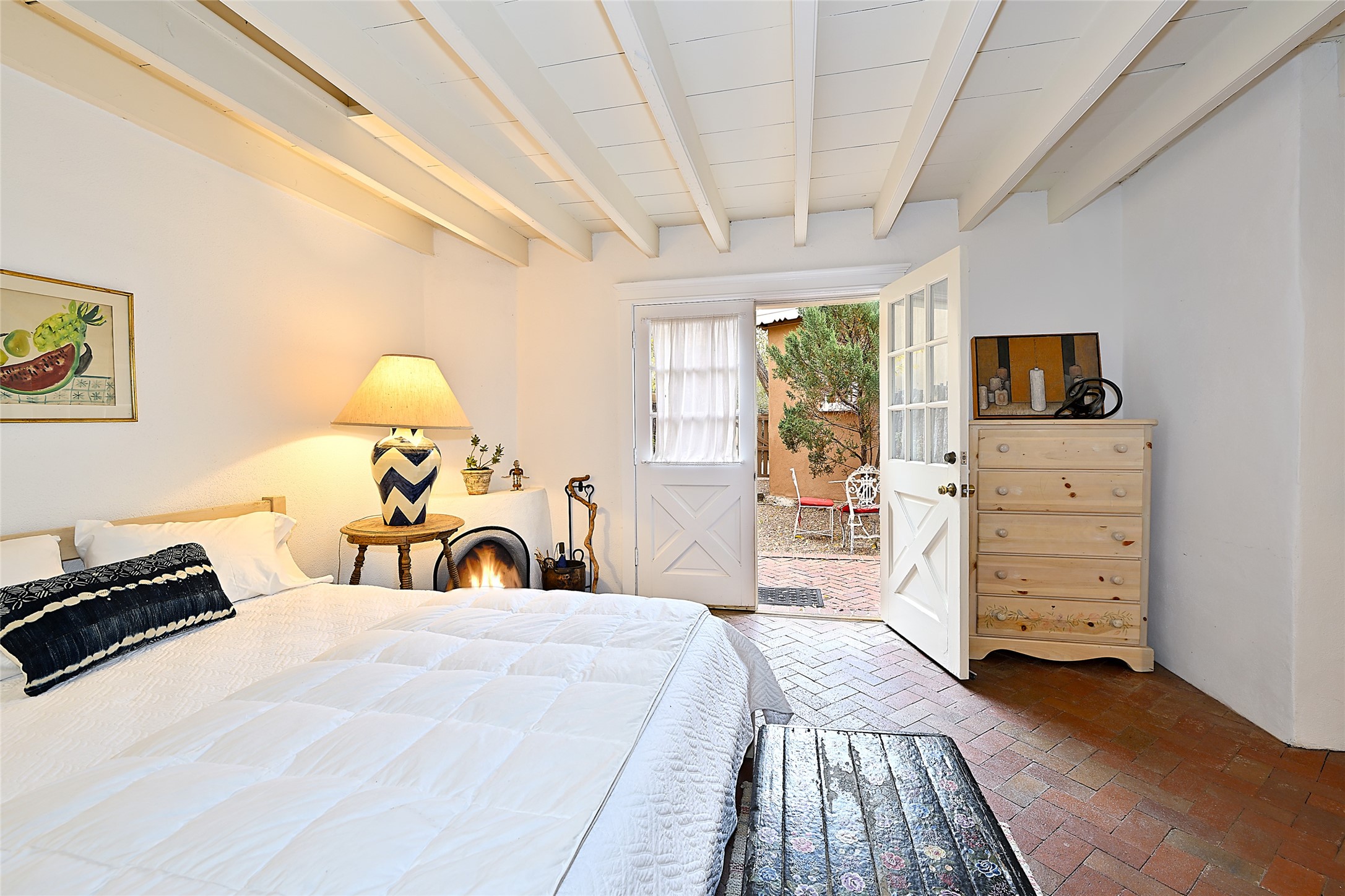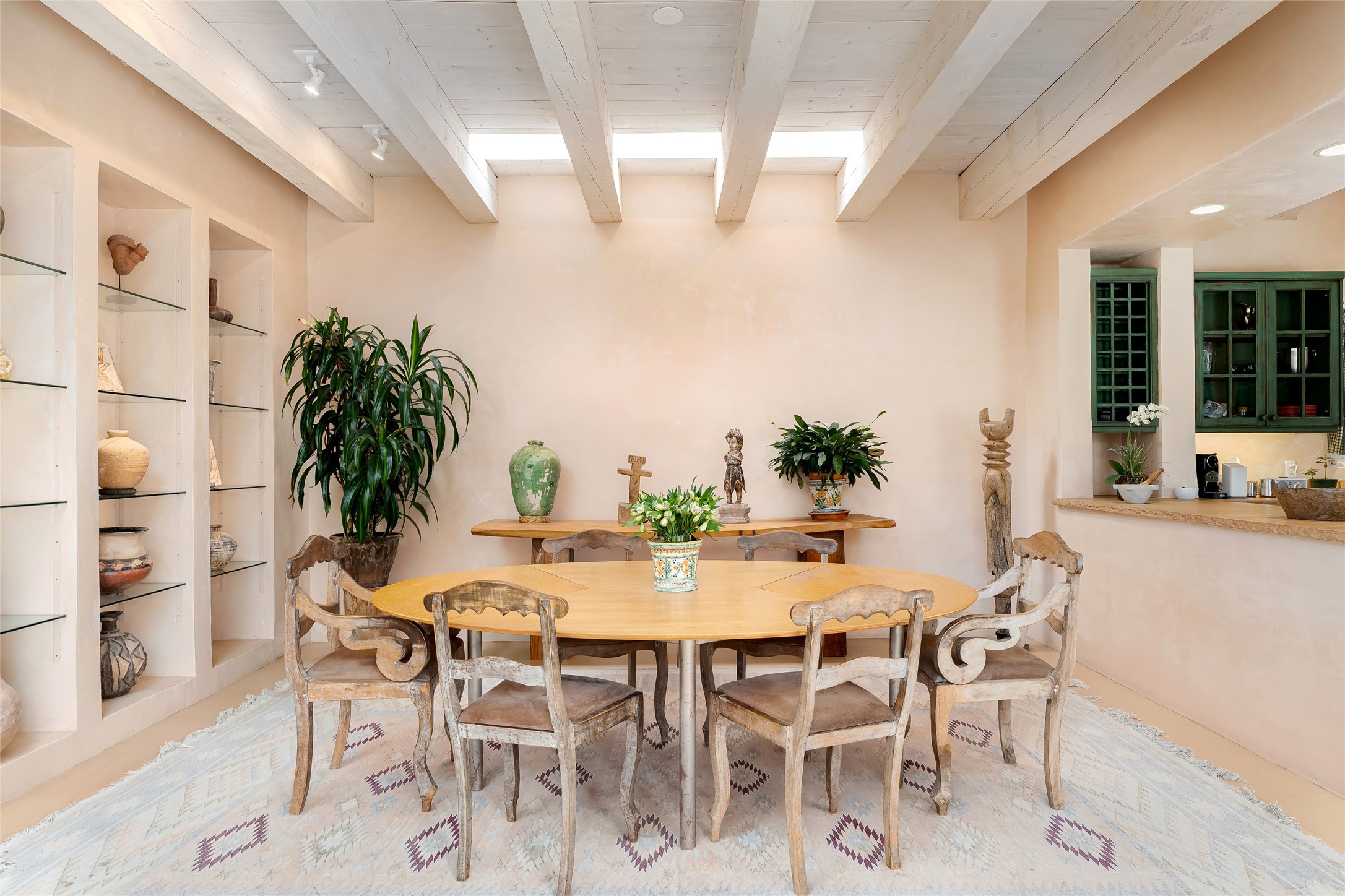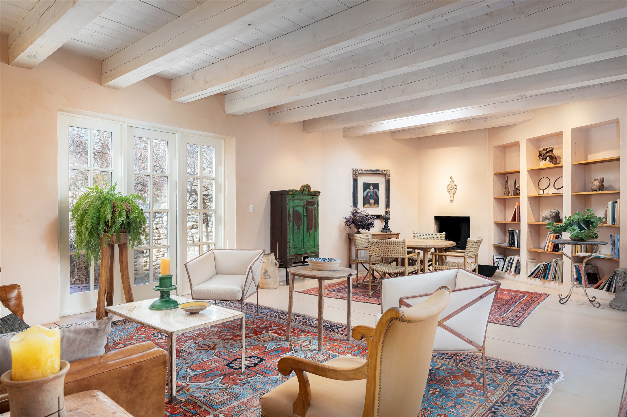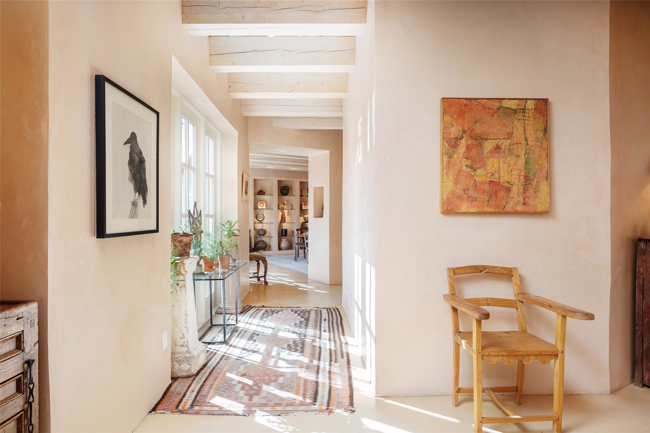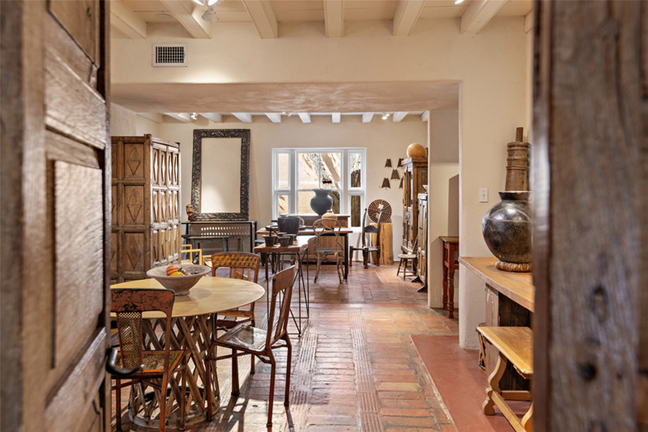 Home of the noted collector and beloved Santa Fe icon , the late Omer Claiborne- this lovely compound is tucked down a quiet lane off Canyon Road. The original home and guest house were built by Agnes Sims in 1947- 1948 . Omer designed the elegant main house in 1997 , attaching it to the original structure . This single level home has a clean , modernist aesthetic and features many architectural details , including lighted , recessed shelves for his museum quality artifacts , multiple fireplaces , concrete floors , French doors throughout , and 12' beamed ceilings. The 2 bedroom main house opens to a gracious entry courtyard, and flows seamlessly into the original house. The original adobe building is currently used as a gallery but can easily be converted into 2 bedrooms with an existing bath and a sitting area. The detached guest house is accessed through a brick courtyard , and offers privacy and charm. The established landscaping ,coveted location and flexible spaces add to the magic of this special property.