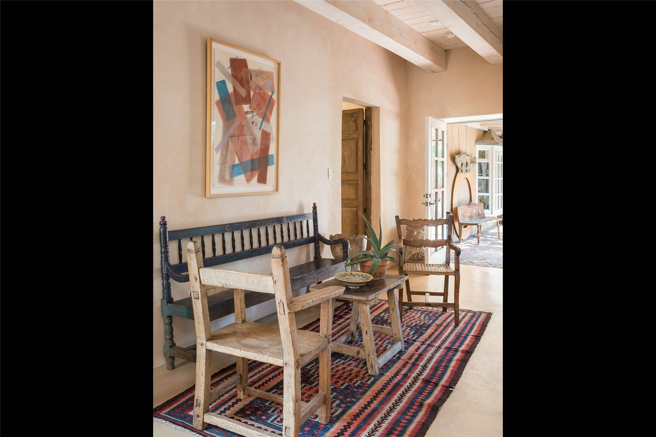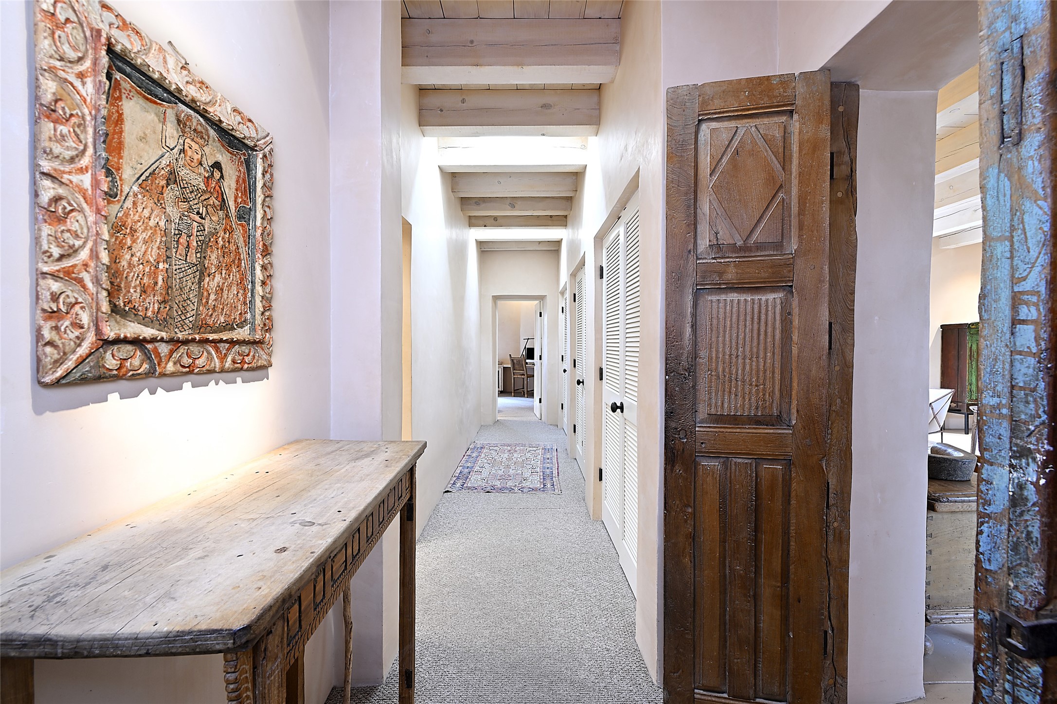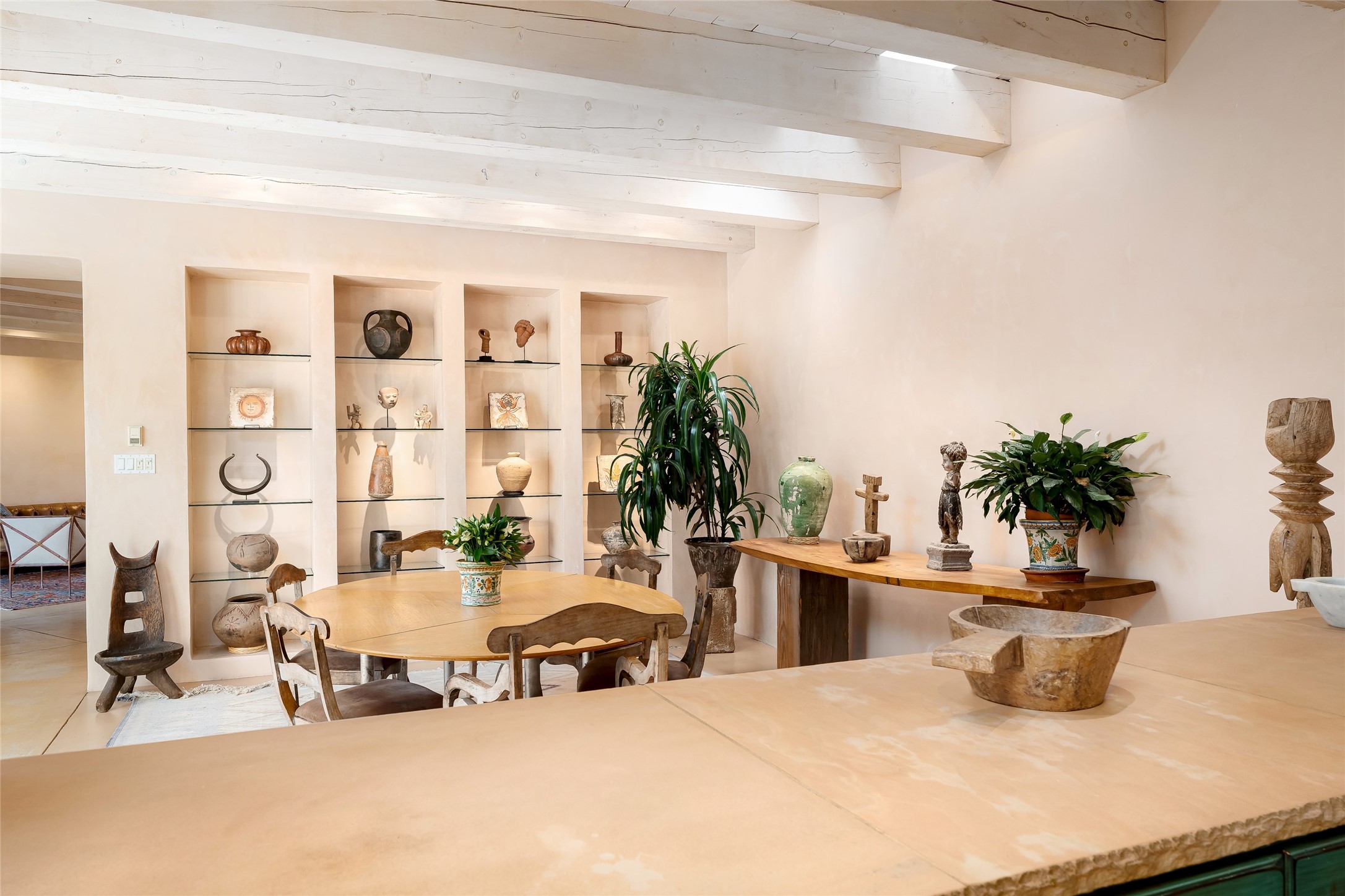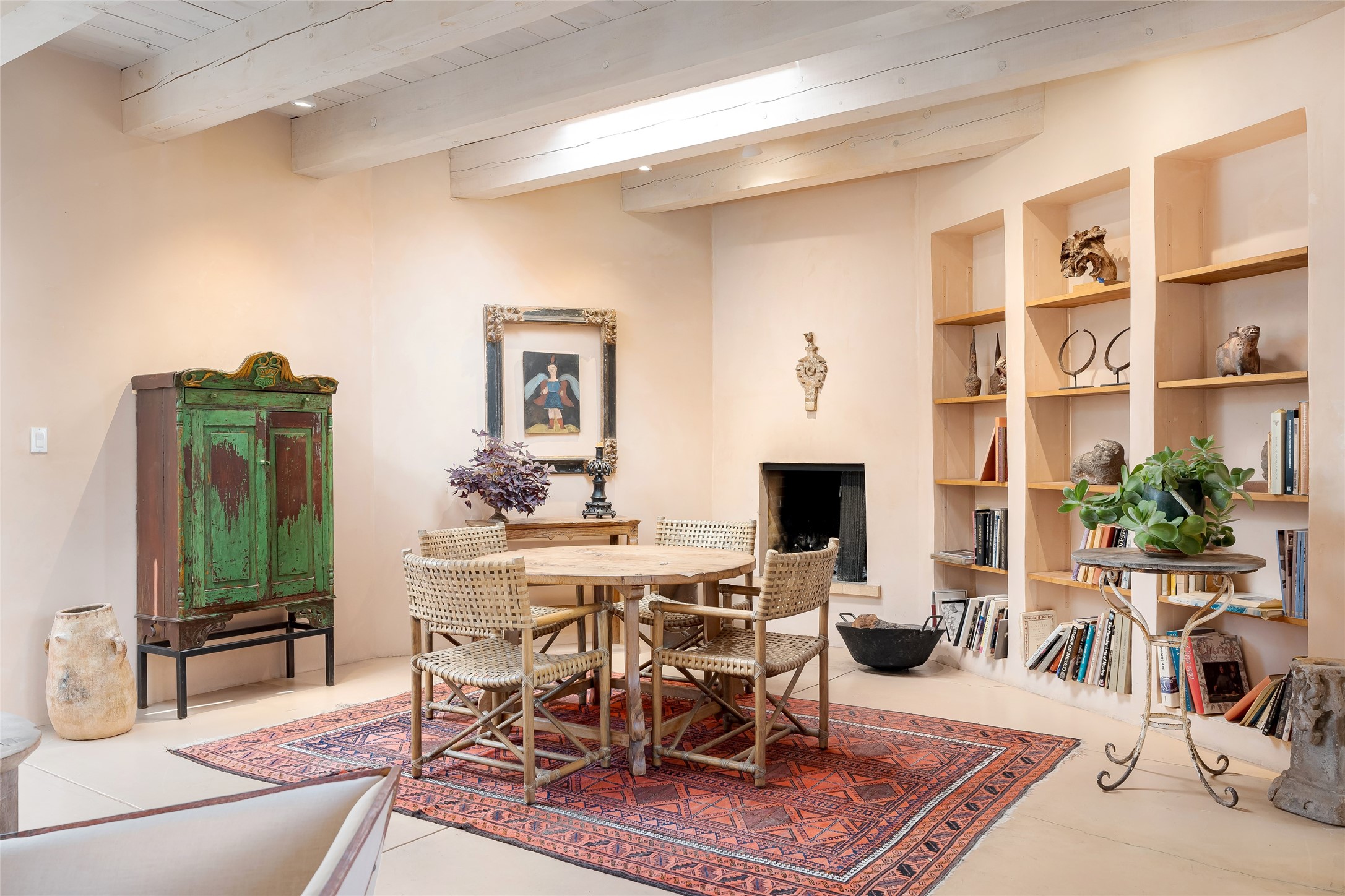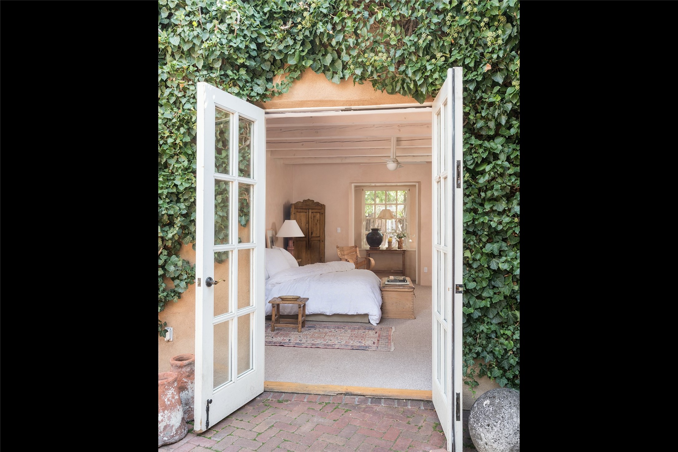 Home of the noted collector and beloved Santa Fe icon , the late Omer Claiborne- this lovely compound is tucked down a quiet lane off Canyon Road. The original home and guest house were built by Agnes Sims in 1947- 1948 . Omer designed the elegant main house in 1997 , attaching it to the original structure . This single level home has a clean , modernist aesthetic and features many architectural details , including lighted , recessed shelves for his museum quality artifacts , multiple fireplaces , concrete floors , French doors throughout , and 12' beamed ceilings. The 2 bedroom main house opens to a gracious entry courtyard, and flows seamlessly into the original house. The original adobe building is currently used as a gallery but can easily be converted into 2 bedrooms with an existing bath and a sitting area. The detached guest house is accessed through a brick courtyard , and offers privacy and charm. The established landscaping ,coveted location and flexible spaces add to the magic of this special property.