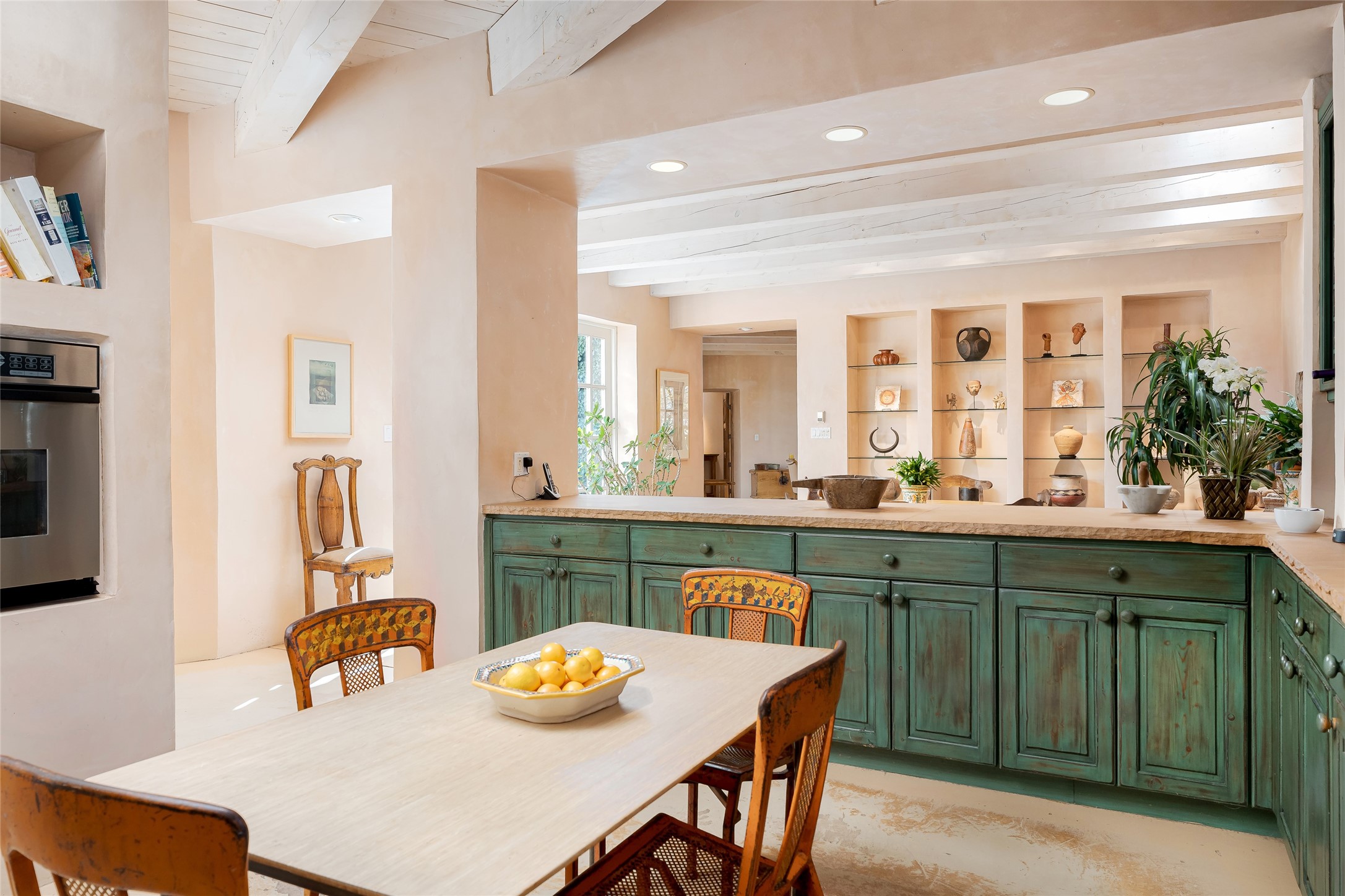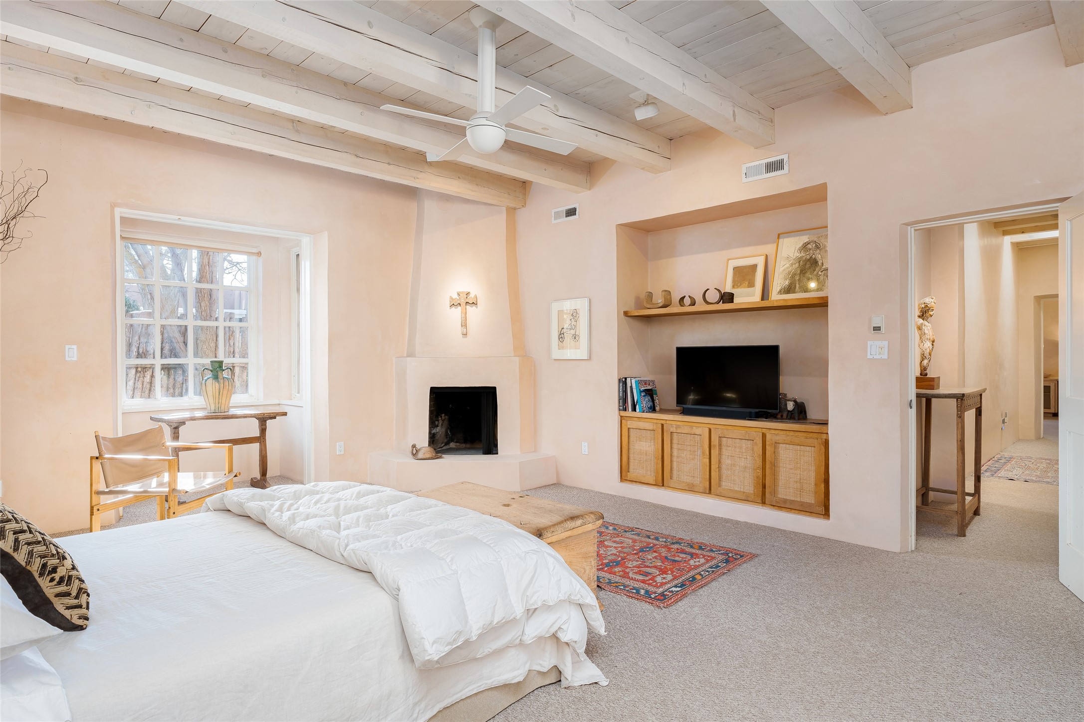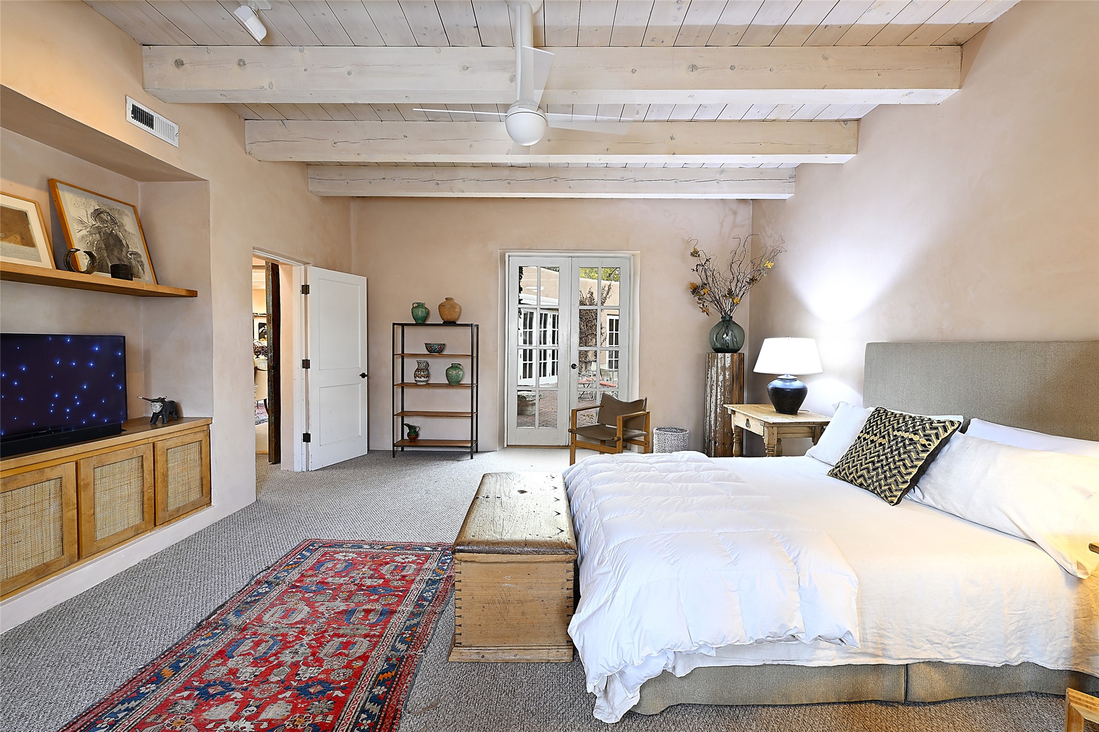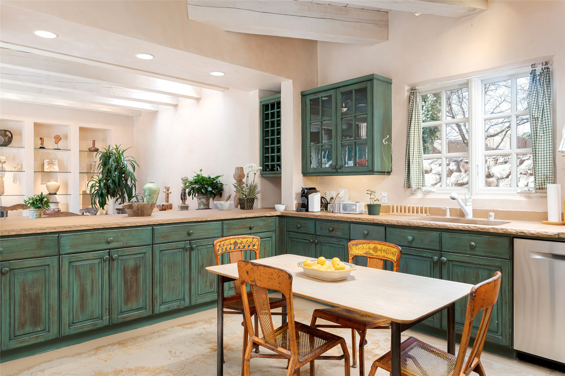 Home of the noted collector and beloved Santa Fe icon , the late Omer Claiborne- this lovely compound is tucked down a quiet lane off Canyon Road. The original home and guest house were built by Agnes Sims in 1947- 1948 . Omer designed the elegant main house in 1997 , attaching it to the original structure . This single level home has a clean , modernist aesthetic and features many architectural details , including lighted , recessed shelves for his museum quality artifacts , multiple fireplaces , concrete floors , French doors throughout , and 12' beamed ceilings. The 2 bedroom main house opens to a gracious entry courtyard, and flows seamlessly into the original house. The original adobe building is currently used as a gallery but can easily be converted into 2 bedrooms with an existing bath and a sitting area. The detached guest house is accessed through a brick courtyard , and offers privacy and charm. The established landscaping ,coveted location and flexible spaces add to the magic of this special property.