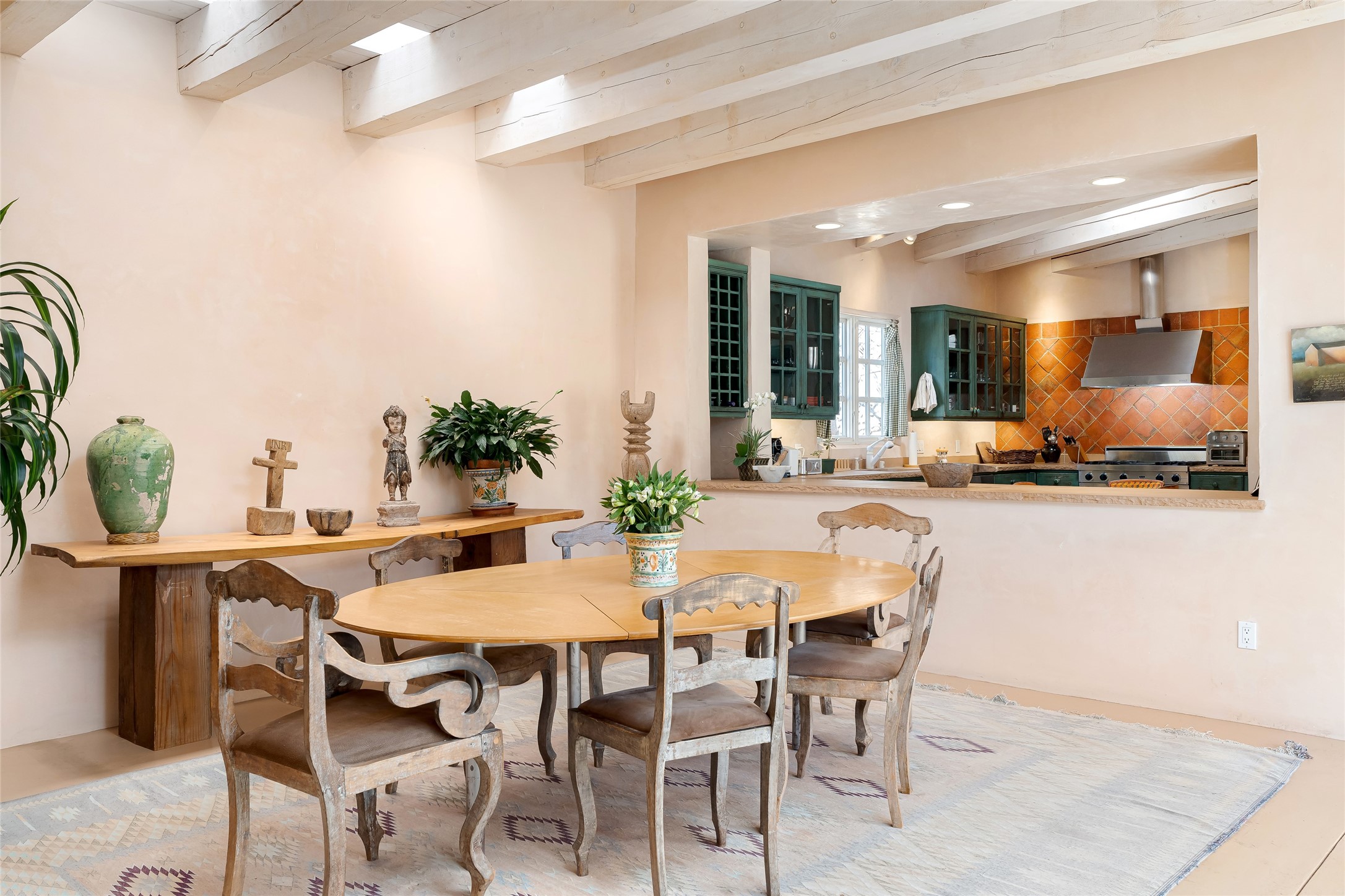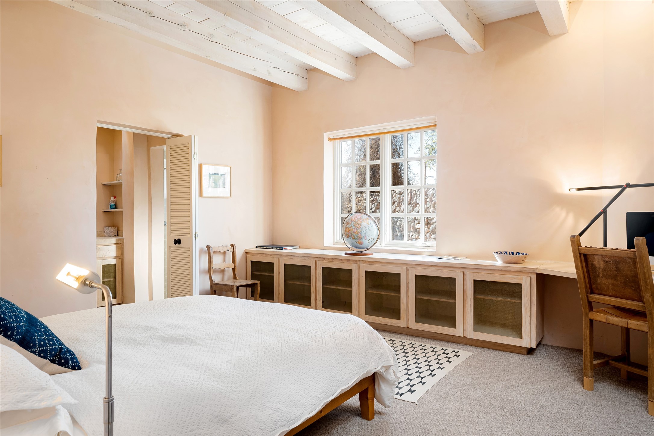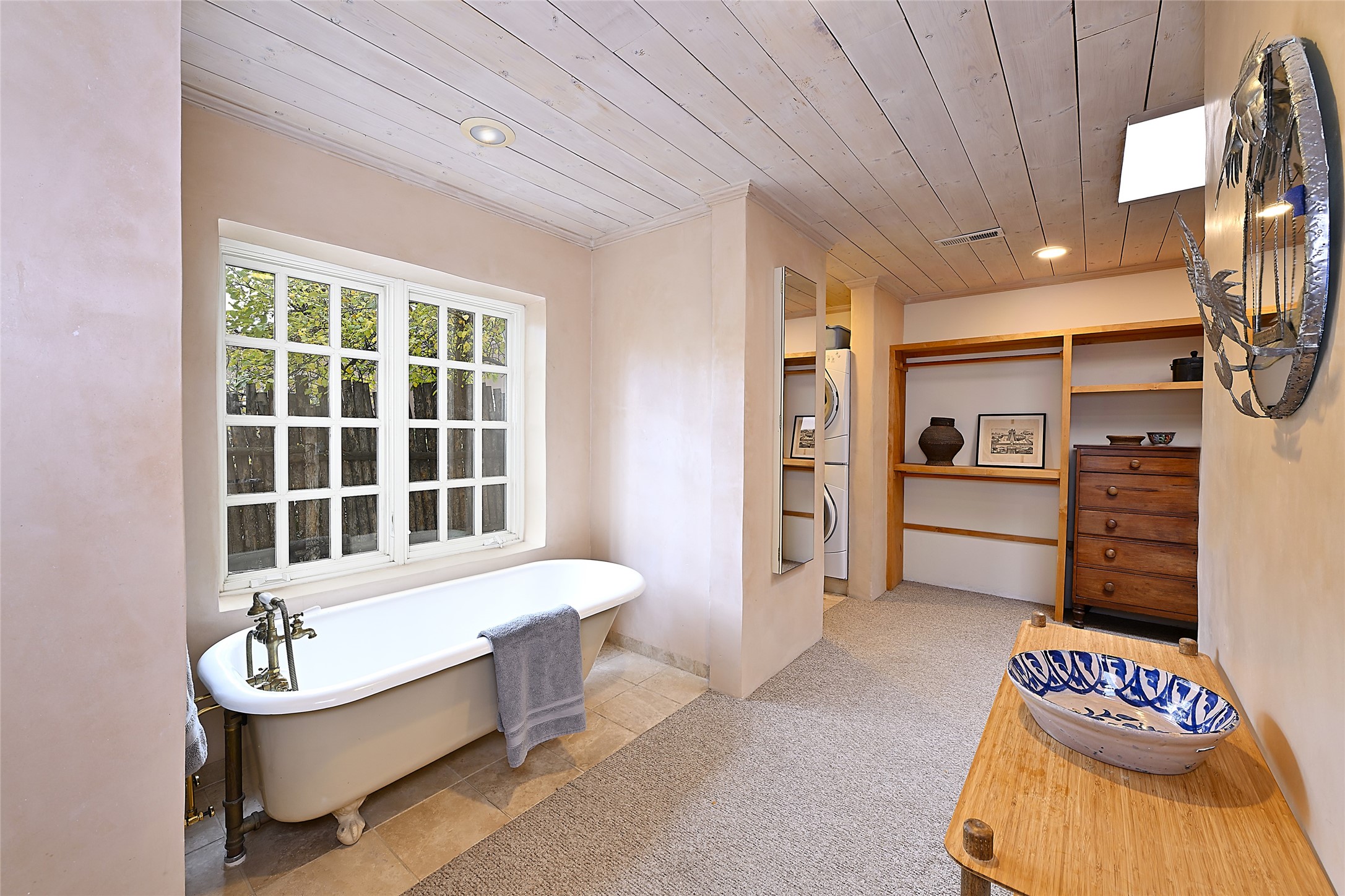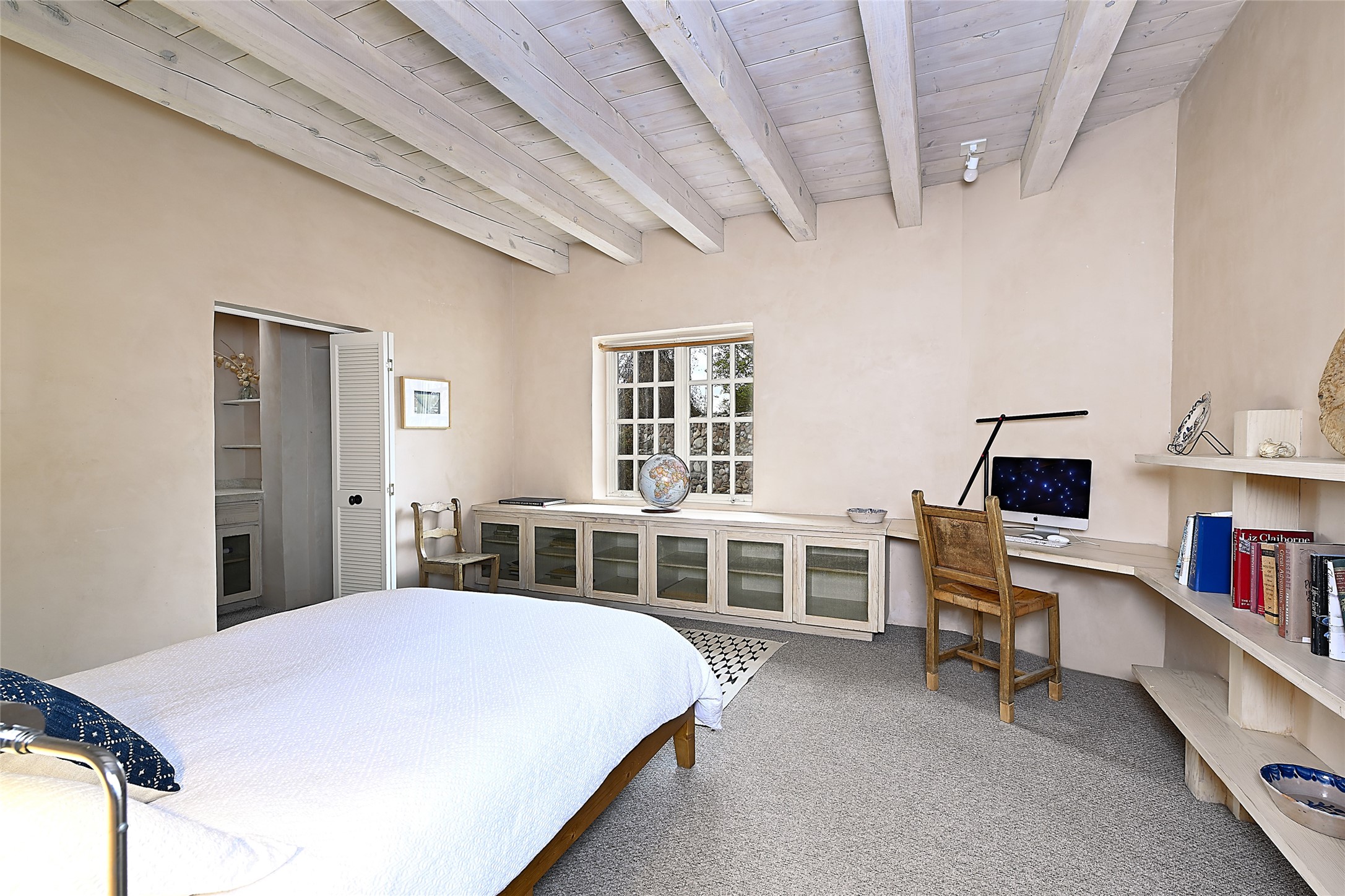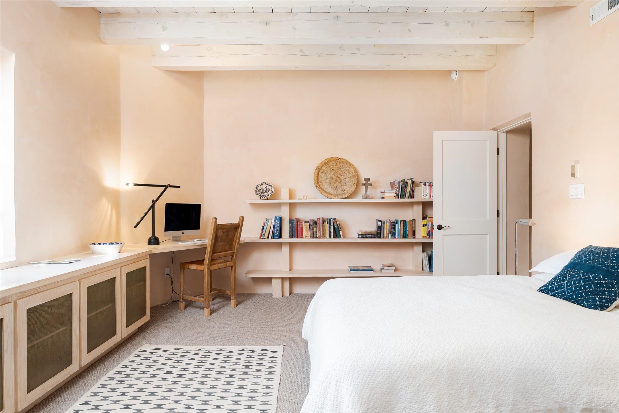 Home of the noted collector and beloved Santa Fe icon , the late Omer Claiborne- this lovely compound is tucked down a quiet lane off Canyon Road. The original home and guest house were built by Agnes Sims in 1947- 1948 . Omer designed the elegant main house in 1997 , attaching it to the original structure . This single level home has a clean , modernist aesthetic and features many architectural details , including lighted , recessed shelves for his museum quality artifacts , multiple fireplaces , concrete floors , French doors throughout , and 12' beamed ceilings. The 2 bedroom main house opens to a gracious entry courtyard, and flows seamlessly into the original house. The original adobe building is currently used as a gallery but can easily be converted into 2 bedrooms with an existing bath and a sitting area. The detached guest house is accessed through a brick courtyard , and offers privacy and charm. The established landscaping ,coveted location and flexible spaces add to the magic of this special property.
