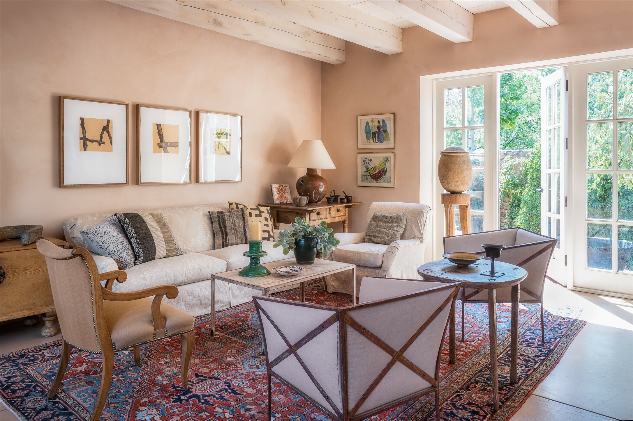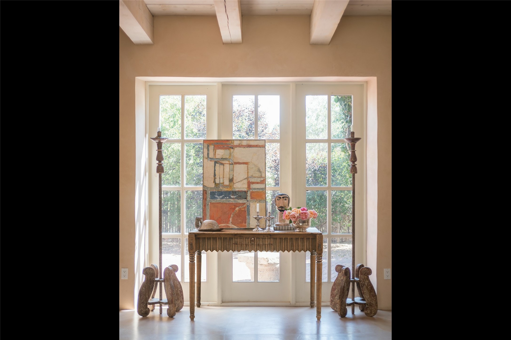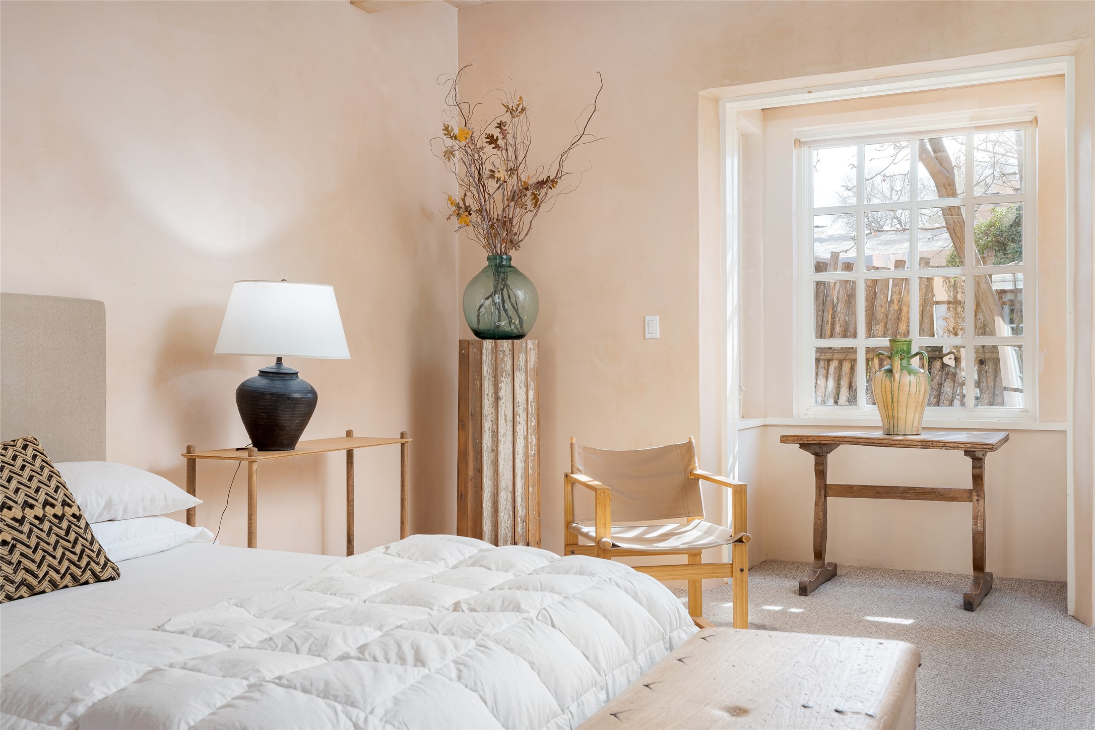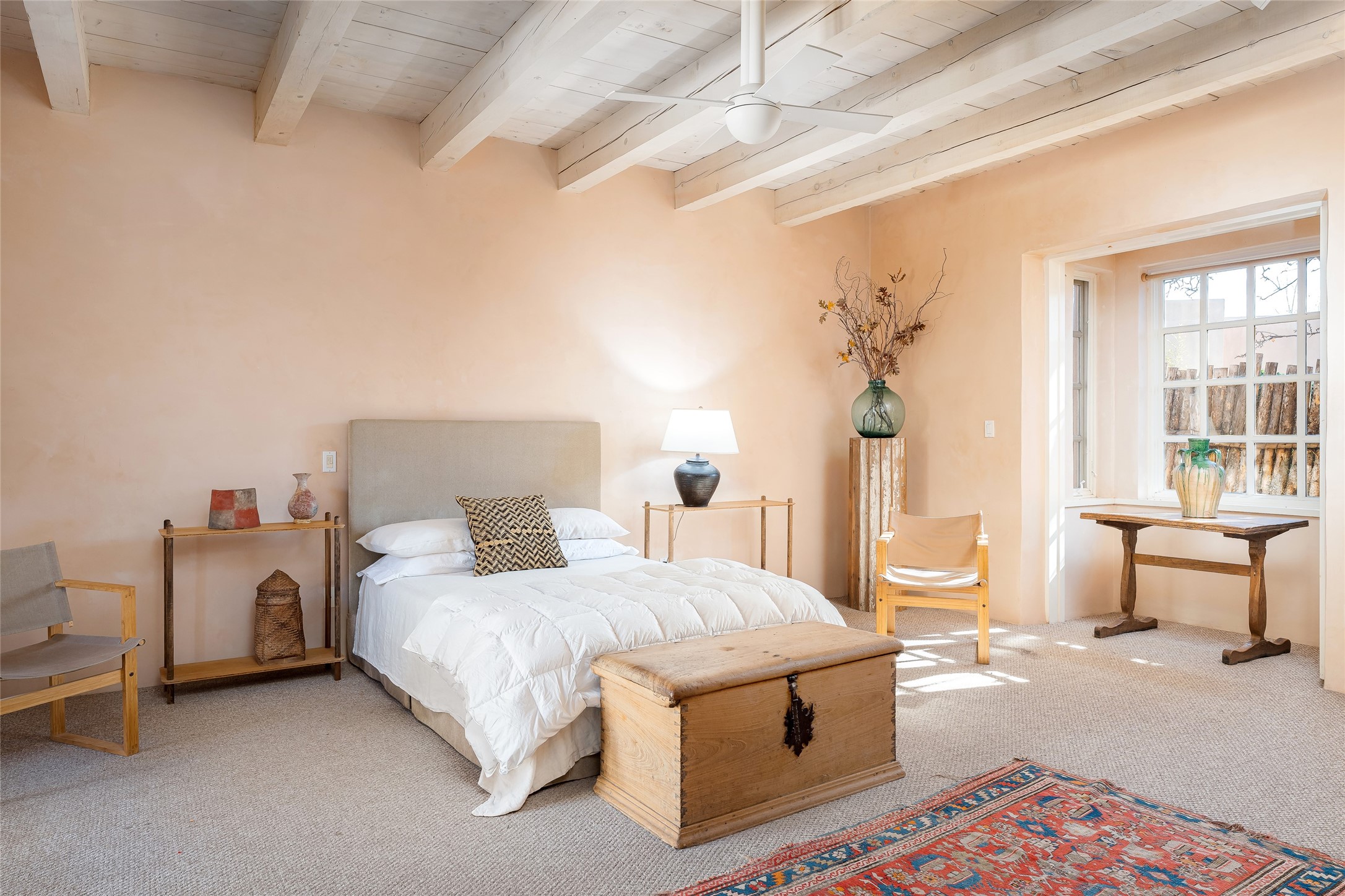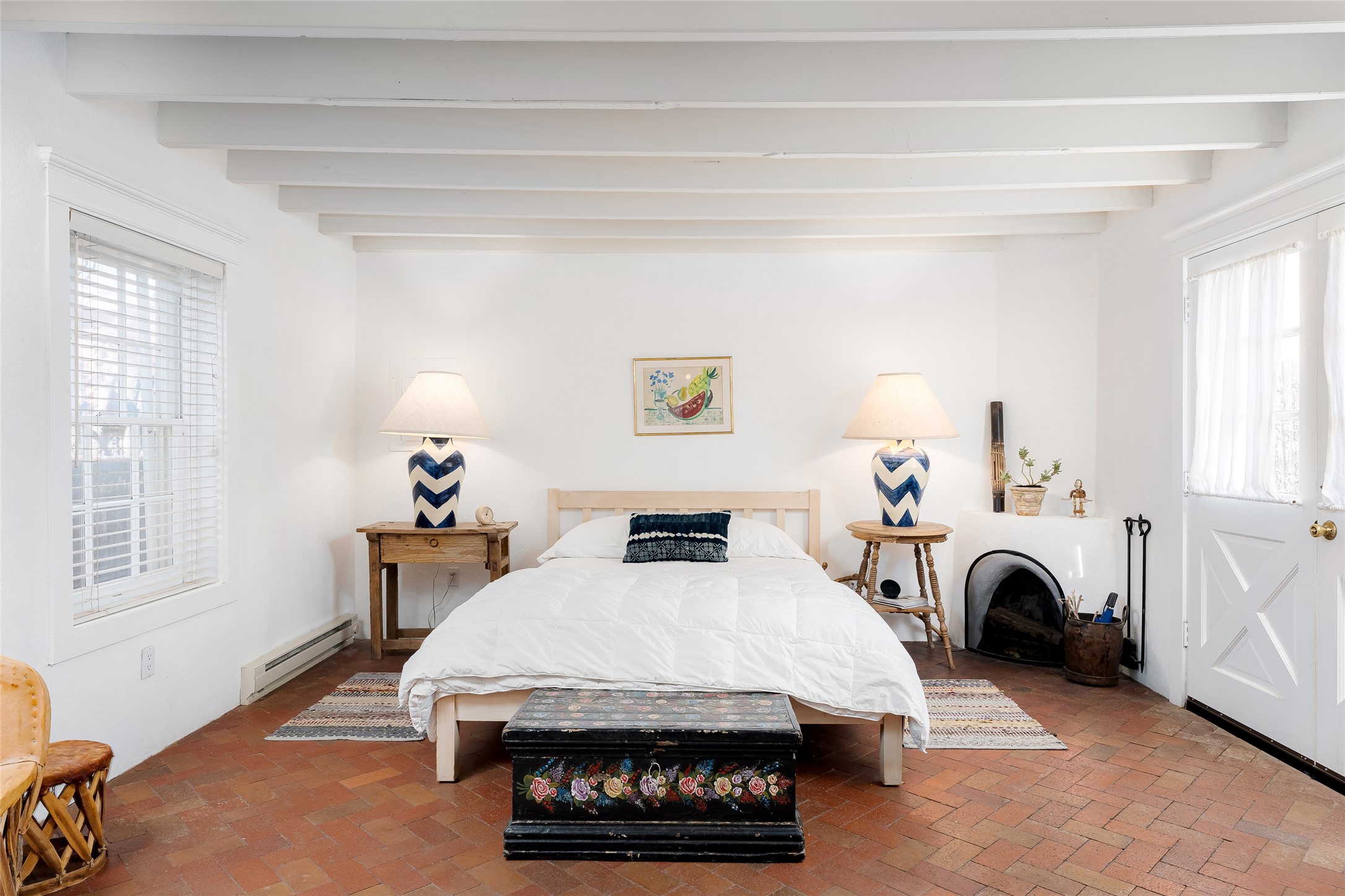 Home of the noted collector and beloved Santa Fe icon , the late Omer Claiborne- this lovely compound is tucked down a quiet lane off Canyon Road. The original home and guest house were built by Agnes Sims in 1947- 1948 . Omer designed the elegant main house in 1997 , attaching it to the original structure . This single level home has a clean , modernist aesthetic and features many architectural details , including lighted , recessed shelves for his museum quality artifacts , multiple fireplaces , concrete floors , French doors throughout , and 12' beamed ceilings. The 2 bedroom main house opens to a gracious entry courtyard, and flows seamlessly into the original house. The original adobe building is currently used as a gallery but can easily be converted into 2 bedrooms with an existing bath and a sitting area. The detached guest house is accessed through a brick courtyard , and offers privacy and charm. The established landscaping ,coveted location and flexible spaces add to the magic of this special property.