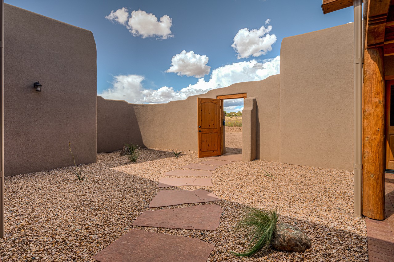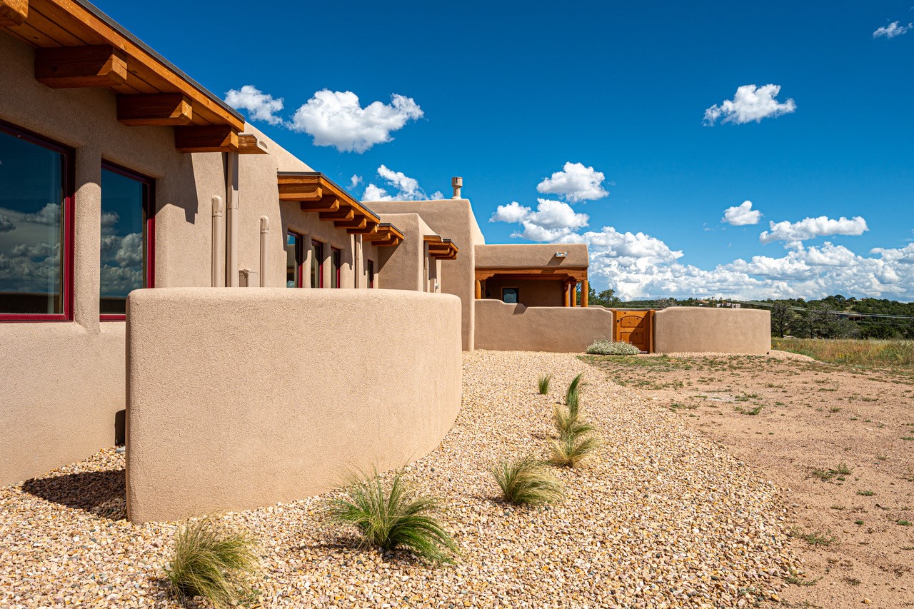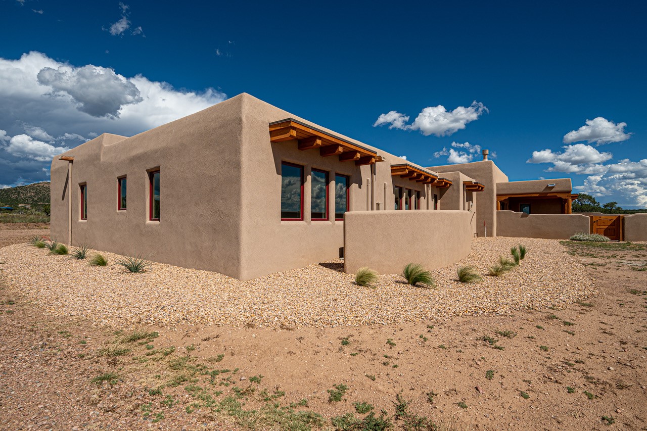Stunning Adobe contemporary pueblo masterpiece by one of Santa Fe's premier adobe builders, Jeff Fagley of Shaylube Construction. This home has never been lived in, is waiting for the first owner to enjoy. Open plan design with dramatic corbelled beam ceiling and Kiva fireplace in great room, tiled floors and gleaming thick smooth plastered walls throughout complement the classic elements of Santa Fe style. Spacious feel with high ceilings throughout, split 3 bedrooms plus office, large owners suite with private walled portal, 4 bathrooms separate guest suite. Natural gas radiant heat plus 5 mini splits for heating and cooling complementing the radiant in floor heating and passive solar design. A sunny chefs kitchen with butlers pantry and large central island, large formal dining area opening to a wraparound portal for private outside dining and entertainment. A walled courtyard entry with wrap around portal also provides the access to both main home and guest quarters. There is a second privacy walled south courtyard with bricked portals accessed from living room and master suite also excellent for sunset mountain viewing. Roof drainage to 2 cisterns already installed underground catch the rainfall for landscaping. A large 3 car garage for lots of toys or hobbies, plenty of guest parking and lovely views with 7+acres to enjoy. Horses allowed. Enjoy access to local Eldorado area shopping, schools, senior center and library plus only minutes into Santa Fe.