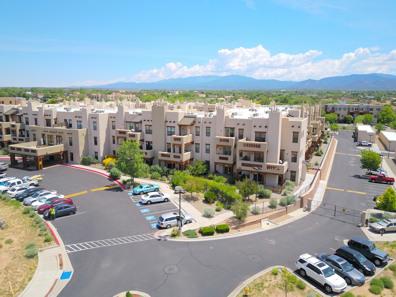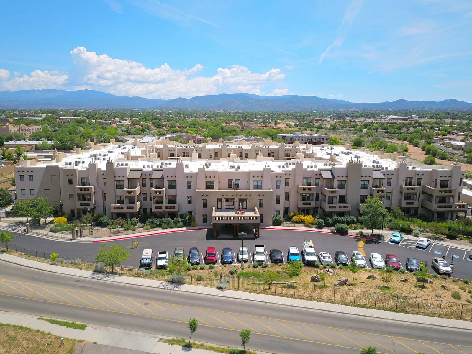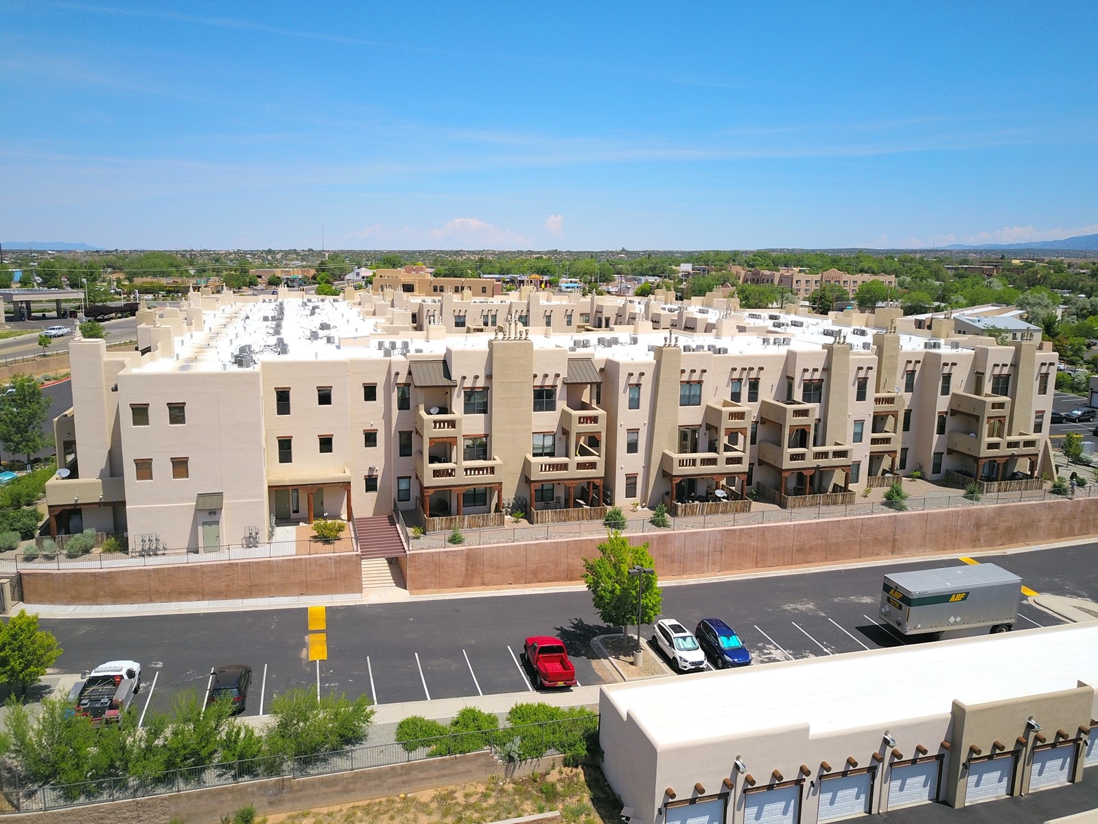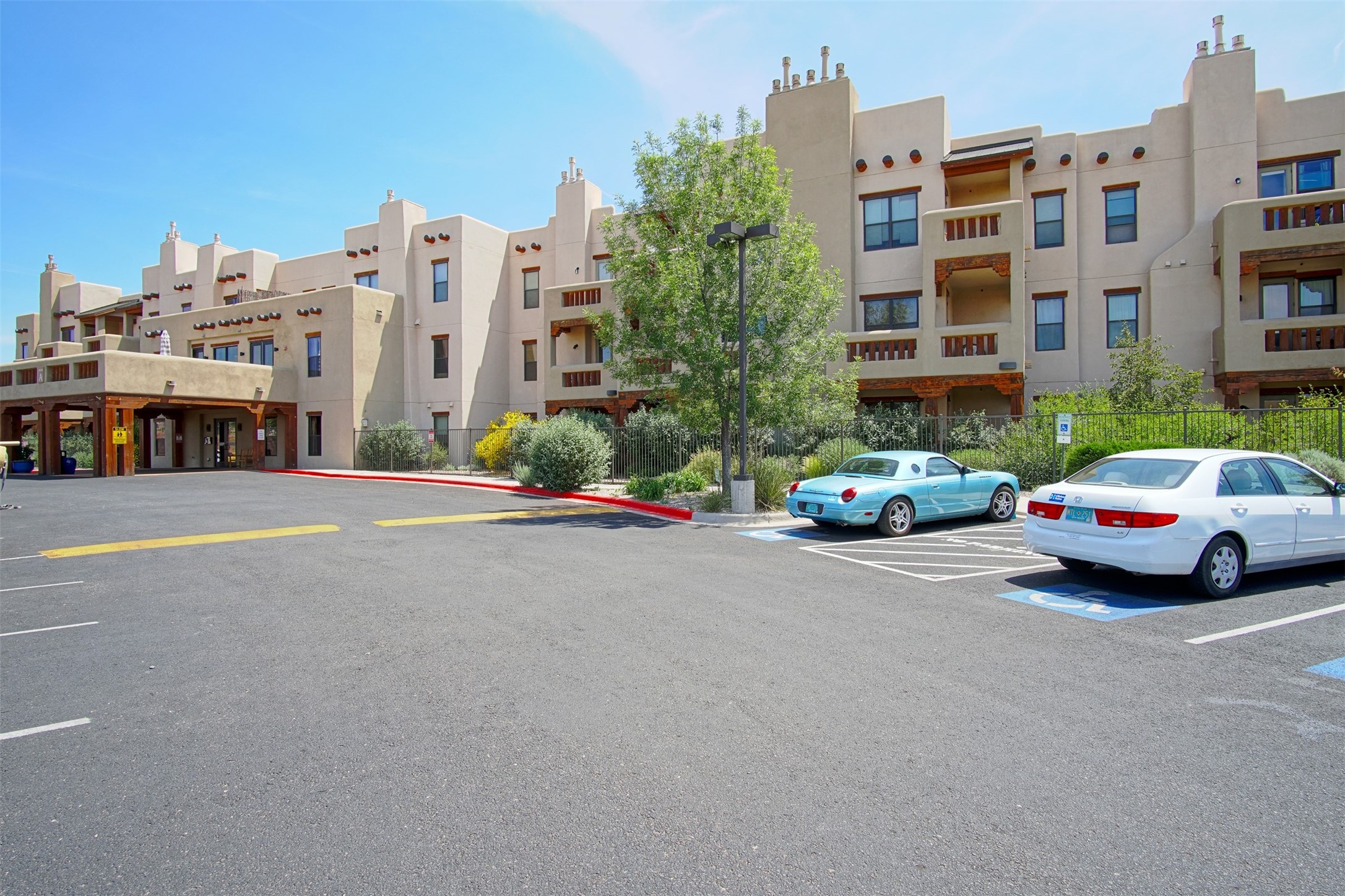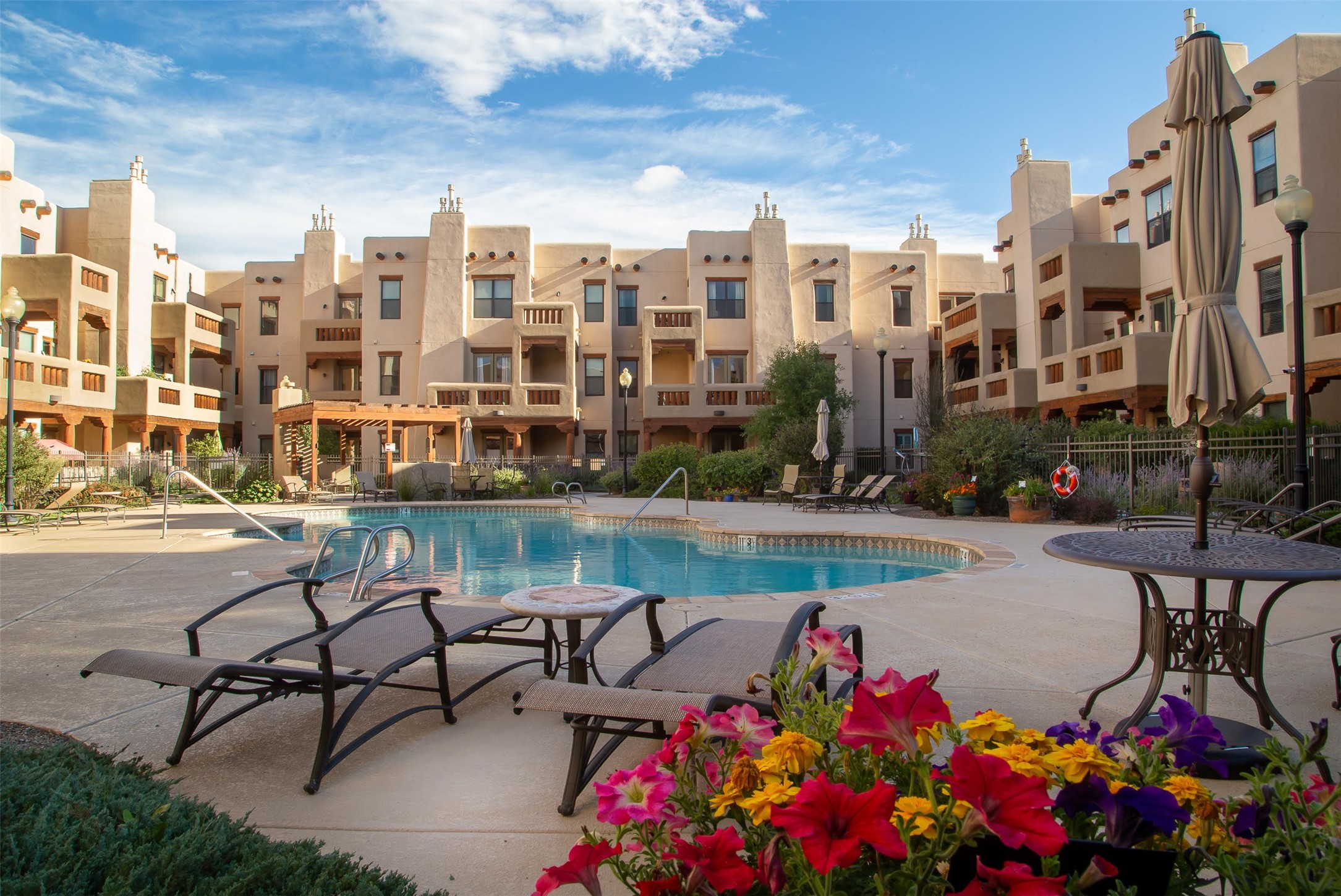 DRASTIC PRICE REDUCTION of 25K off original on this exceptional 2 BR/2 BA condo package with STORAGE UNIT and GARAGE. At 1275 sf, this is the LARGEST available, (the ONLY one currently on the market), and a RARE JEWEL, with a custom rehab by renowned designer-decorator Lisa Barker. Lisa's luxe finishes truly set this one apart: Luminous travertine baths and flooring, mosaic tile accents, and designer lighting all offer a beauy and refinement not found in other units. Other fabulous details: Coveted 3rd floor (with elevator) location, Patio with pool court view, 3 skylights, Granite countertops, Stainless steel appliances and W/D, 14K custom Murphy Bed, new bath faucets, paint, curtains and blinds, smoke/CO2 detectors and more. ***The package is complete with an adjacent STORAGE UNIT and an 1-car GARAGE (with storage loft)*** plus 2 additional parking spaces (non-reserved) in the gated lot. As for the Alameda, this landmark complex has set the standard for luxury condo living since 2008 with its Pueblo architecture, a magnificent pool court, fitness center, beautiful reception rooms, library, gated parking, elevators, full time onsite management, and 24 hr controlled access for your peace of mind. Located 12 mins from the plaza, and proximate to shopping, restaurants, culture, and major transportation, this location makes Santa Fe living a breeze. Don't wait, this is a CUT-ABOVE unit at a GIVEAWAY price!