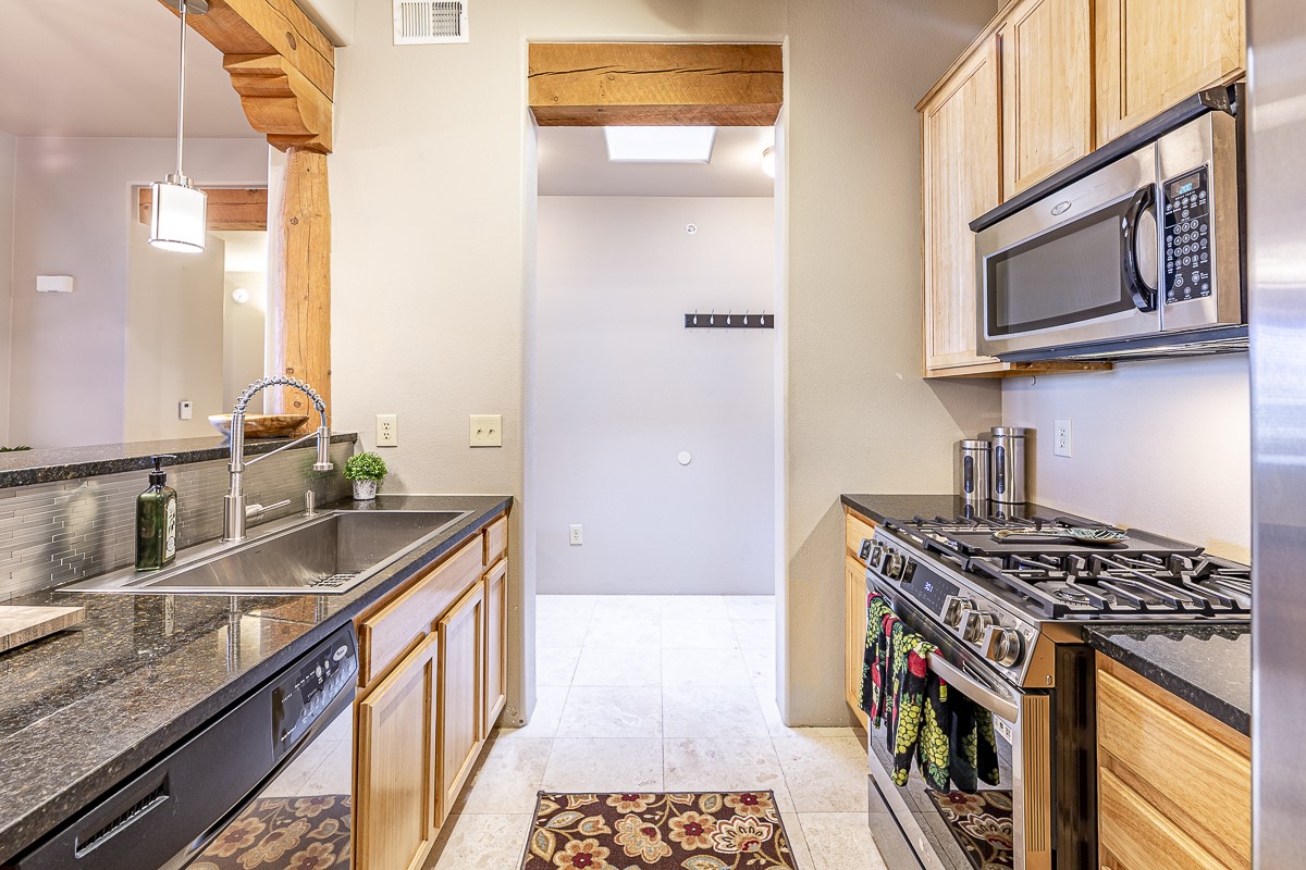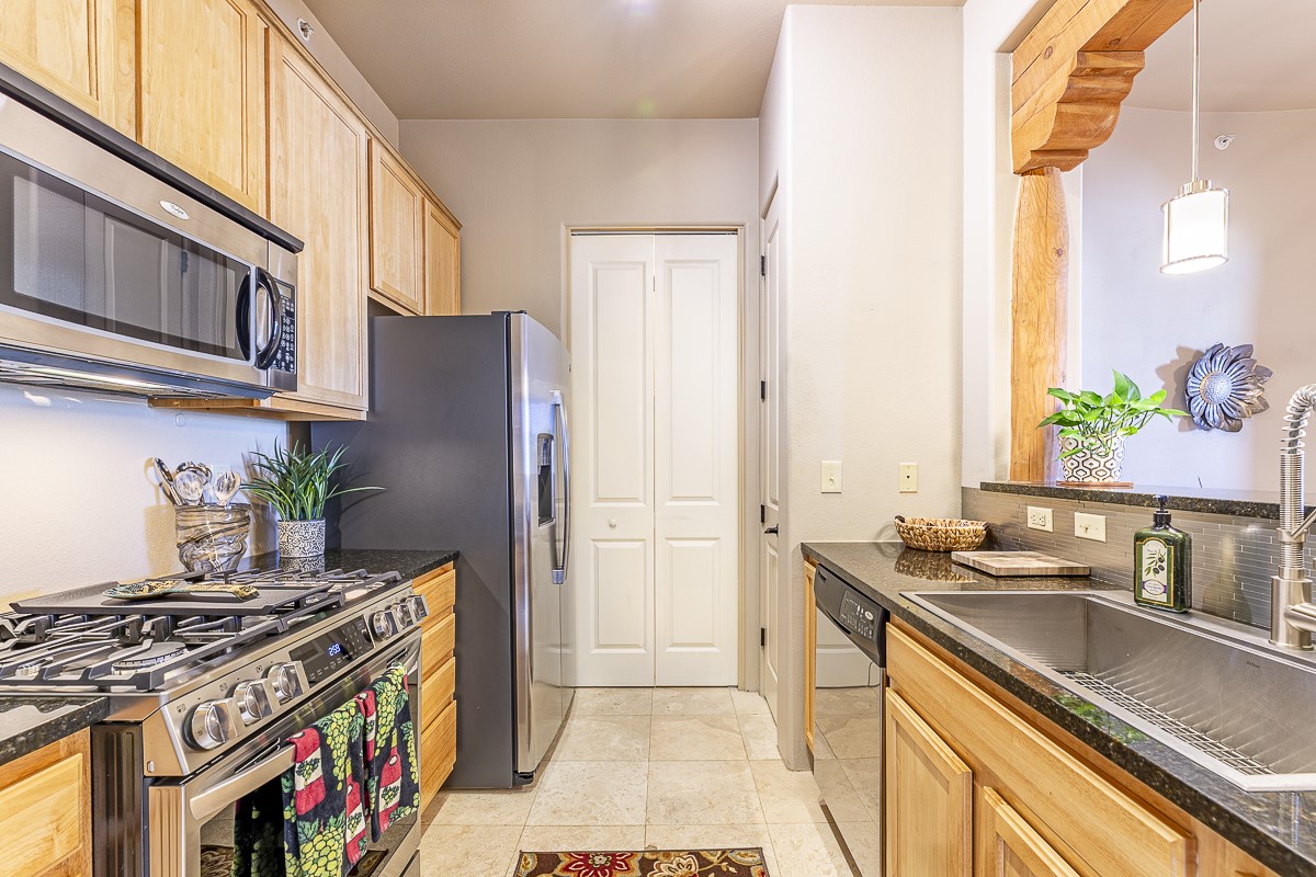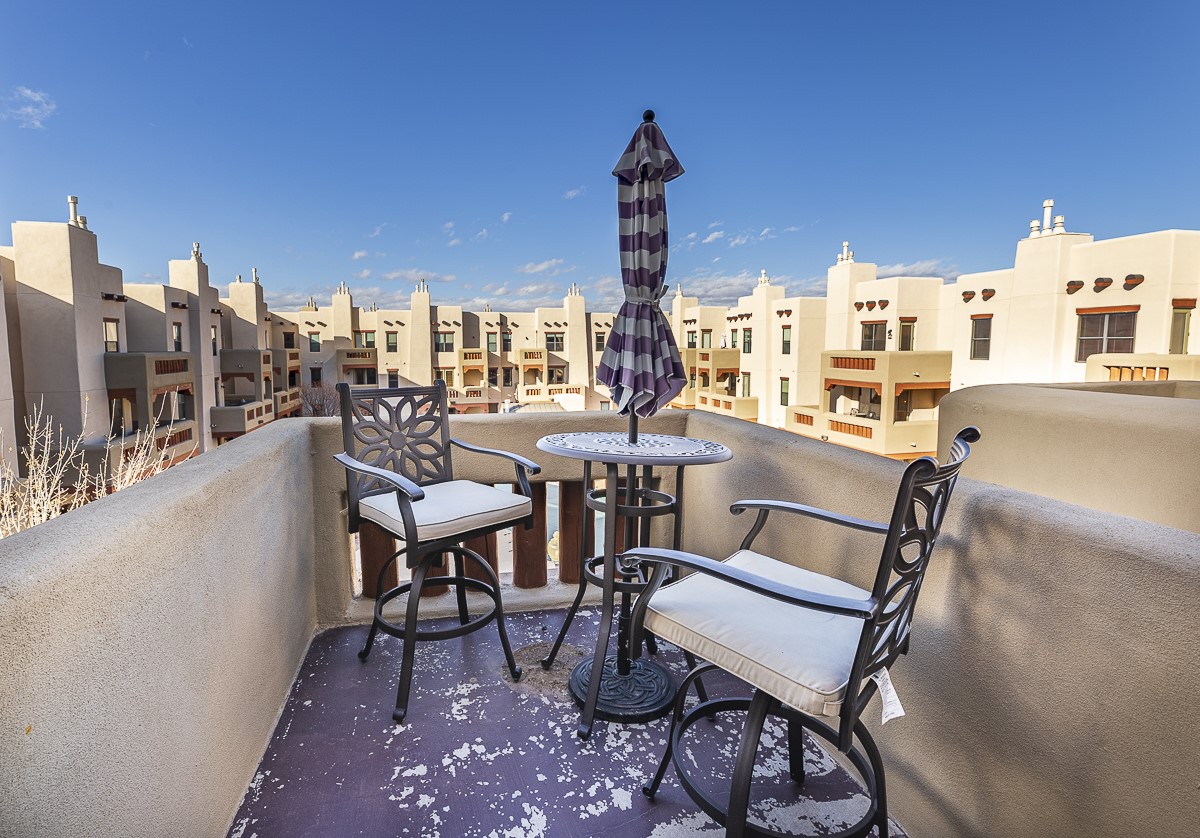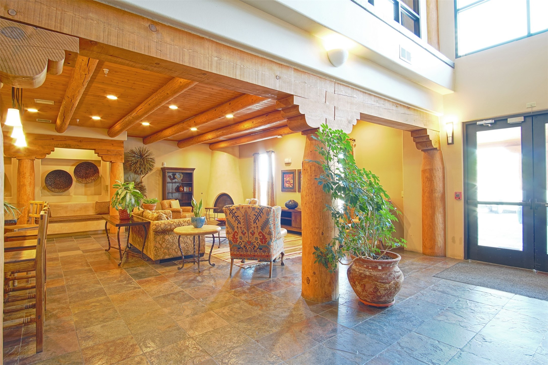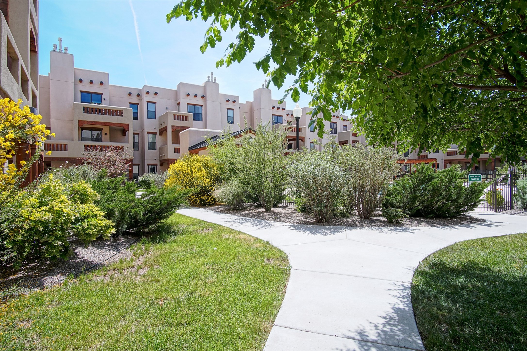 DRASTIC PRICE REDUCTION of 25K off original on this exceptional 2 BR/2 BA condo package with STORAGE UNIT and GARAGE. At 1275 sf, this is the LARGEST available, (the ONLY one currently on the market), and a RARE JEWEL, with a custom rehab by renowned designer-decorator Lisa Barker. Lisa's luxe finishes truly set this one apart: Luminous travertine baths and flooring, mosaic tile accents, and designer lighting all offer a beauy and refinement not found in other units. Other fabulous details: Coveted 3rd floor (with elevator) location, Patio with pool court view, 3 skylights, Granite countertops, Stainless steel appliances and W/D, 14K custom Murphy Bed, new bath faucets, paint, curtains and blinds, smoke/CO2 detectors and more. ***The package is complete with an adjacent STORAGE UNIT and an 1-car GARAGE (with storage loft)*** plus 2 additional parking spaces (non-reserved) in the gated lot. As for the Alameda, this landmark complex has set the standard for luxury condo living since 2008 with its Pueblo architecture, a magnificent pool court, fitness center, beautiful reception rooms, library, gated parking, elevators, full time onsite management, and 24 hr controlled access for your peace of mind. Located 12 mins from the plaza, and proximate to shopping, restaurants, culture, and major transportation, this location makes Santa Fe living a breeze. Don't wait, this is a CUT-ABOVE unit at a GIVEAWAY price!