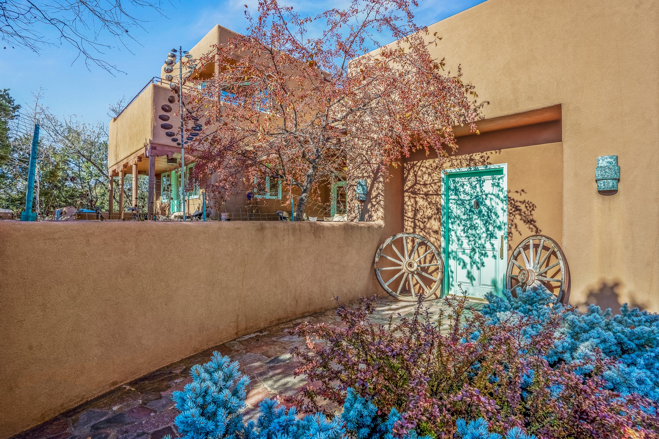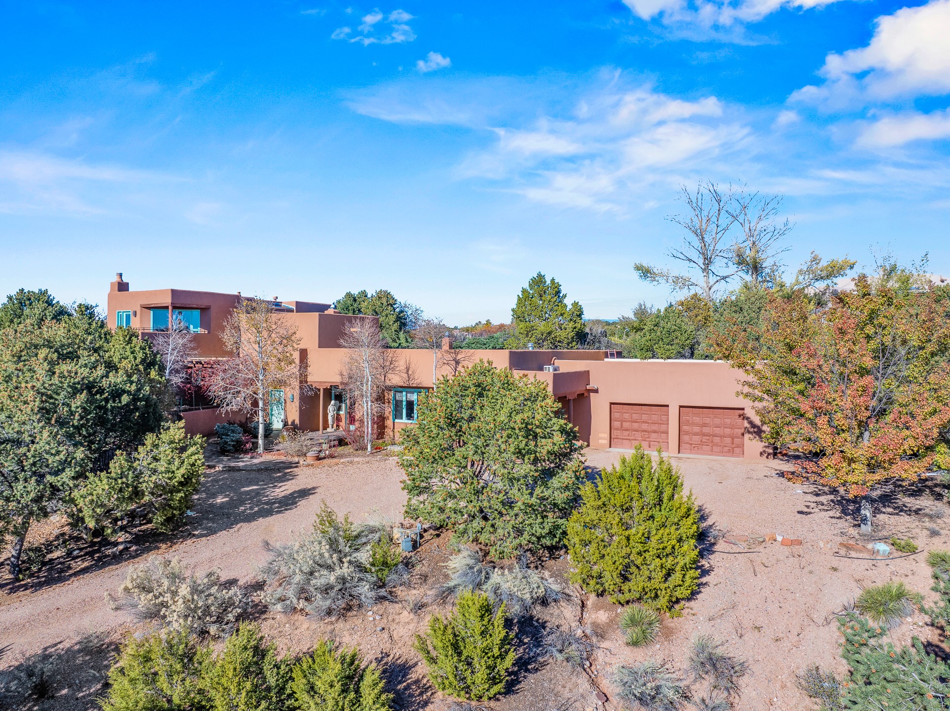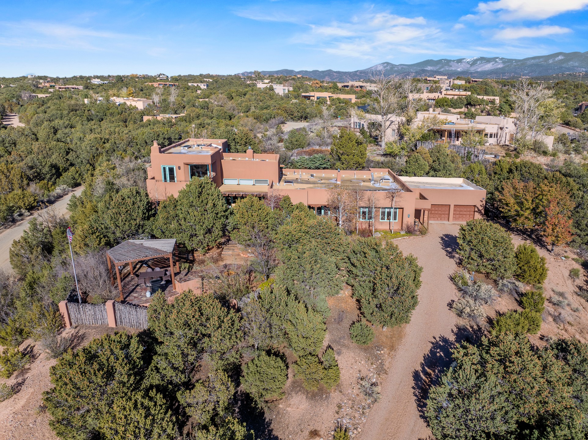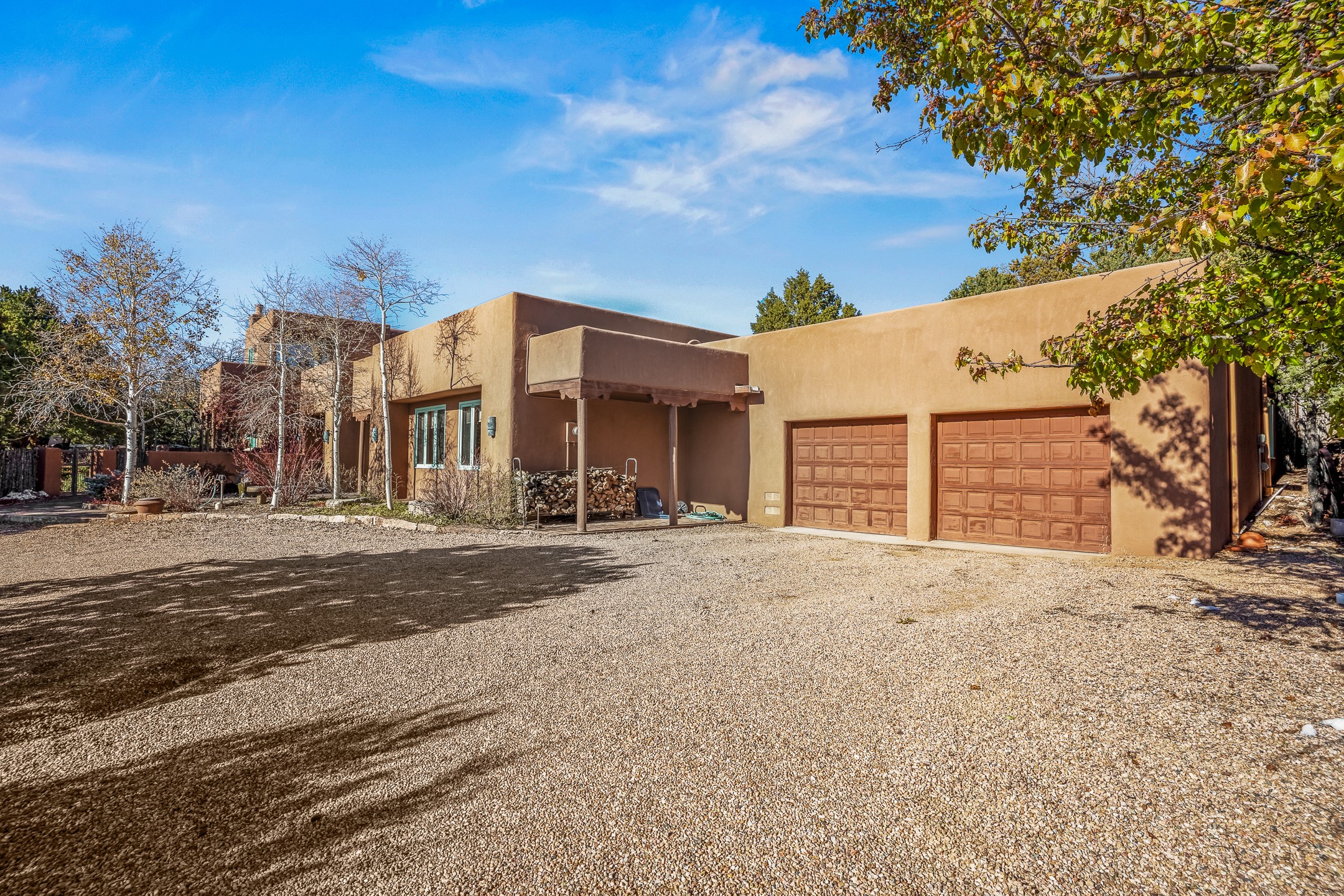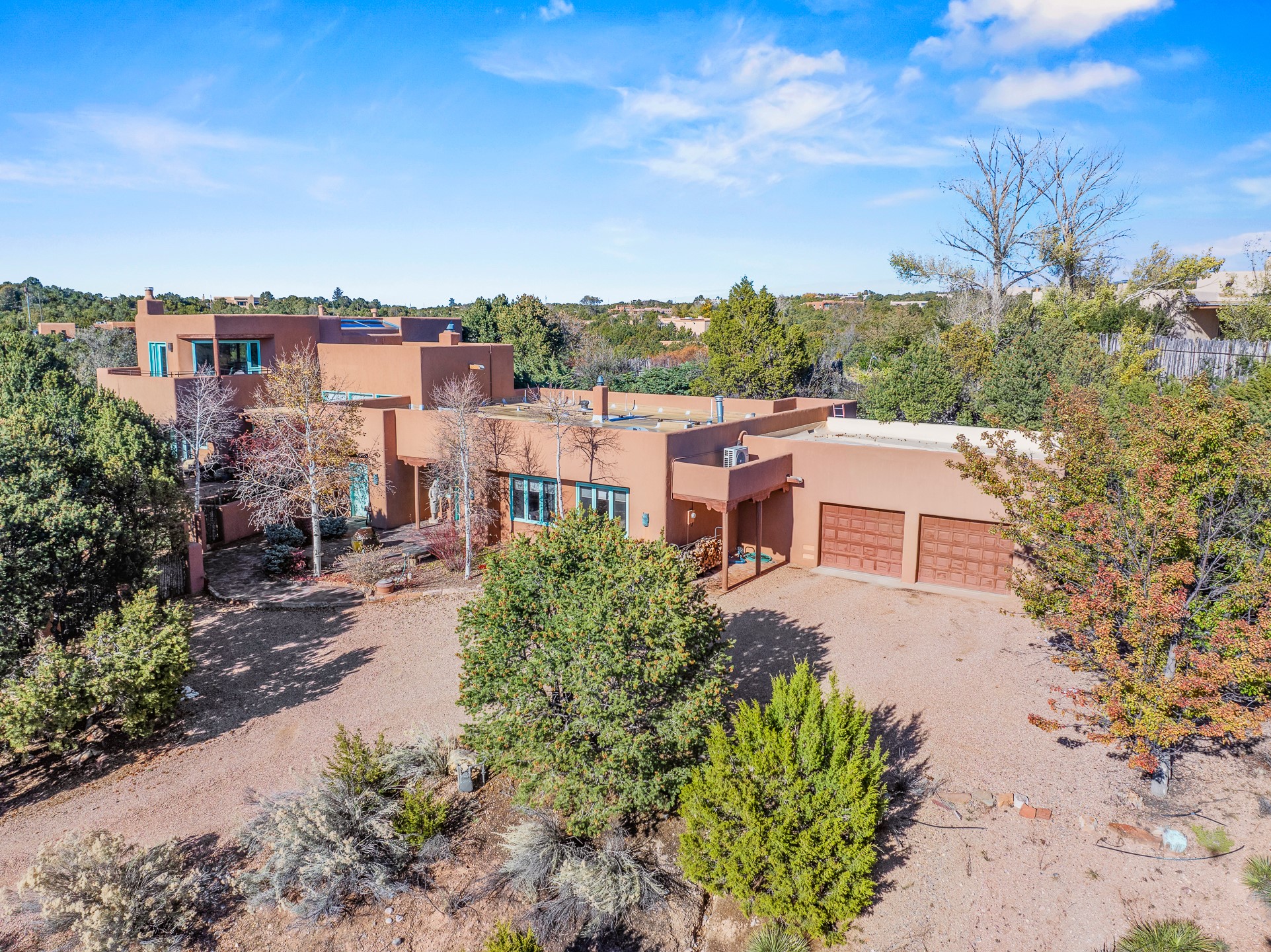 This oasis of a home is located close to downtown but far enough that you feel like you are at a private retreat. With multiple living areas inside and outside, this house can be a quiet space or offer an entertaining opportunity. With soaring ceilings, (some with tongue and groove, some with beams), plaster walls, saltillo tile, granite counters, fireplaces, and windows allowing the outside in throughout, this home is one to see and claim as your own. The outdoor spaces offer views, quiet time options and areas to enjoy family and friends throughout many of the months in Santa Fe. The upper level has an extra bedroom and a bonus room that currently operates as a workout room. Storage options abound throughout the house. From the kitchen window, you can watch the flowing fountain while you create that gourmet meal. The property is gated and has parking for at least 3 outside of the garages. Come and see it for yourself and you won't want to leave.