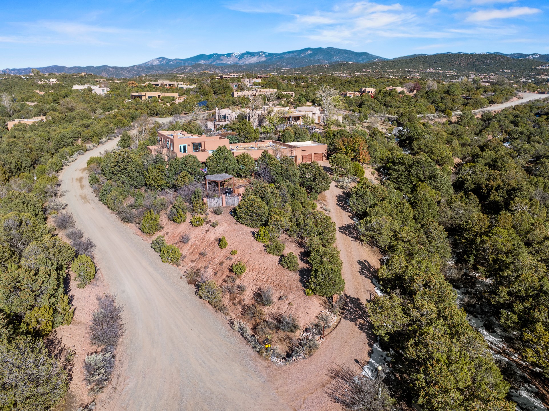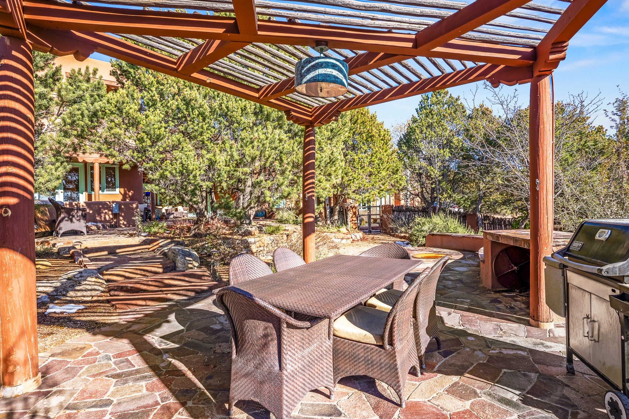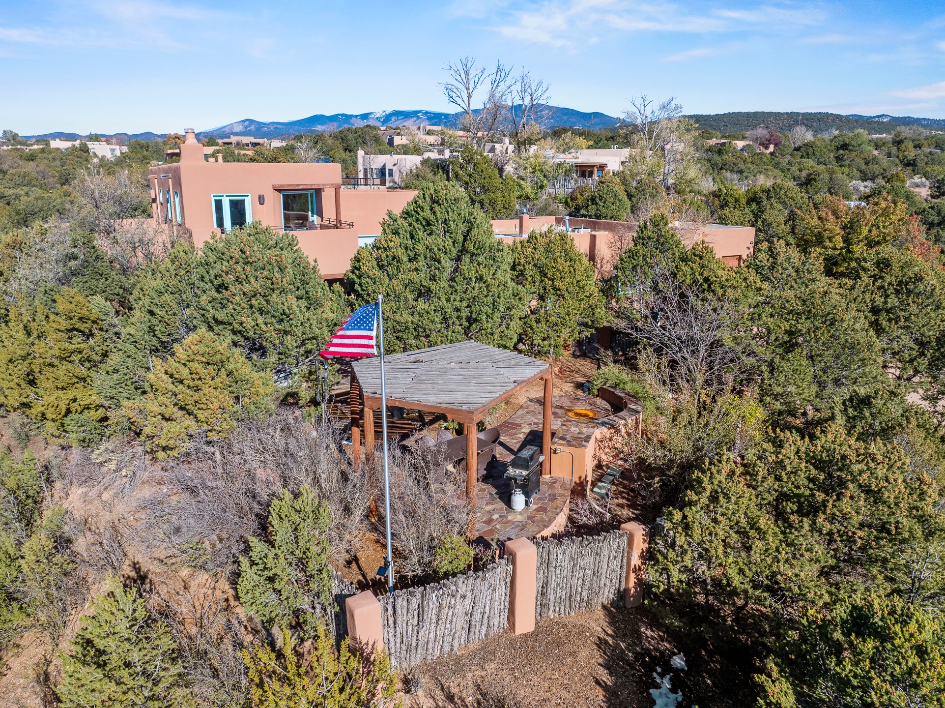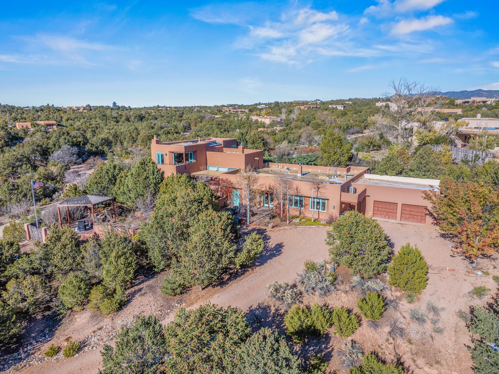 This oasis of a home is located close to downtown but far enough that you feel like you are at a private retreat. With multiple living areas inside and outside, this house can be a quiet space or offer an entertaining opportunity. With soaring ceilings, (some with tongue and groove, some with beams), plaster walls, saltillo tile, granite counters, fireplaces, and windows allowing the outside in throughout, this home is one to see and claim as your own. The outdoor spaces offer views, quiet time options and areas to enjoy family and friends throughout many of the months in Santa Fe. The upper level has an extra bedroom and a bonus room that currently operates as a workout room. Storage options abound throughout the house. From the kitchen window, you can watch the flowing fountain while you create that gourmet meal. The property is gated and has parking for at least 3 outside of the garages. Come and see it for yourself and you won't want to leave.