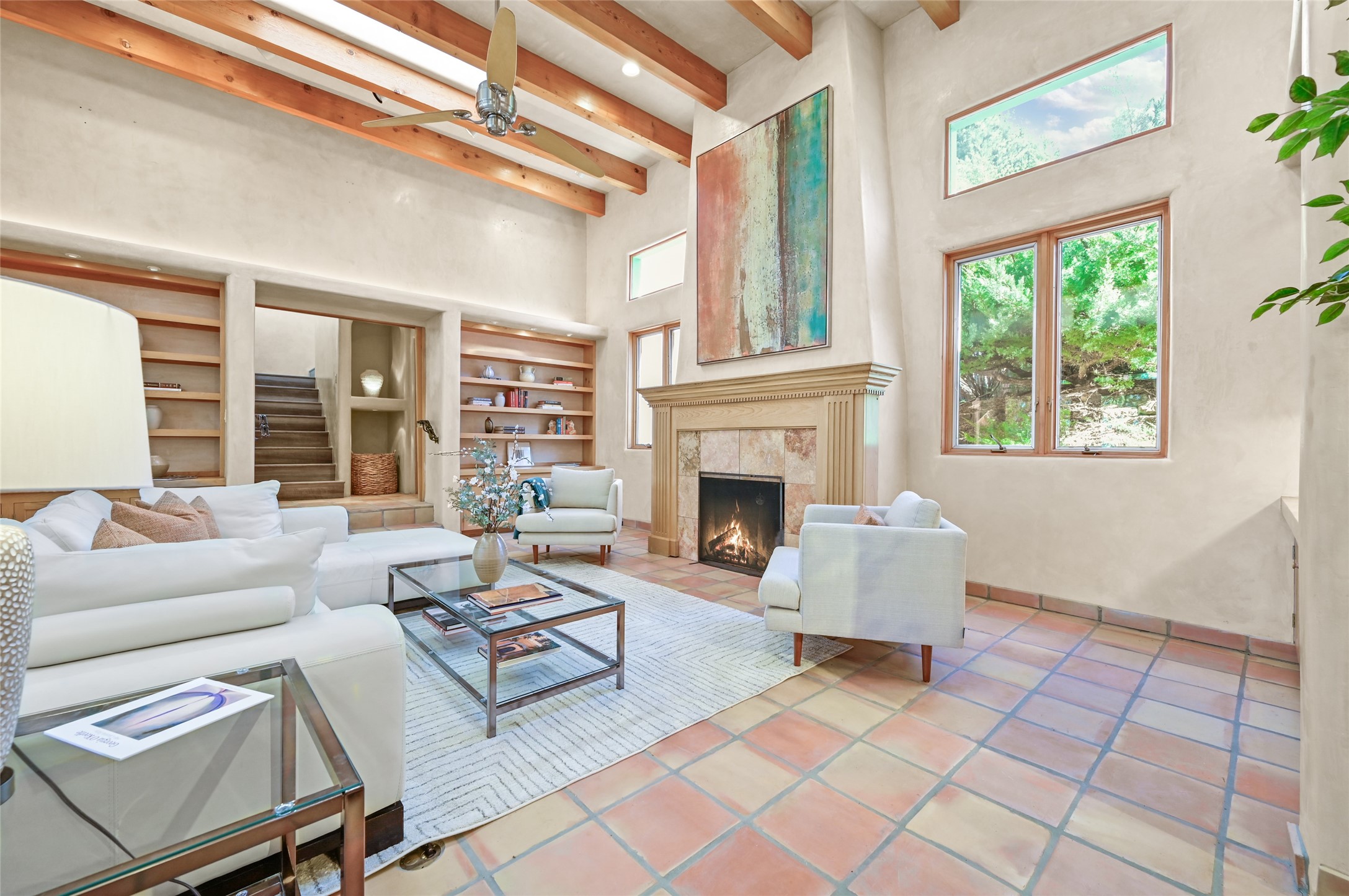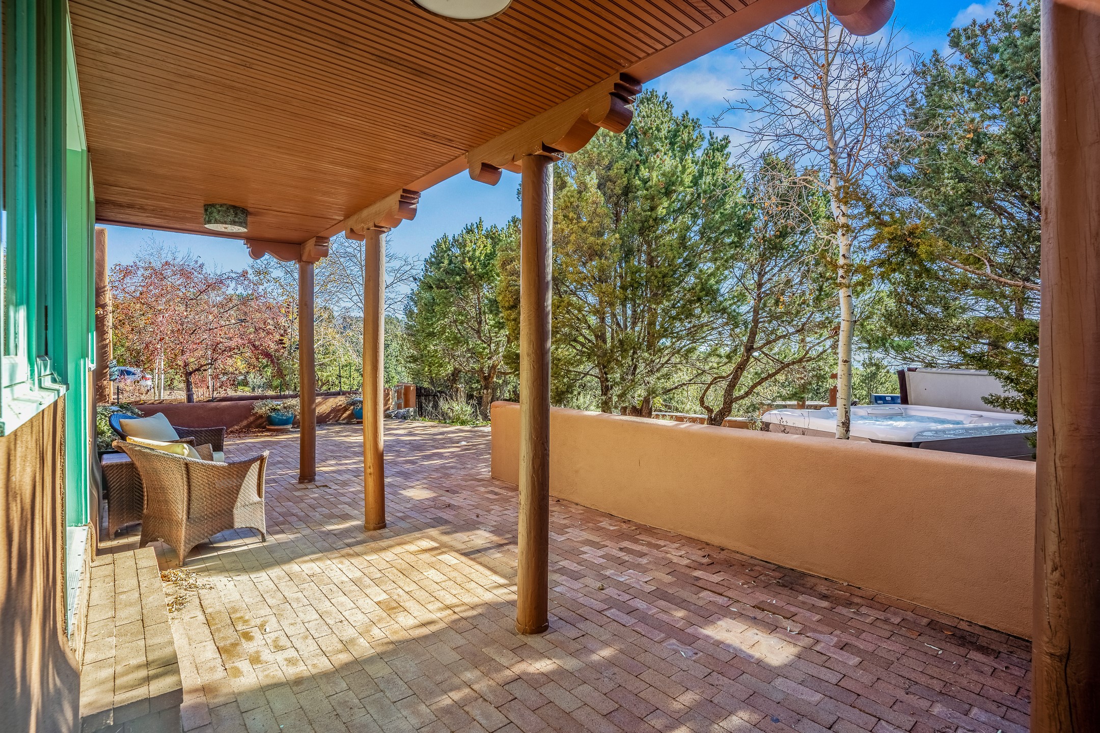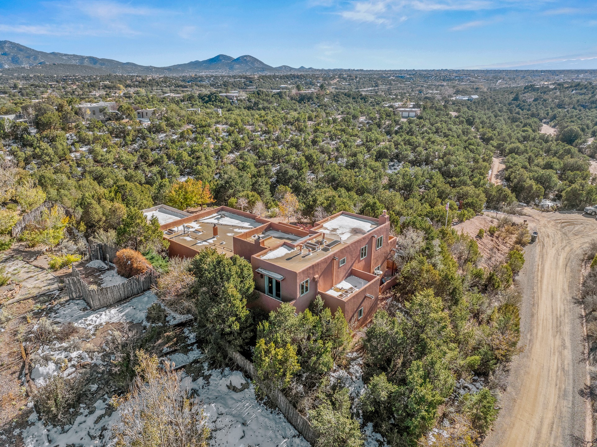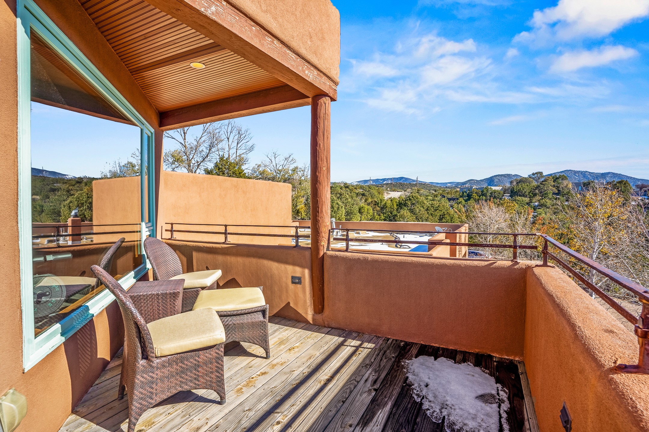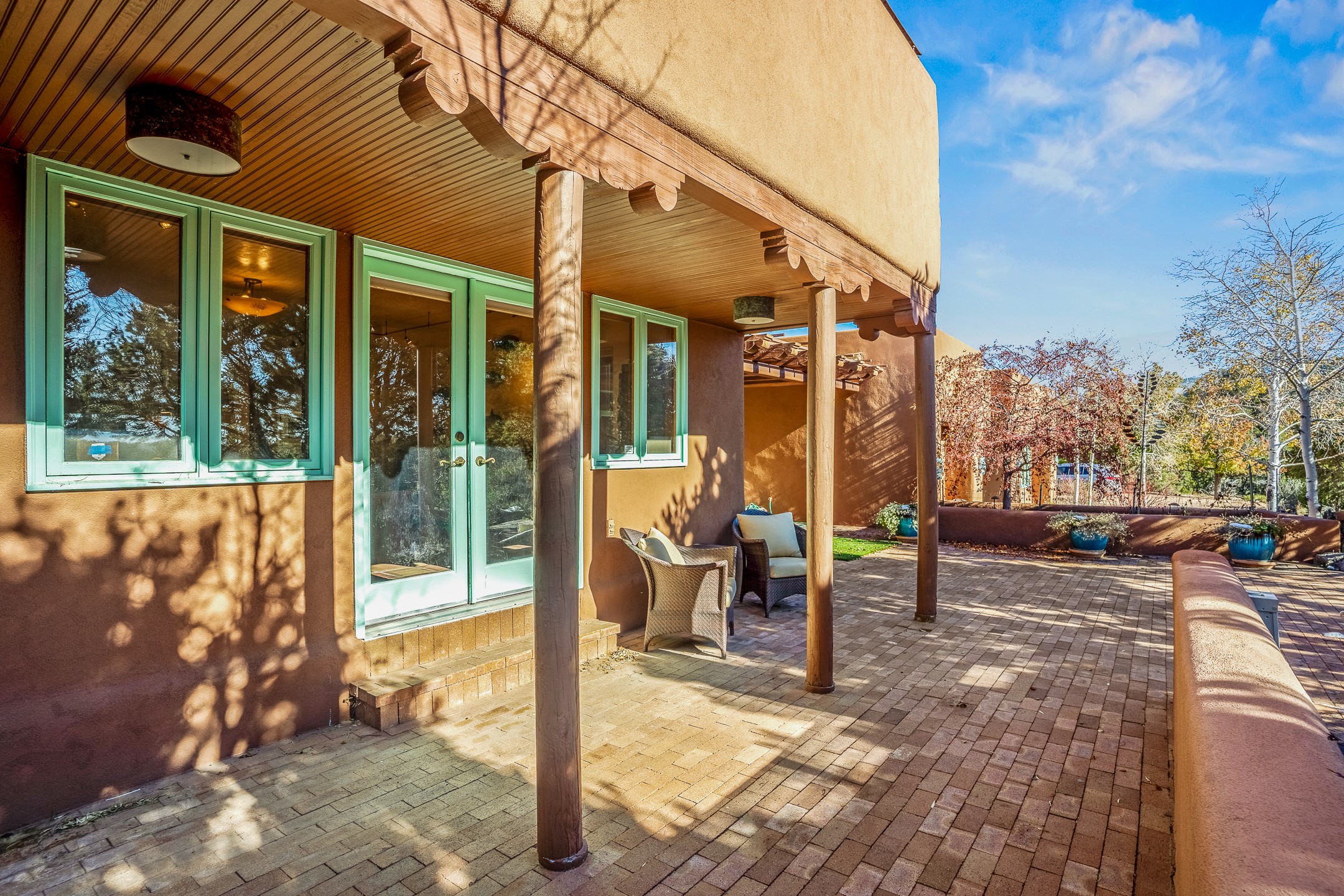 This oasis of a home is located close to downtown but far enough that you feel like you are at a private retreat. With multiple living areas inside and outside, this house can be a quiet space or offer an entertaining opportunity. With soaring ceilings, (some with tongue and groove, some with beams), plaster walls, saltillo tile, granite counters, fireplaces, and windows allowing the outside in throughout, this home is one to see and claim as your own. The outdoor spaces offer views, quiet time options and areas to enjoy family and friends throughout many of the months in Santa Fe. The upper level has an extra bedroom and a bonus room that currently operates as a workout room. Storage options abound throughout the house. From the kitchen window, you can watch the flowing fountain while you create that gourmet meal. The property is gated and has parking for at least 3 outside of the garages. Come and see it for yourself and you won't want to leave.