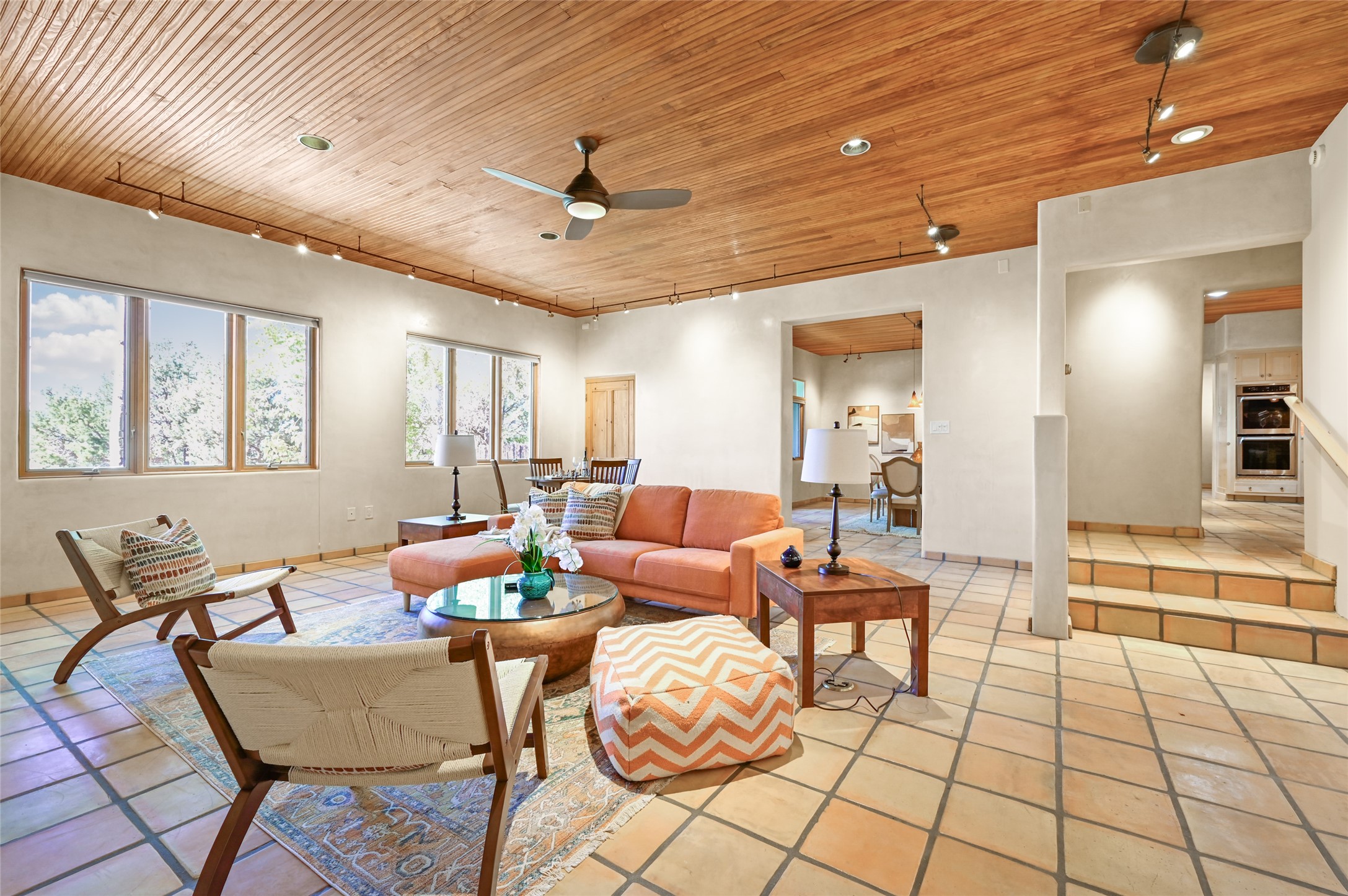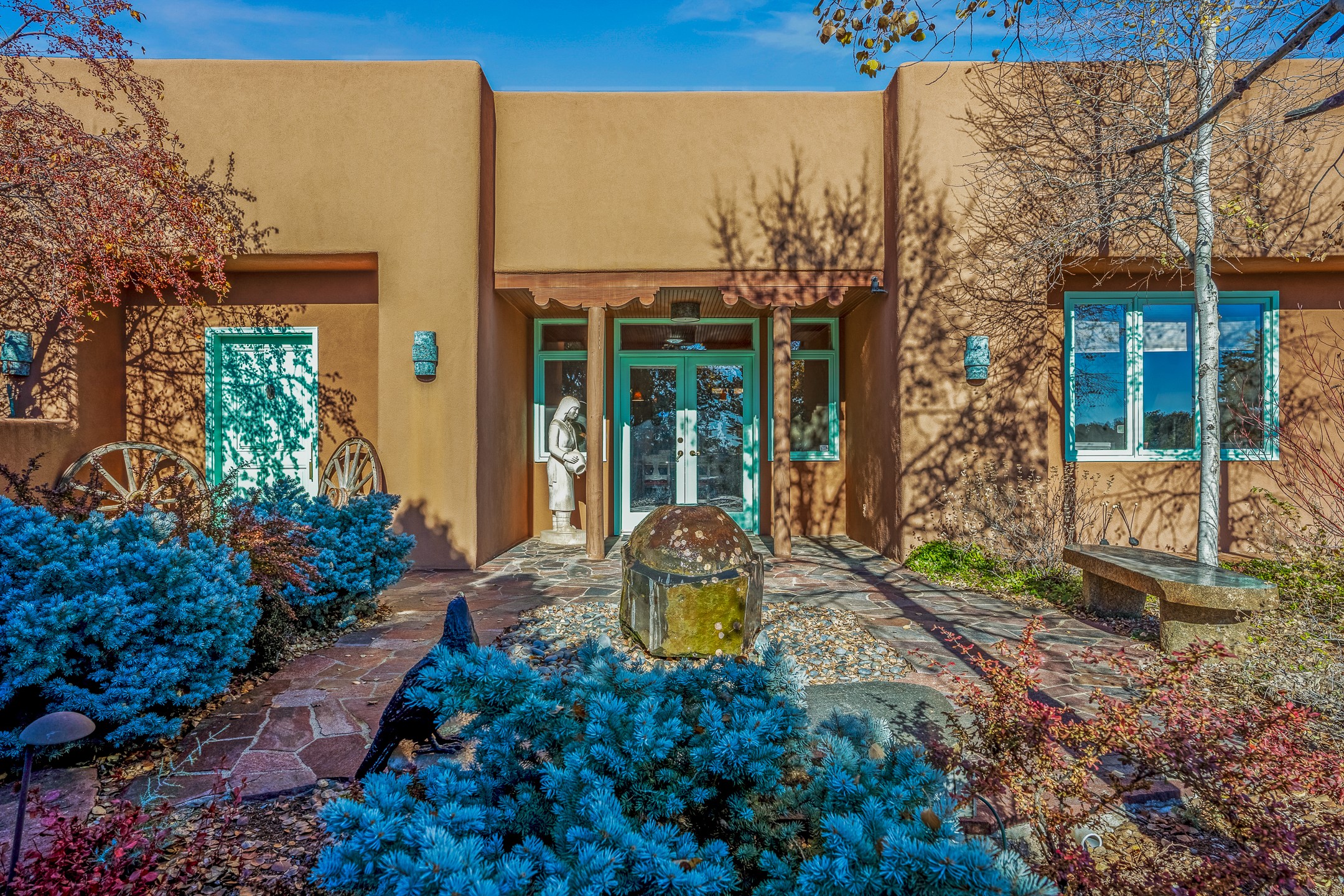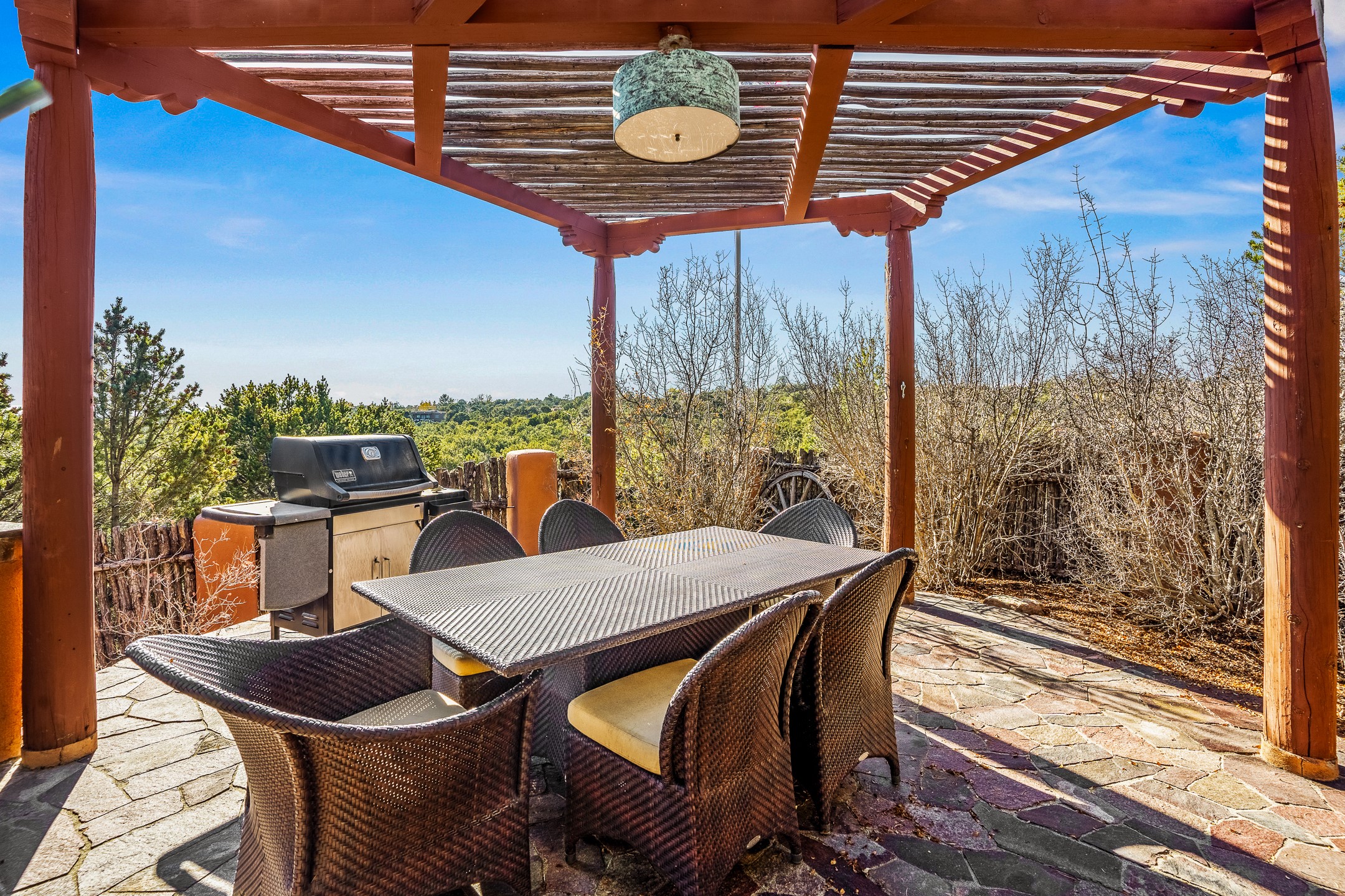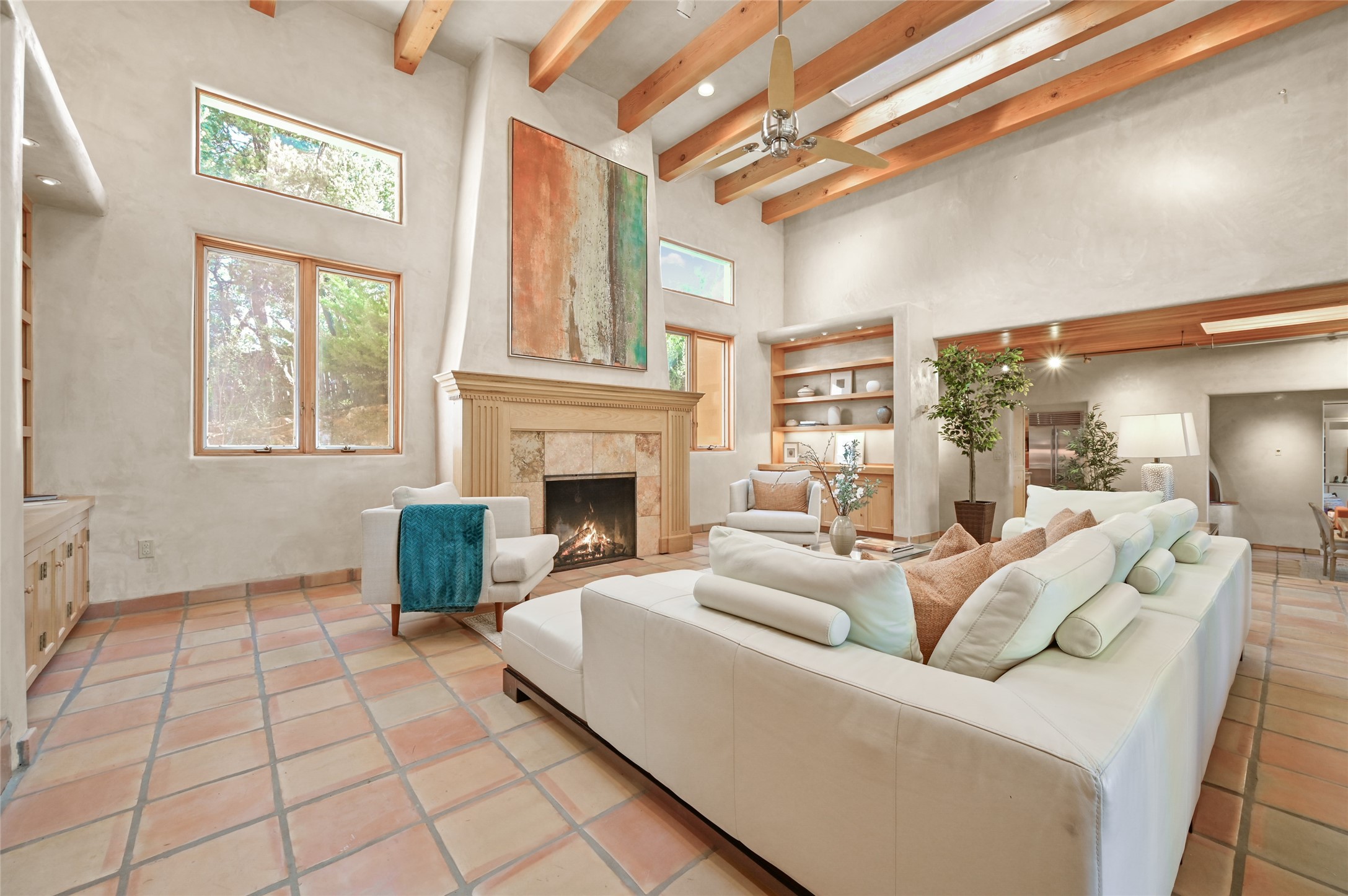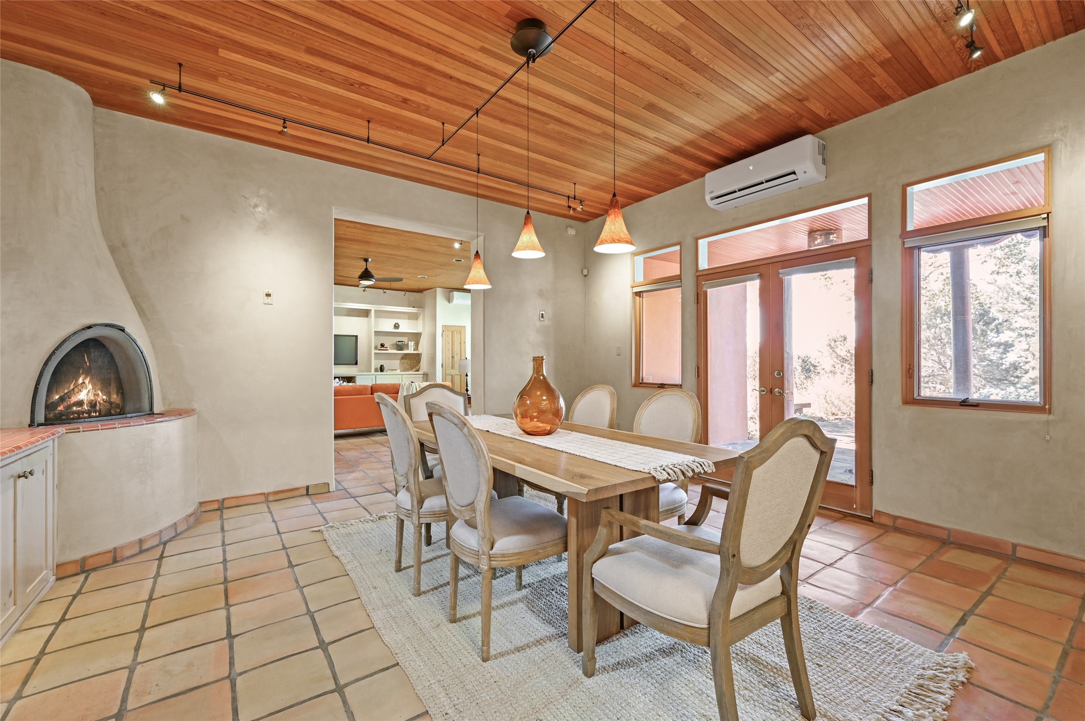 This oasis of a home is located close to downtown but far enough that you feel like you are at a private retreat. With multiple living areas inside and outside, this house can be a quiet space or offer an entertaining opportunity. With soaring ceilings, (some with tongue and groove, some with beams), plaster walls, saltillo tile, granite counters, fireplaces, and windows allowing the outside in throughout, this home is one to see and claim as your own. The outdoor spaces offer views, quiet time options and areas to enjoy family and friends throughout many of the months in Santa Fe. The upper level has an extra bedroom and a bonus room that currently operates as a workout room. Storage options abound throughout the house. From the kitchen window, you can watch the flowing fountain while you create that gourmet meal. The property is gated and has parking for at least 3 outside of the garages. Come and see it for yourself and you won't want to leave.