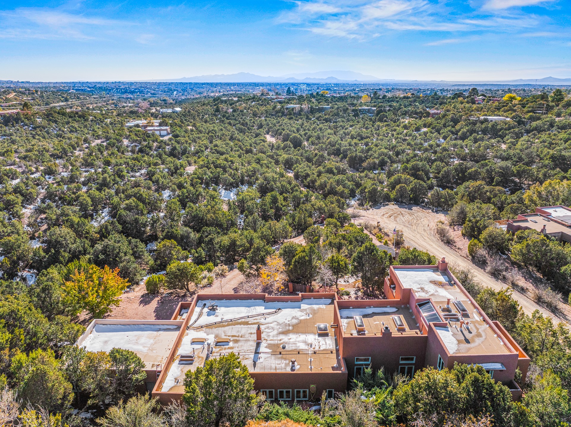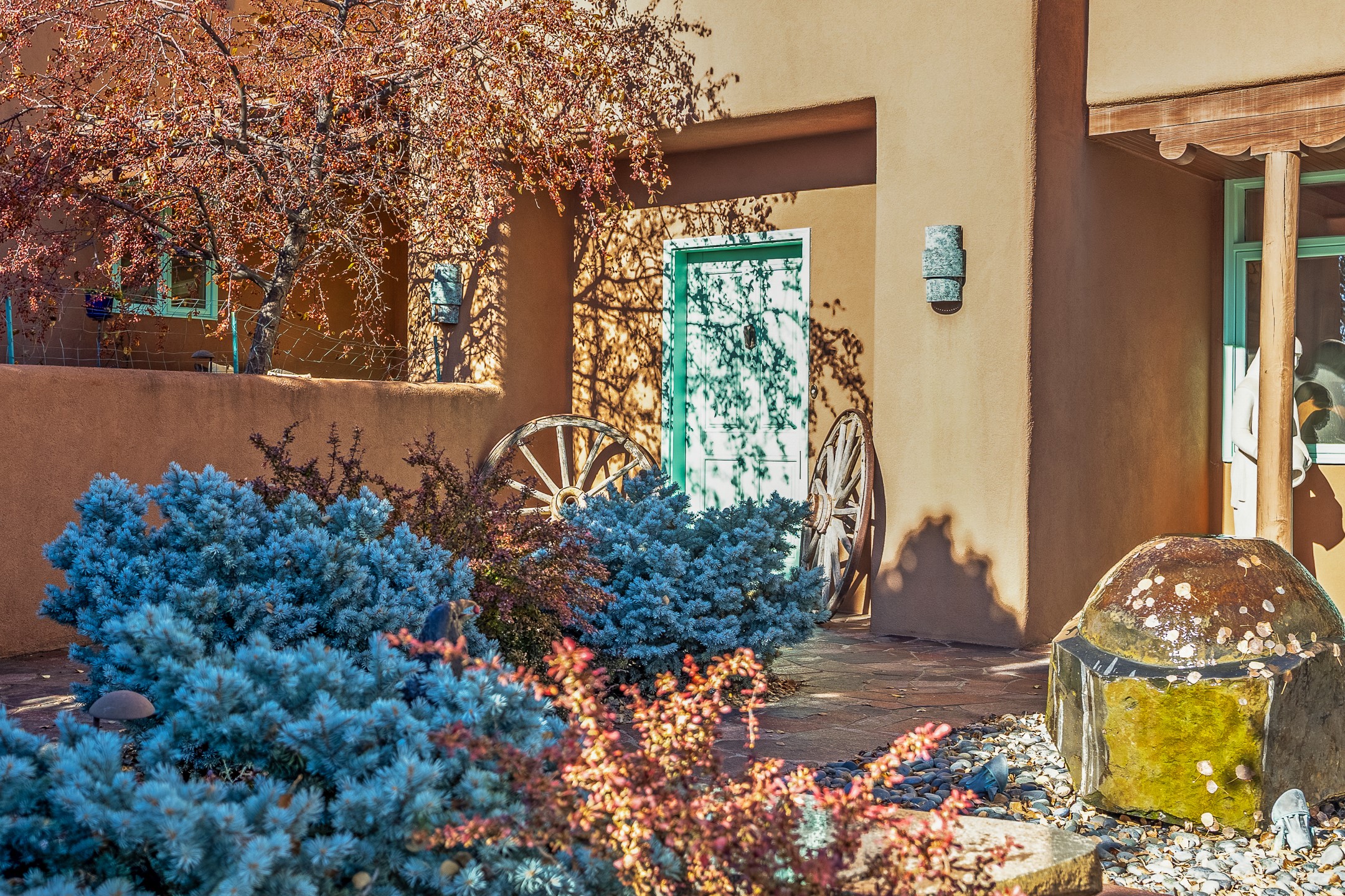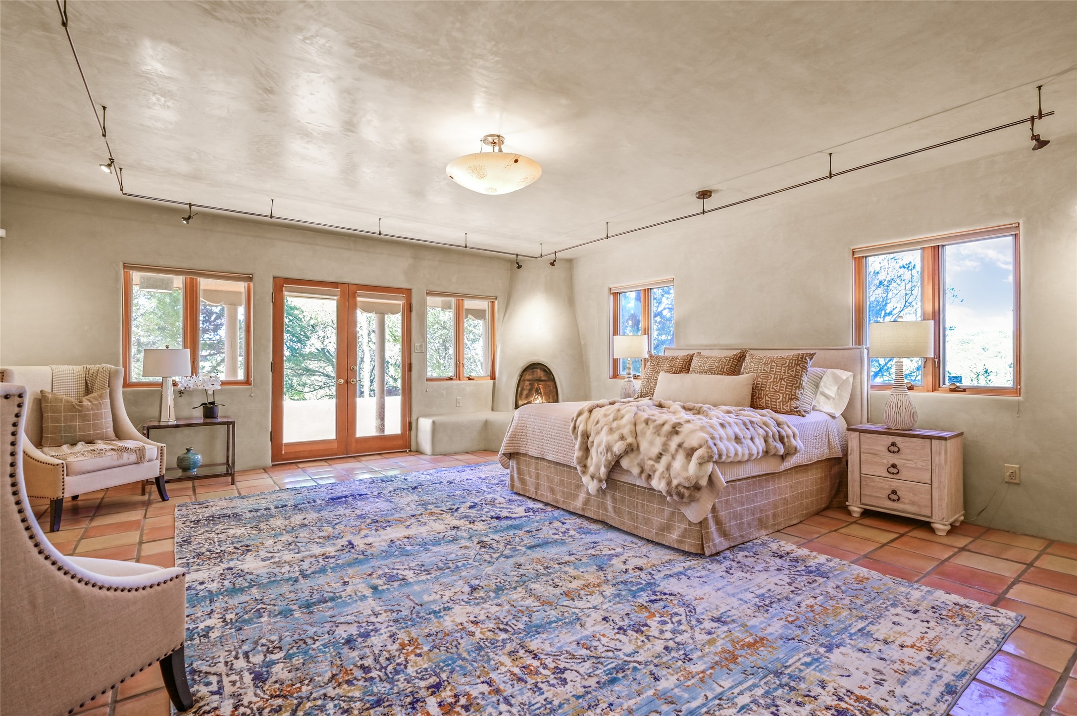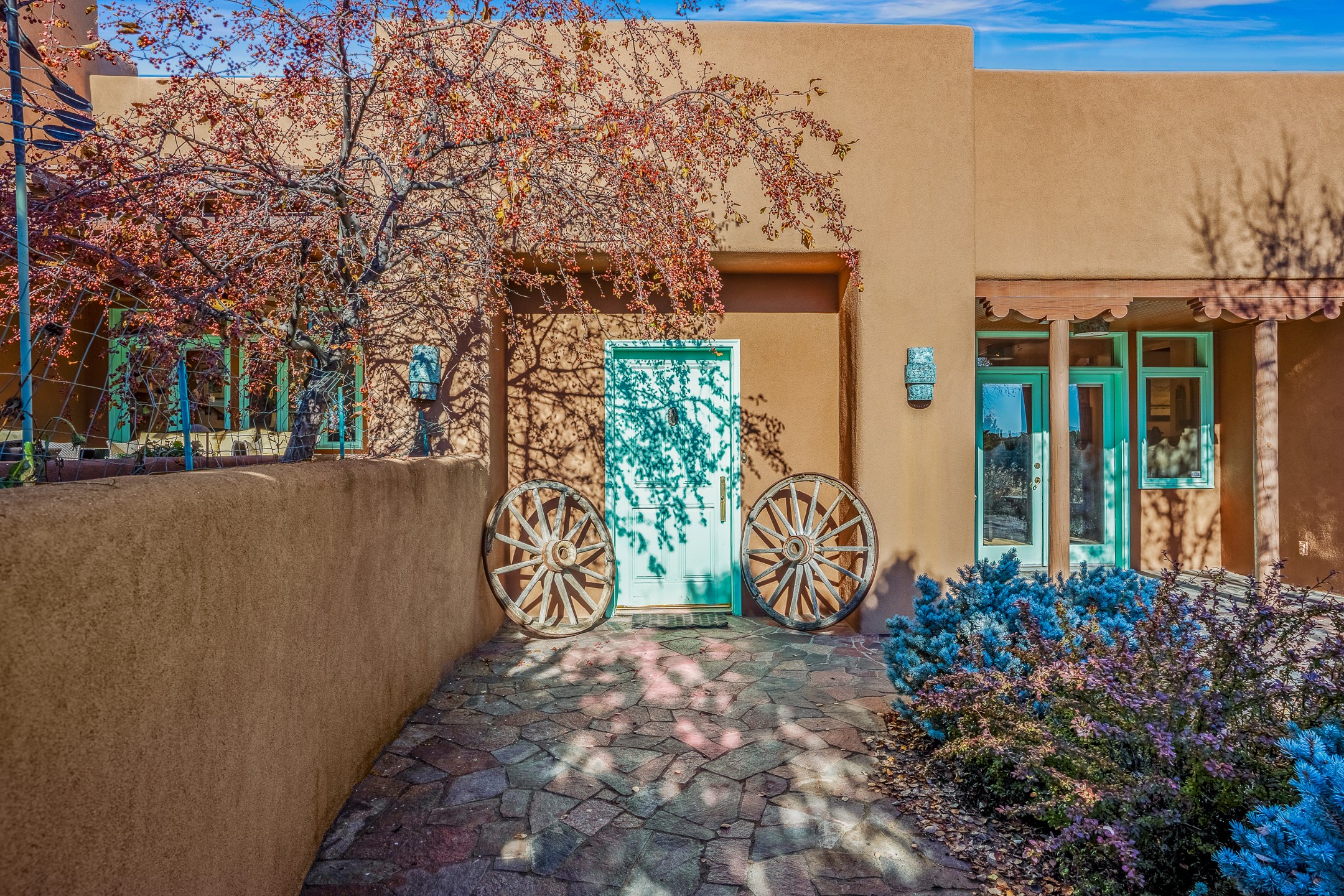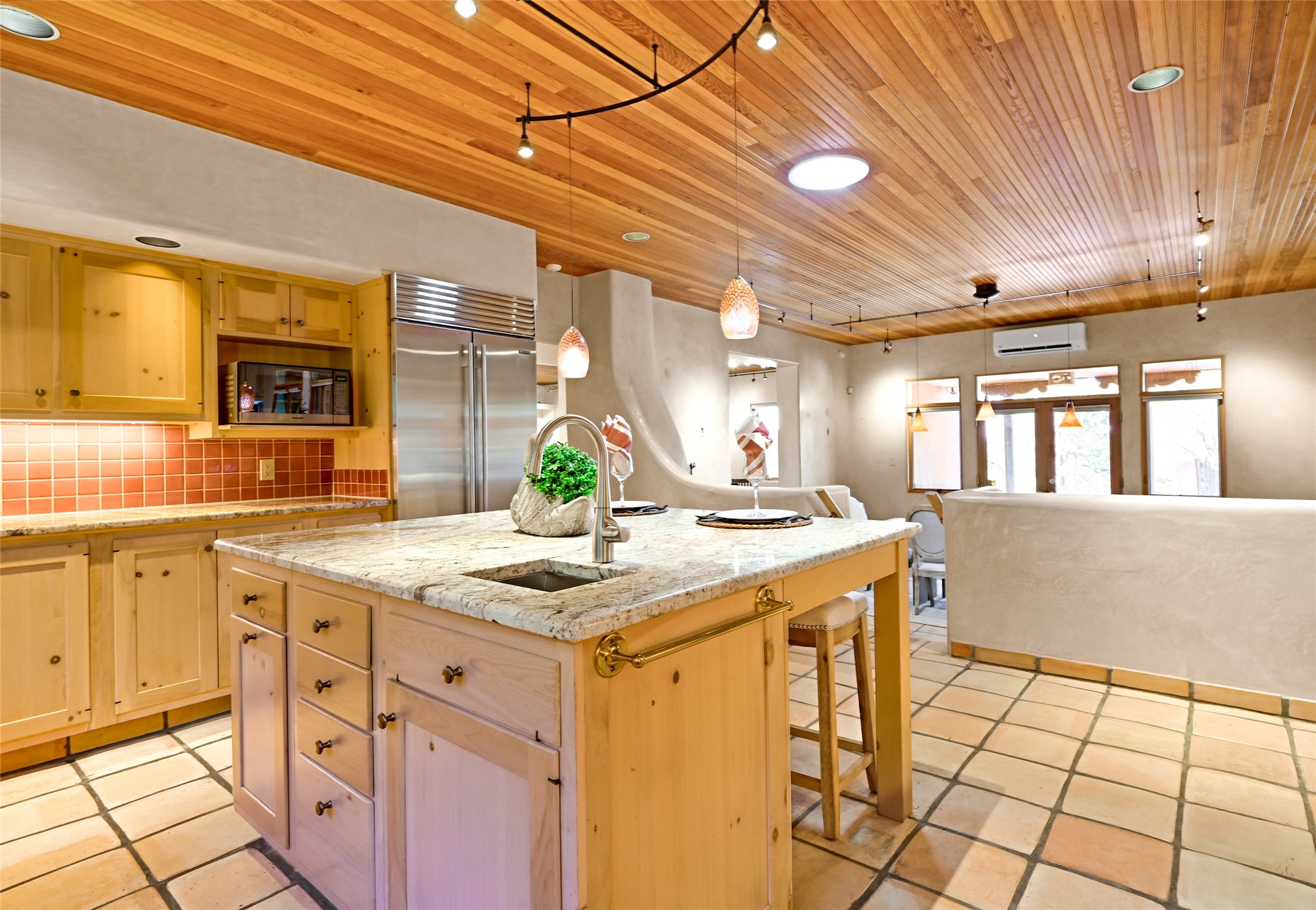 This oasis of a home is located close to downtown but far enough that you feel like you are at a private retreat. With multiple living areas inside and outside, this house can be a quiet space or offer an entertaining opportunity. With soaring ceilings, (some with tongue and groove, some with beams), plaster walls, saltillo tile, granite counters, fireplaces, and windows allowing the outside in throughout, this home is one to see and claim as your own. The outdoor spaces offer views, quiet time options and areas to enjoy family and friends throughout many of the months in Santa Fe. The upper level has an extra bedroom and a bonus room that currently operates as a workout room. Storage options abound throughout the house. From the kitchen window, you can watch the flowing fountain while you create that gourmet meal. The property is gated and has parking for at least 3 outside of the garages. Come and see it for yourself and you won't want to leave.