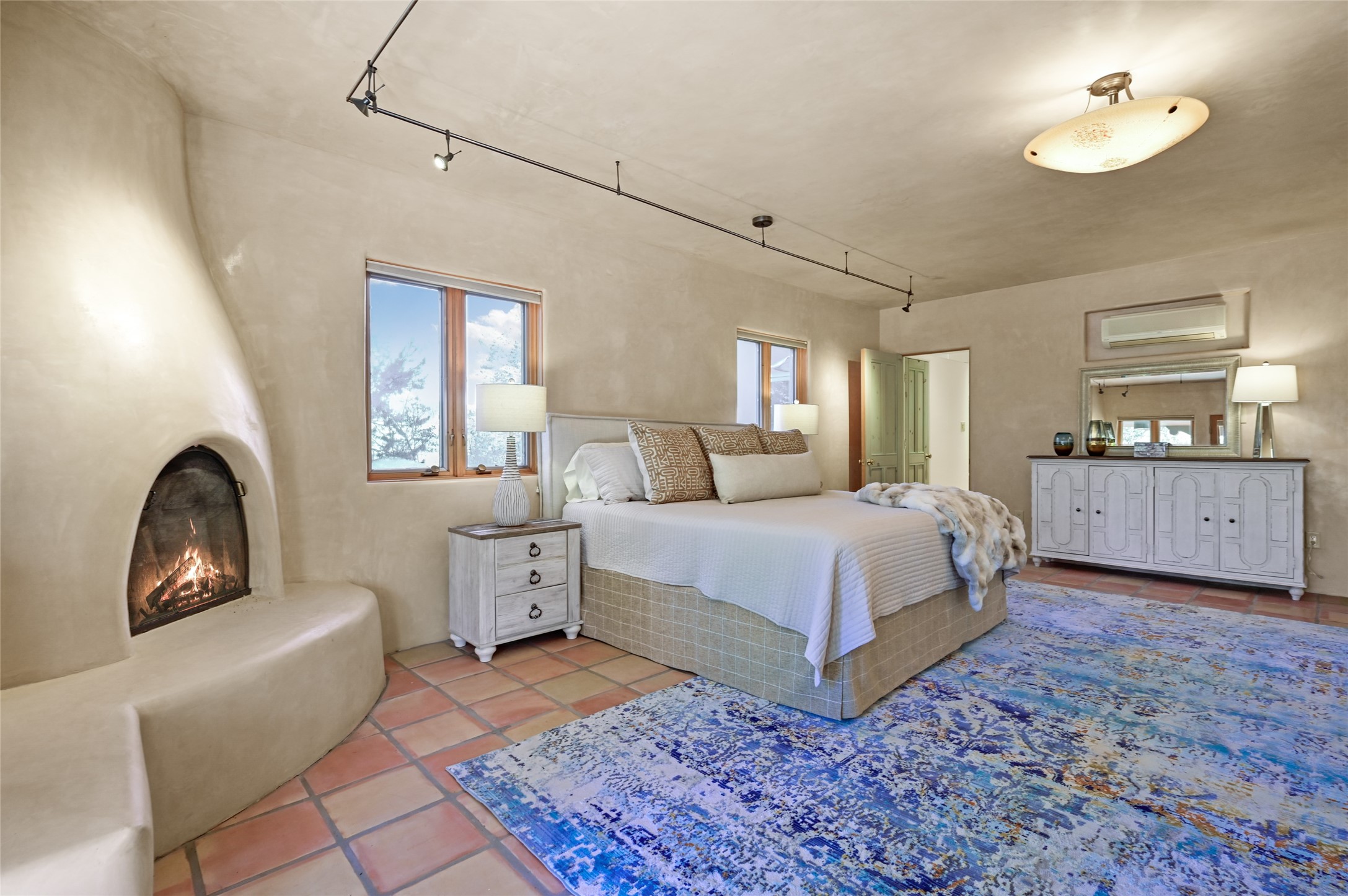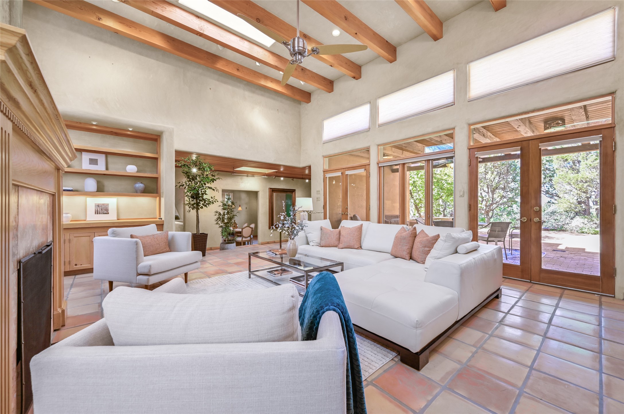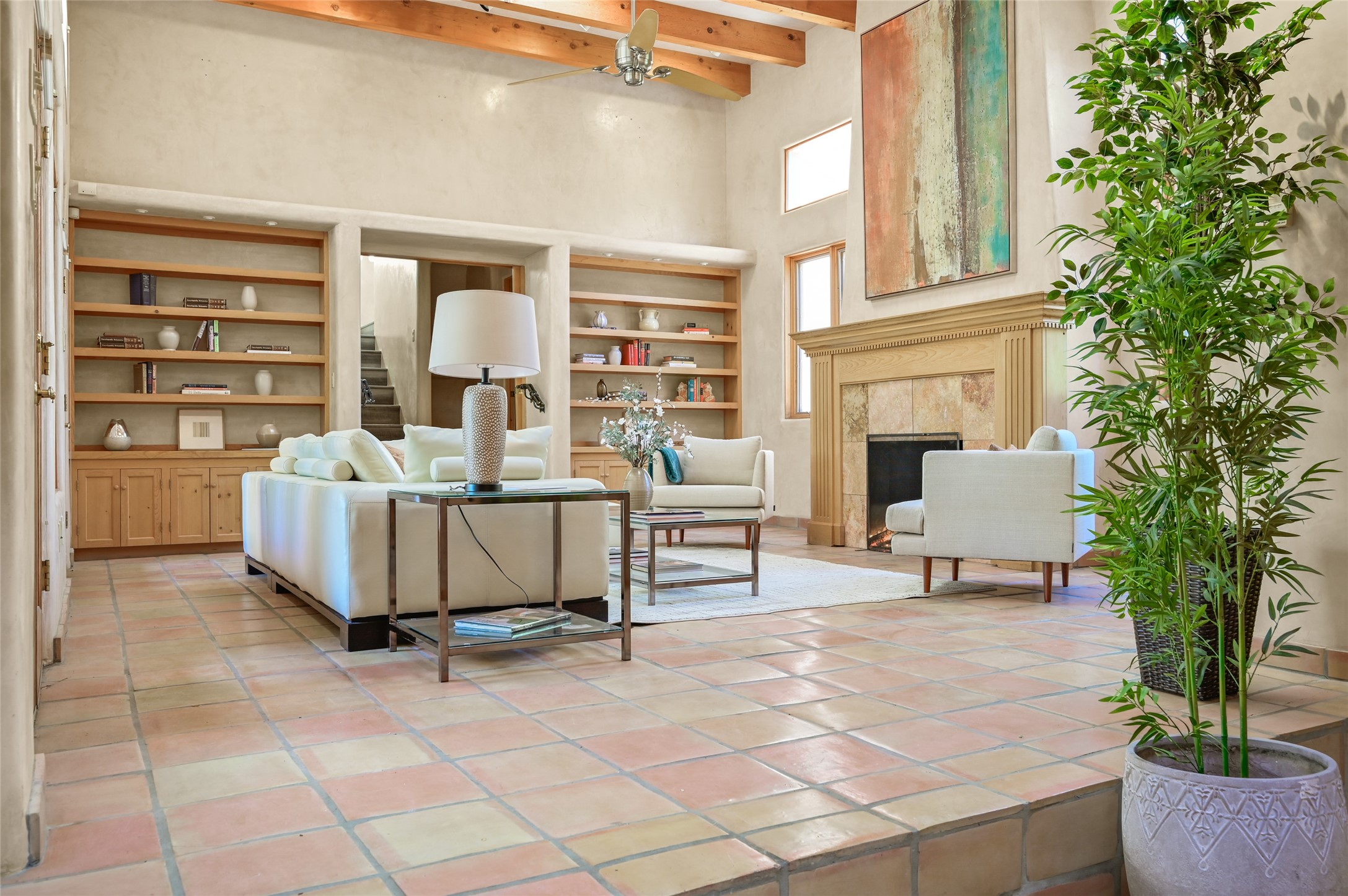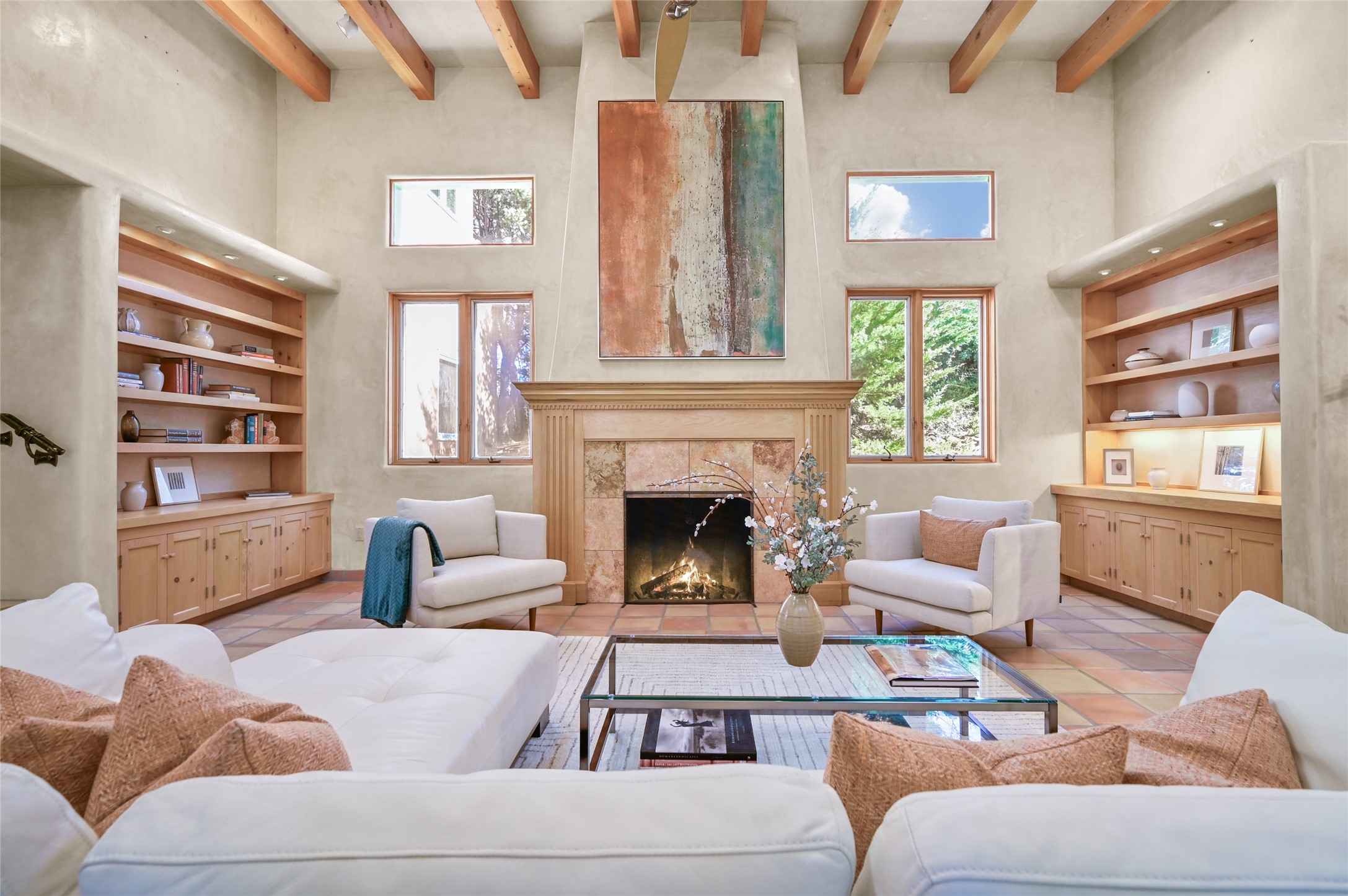 This oasis of a home is located close to downtown but far enough that you feel like you are at a private retreat. With multiple living areas inside and outside, this house can be a quiet space or offer an entertaining opportunity. With soaring ceilings, (some with tongue and groove, some with beams), plaster walls, saltillo tile, granite counters, fireplaces, and windows allowing the outside in throughout, this home is one to see and claim as your own. The outdoor spaces offer views, quiet time options and areas to enjoy family and friends throughout many of the months in Santa Fe. The upper level has an extra bedroom and a bonus room that currently operates as a workout room. Storage options abound throughout the house. From the kitchen window, you can watch the flowing fountain while you create that gourmet meal. The property is gated and has parking for at least 3 outside of the garages. Come and see it for yourself and you won't want to leave.