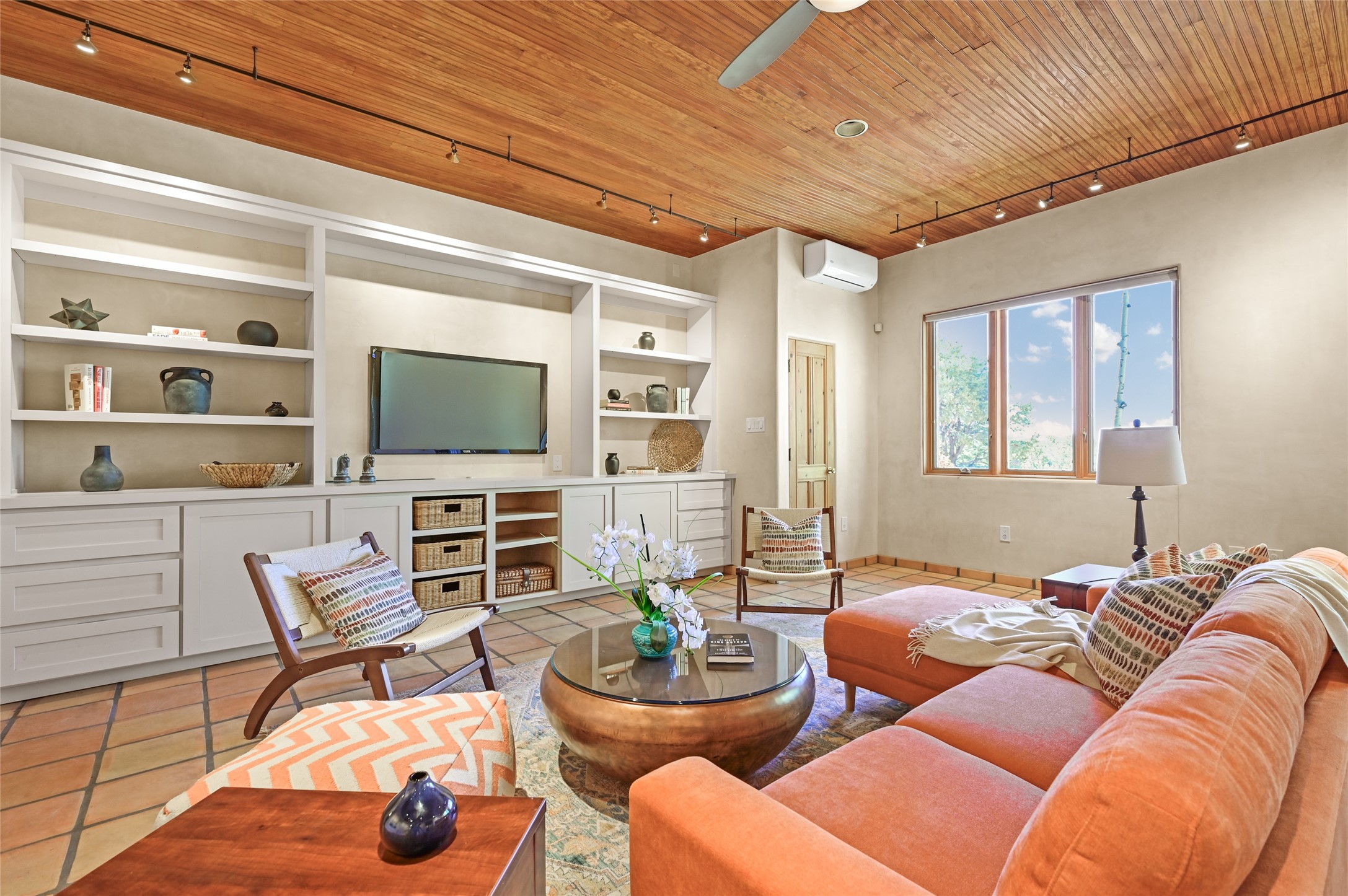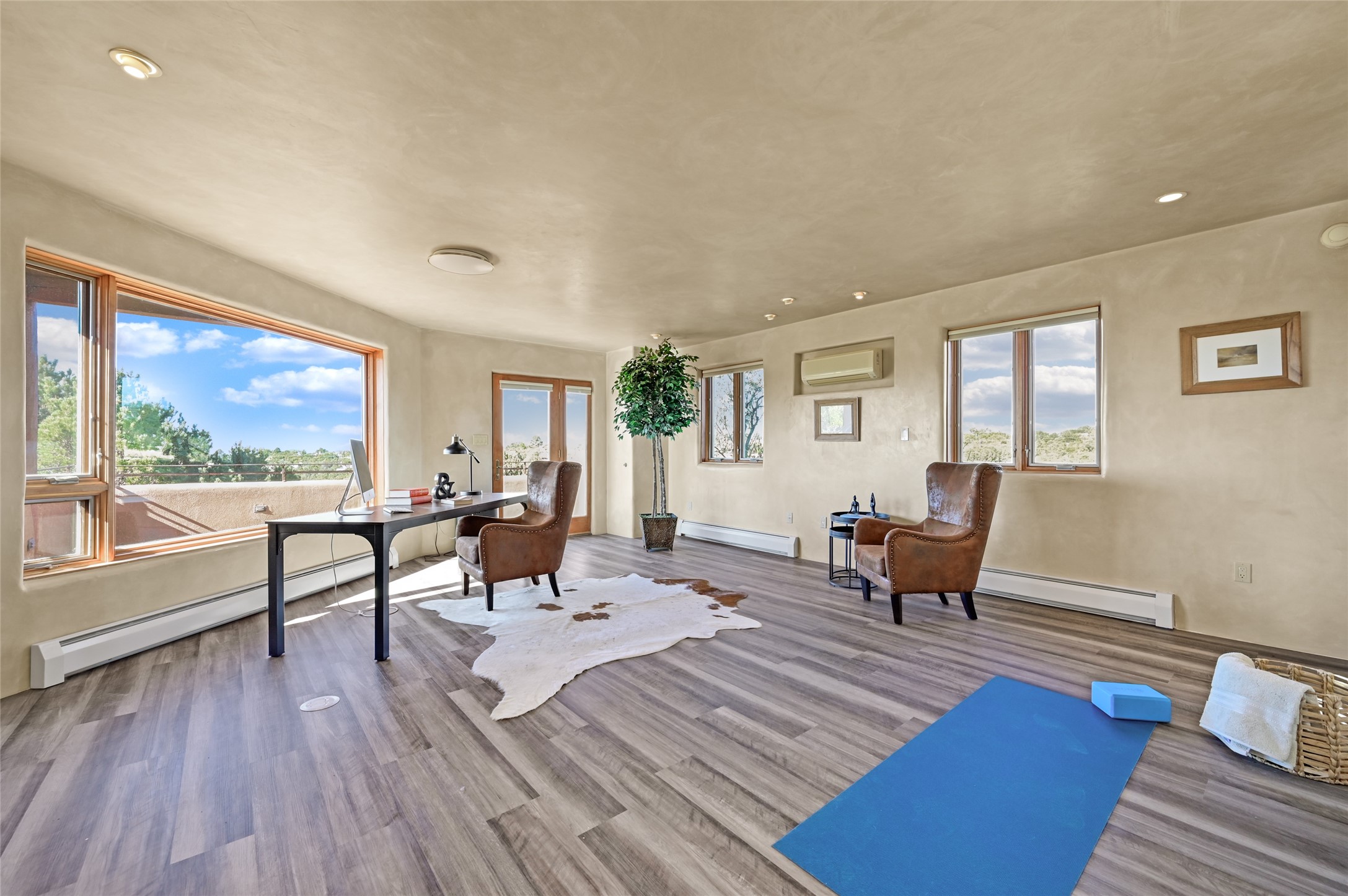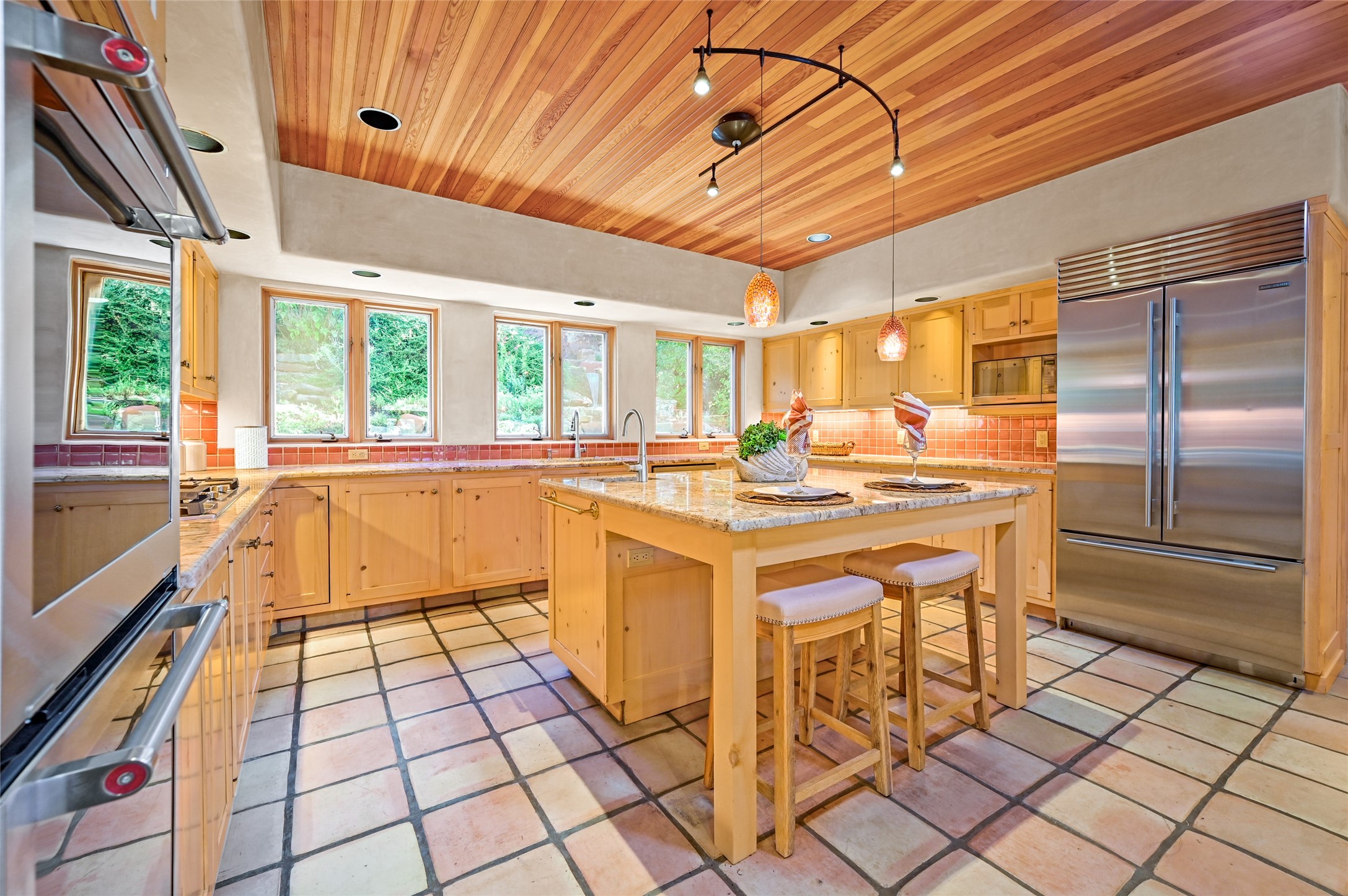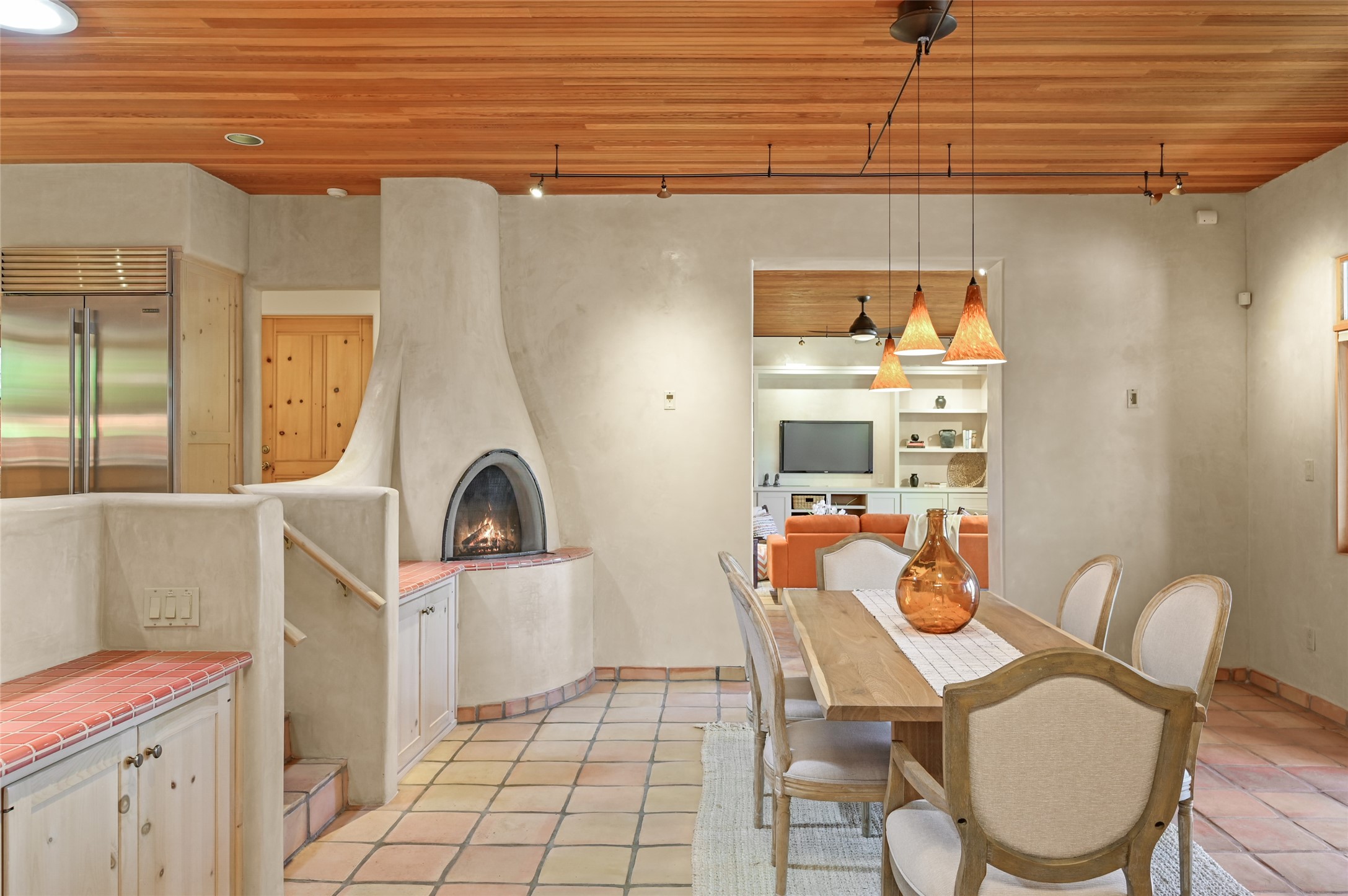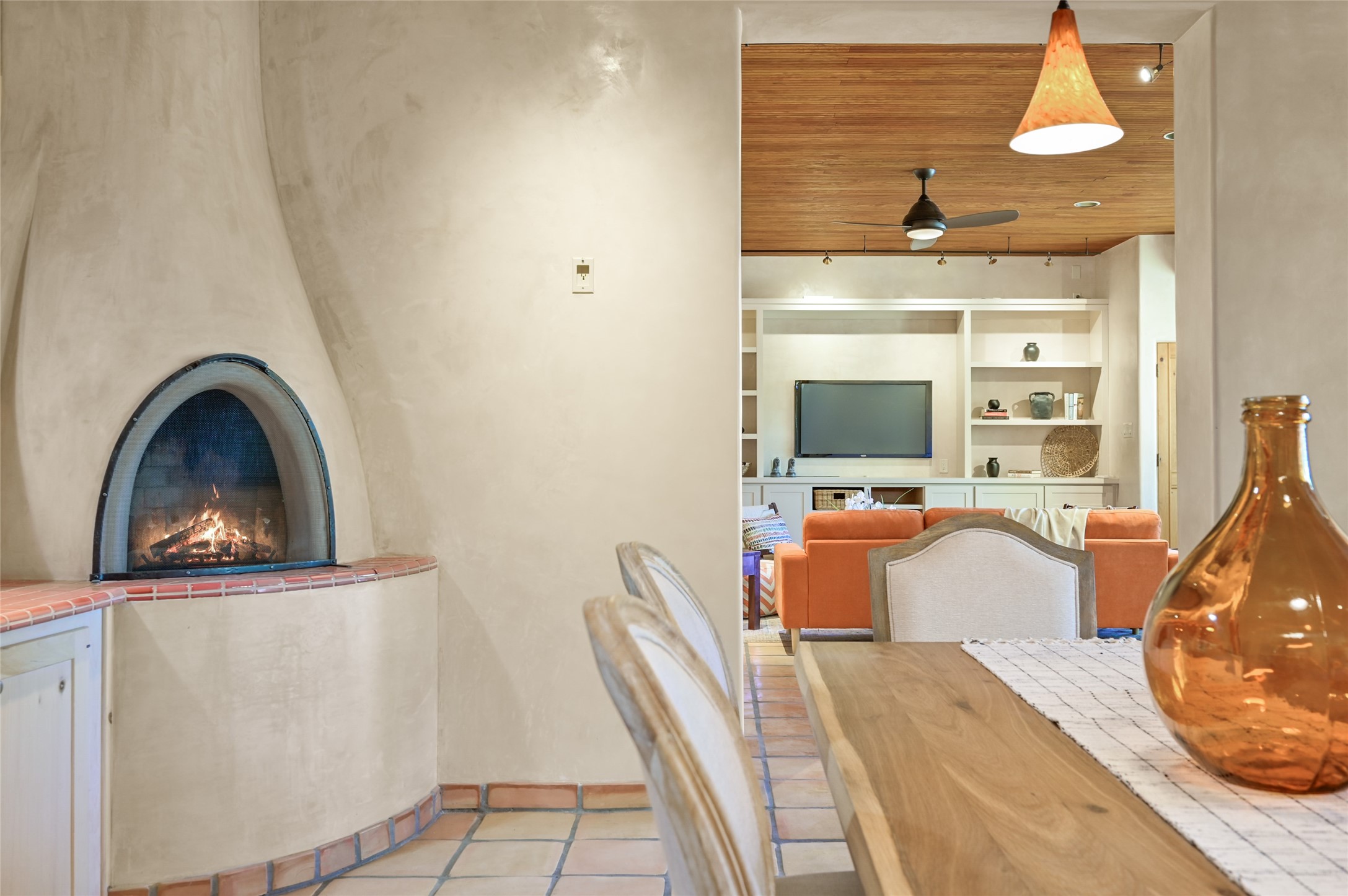 This oasis of a home is located close to downtown but far enough that you feel like you are at a private retreat. With multiple living areas inside and outside, this house can be a quiet space or offer an entertaining opportunity. With soaring ceilings, (some with tongue and groove, some with beams), plaster walls, saltillo tile, granite counters, fireplaces, and windows allowing the outside in throughout, this home is one to see and claim as your own. The outdoor spaces offer views, quiet time options and areas to enjoy family and friends throughout many of the months in Santa Fe. The upper level has an extra bedroom and a bonus room that currently operates as a workout room. Storage options abound throughout the house. From the kitchen window, you can watch the flowing fountain while you create that gourmet meal. The property is gated and has parking for at least 3 outside of the garages. Come and see it for yourself and you won't want to leave.