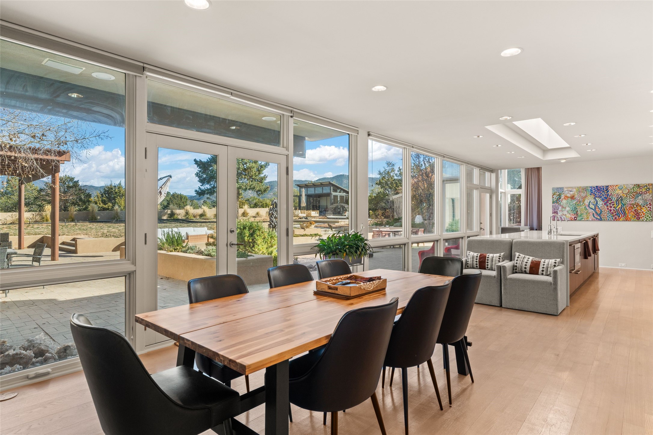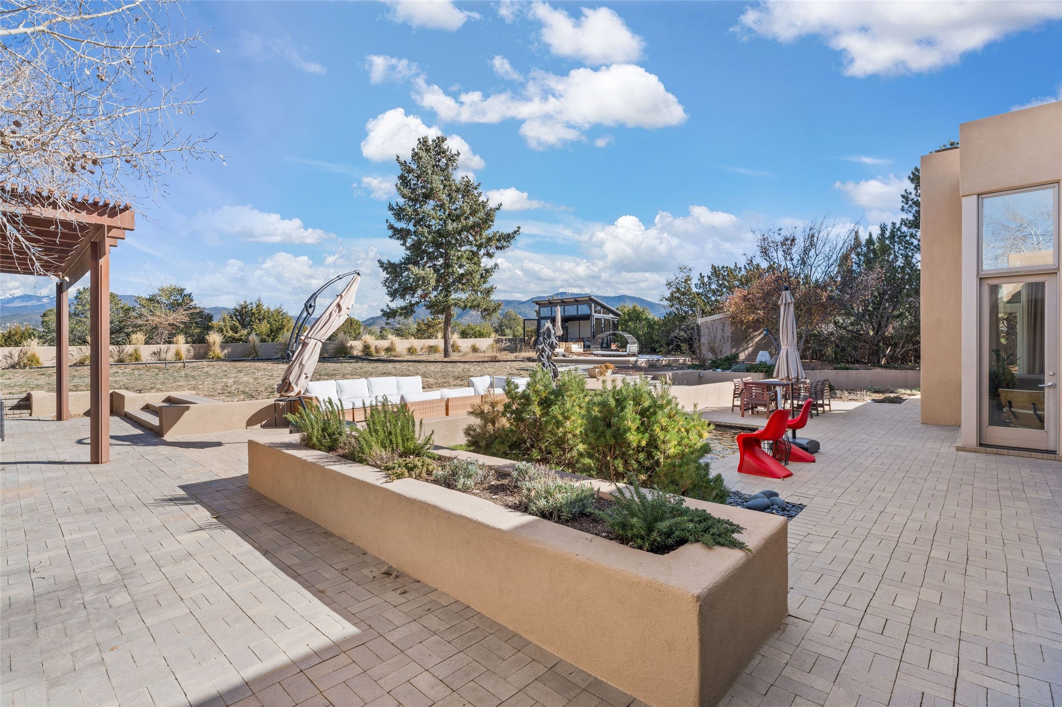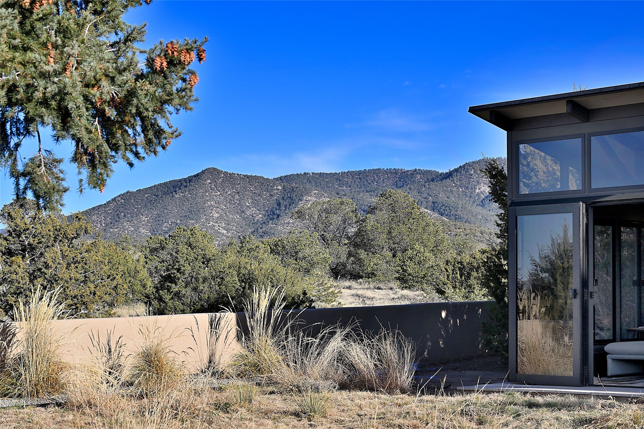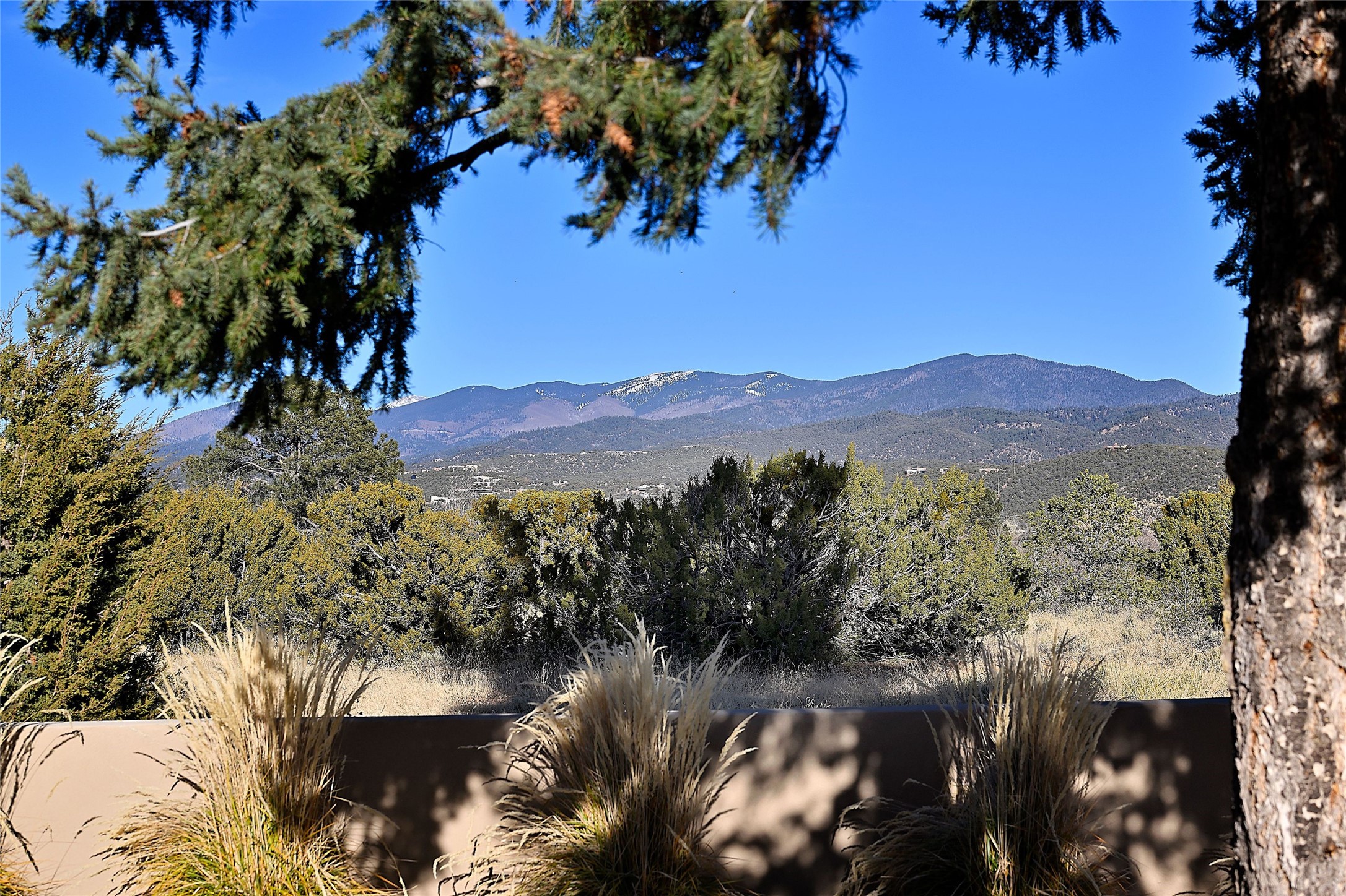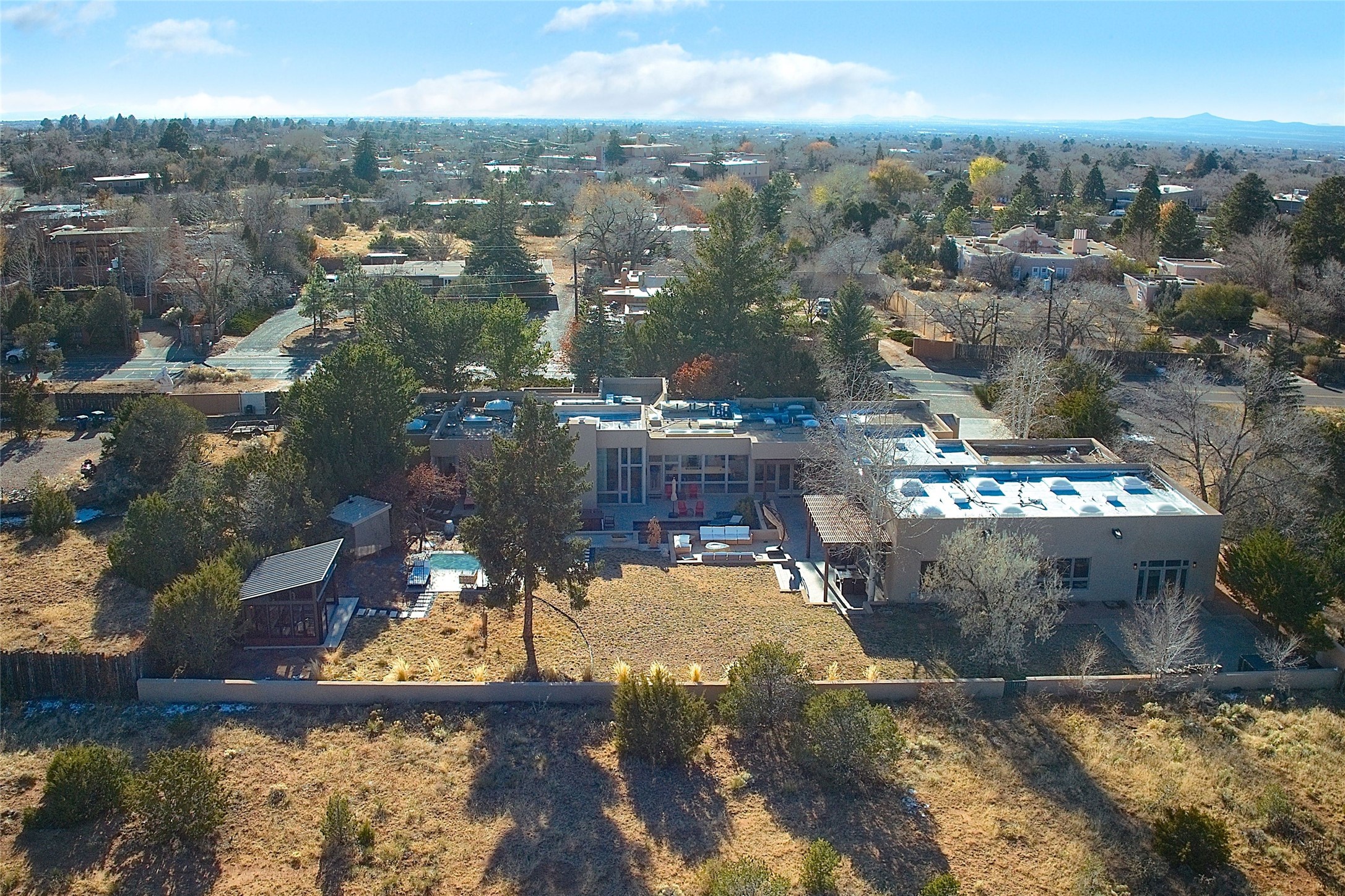 Remarkable. To be on Old Santa Fe Trail with majestic, panoramic views overlooking dedicated open space towards the Sangre de Cristo Mountains in a one-level, light filled Contemporary Masterpiece that had a major renovations done in 2021 is a singular opportunity. The home features a gleaming new kitchen, spectacular new baths in the main suites, expansive open spaces and your own private resort in the backyard. The current owners lovingly and intelligently renovated and elevated this bright, open space that lets the outside in - from the views to the private backyard featuring koi pond, plunge pool, fire pit and gazebo. - this home surprises on every level. The kitchen/living room arrangement now flows to match today's lifestyle and provides a wonderful backdrop for art lovers as well as a grand entertaining space. The large, totally renovated kitchen has a 16' island with Wolf/Sub Zero appliances, including an induction cooktop and steam oven. The new butler pantry provides additional storage, a freezer, second oven, and second microwave. A chef's kitchen perfect for entertaining. The library off the primary bedroom, along with an attached bedroom or workout space and additional bath - make for a private suite area that is comfortable for day-to-day living.The extraordinary north area with 2nd primary suite, is rare to say the least. The area, with one of Santa Fe's great media rooms, has soaring ceiling height, great walls for the largest flat screens, and walls of glass that frame the magnificent views of the rear of the property and the Sangres. The next space in the north section of the house functions as a ceramics studio for the current owners, but could be a command-central home office sharing the attributes of the media room as well or an extended master closet. The great primary suite with views and volume, is cloistered away from the rest of the home for privacy and quiet and is serviced by a brand new bathroom. The attached guest quarters is ideal for many living situations, maintaining privacy and comfort. One cannot overestimate the convenience of being close-in Old Santa Fe Trail and the ability to enjoy downtown Santa Fe on a moment's notice. All in all, this is one of the most extraordinary offerings in the entire Santa Fe marketplace with views of the Sangre's that can never be obstructed.