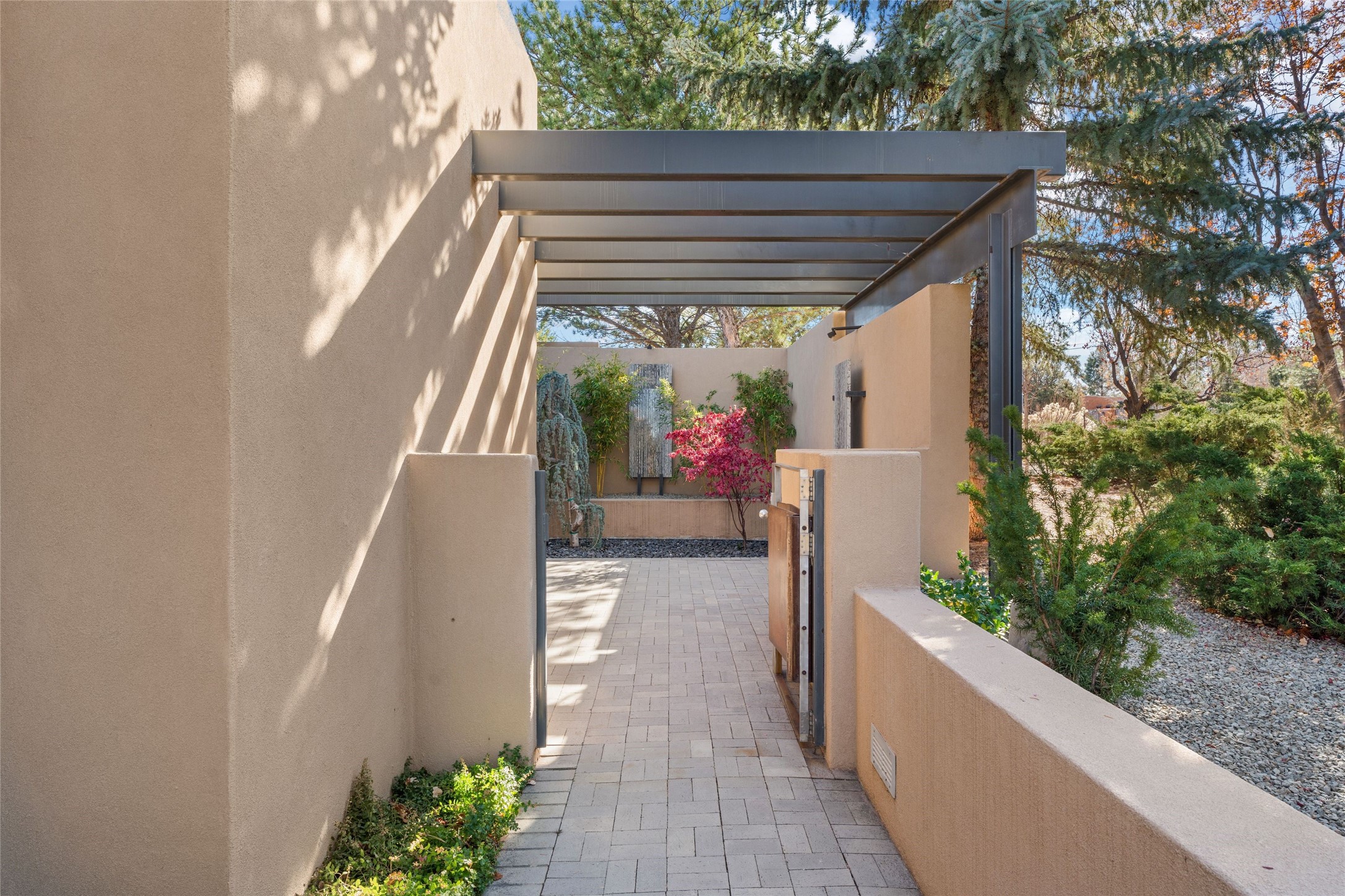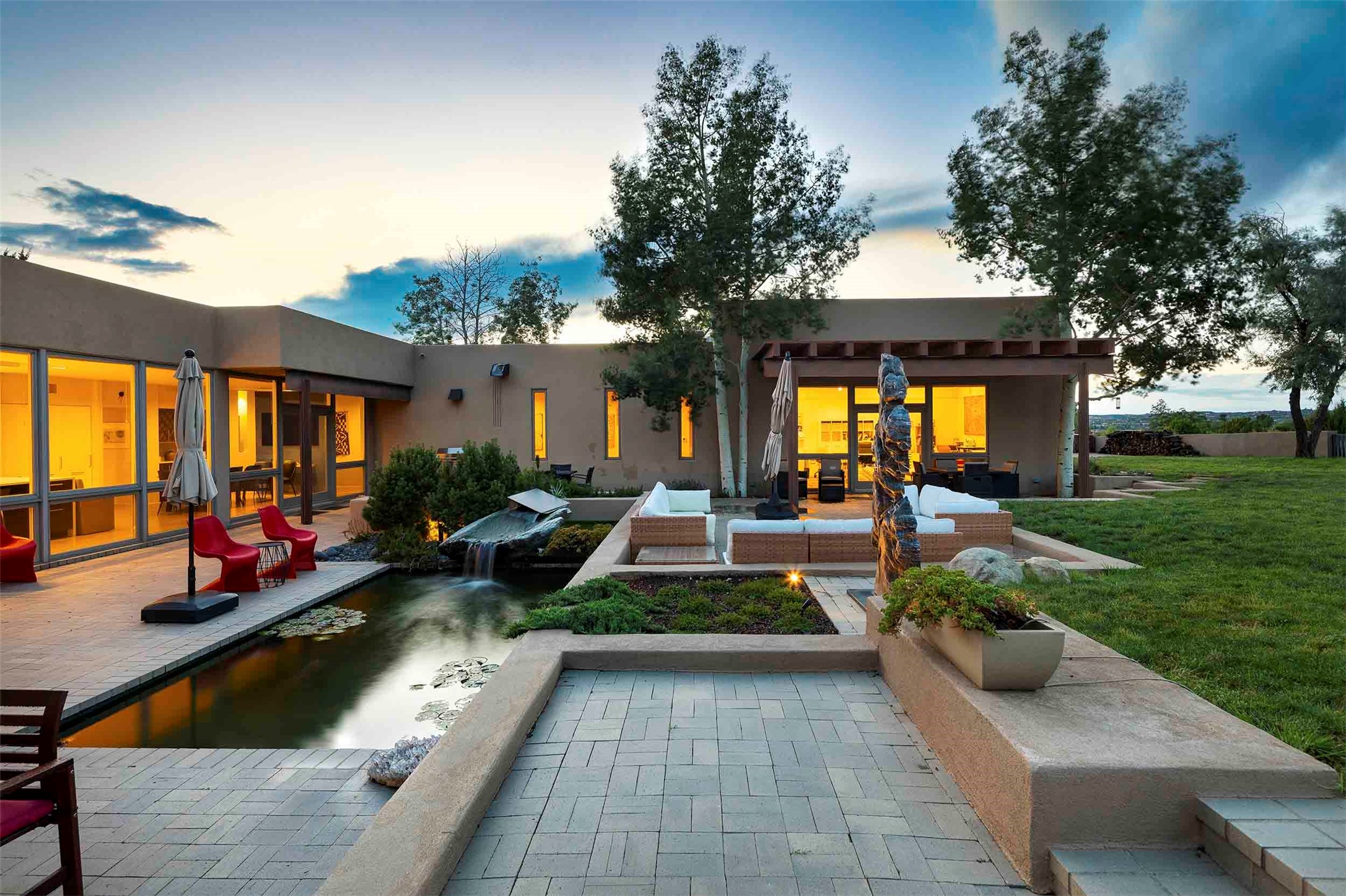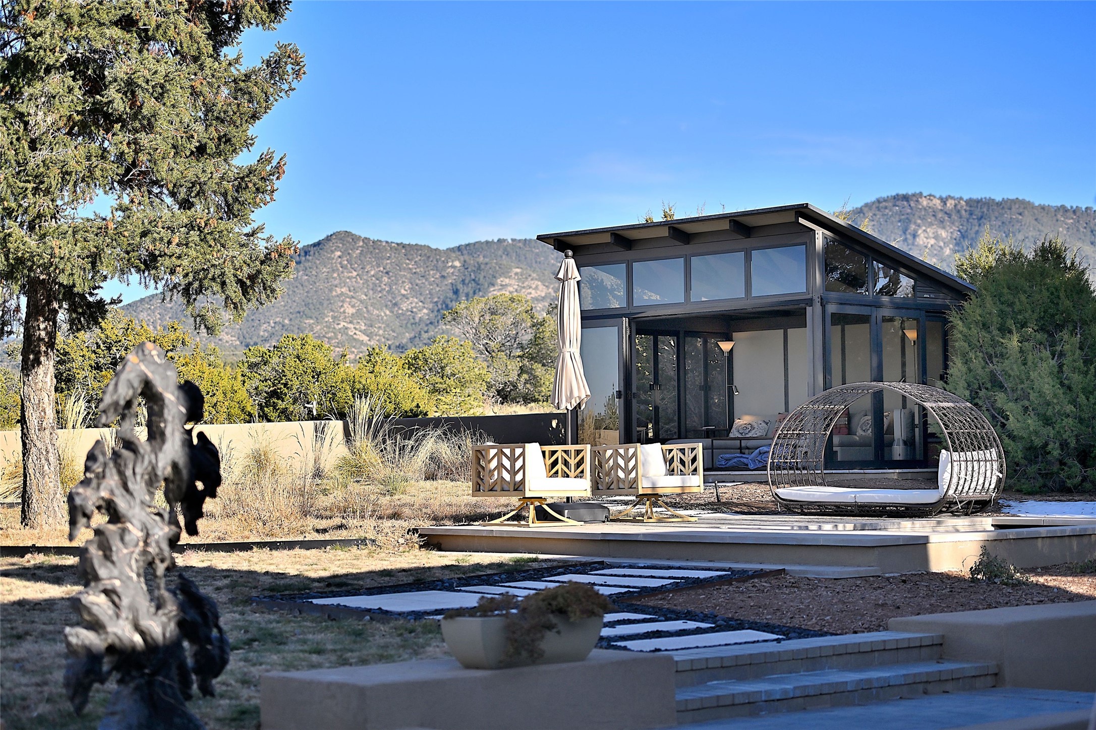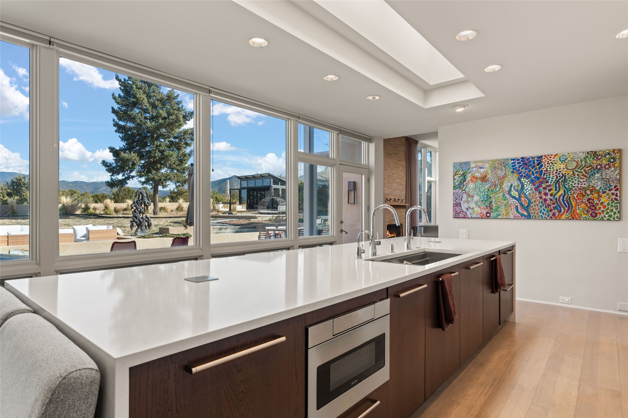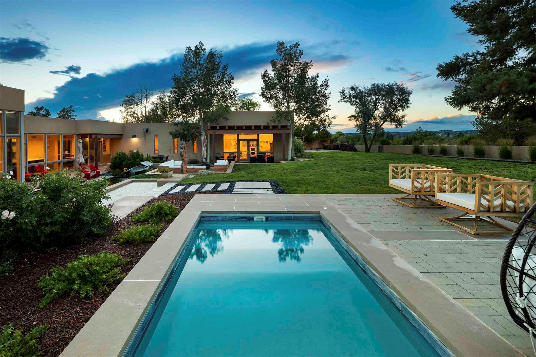 Remarkable. To be on Old Santa Fe Trail with majestic, panoramic views overlooking dedicated open space towards the Sangre de Cristo Mountains in a one-level, light filled Contemporary Masterpiece that had a major renovations done in 2021 is a singular opportunity. The home features a gleaming new kitchen, spectacular new baths in the main suites, expansive open spaces and your own private resort in the backyard. The current owners lovingly and intelligently renovated and elevated this bright, open space that lets the outside in - from the views to the private backyard featuring koi pond, plunge pool, fire pit and gazebo. - this home surprises on every level. The kitchen/living room arrangement now flows to match today's lifestyle and provides a wonderful backdrop for art lovers as well as a grand entertaining space. The large, totally renovated kitchen has a 16' island with Wolf/Sub Zero appliances, including an induction cooktop and steam oven. The new butler pantry provides additional storage, a freezer, second oven, and second microwave. A chef's kitchen perfect for entertaining. The library off the primary bedroom, along with an attached bedroom or workout space and additional bath - make for a private suite area that is comfortable for day-to-day living.The extraordinary north area with 2nd primary suite, is rare to say the least. The area, with one of Santa Fe's great media rooms, has soaring ceiling height, great walls for the largest flat screens, and walls of glass that frame the magnificent views of the rear of the property and the Sangres. The next space in the north section of the house functions as a ceramics studio for the current owners, but could be a command-central home office sharing the attributes of the media room as well or an extended master closet. The great primary suite with views and volume, is cloistered away from the rest of the home for privacy and quiet and is serviced by a brand new bathroom. The attached guest quarters is ideal for many living situations, maintaining privacy and comfort. One cannot overestimate the convenience of being close-in Old Santa Fe Trail and the ability to enjoy downtown Santa Fe on a moment's notice. All in all, this is one of the most extraordinary offerings in the entire Santa Fe marketplace with views of the Sangre's that can never be obstructed.