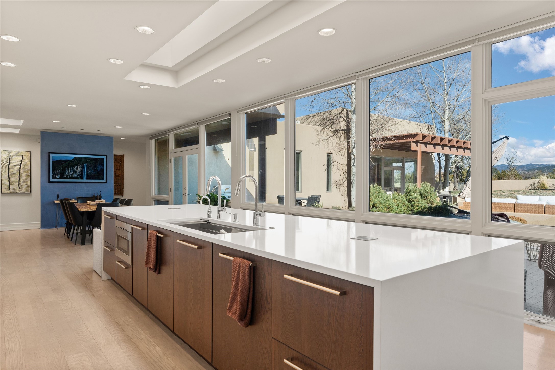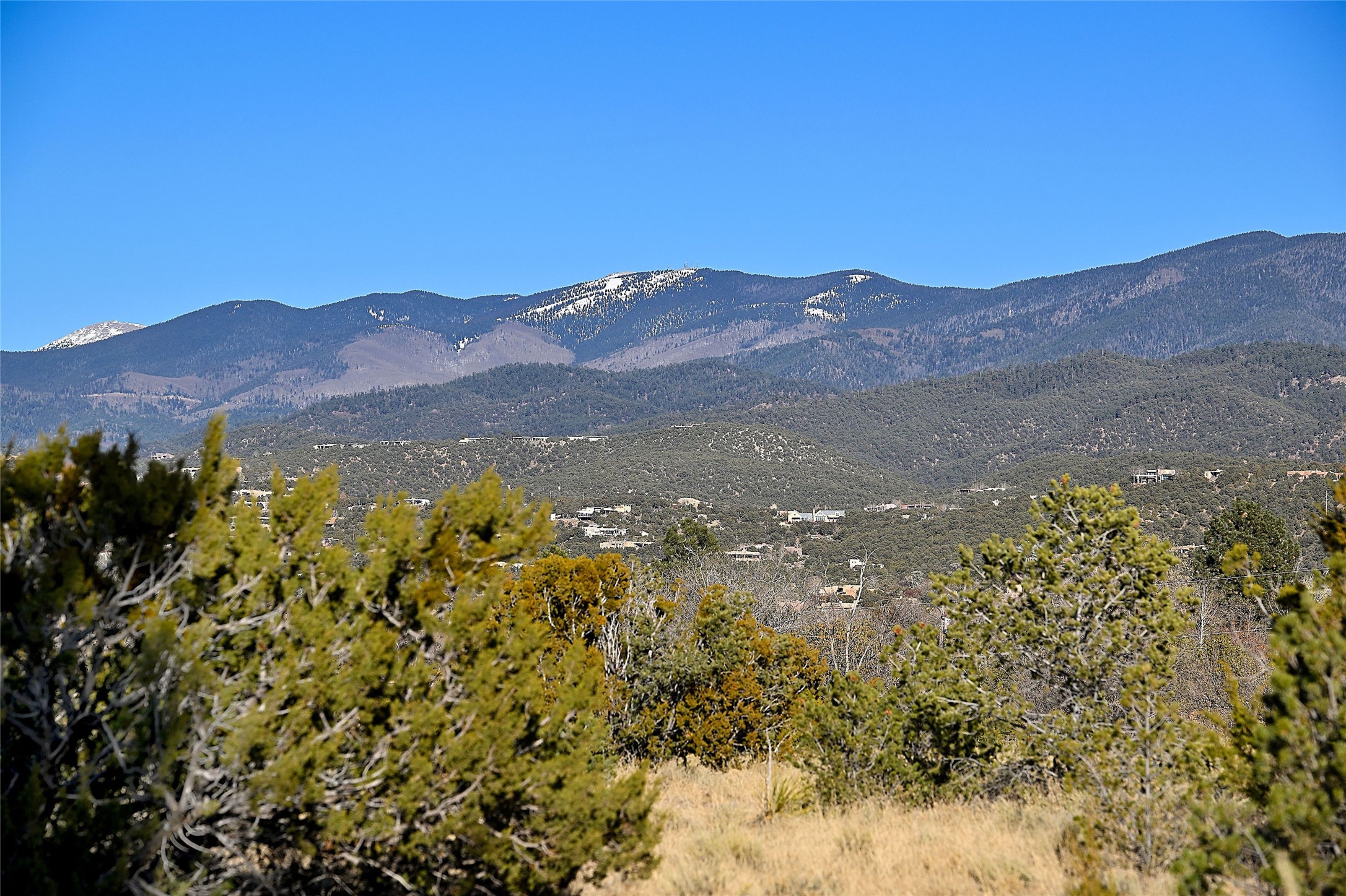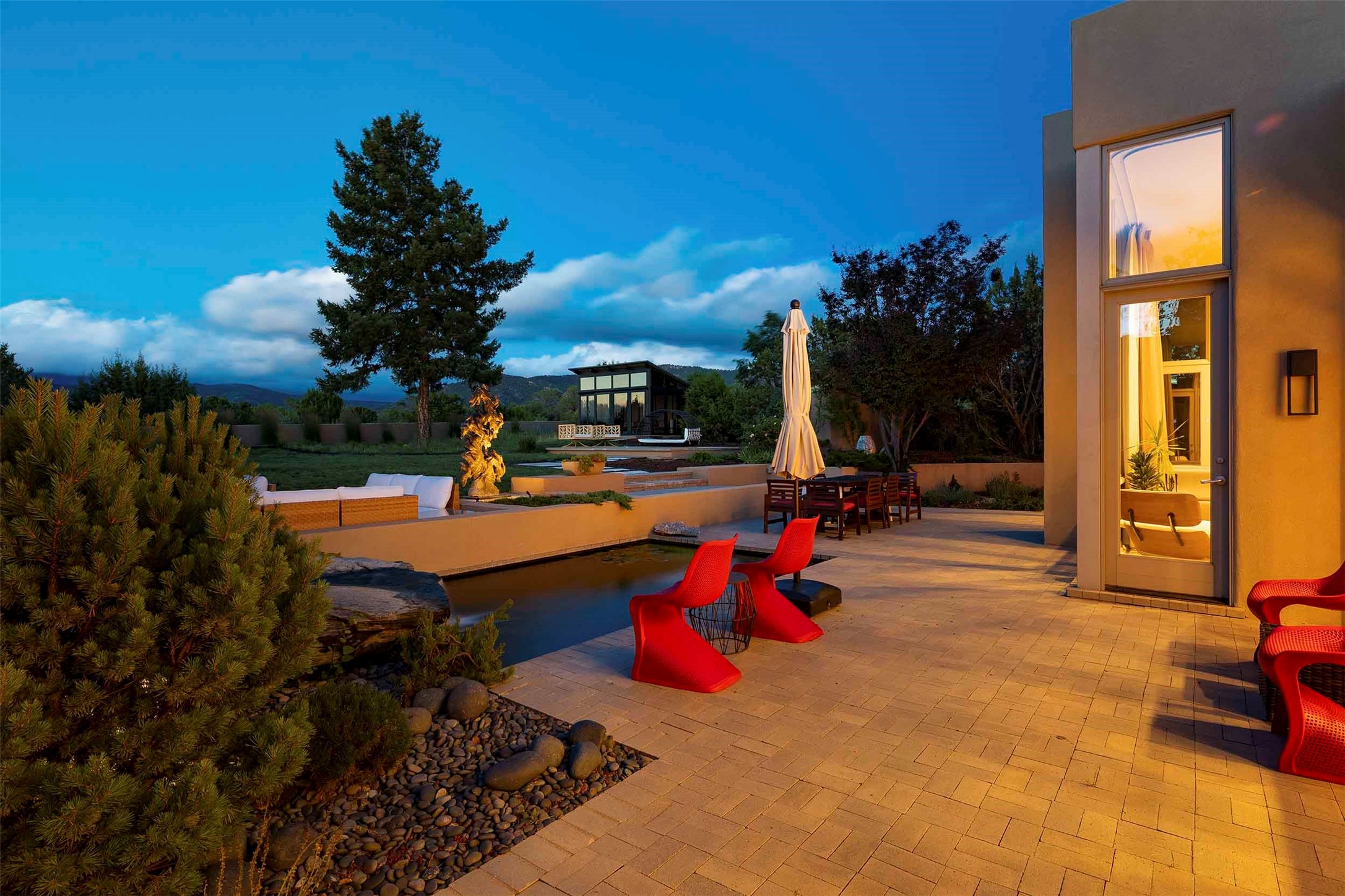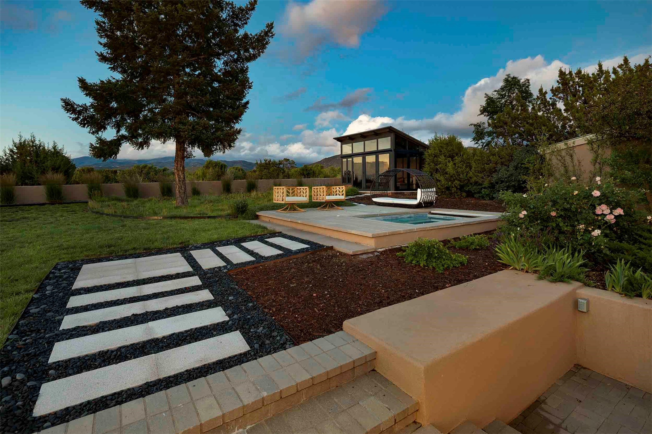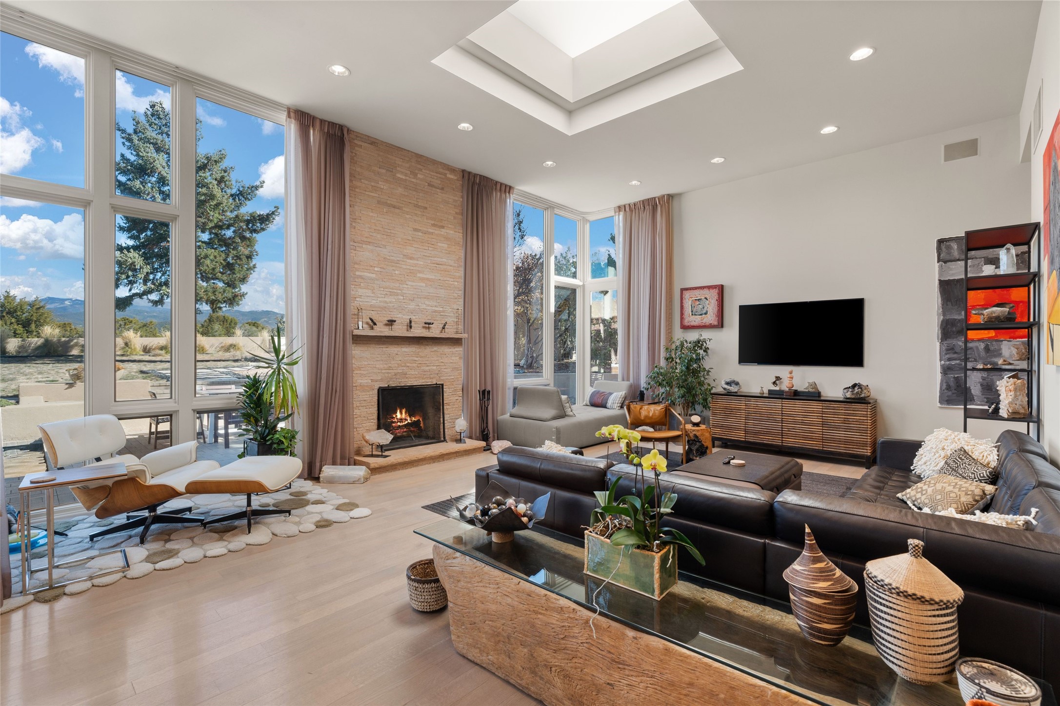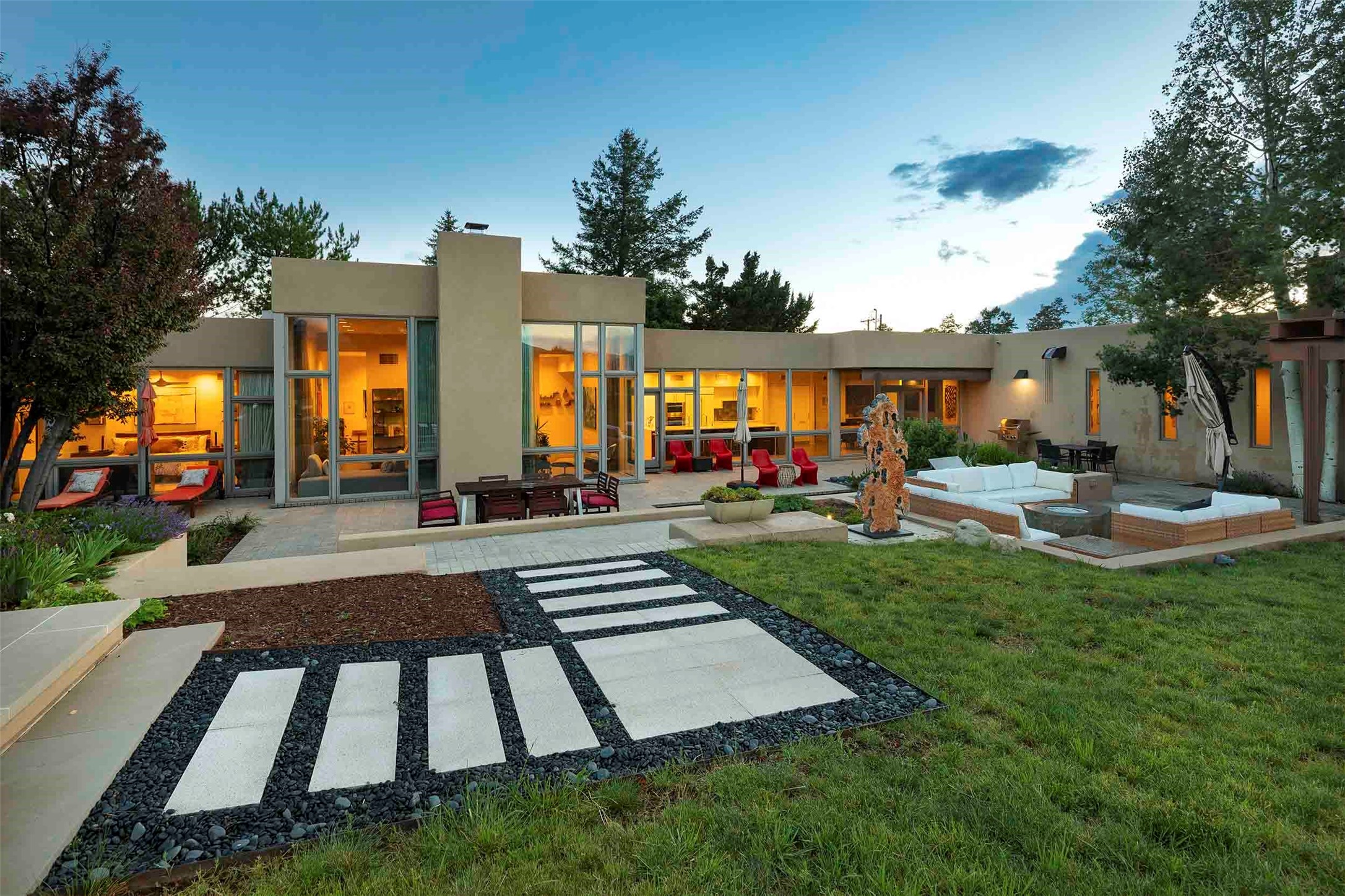 Remarkable. To be on Old Santa Fe Trail with majestic, panoramic views overlooking dedicated open space towards the Sangre de Cristo Mountains in a one-level, light filled Contemporary Masterpiece that had a major renovations done in 2021 is a singular opportunity. The home features a gleaming new kitchen, spectacular new baths in the main suites, expansive open spaces and your own private resort in the backyard. The current owners lovingly and intelligently renovated and elevated this bright, open space that lets the outside in - from the views to the private backyard featuring koi pond, plunge pool, fire pit and gazebo. - this home surprises on every level. The kitchen/living room arrangement now flows to match today's lifestyle and provides a wonderful backdrop for art lovers as well as a grand entertaining space. The large, totally renovated kitchen has a 16' island with Wolf/Sub Zero appliances, including an induction cooktop and steam oven. The new butler pantry provides additional storage, a freezer, second oven, and second microwave. A chef's kitchen perfect for entertaining. The library off the primary bedroom, along with an attached bedroom or workout space and additional bath - make for a private suite area that is comfortable for day-to-day living.The extraordinary north area with 2nd primary suite, is rare to say the least. The area, with one of Santa Fe's great media rooms, has soaring ceiling height, great walls for the largest flat screens, and walls of glass that frame the magnificent views of the rear of the property and the Sangres. The next space in the north section of the house functions as a ceramics studio for the current owners, but could be a command-central home office sharing the attributes of the media room as well or an extended master closet. The great primary suite with views and volume, is cloistered away from the rest of the home for privacy and quiet and is serviced by a brand new bathroom. The attached guest quarters is ideal for many living situations, maintaining privacy and comfort. One cannot overestimate the convenience of being close-in Old Santa Fe Trail and the ability to enjoy downtown Santa Fe on a moment's notice. All in all, this is one of the most extraordinary offerings in the entire Santa Fe marketplace with views of the Sangre's that can never be obstructed.