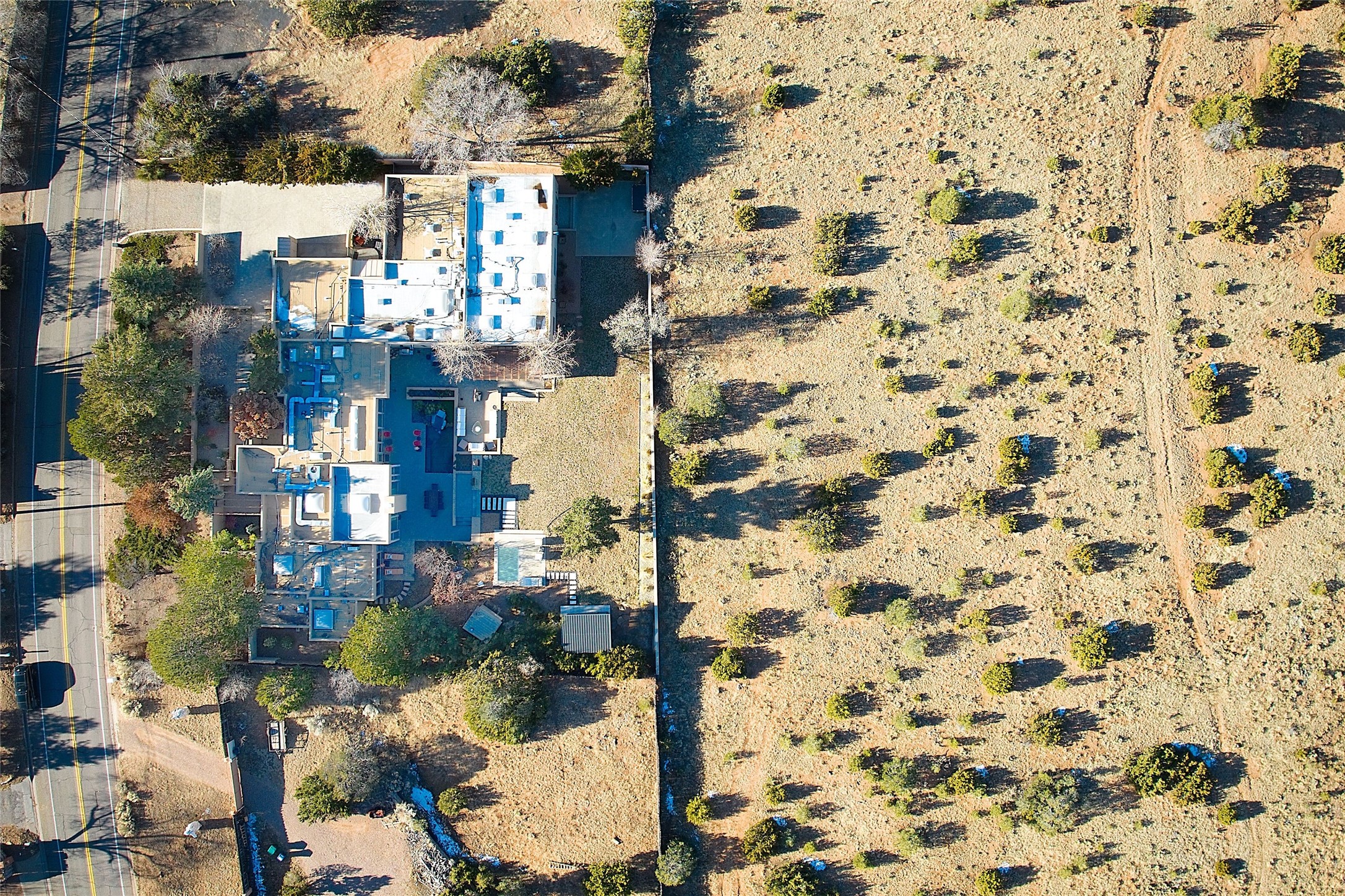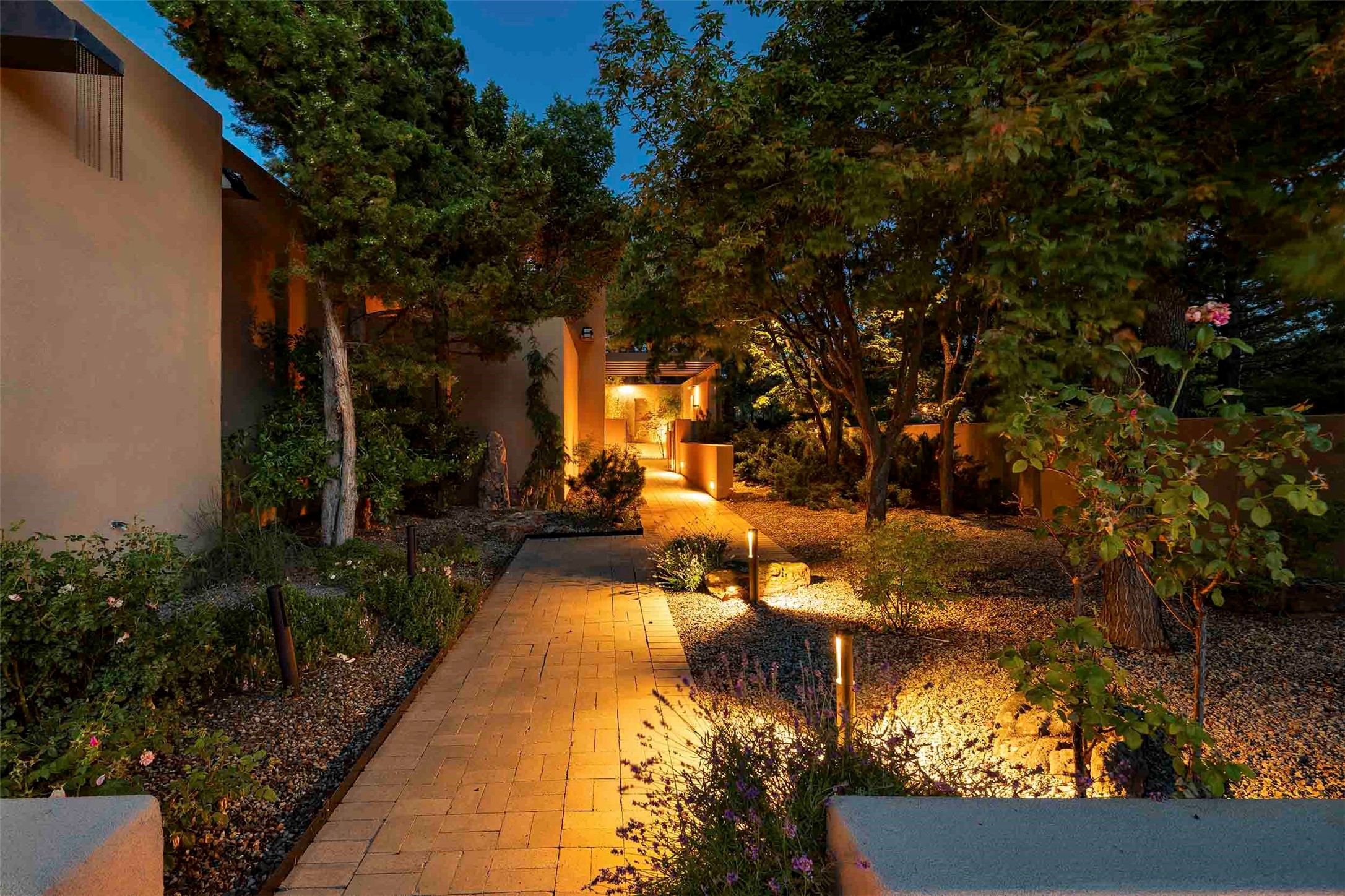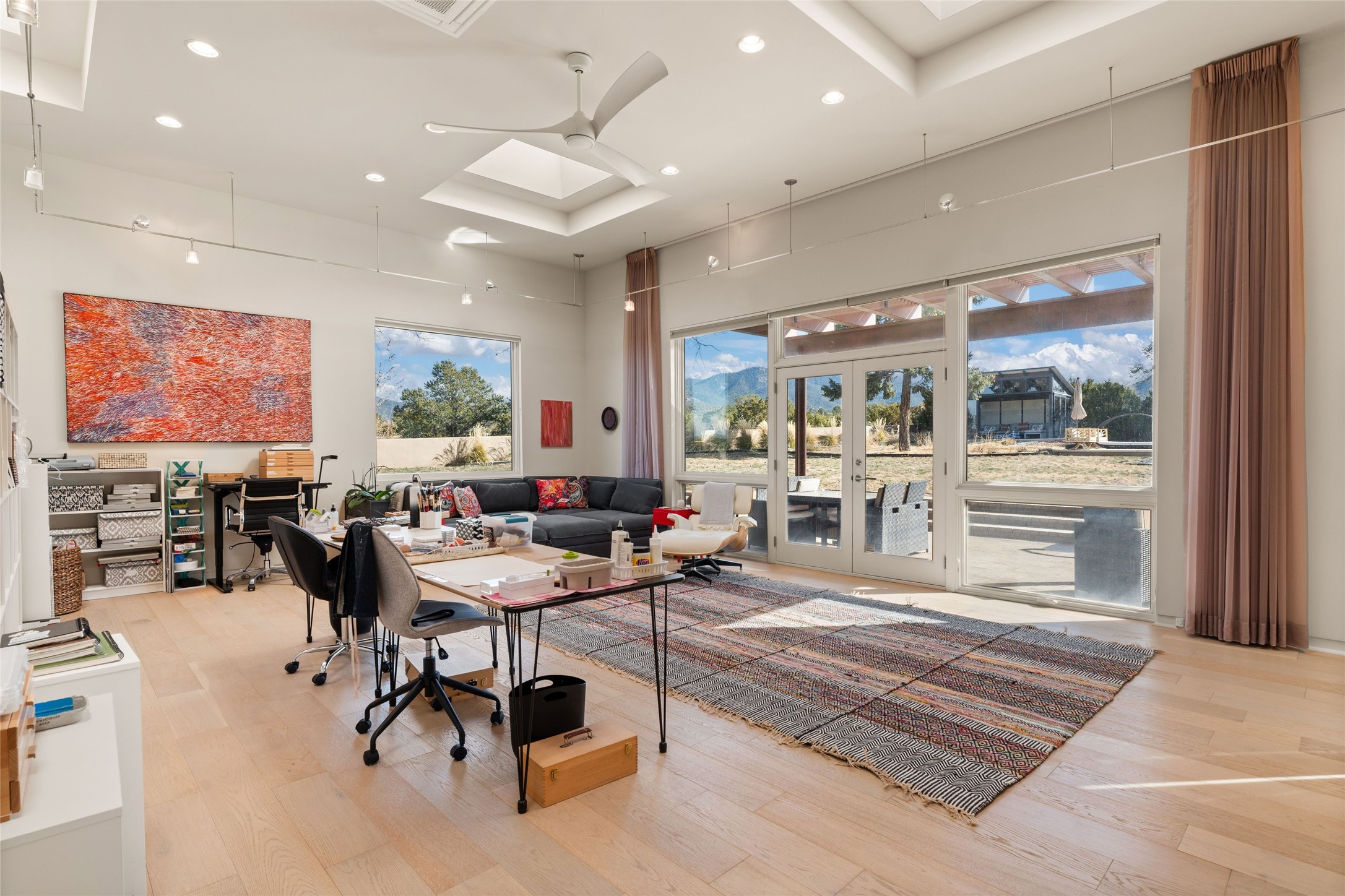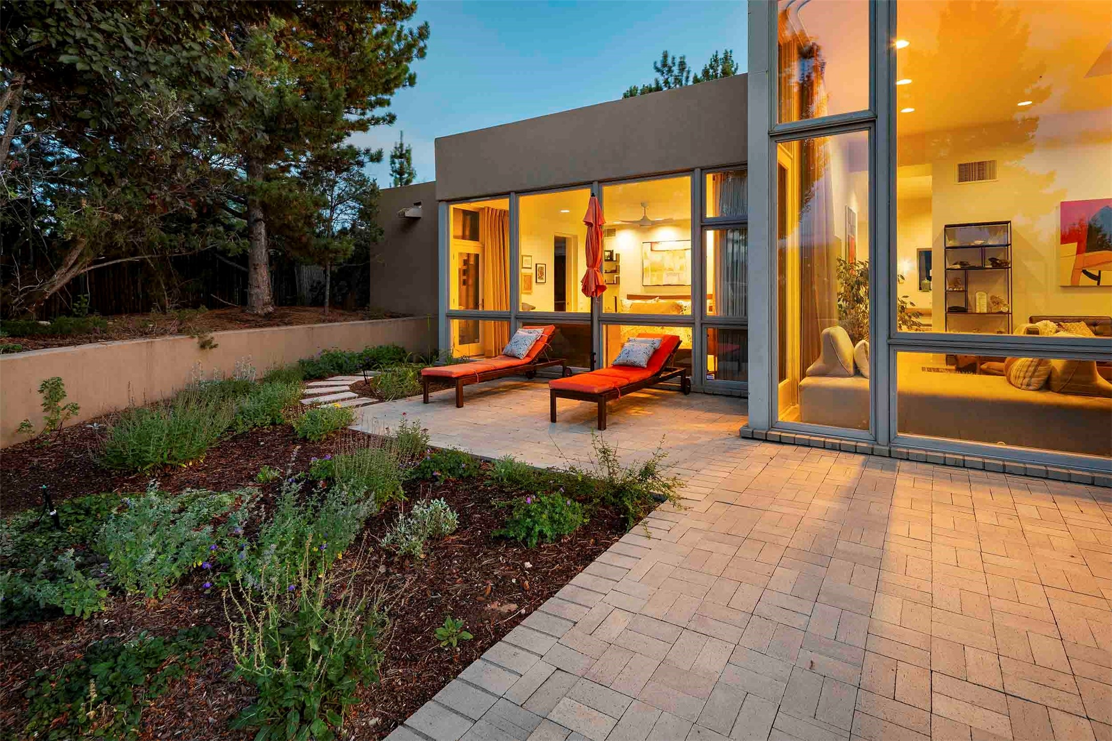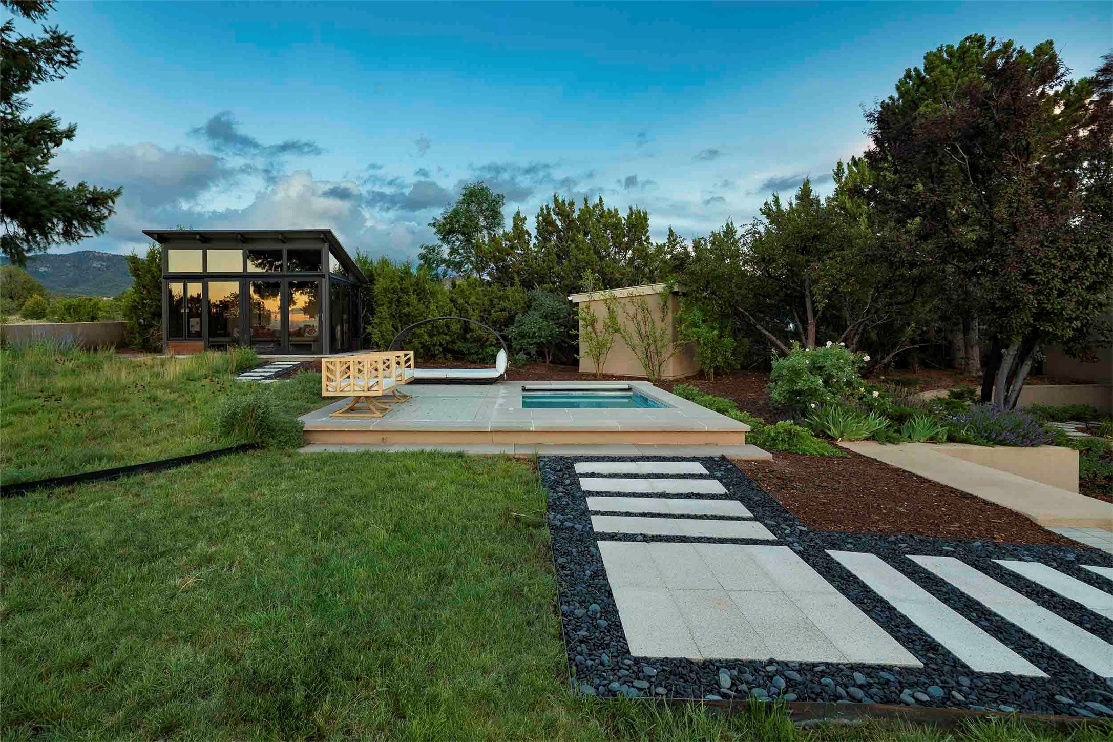 Remarkable. To be on Old Santa Fe Trail with majestic, panoramic views overlooking dedicated open space towards the Sangre de Cristo Mountains in a one-level, light filled Contemporary Masterpiece that had a major renovations done in 2021 is a singular opportunity. The home features a gleaming new kitchen, spectacular new baths in the main suites, expansive open spaces and your own private resort in the backyard. The current owners lovingly and intelligently renovated and elevated this bright, open space that lets the outside in - from the views to the private backyard featuring koi pond, plunge pool, fire pit and gazebo. - this home surprises on every level. The kitchen/living room arrangement now flows to match today's lifestyle and provides a wonderful backdrop for art lovers as well as a grand entertaining space. The large, totally renovated kitchen has a 16' island with Wolf/Sub Zero appliances, including an induction cooktop and steam oven. The new butler pantry provides additional storage, a freezer, second oven, and second microwave. A chef's kitchen perfect for entertaining. The library off the primary bedroom, along with an attached bedroom or workout space and additional bath - make for a private suite area that is comfortable for day-to-day living.The extraordinary north area with 2nd primary suite, is rare to say the least. The area, with one of Santa Fe's great media rooms, has soaring ceiling height, great walls for the largest flat screens, and walls of glass that frame the magnificent views of the rear of the property and the Sangres. The next space in the north section of the house functions as a ceramics studio for the current owners, but could be a command-central home office sharing the attributes of the media room as well or an extended master closet. The great primary suite with views and volume, is cloistered away from the rest of the home for privacy and quiet and is serviced by a brand new bathroom. The attached guest quarters is ideal for many living situations, maintaining privacy and comfort. One cannot overestimate the convenience of being close-in Old Santa Fe Trail and the ability to enjoy downtown Santa Fe on a moment's notice. All in all, this is one of the most extraordinary offerings in the entire Santa Fe marketplace with views of the Sangre's that can never be obstructed.