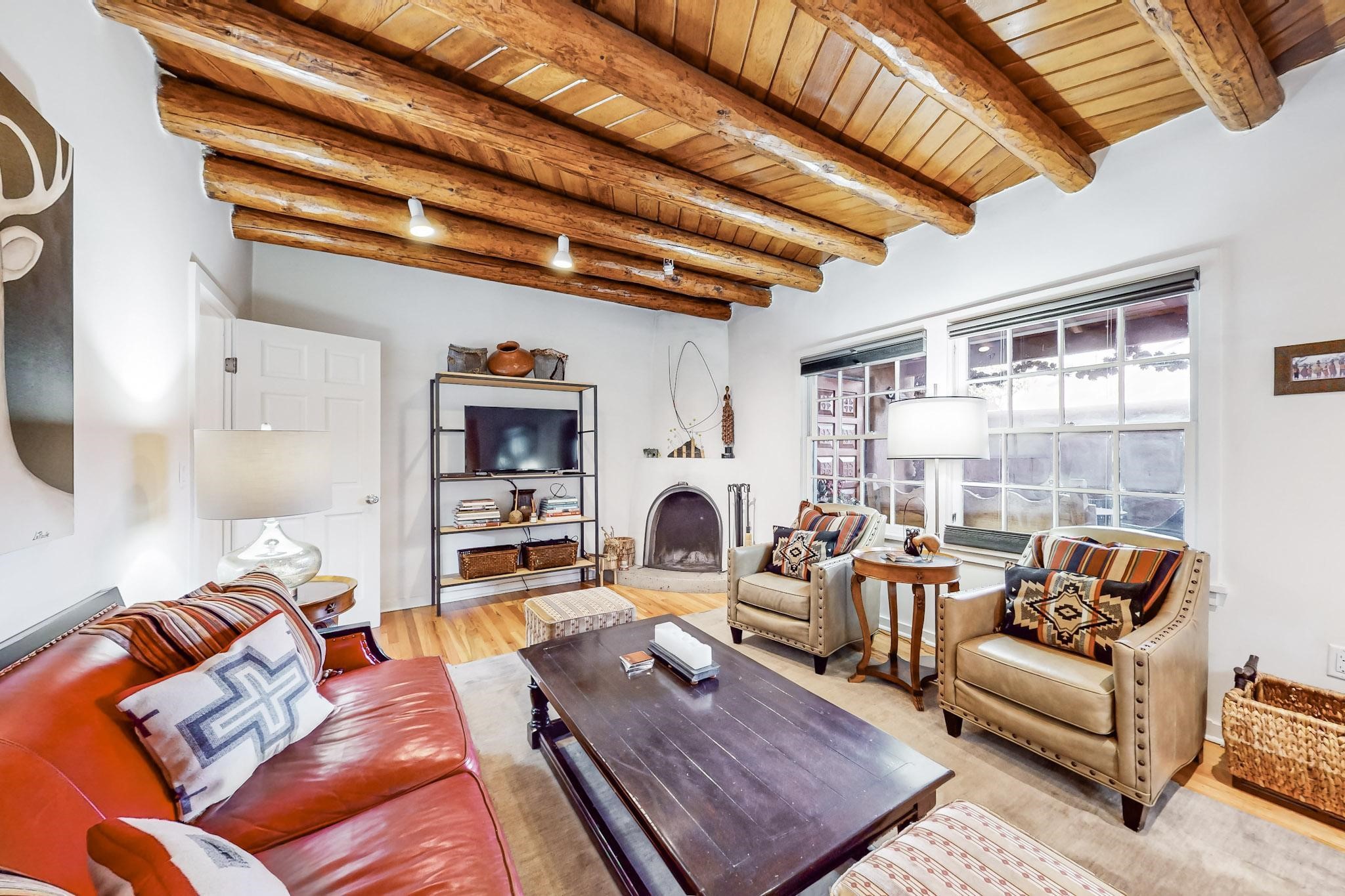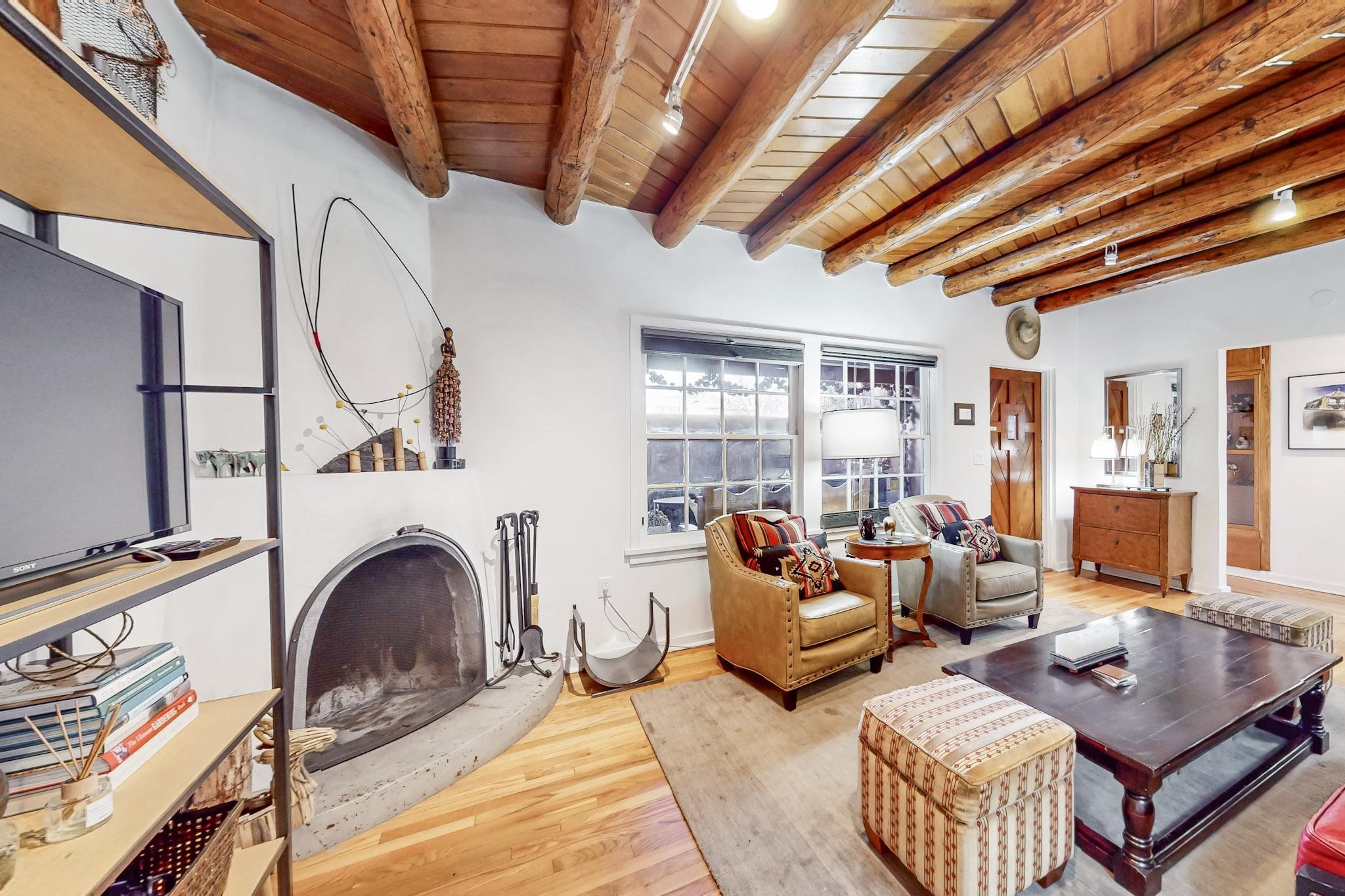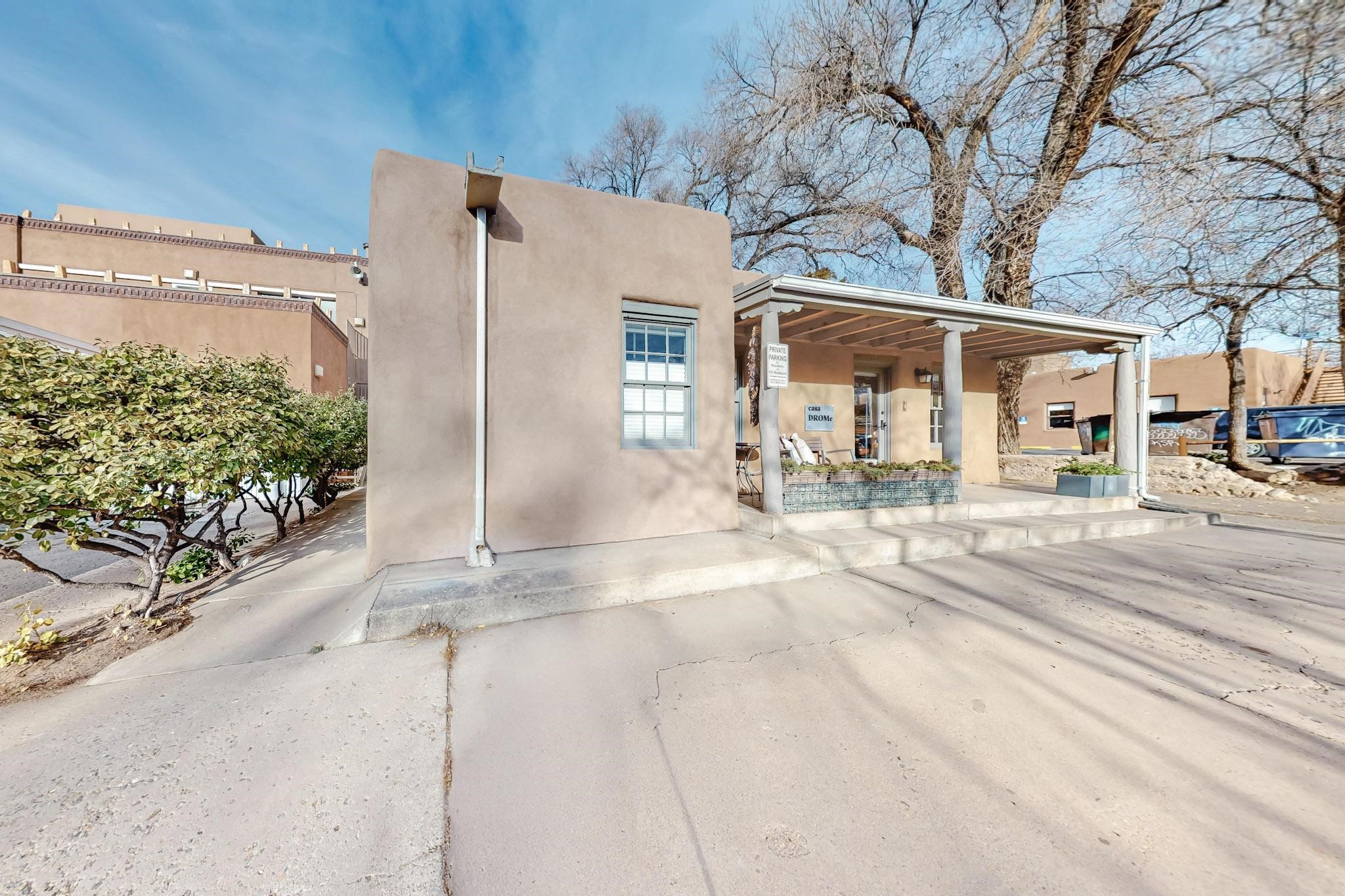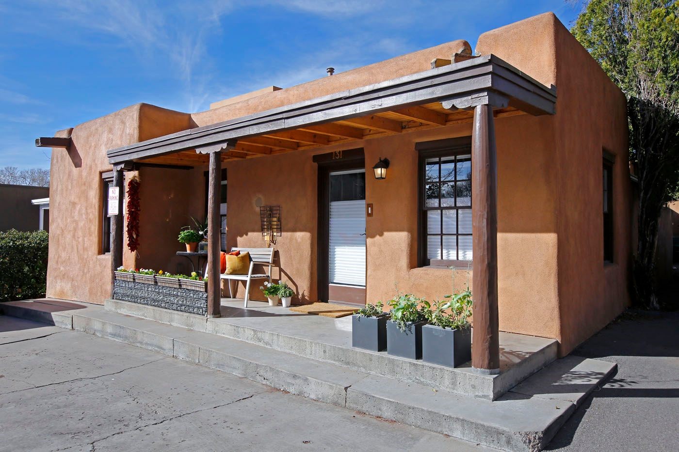 Charming, historic, single level, mostly free standing 3/2 home in the heart of downtown one block from the plaza. Classic Santa Fe style with hardwood floors, plaster walls, vigas. Extensively remodeled including kitchen, bathrooms, plumbing, electrical, sewer line, roof and stucco. Delightful living room with working, kiva fireplace. The front entry was a bedroom in the past so is a potential 4th bedroom by simply reopening alternative existing side entrance(s)? The BCD zoning allows for both residential or commercial use including short term rentals with few restictions (see attached document). Currently the property is being used as a very successful STR grossing $100K per year with potential for more. If not an STR, would also be a delightful full or part time home. Previously was an office. Other possible commercial uses could be gallery, retail, live/work etc. Walled portal/side yard. Scrupulously maintained. Furniture package available. Approved off street parking on the sidewalk. What a gem and so close to the plaza!