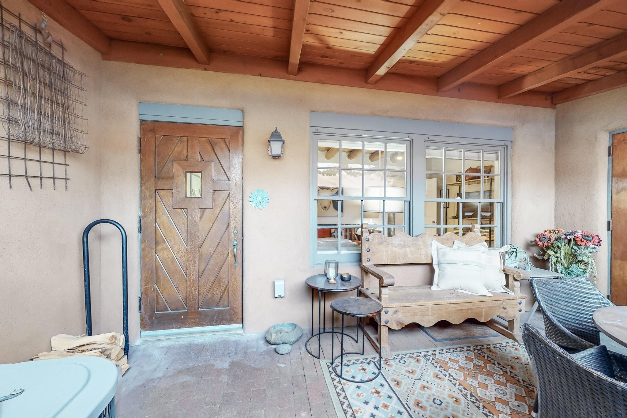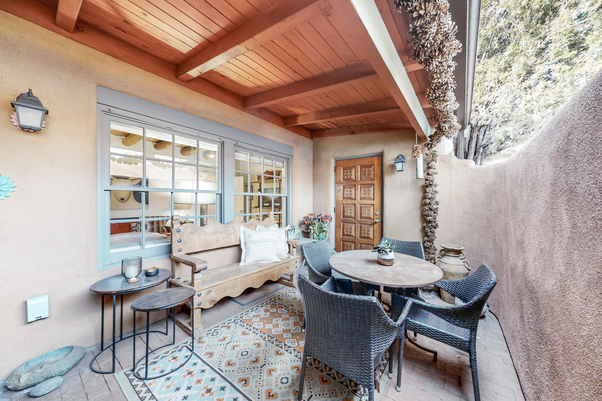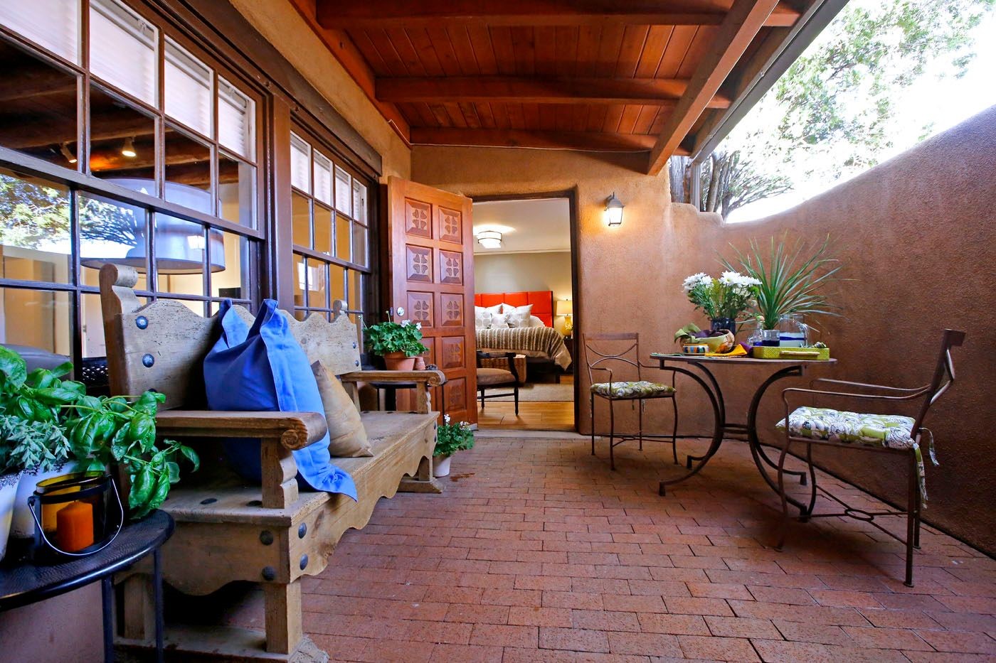 Charming, historic, single level, mostly free standing 3/2 home in the heart of downtown one block from the plaza. Classic Santa Fe style with hardwood floors, plaster walls, vigas. Extensively remodeled including kitchen, bathrooms, plumbing, electrical, sewer line, roof and stucco. Delightful living room with working, kiva fireplace. The front entry was a bedroom in the past so is a potential 4th bedroom by simply reopening alternative existing side entrance(s)? The BCD zoning allows for both residential or commercial use including short term rentals with few restictions (see attached document). Currently the property is being used as a very successful STR grossing $100K per year with potential for more. If not an STR, would also be a delightful full or part time home. Previously was an office. Other possible commercial uses could be gallery, retail, live/work etc. Walled portal/side yard. Scrupulously maintained. Furniture package available. Approved off street parking on the sidewalk. What a gem and so close to the plaza!