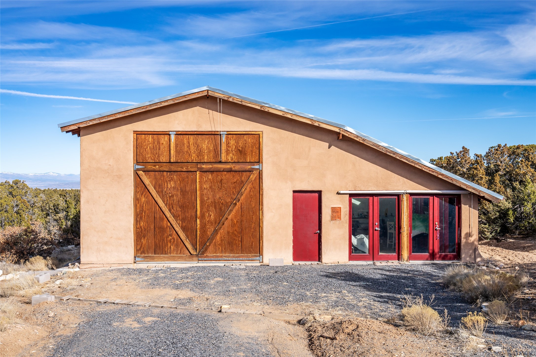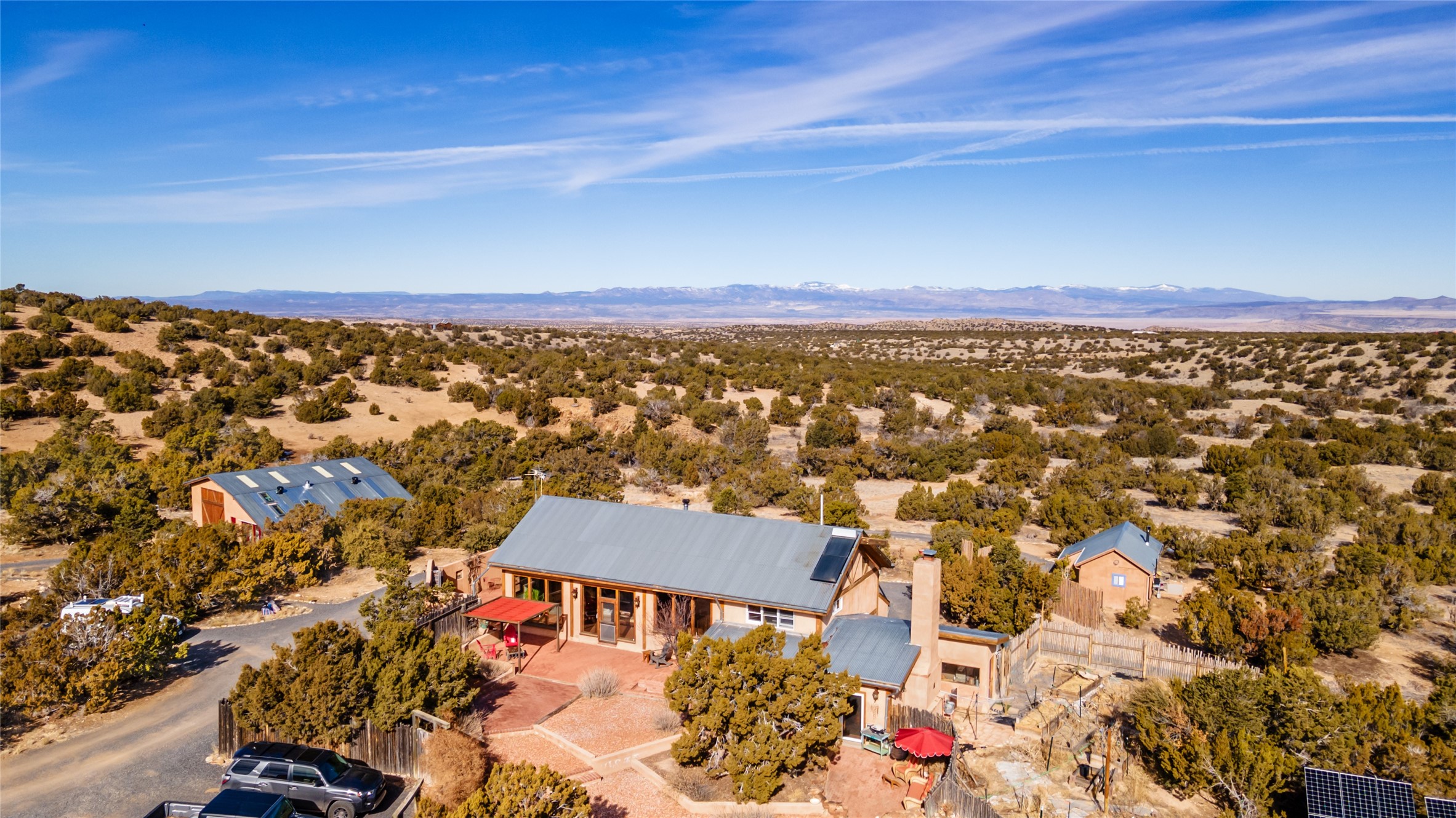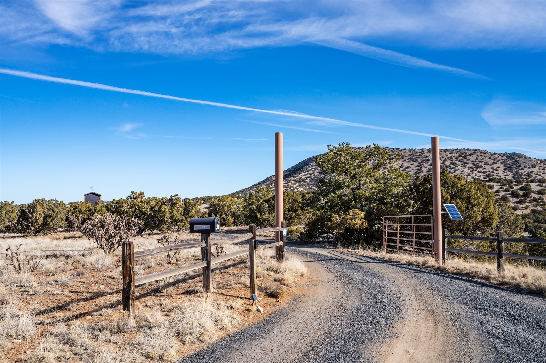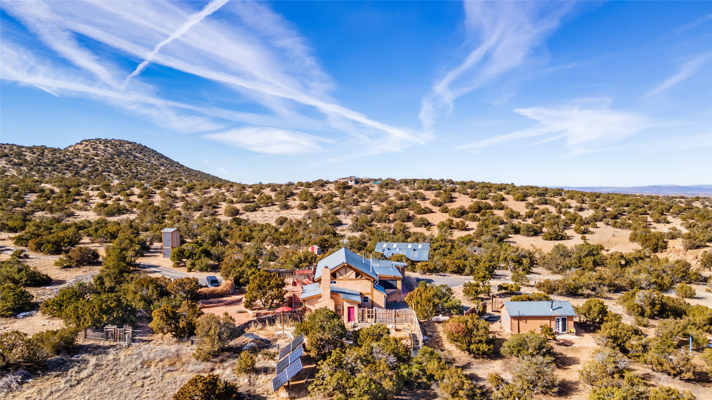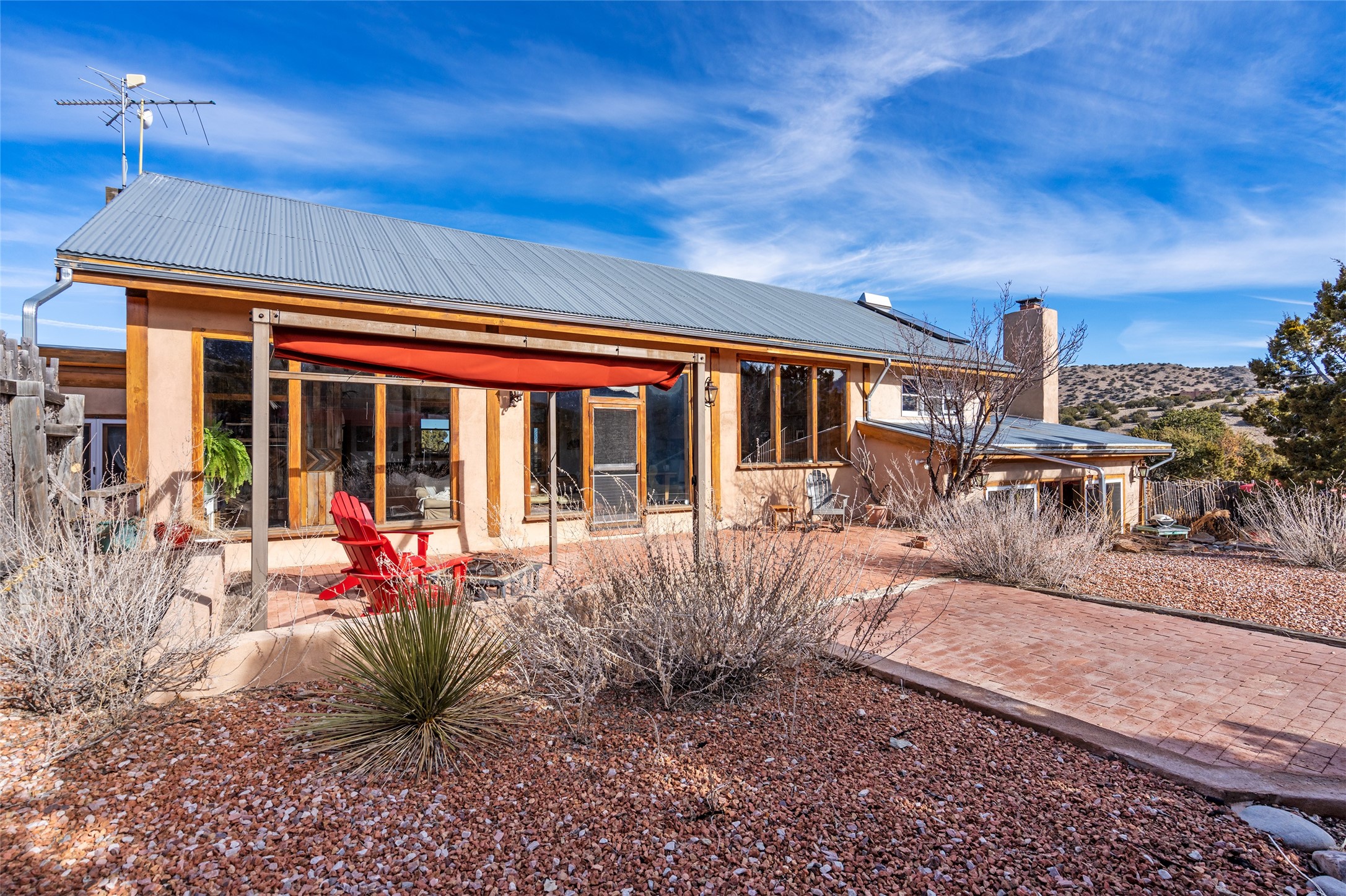 Indulge in a lifestyle where every sunset is a celebration. This real estate gem provides comfortable and luxurious eco off-grid living on 30 acres. The main house with its vaulted ceiling and exposed wood beams in the living/dining area is both light-filled and airy; the large view-filled windows overlooking the fenced courtyard garden also affording passive solar heating. Within this split level house, the gourmet kitchen features a commercial Wolf stove, double ovens, and griddle, granite countertops and hickory cabinets. Situated on the property is a charming fully appointed casita, providing a private retreat for guests. For those with a passion for recreational vehicles, this property goes above and beyond with its dedicated RV garage, and your very own service pit. The RV garage also includes a spacious studio, offering a multifunctional space that can be customized to suit your craft. Whether you envision it as an art studio, or a personal gym, the possibilities are endless. Other features include a fenced organic garden with raised beds, private well, new solar system, and heavy duty generator- making off-grid living easy. Horses are allowed and a fenced corral and water are in place. Situated half-way between Santa Fe and Albuquerque, don't miss the chance to make this picturesque haven your new home!