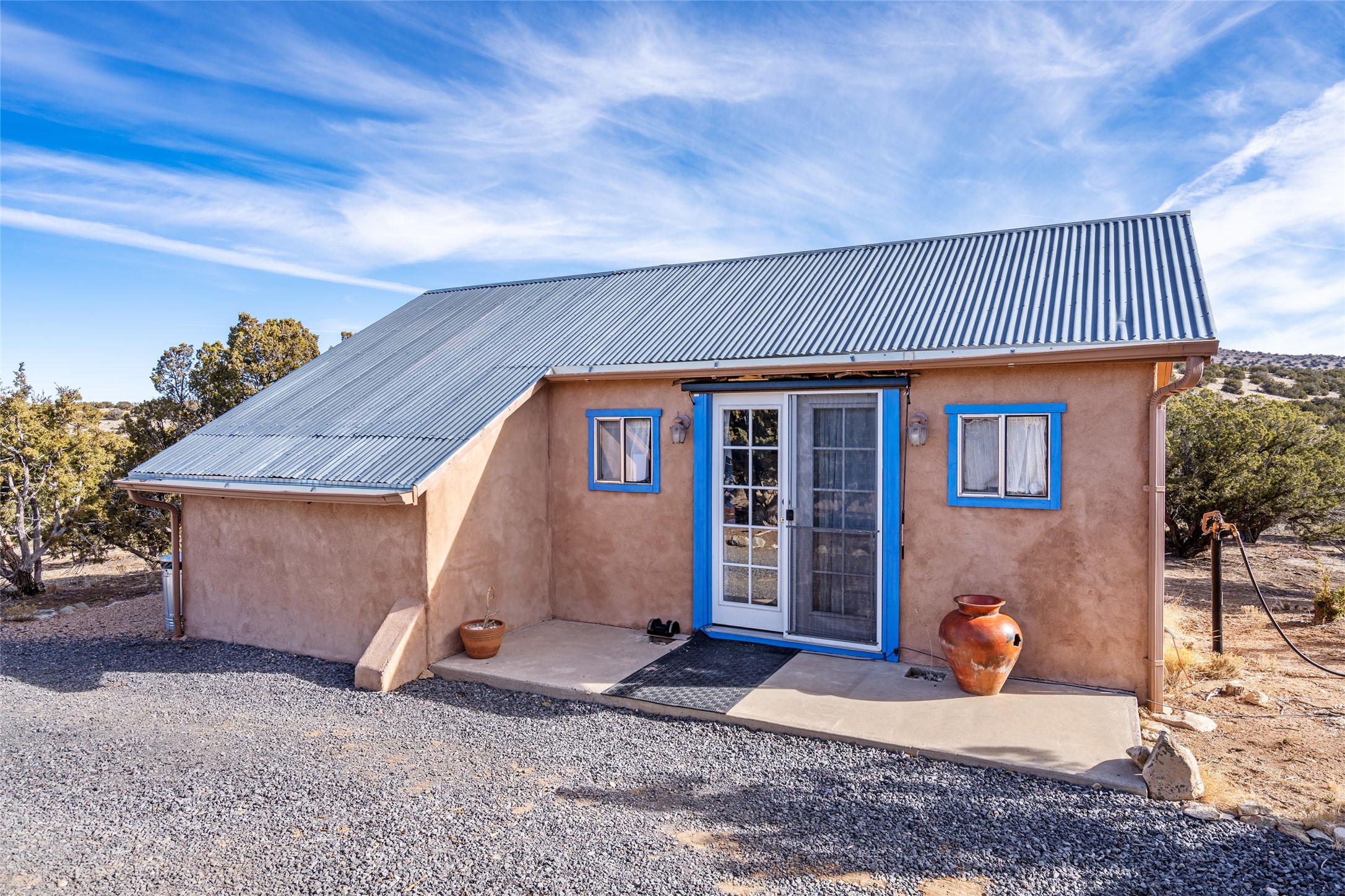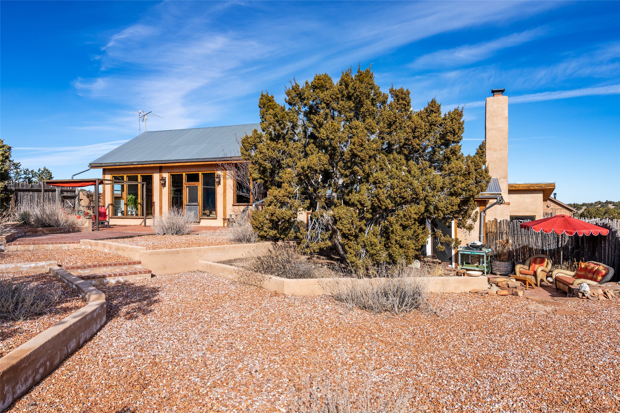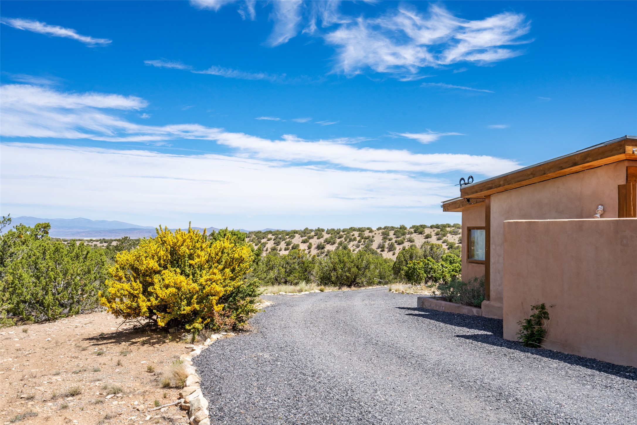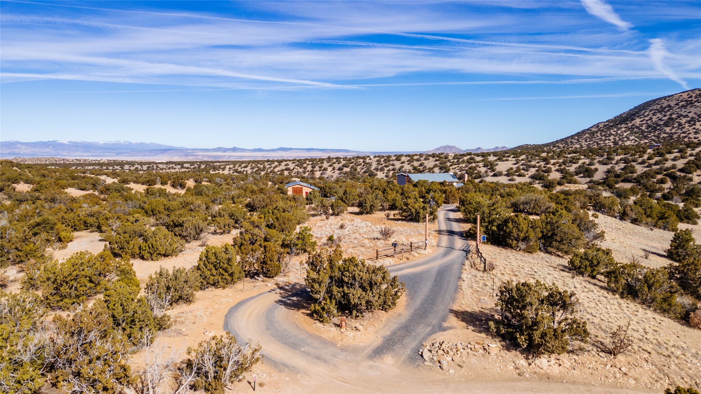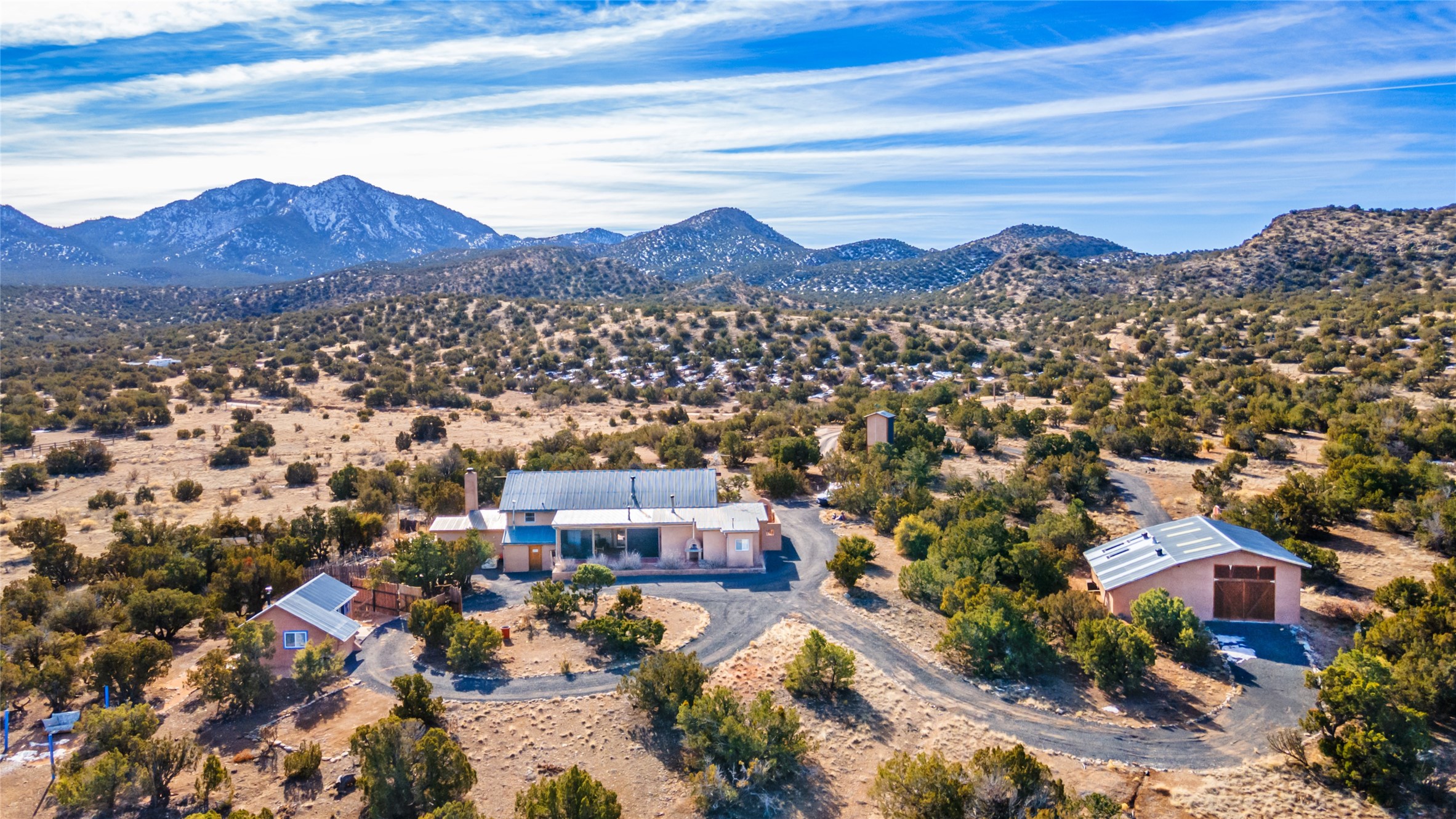 Indulge in a lifestyle where every sunset is a celebration. This real estate gem provides comfortable and luxurious eco off-grid living on 30 acres. The main house with its vaulted ceiling and exposed wood beams in the living/dining area is both light-filled and airy; the large view-filled windows overlooking the fenced courtyard garden also affording passive solar heating. Within this split level house, the gourmet kitchen features a commercial Wolf stove, double ovens, and griddle, granite countertops and hickory cabinets. Situated on the property is a charming fully appointed casita, providing a private retreat for guests. For those with a passion for recreational vehicles, this property goes above and beyond with its dedicated RV garage, and your very own service pit. The RV garage also includes a spacious studio, offering a multifunctional space that can be customized to suit your craft. Whether you envision it as an art studio, or a personal gym, the possibilities are endless. Other features include a fenced organic garden with raised beds, private well, new solar system, and heavy duty generator- making off-grid living easy. Horses are allowed and a fenced corral and water are in place. Situated half-way between Santa Fe and Albuquerque, don't miss the chance to make this picturesque haven your new home!