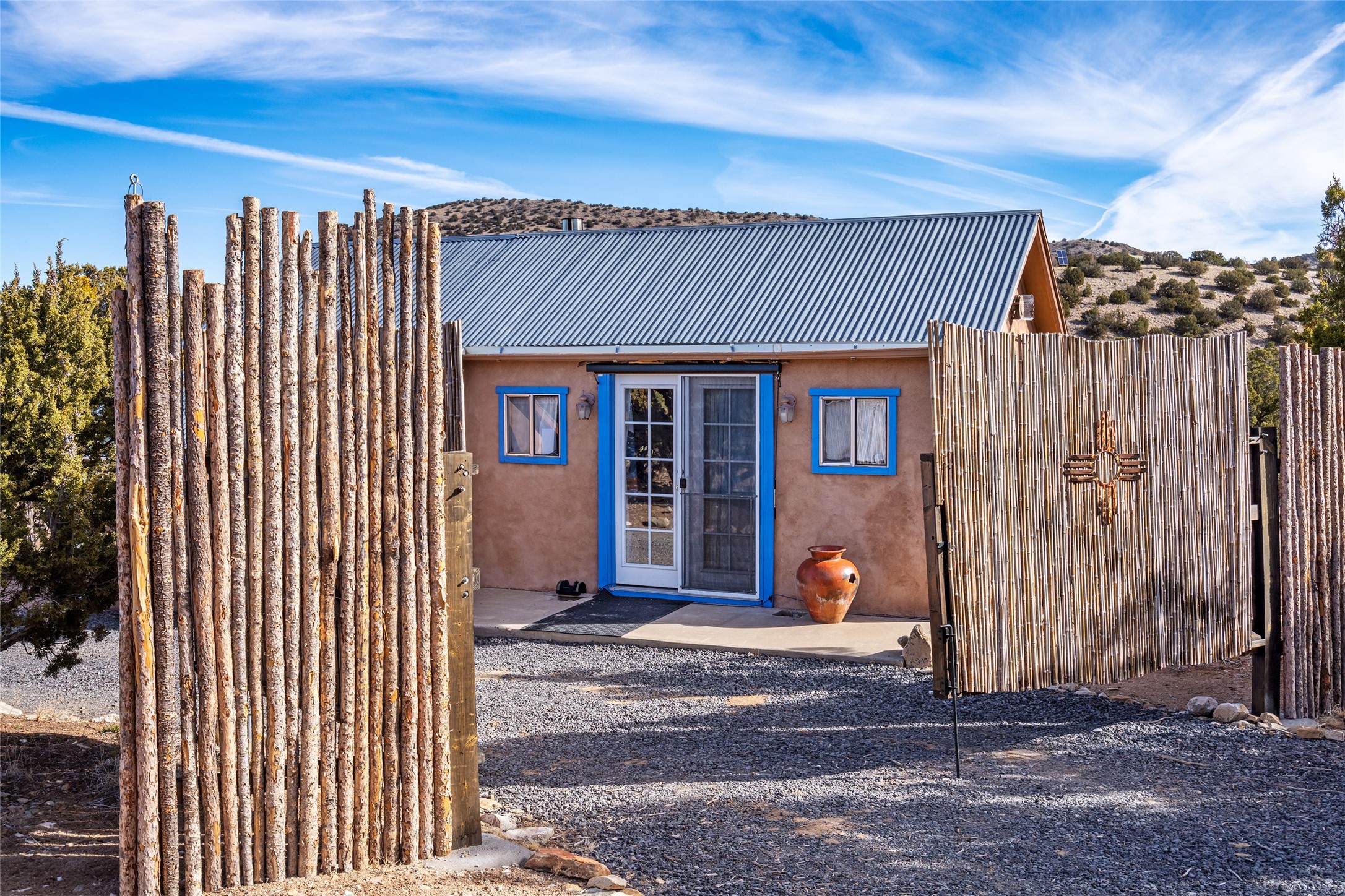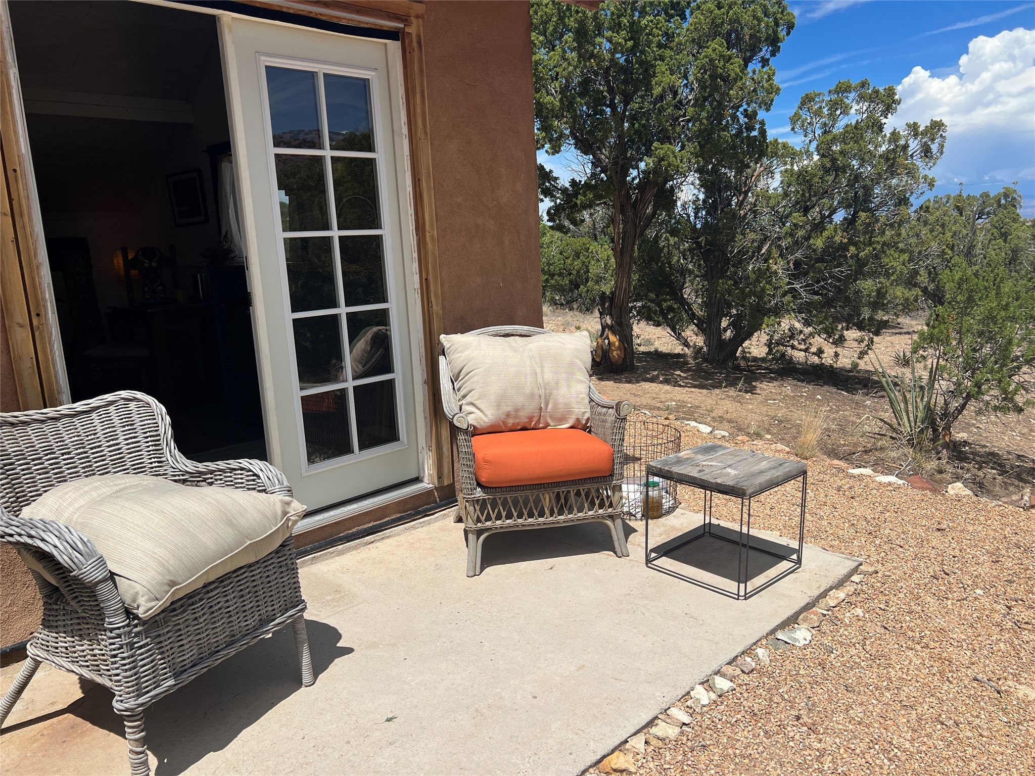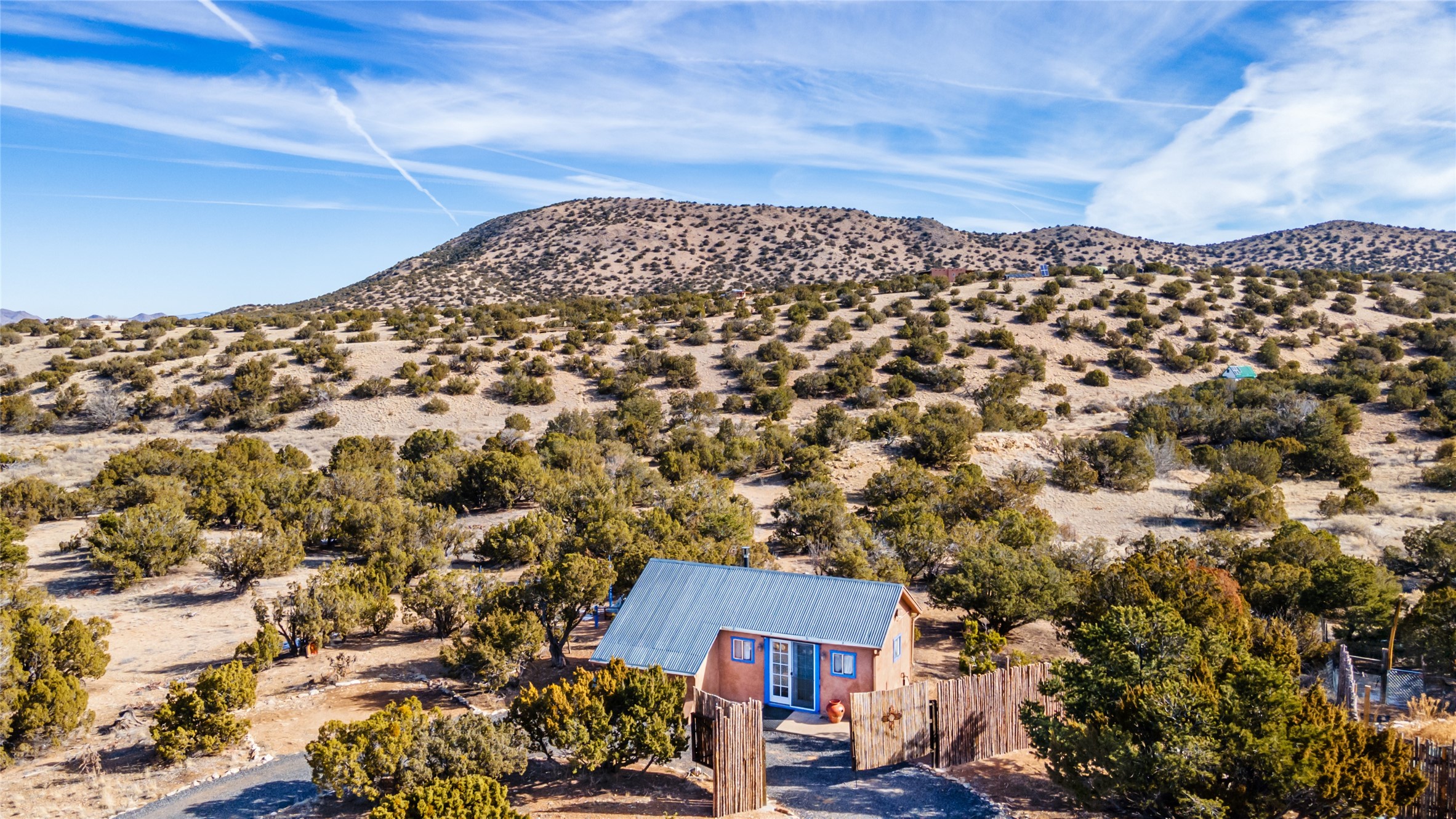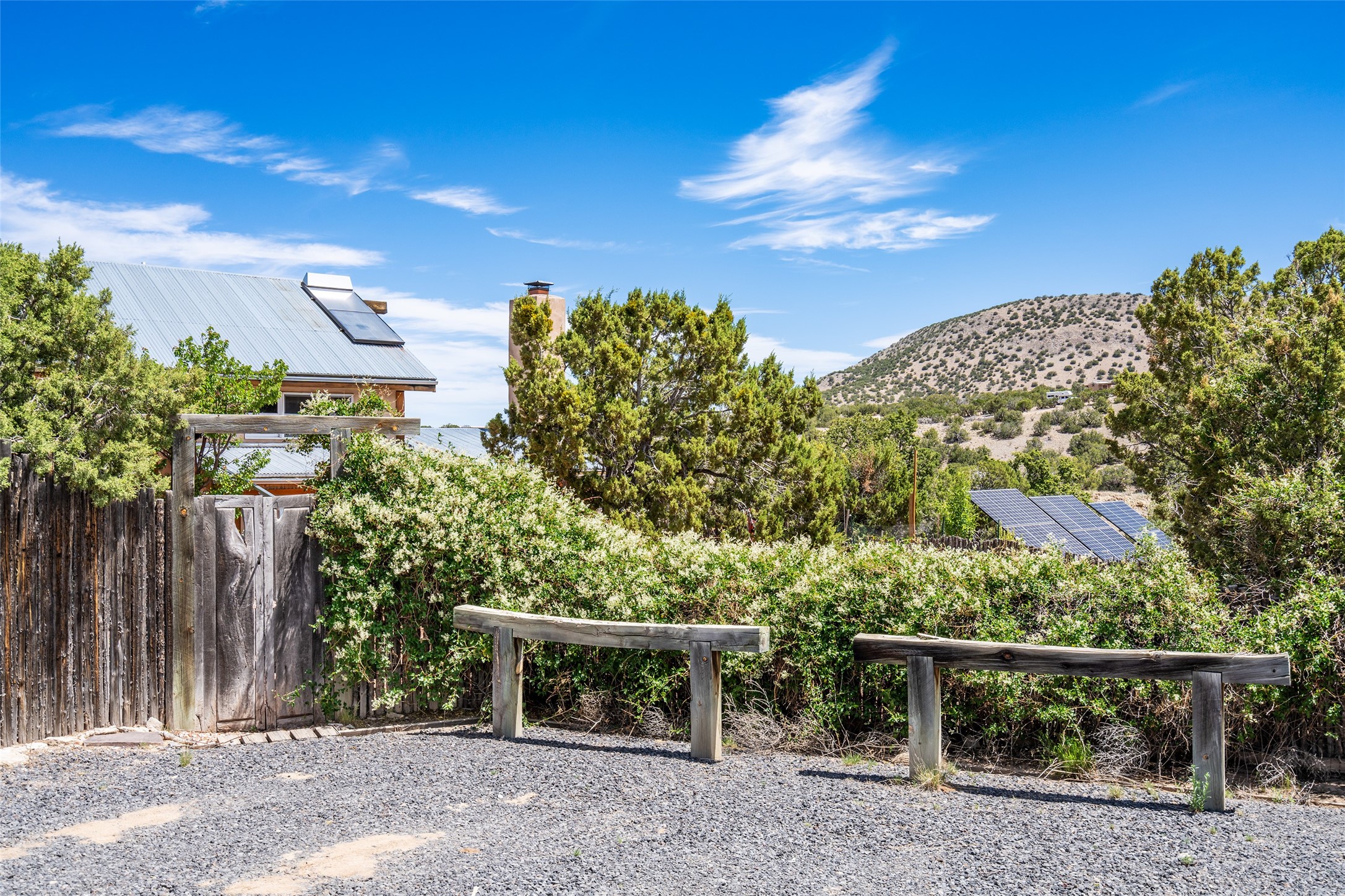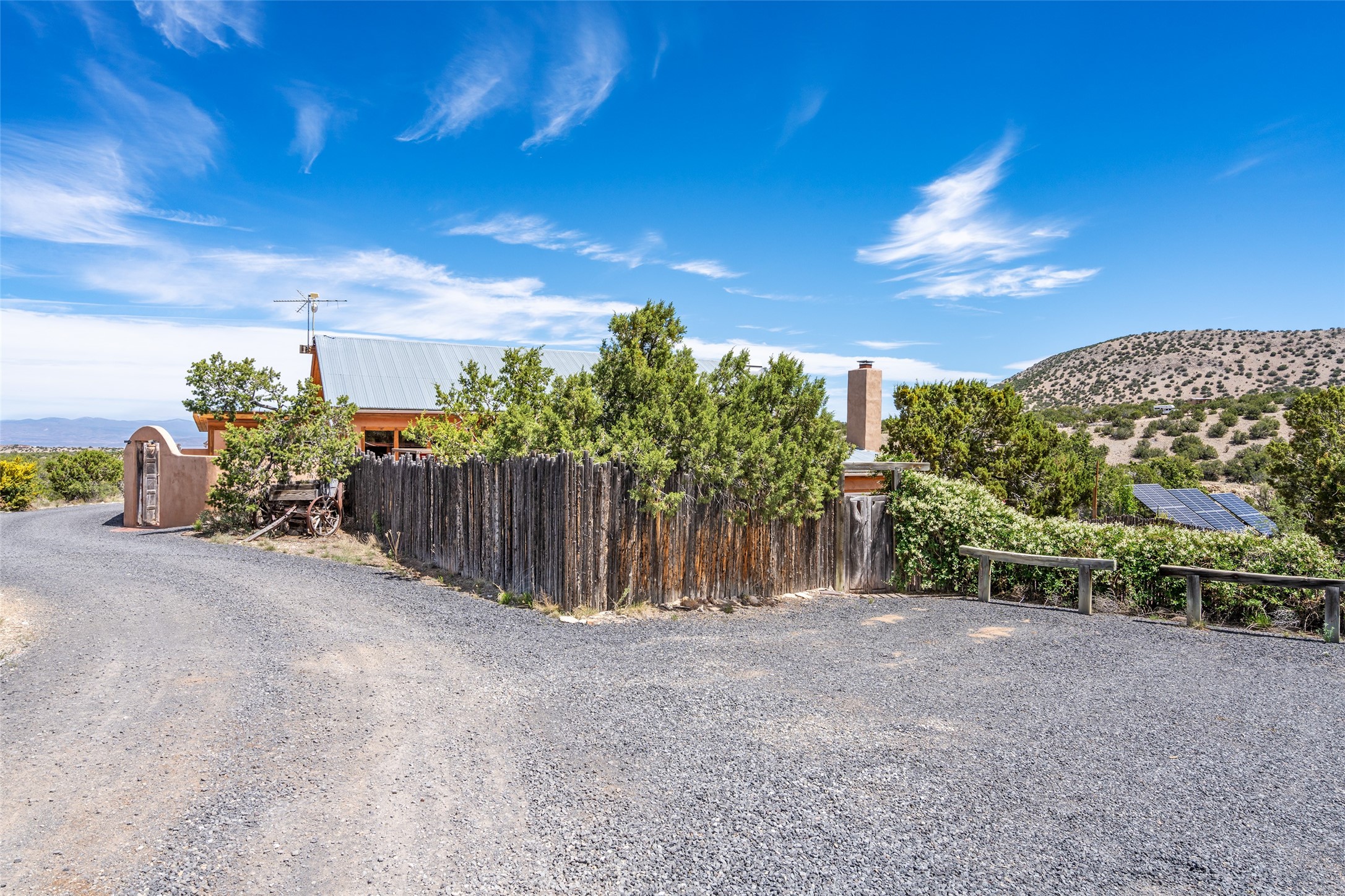Indulge in a lifestyle where every sunset is a celebration. This real estate gem provides comfortable and luxurious eco off-grid living on 30 acres. The main house with its vaulted ceiling and exposed wood beams in the living/dining area is both light-filled and airy; the large view-filled windows overlooking the fenced courtyard garden also affording passive solar heating. Within this split level house, the gourmet kitchen features a commercial Wolf stove, double ovens, and griddle, granite countertops and hickory cabinets. Situated on the property is a charming fully appointed casita, providing a private retreat for guests. For those with a passion for recreational vehicles, this property goes above and beyond with its dedicated RV garage, and your very own service pit. The RV garage also includes a spacious studio, offering a multifunctional space that can be customized to suit your craft. Whether you envision it as an art studio, or a personal gym, the possibilities are endless. Other features include a fenced organic garden with raised beds, private well, new solar system, and heavy duty generator- making off-grid living easy. Horses are allowed and a fenced corral and water are in place. Situated half-way between Santa Fe and Albuquerque, don't miss the chance to make this picturesque haven your new home!