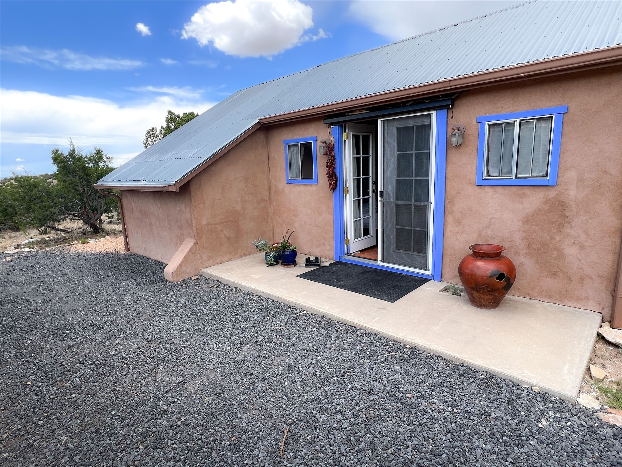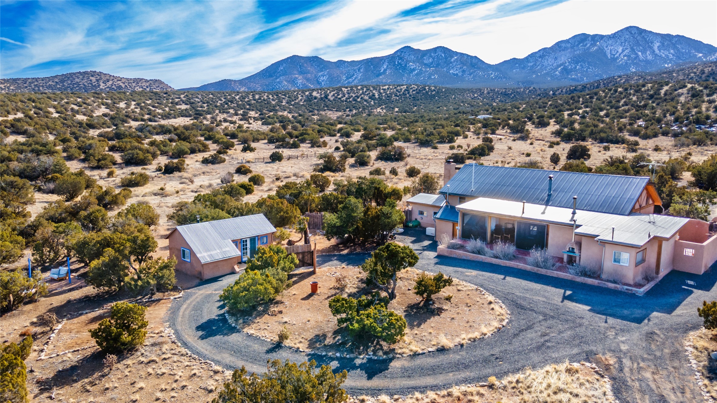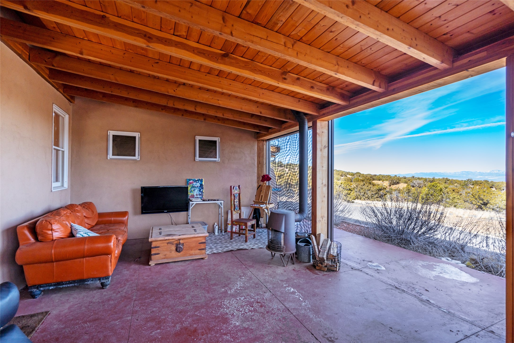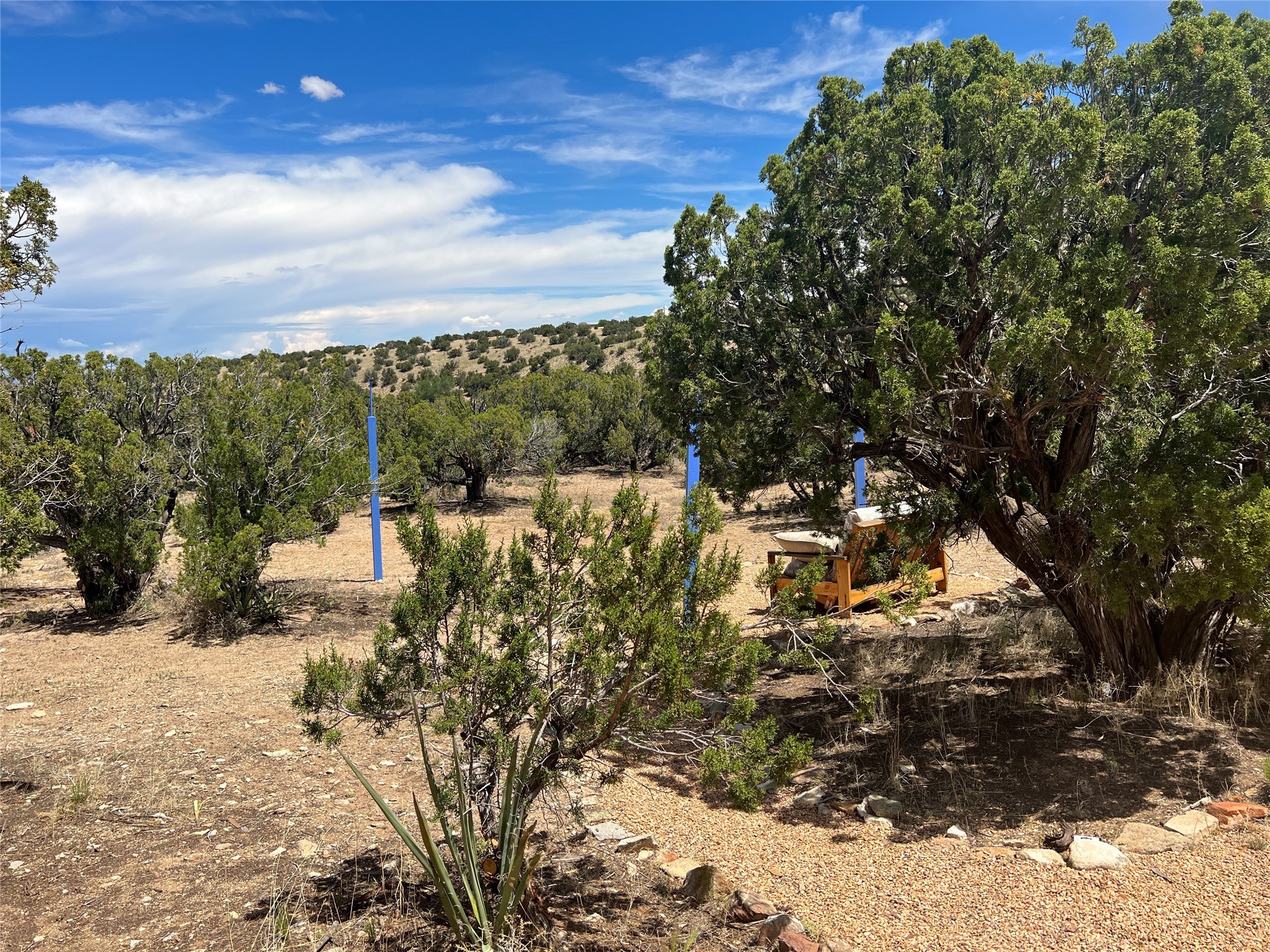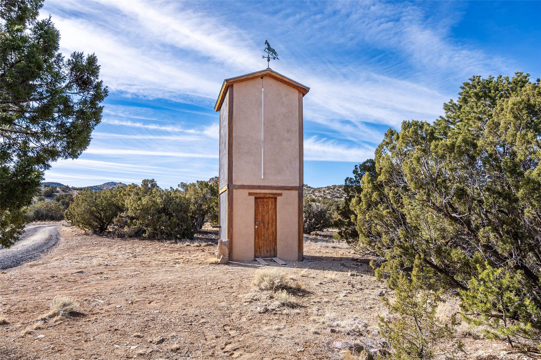 Indulge in a lifestyle where every sunset is a celebration. This real estate gem provides comfortable and luxurious eco off-grid living on 30 acres. The main house with its vaulted ceiling and exposed wood beams in the living/dining area is both light-filled and airy; the large view-filled windows overlooking the fenced courtyard garden also affording passive solar heating. Within this split level house, the gourmet kitchen features a commercial Wolf stove, double ovens, and griddle, granite countertops and hickory cabinets. Situated on the property is a charming fully appointed casita, providing a private retreat for guests. For those with a passion for recreational vehicles, this property goes above and beyond with its dedicated RV garage, and your very own service pit. The RV garage also includes a spacious studio, offering a multifunctional space that can be customized to suit your craft. Whether you envision it as an art studio, or a personal gym, the possibilities are endless. Other features include a fenced organic garden with raised beds, private well, new solar system, and heavy duty generator- making off-grid living easy. Horses are allowed and a fenced corral and water are in place. Situated half-way between Santa Fe and Albuquerque, don't miss the chance to make this picturesque haven your new home!