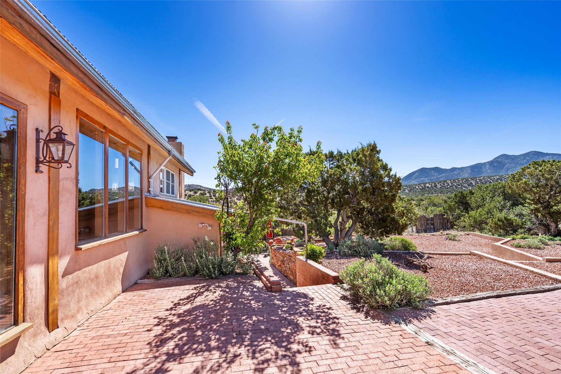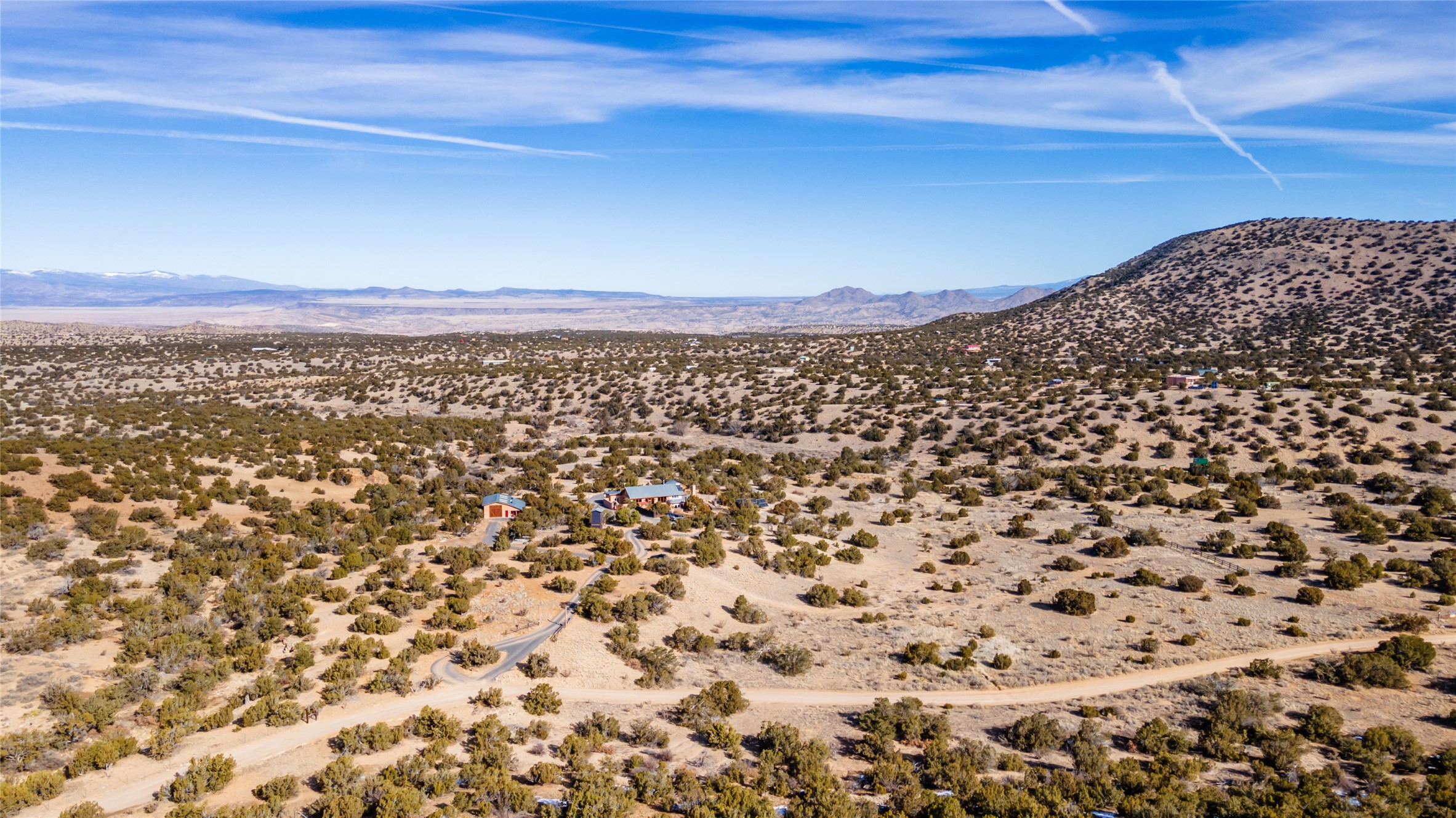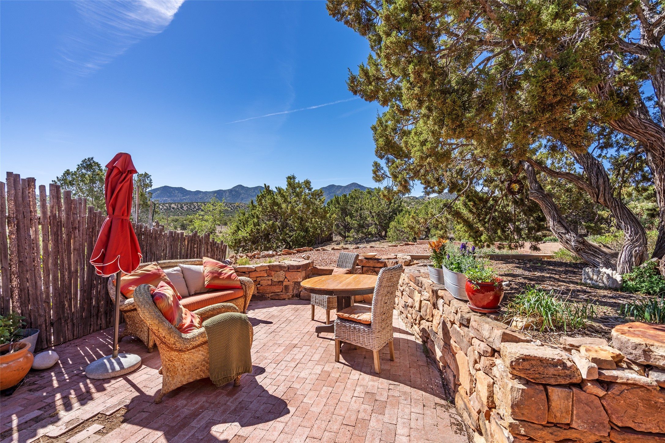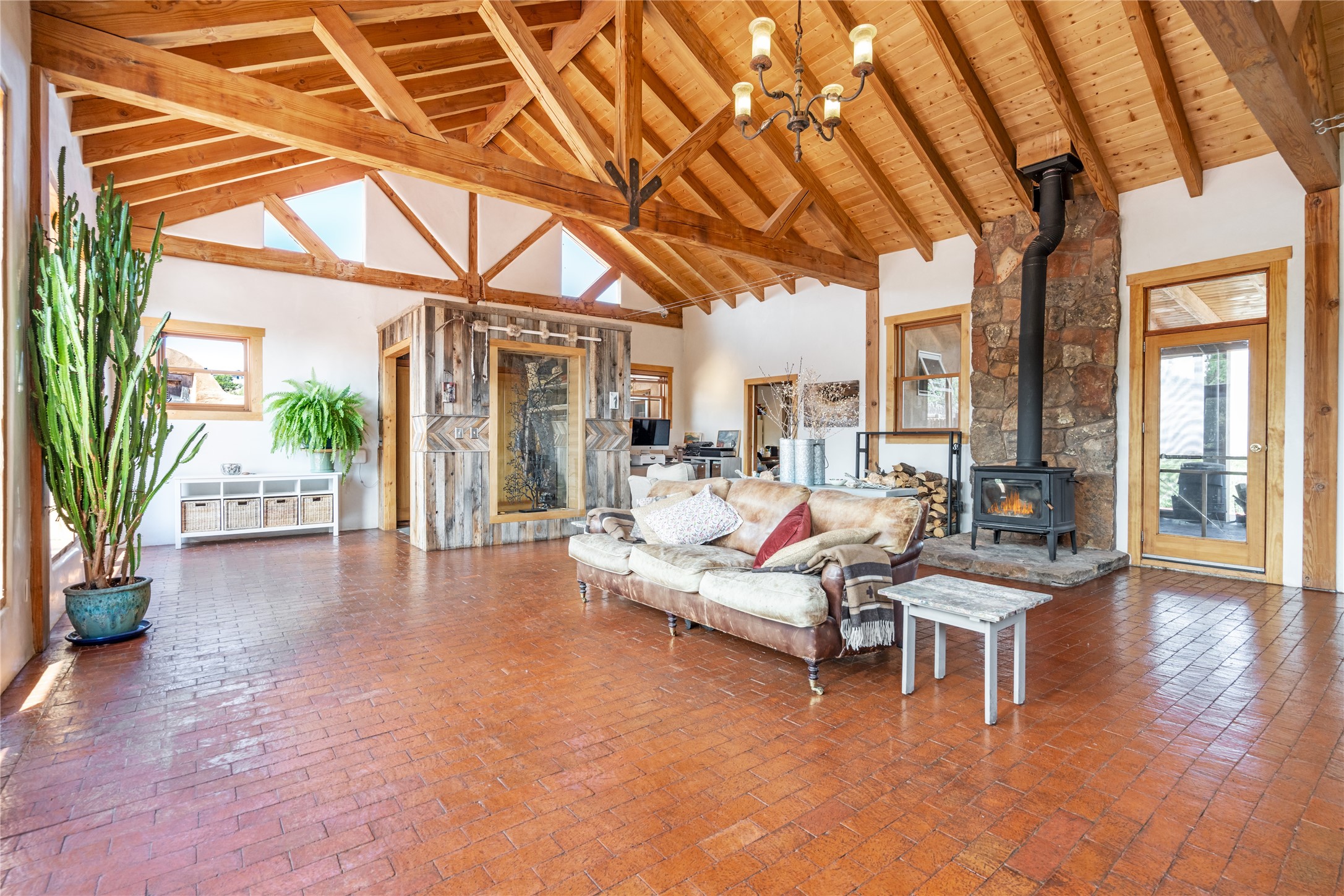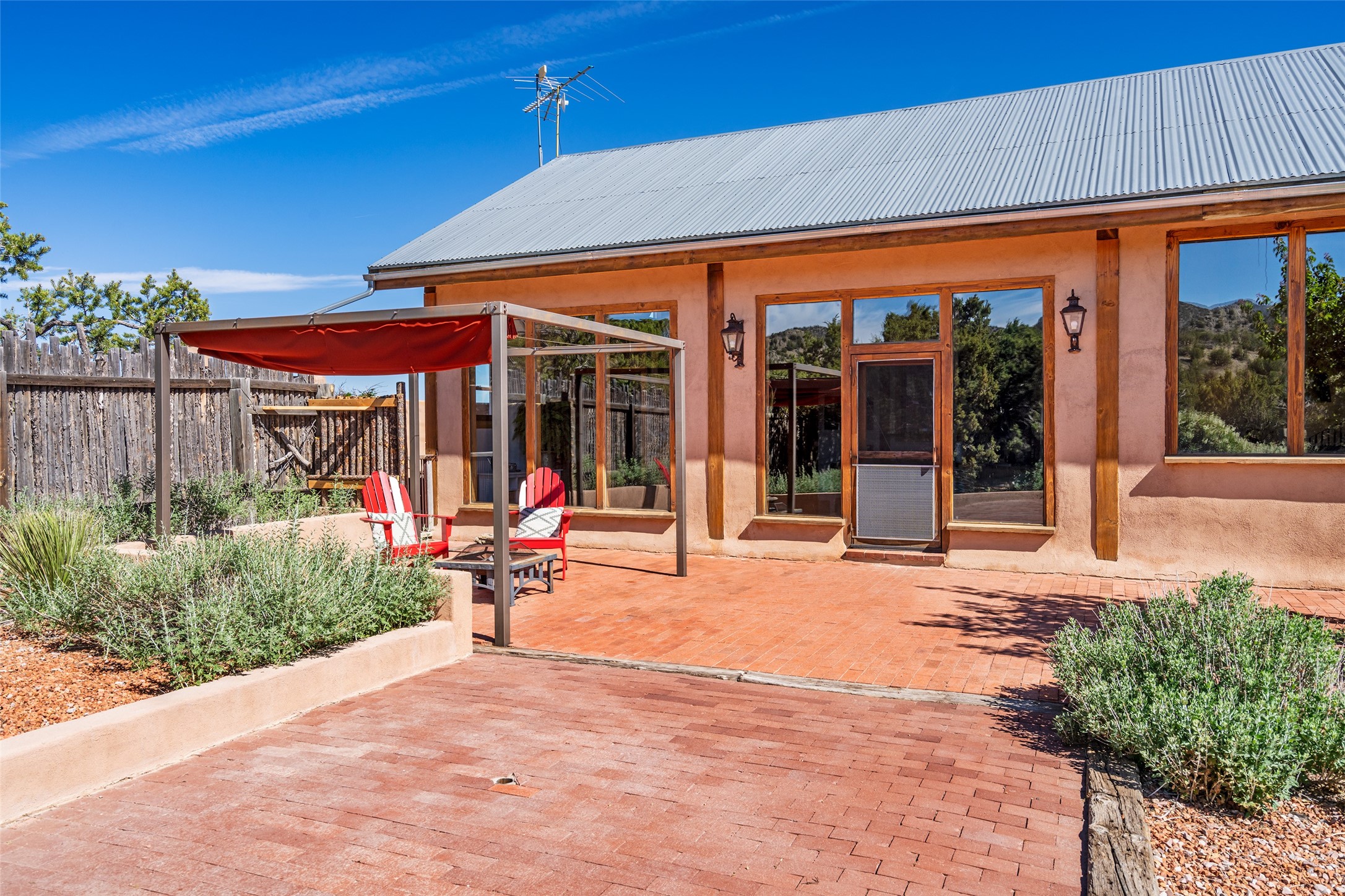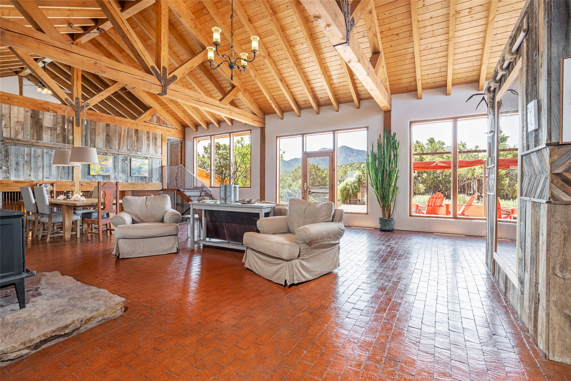 Indulge in a lifestyle where every sunset is a celebration. This real estate gem provides comfortable and luxurious eco off-grid living on 30 acres. The main house with its vaulted ceiling and exposed wood beams in the living/dining area is both light-filled and airy; the large view-filled windows overlooking the fenced courtyard garden also affording passive solar heating. Within this split level house, the gourmet kitchen features a commercial Wolf stove, double ovens, and griddle, granite countertops and hickory cabinets. Situated on the property is a charming fully appointed casita, providing a private retreat for guests. For those with a passion for recreational vehicles, this property goes above and beyond with its dedicated RV garage, and your very own service pit. The RV garage also includes a spacious studio, offering a multifunctional space that can be customized to suit your craft. Whether you envision it as an art studio, or a personal gym, the possibilities are endless. Other features include a fenced organic garden with raised beds, private well, new solar system, and heavy duty generator- making off-grid living easy. Horses are allowed and a fenced corral and water are in place. Situated half-way between Santa Fe and Albuquerque, don't miss the chance to make this picturesque haven your new home!