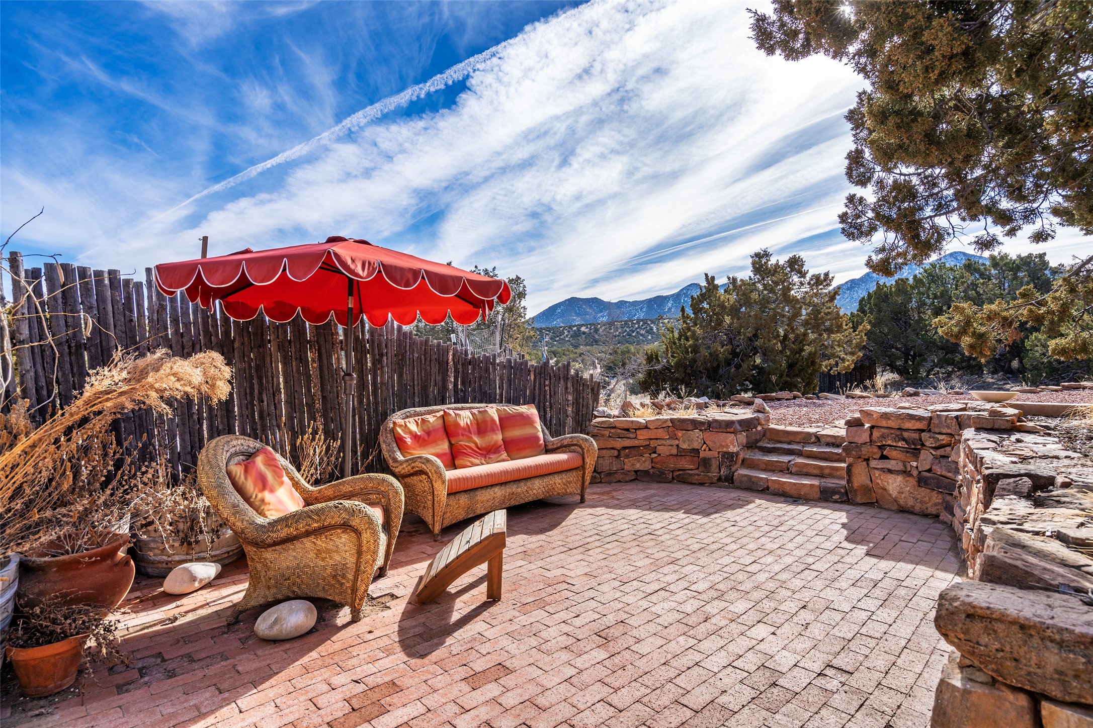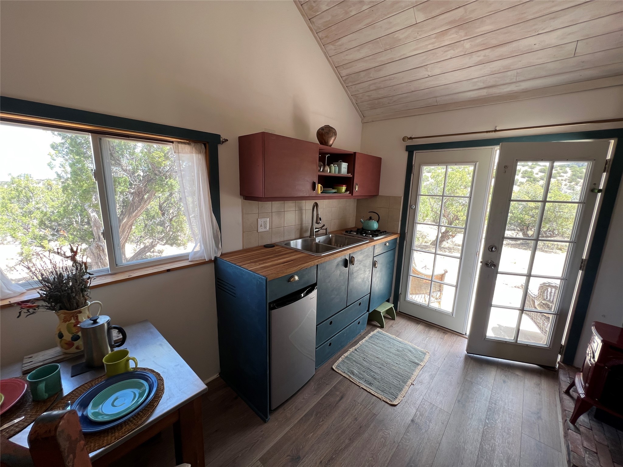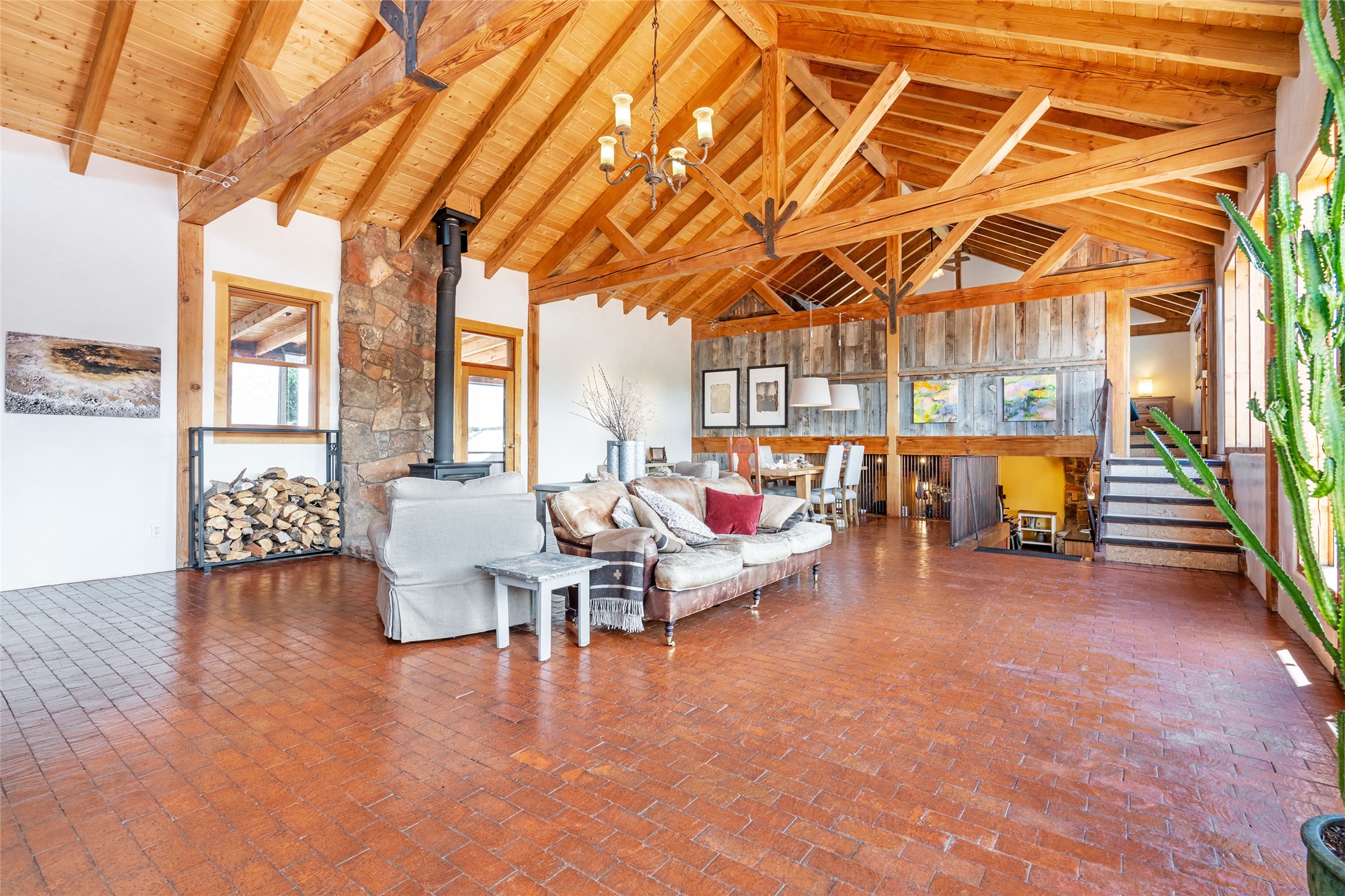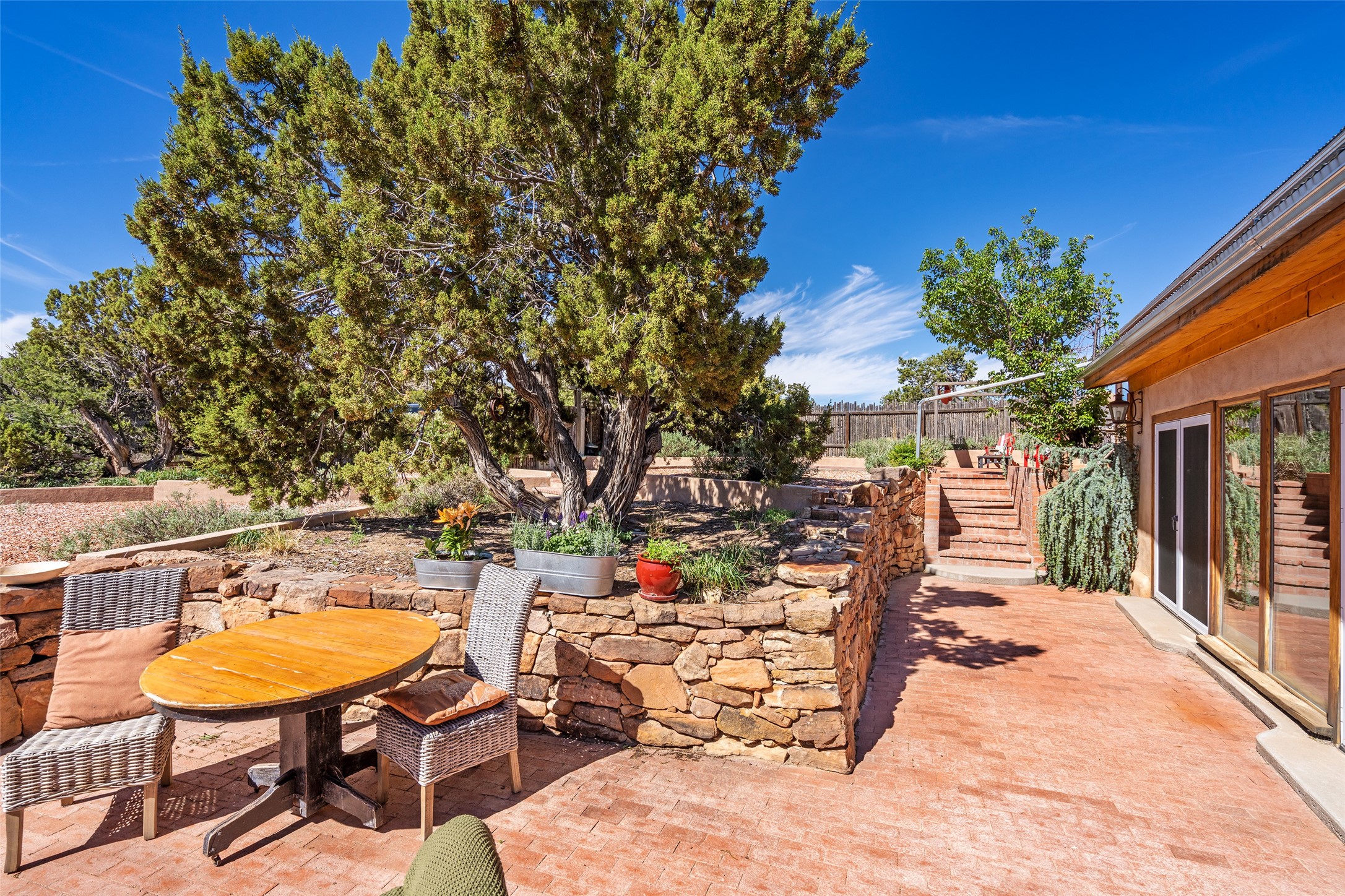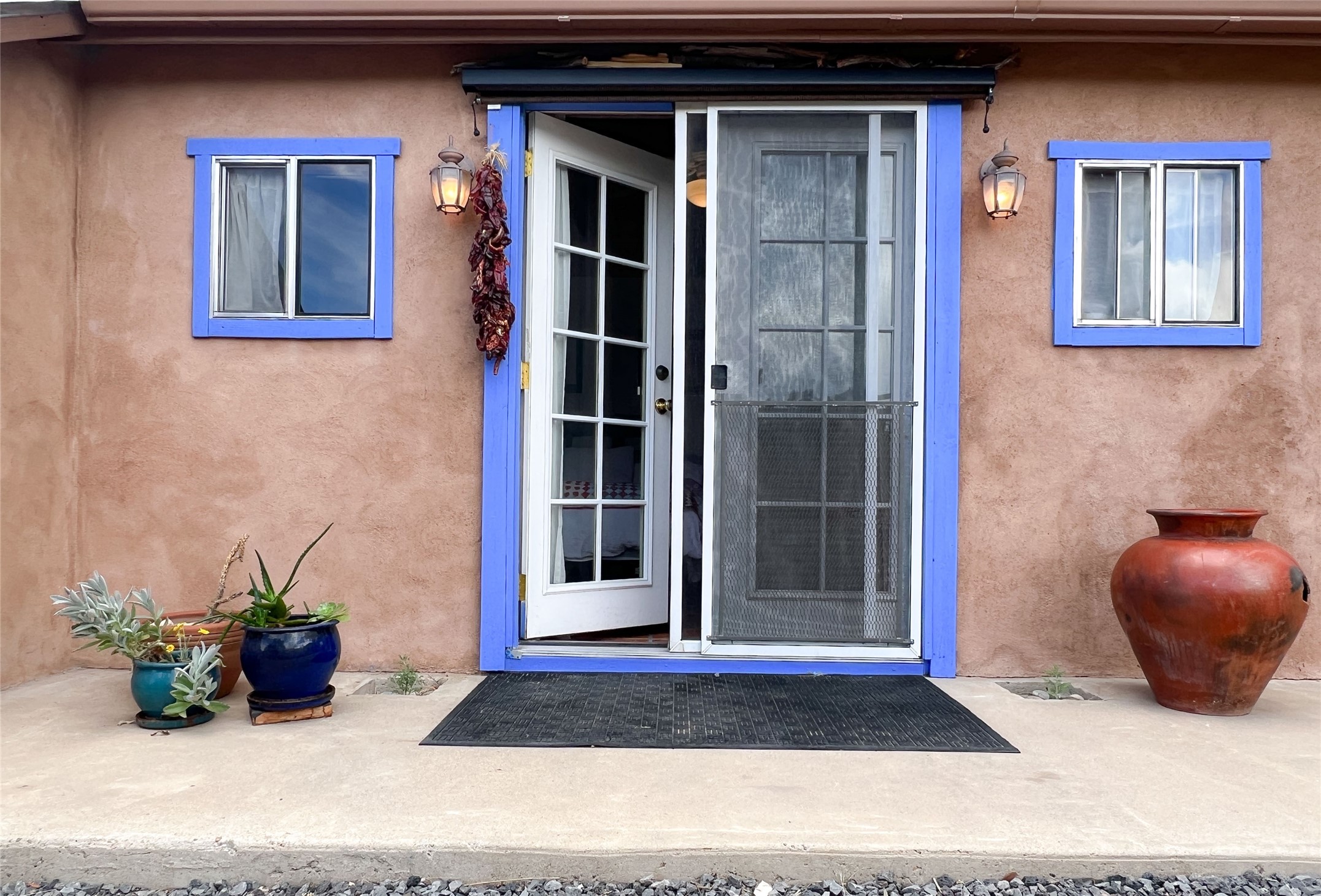 Indulge in a lifestyle where every sunset is a celebration. This real estate gem provides comfortable and luxurious eco off-grid living on 30 acres. The main house with its vaulted ceiling and exposed wood beams in the living/dining area is both light-filled and airy; the large view-filled windows overlooking the fenced courtyard garden also affording passive solar heating. Within this split level house, the gourmet kitchen features a commercial Wolf stove, double ovens, and griddle, granite countertops and hickory cabinets. Situated on the property is a charming fully appointed casita, providing a private retreat for guests. For those with a passion for recreational vehicles, this property goes above and beyond with its dedicated RV garage, and your very own service pit. The RV garage also includes a spacious studio, offering a multifunctional space that can be customized to suit your craft. Whether you envision it as an art studio, or a personal gym, the possibilities are endless. Other features include a fenced organic garden with raised beds, private well, new solar system, and heavy duty generator- making off-grid living easy. Horses are allowed and a fenced corral and water are in place. Situated half-way between Santa Fe and Albuquerque, don't miss the chance to make this picturesque haven your new home!