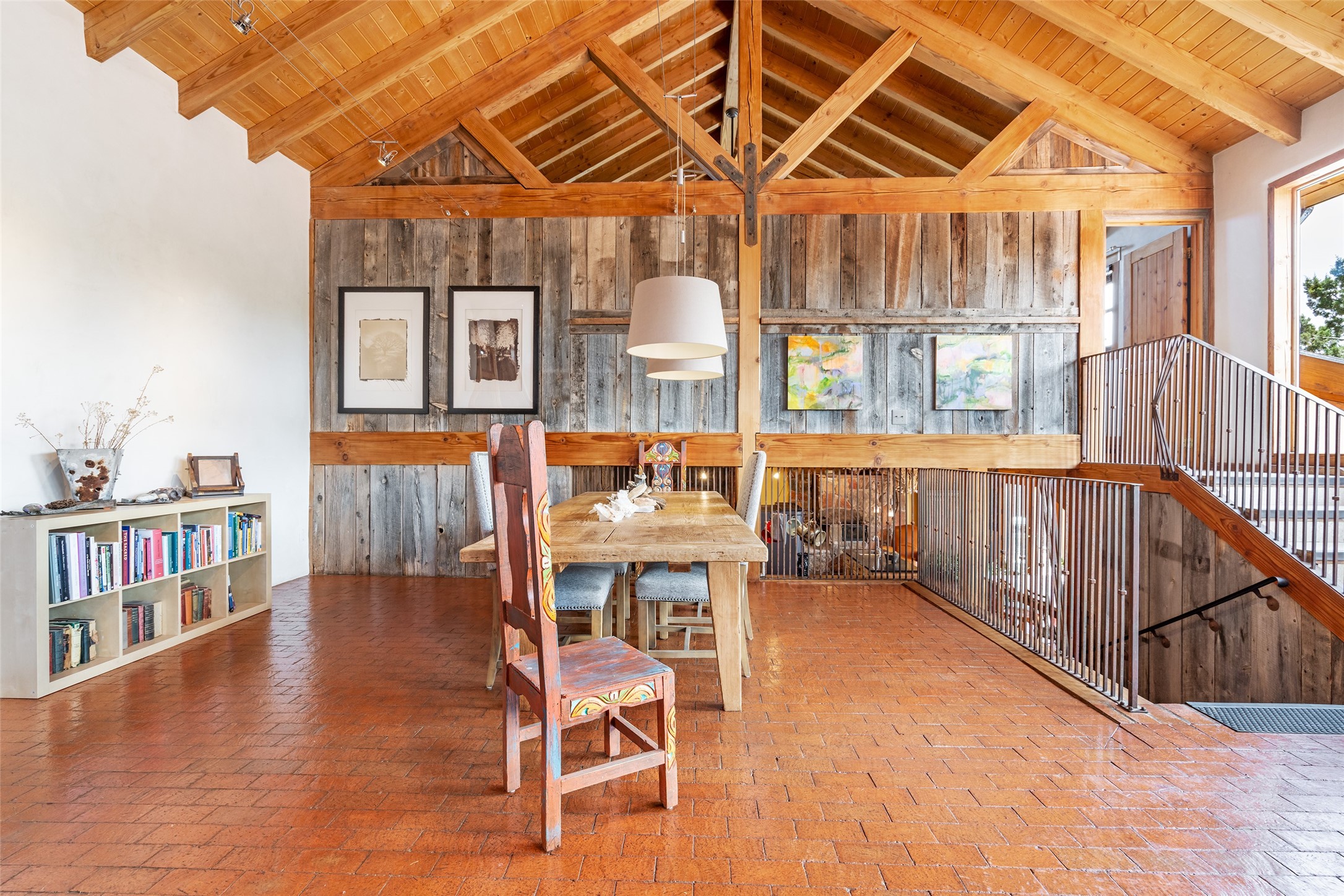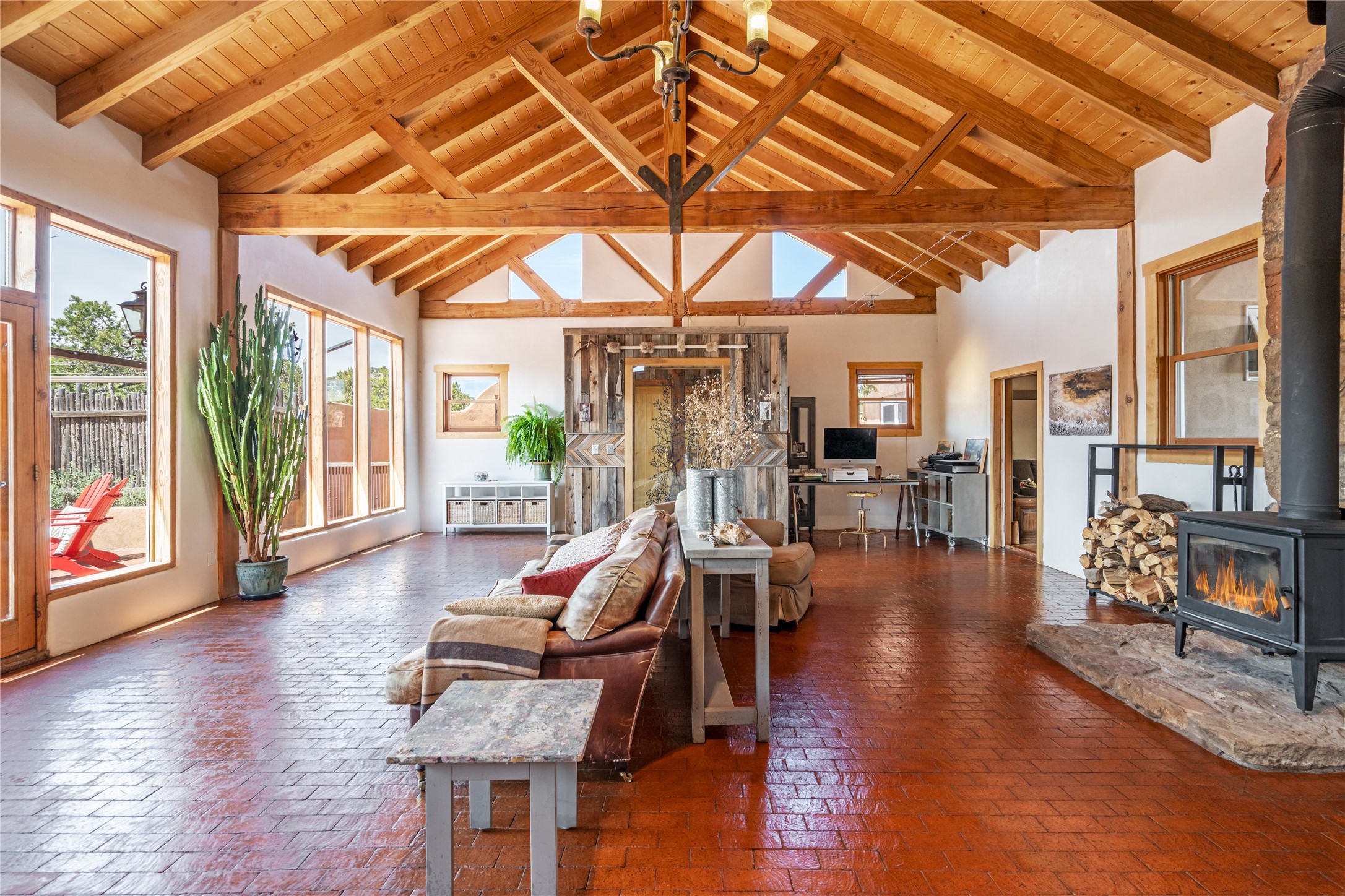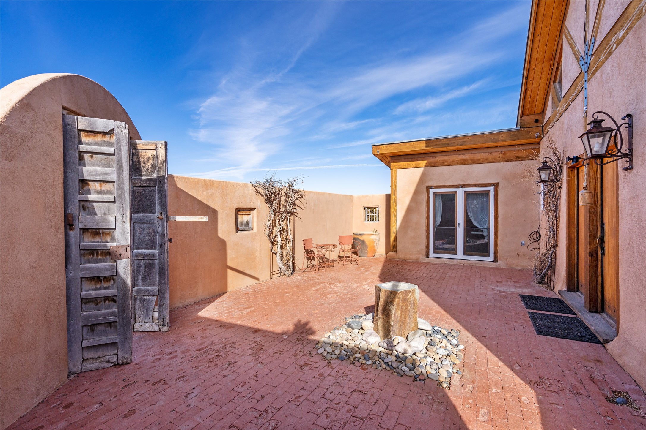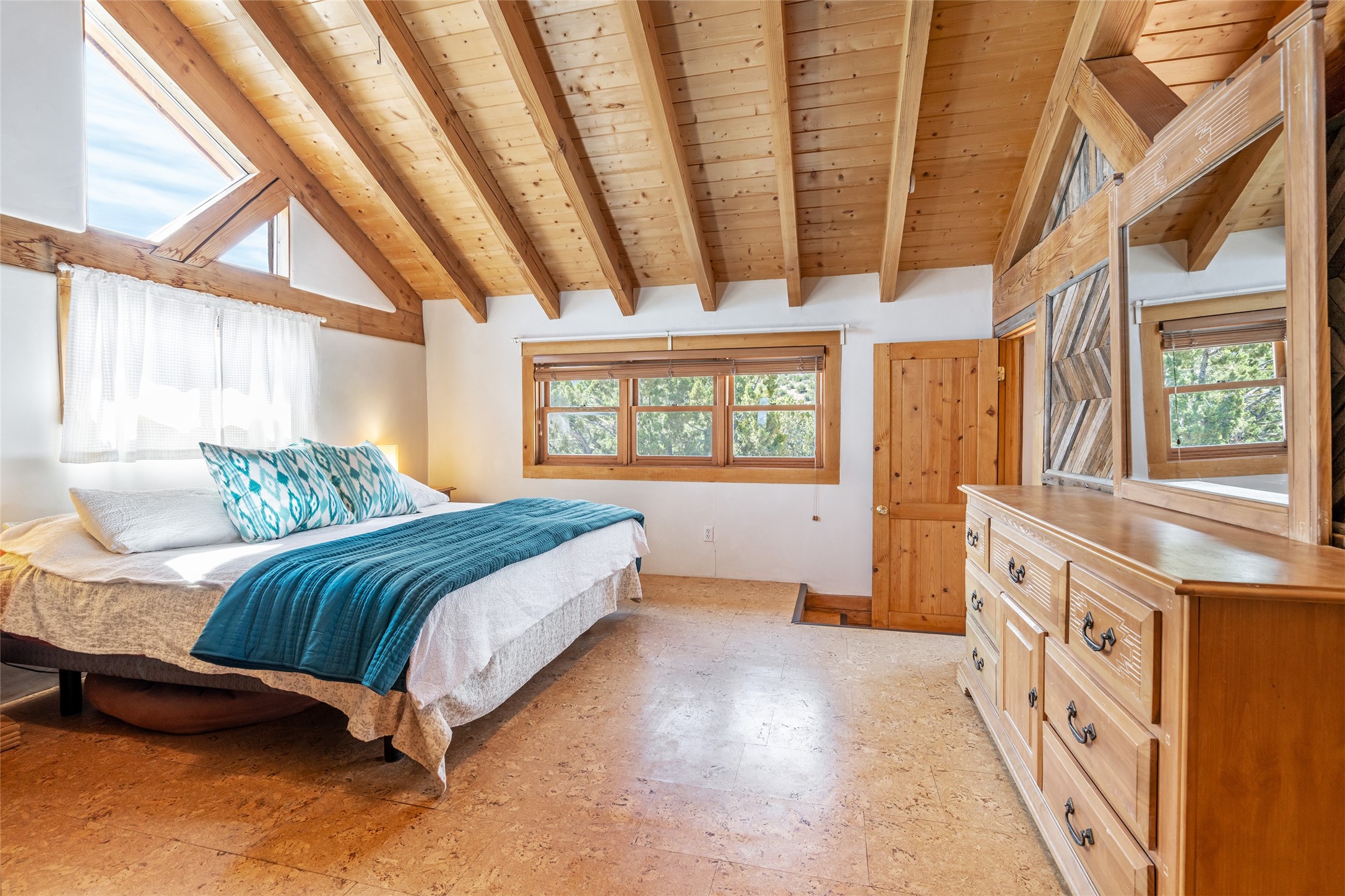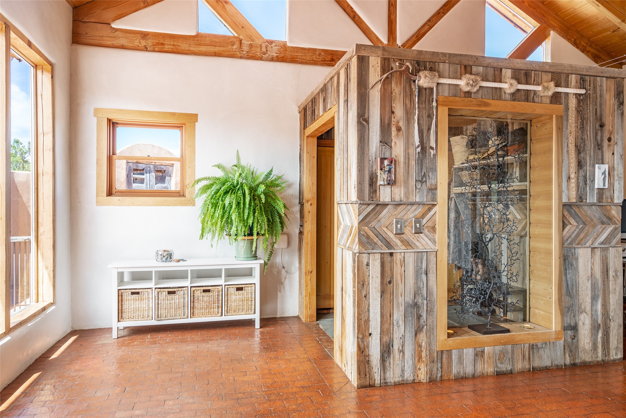 Indulge in a lifestyle where every sunset is a celebration. This real estate gem provides comfortable and luxurious eco off-grid living on 30 acres. The main house with its vaulted ceiling and exposed wood beams in the living/dining area is both light-filled and airy; the large view-filled windows overlooking the fenced courtyard garden also affording passive solar heating. Within this split level house, the gourmet kitchen features a commercial Wolf stove, double ovens, and griddle, granite countertops and hickory cabinets. Situated on the property is a charming fully appointed casita, providing a private retreat for guests. For those with a passion for recreational vehicles, this property goes above and beyond with its dedicated RV garage, and your very own service pit. The RV garage also includes a spacious studio, offering a multifunctional space that can be customized to suit your craft. Whether you envision it as an art studio, or a personal gym, the possibilities are endless. Other features include a fenced organic garden with raised beds, private well, new solar system, and heavy duty generator- making off-grid living easy. Horses are allowed and a fenced corral and water are in place. Situated half-way between Santa Fe and Albuquerque, don't miss the chance to make this picturesque haven your new home!