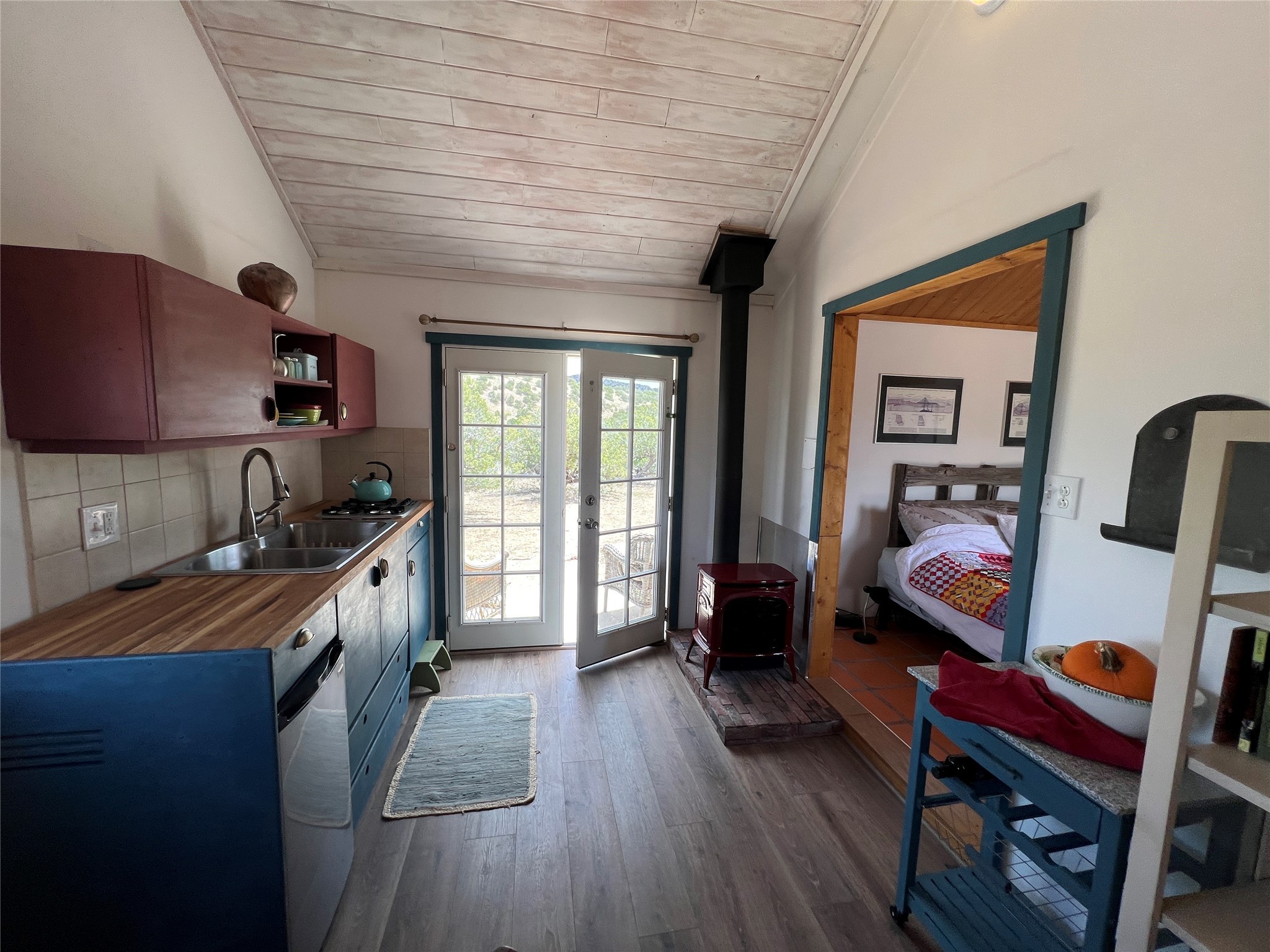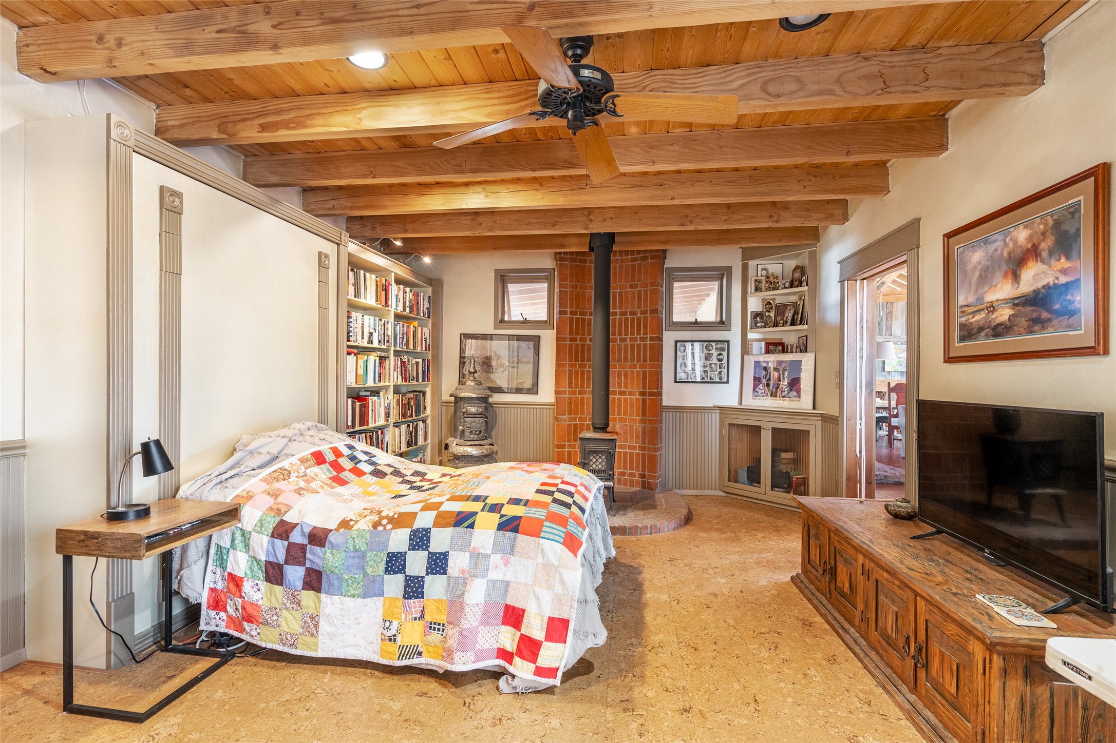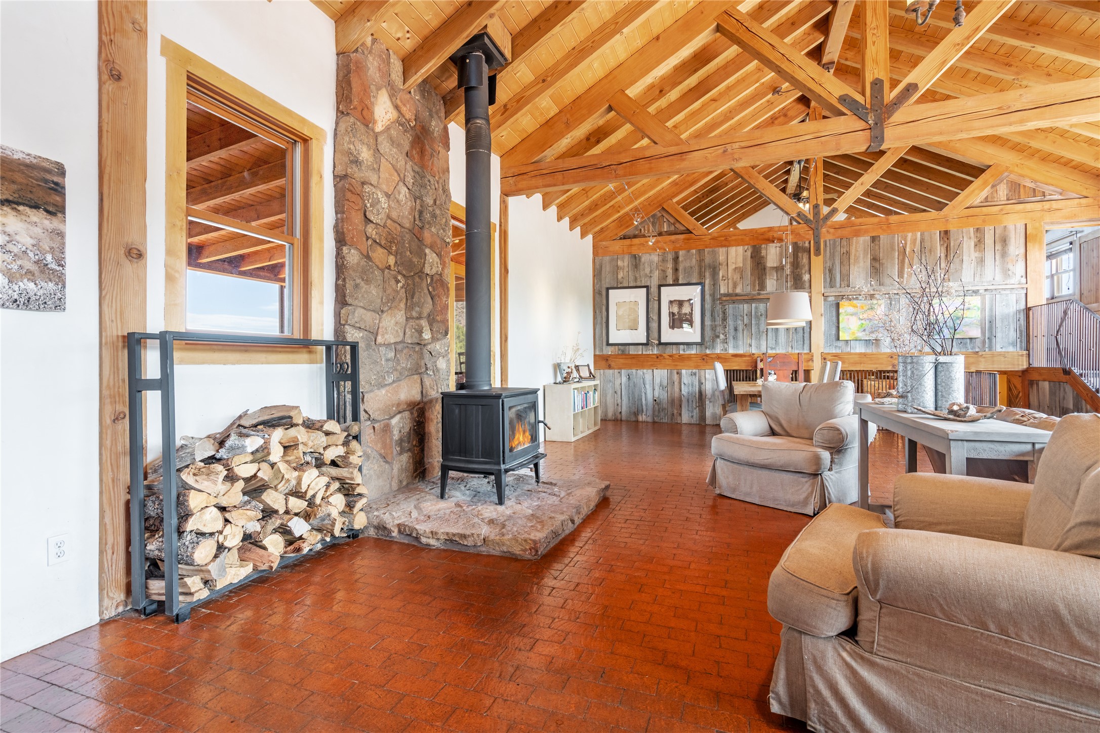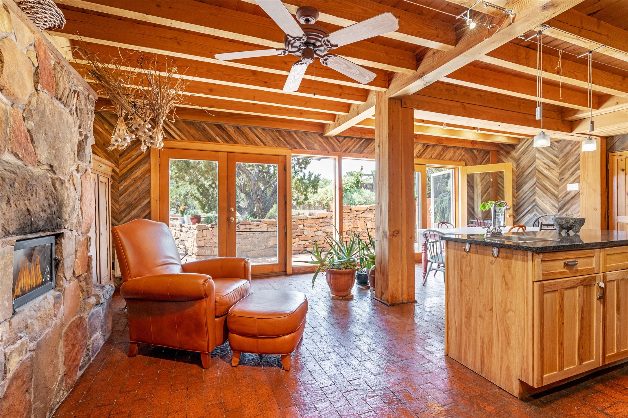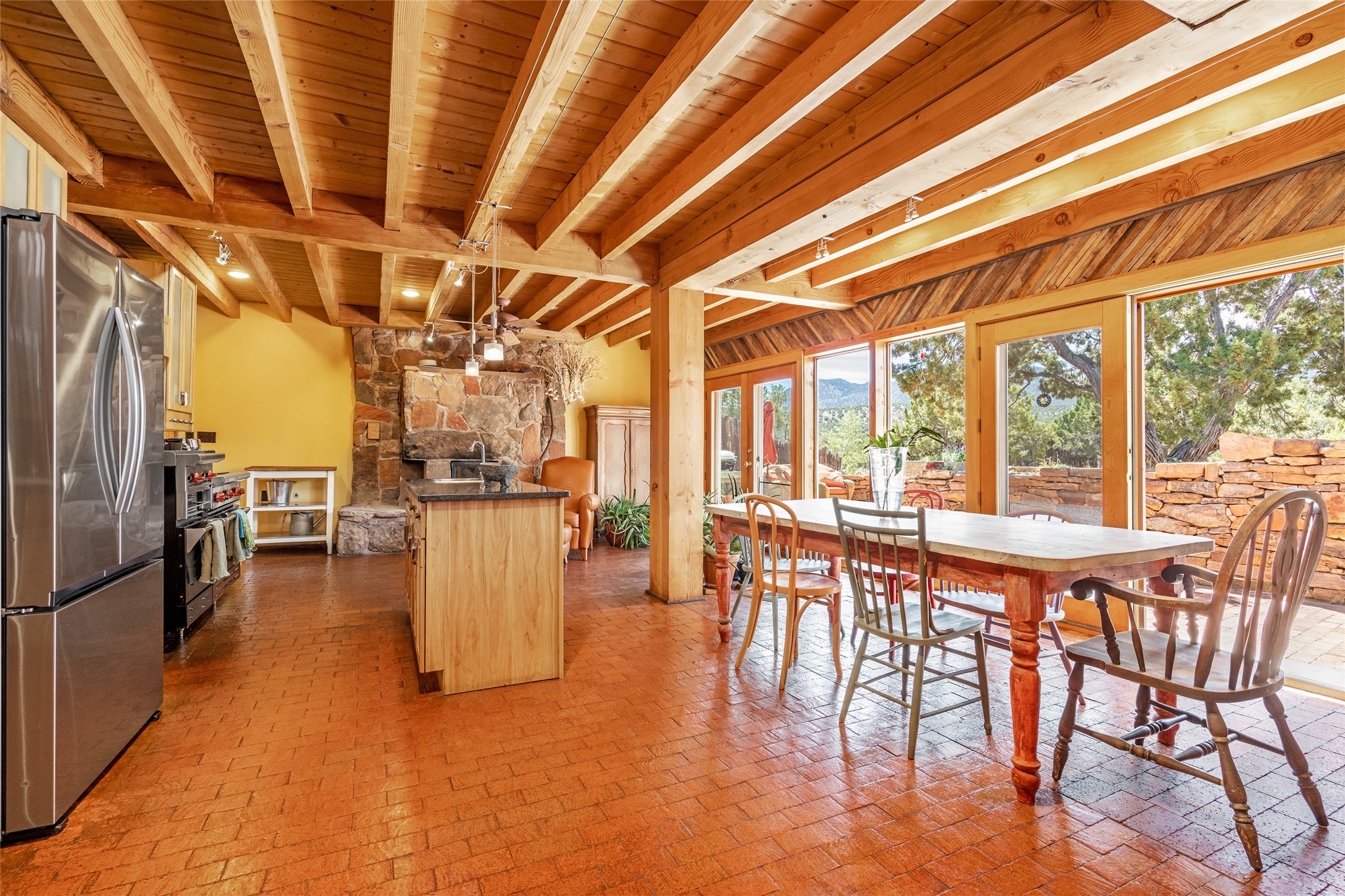 Indulge in a lifestyle where every sunset is a celebration. This real estate gem provides comfortable and luxurious eco off-grid living on 30 acres. The main house with its vaulted ceiling and exposed wood beams in the living/dining area is both light-filled and airy; the large view-filled windows overlooking the fenced courtyard garden also affording passive solar heating. Within this split level house, the gourmet kitchen features a commercial Wolf stove, double ovens, and griddle, granite countertops and hickory cabinets. Situated on the property is a charming fully appointed casita, providing a private retreat for guests. For those with a passion for recreational vehicles, this property goes above and beyond with its dedicated RV garage, and your very own service pit. The RV garage also includes a spacious studio, offering a multifunctional space that can be customized to suit your craft. Whether you envision it as an art studio, or a personal gym, the possibilities are endless. Other features include a fenced organic garden with raised beds, private well, new solar system, and heavy duty generator- making off-grid living easy. Horses are allowed and a fenced corral and water are in place. Situated half-way between Santa Fe and Albuquerque, don't miss the chance to make this picturesque haven your new home!