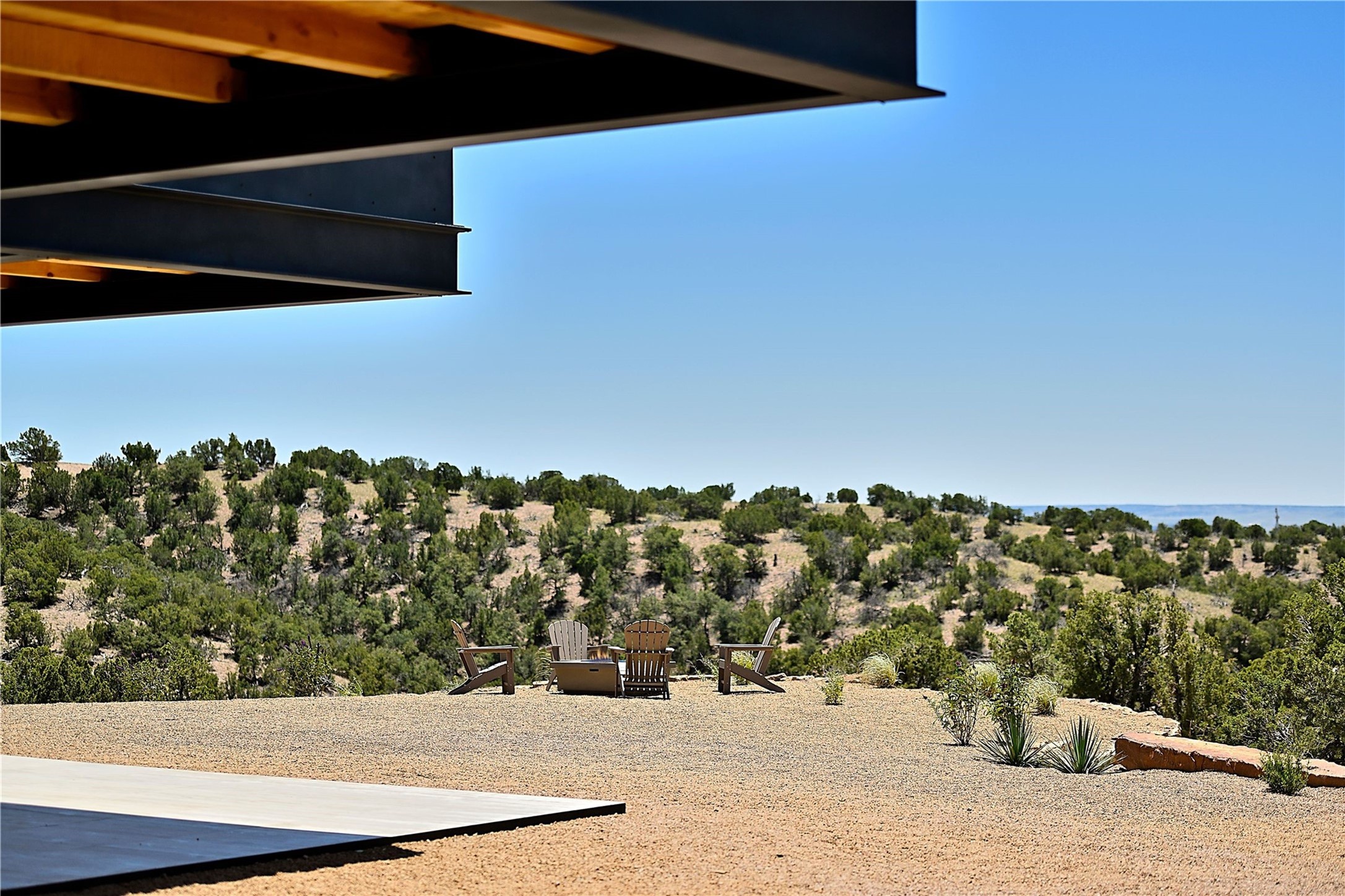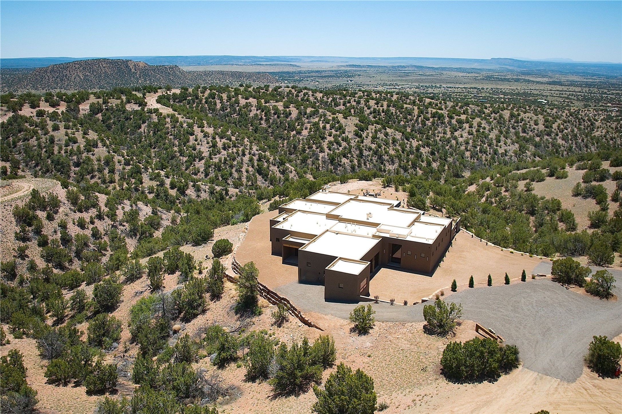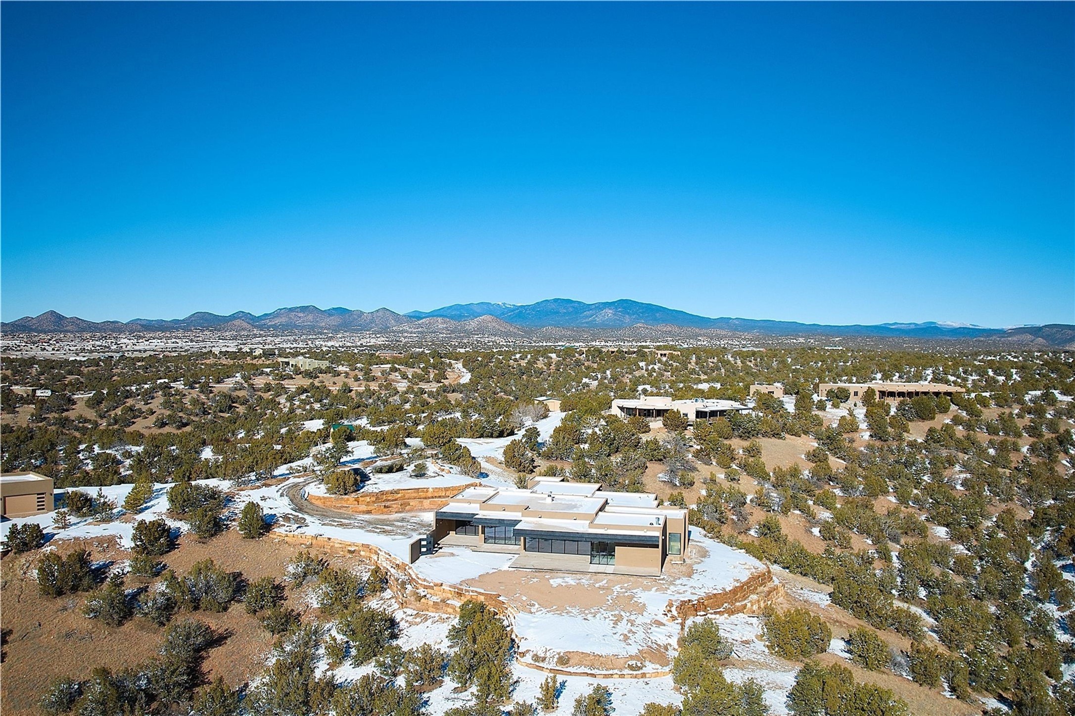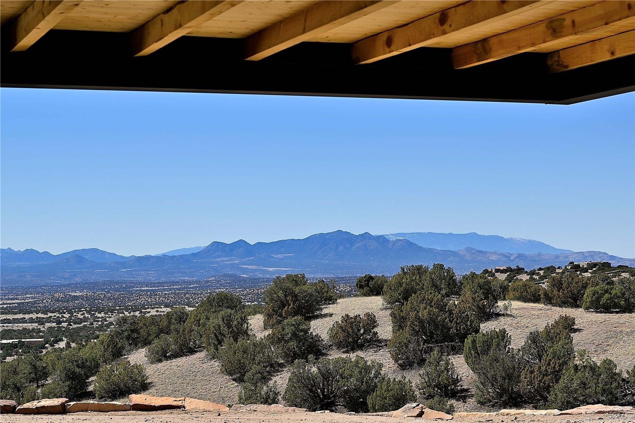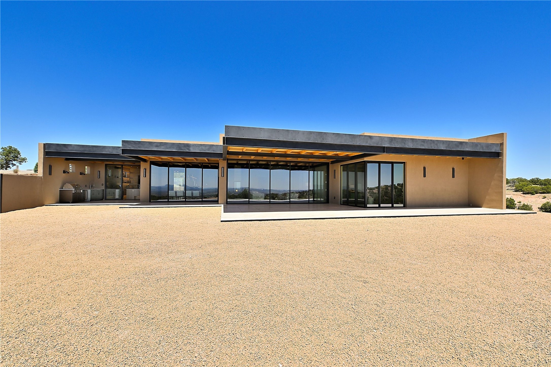 ** 2025 Grand Hacienda Winner!17 Vista Bella will be the #1 Property on the Haciendas 2025 Parade of Homes Tour 8/8-8/10 and 8/15-8/17. Breathtaking views and stellar night skies- this new build is move in ready! Boasting (approx.) 4,400 sq. ft. & nestled on 12.68 acres, this home offers unparalleled views of the Galisteo Basin and mountains. Designed by Mark Schwebel of Big Art Builders, 2024 Parade of Homes for Natural Materials winner, this masterpiece blends cantilevered steel beams, glass, natural wood, and stone to harmonize with its high-desert surroundings. A contemporary design brings the outdoors in, with expansive windows, a stunning outdoor kitchen, and spaces perfect for entertaining. Each element has been meticulously crafted to highlight the surrounding beauty while creating a warm, luxurious environment. The kitchen's stunning centerpiece is crafted from white oak slabs, complemented by Italian stone floors and walls. Counters are custom-milled Brazilian stone, with BlueStar appliances and True refrigeration. Each bathroom is a work of art, clad in exotic stones sourced from Mexico, Turkey, and Italy. Vanities are crafted from exotic hardwoods like West African Padauk and Black Limba, paired with countertops of Persian travertine, Brazilian Taj Mahal, and Namibian granite. The powder room features Italian stone and a unique concrete sink. Refined details include: 7" French white oak floors, Lake Tahoe white fir ceilings, and two showpiece gas fireplaces: a modern shepherd's design in the primary suite and a black granite-clad peninsula in the living room. Take advantage of the unrivaled comfort this home offers with High-efficiency Carrier forced air heating and cooling, radiant heating throughout, and superior insulation with closed-cell spray foam (R60 ceilings, R30 walls). This home is a celebration of luxury, nature, and artistry, a truly one-of-a-kind property that must be experienced.