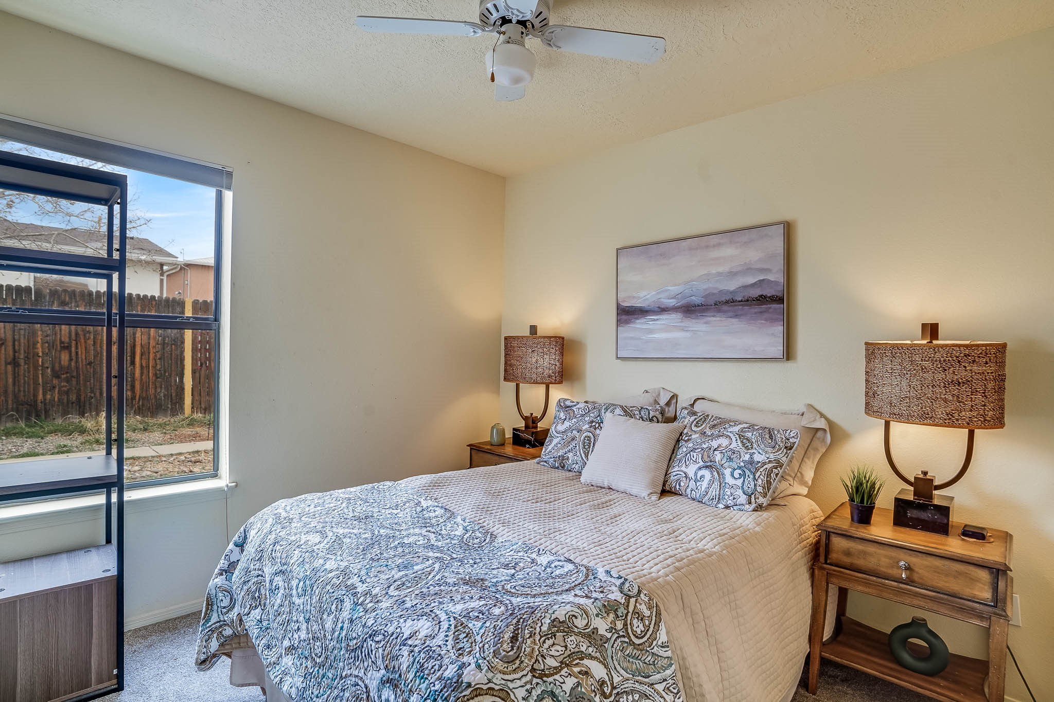Experience the perfect balance of comfort and efficiency in this charming 3 bedroom, 2 bathroom home. Nestled on a generous corner lot, the residence features an inviting open floorplan with high beam ceilings and abundant natural light streaming through large, bright windows. The spacious layout seamlessly connects living, dining, and kitchen areas, ideal for both entertaining and daily life. Enjoy the convenience of a finished single-car garage, a fully fenced yard perfect for pets and play, and dedicated RV parking.Recent enhancements includea 2024 photovoltaic solar panel system for sustainableliving, an upgraded electrical panel ready for EV charging and AC installation, a 2023 roof with a transferable warranty, a new 2024 sliding glass door, and a new furnace installed in March 2025.