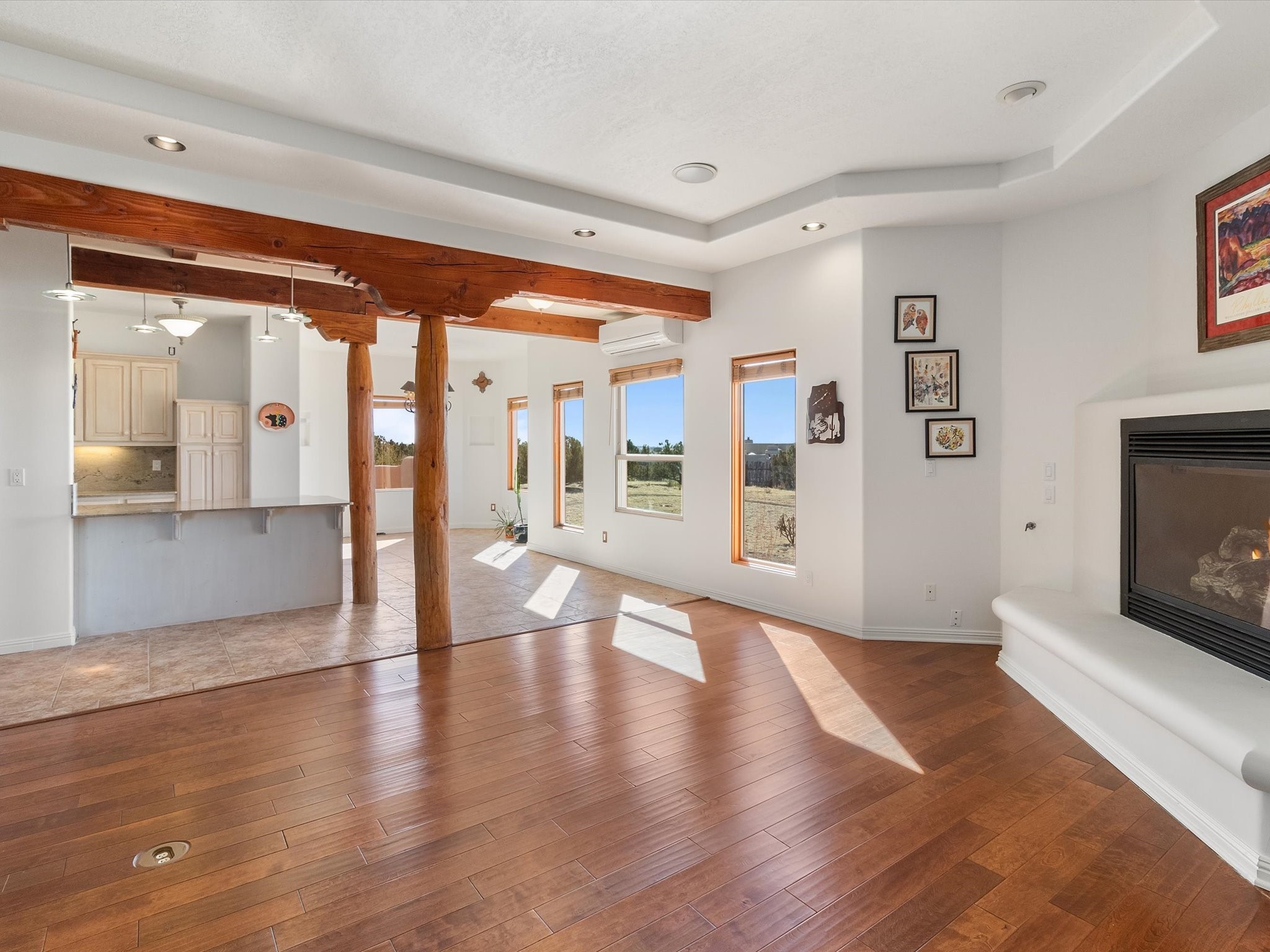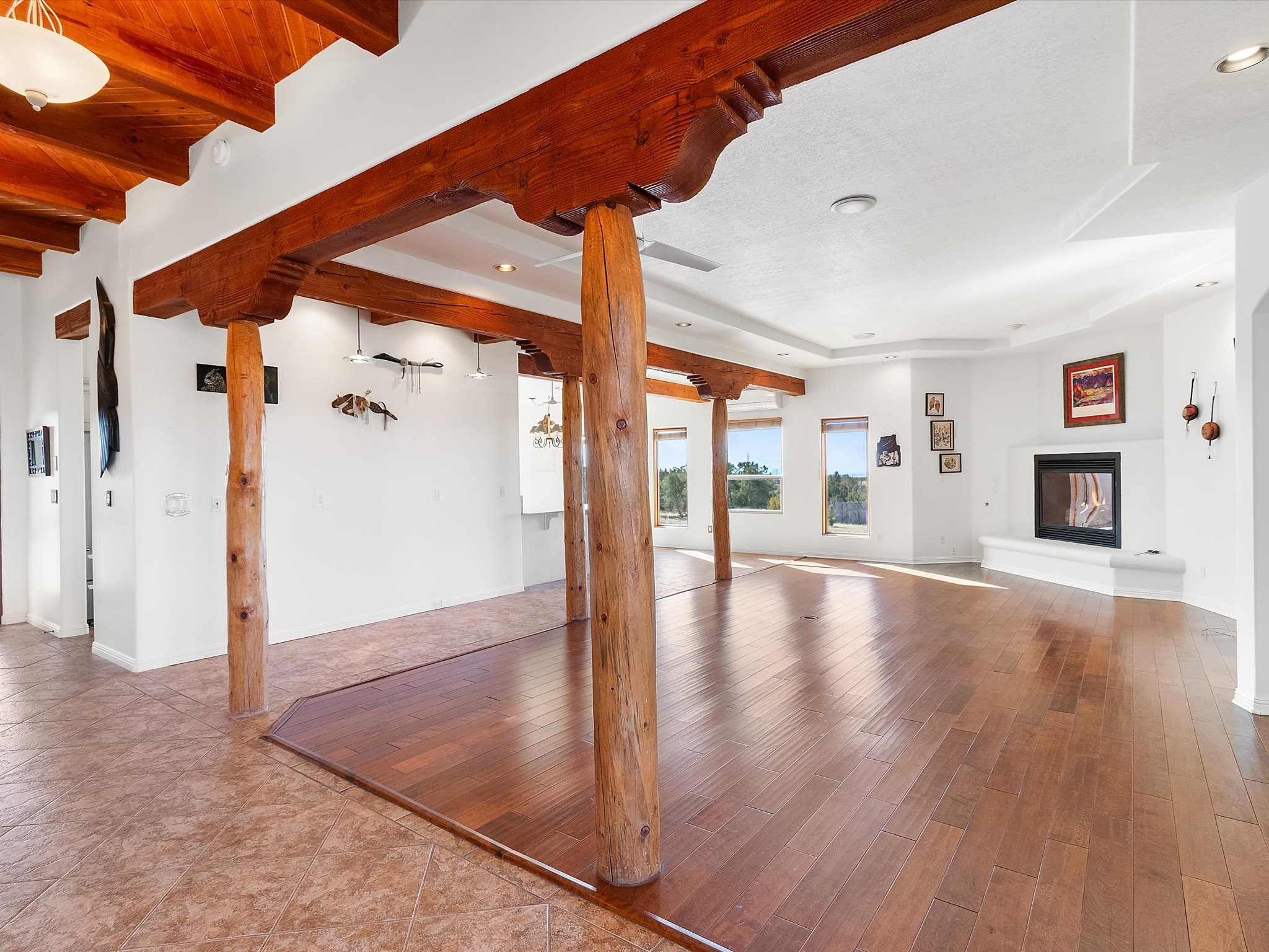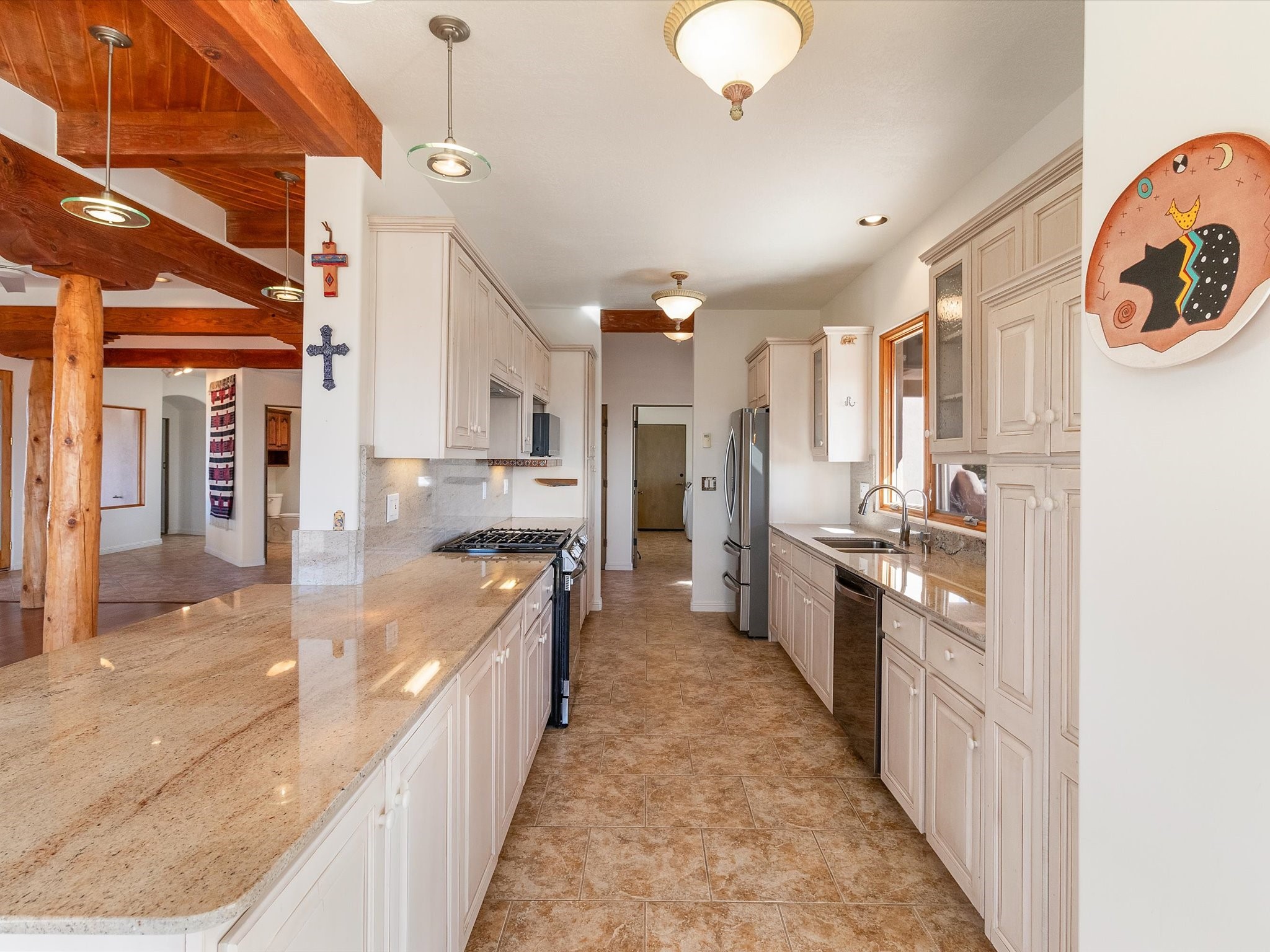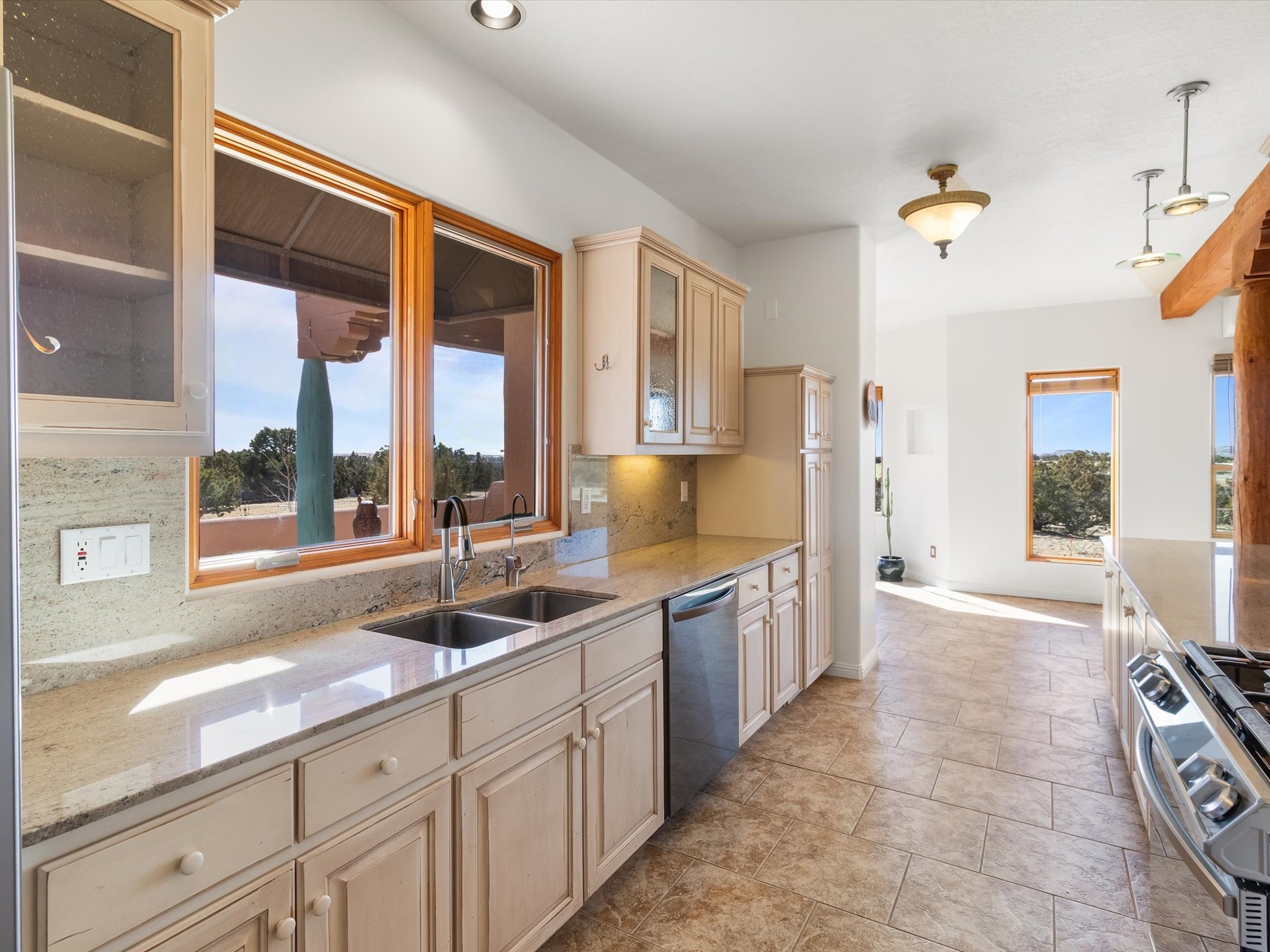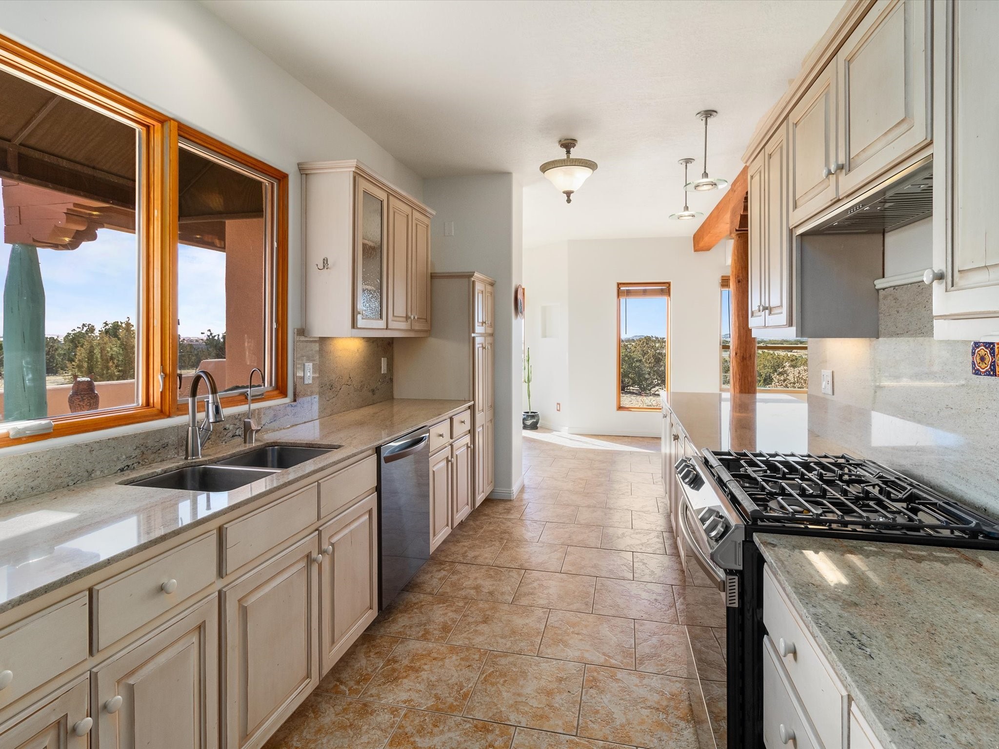 Captivating Pueblo-Style Retreat with Panoramic Views!Nestled on 2.35 acres, this lovely 3-bedroom pueblo-style home is thoughtfully designed to embrace Santa Fe's breathtaking landscapes. From the moment you step inside, the home draws you toward the inviting central patio--an ideal space for gatherings, relaxation, and savoring the vibrant hues of Santa Fe sunsets alongside the tranquil sounds of a water fountain.The high-ceilinged living room, complete with corner fireplace, creates a warm and welcoming atmosphere for entertaining. The kitchen is equipped with stainless steel appliances and has an elongated layout, leading to a charming informal dining area with large windows that perfectly frame the sweeping views of the Sandia, Ortiz, and Cerrillos mountains.The privately situated Primary suite offers a cozy gas fireplace, a spacious walk-in closet, and an En-suite bath featuring a soaking tub and separate shower. A second suite includes a comfortable sitting area with a picture window showcasing stunning views of the Jemez Mountains.Recent updates elevate this home's appeal, including a newer roof, a solar-powered entry gate, skylights, New appliances, mature landscaping with lighting, Automatic drip irrigation, fencing, Newer Boiler, Motordeck garage flooring, New garage door and motor, 220v plug for Electric car charger in the garage, intercom for front entry gate and additional 4 car covered parking. A true Santa Fe sanctuary, this residence blends timeless elegance with modern comforts for a life of beautiful vistas and tranquility.