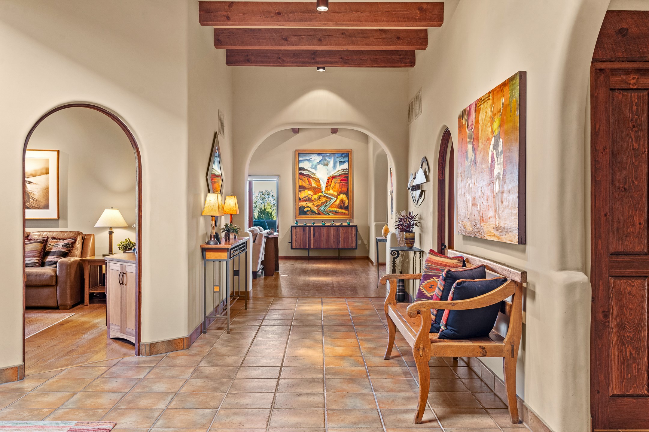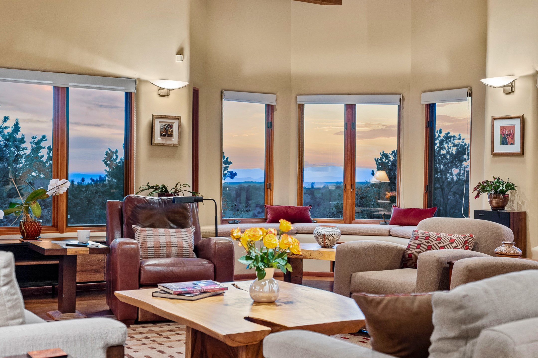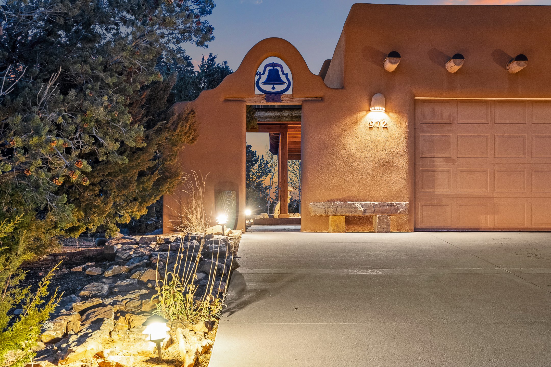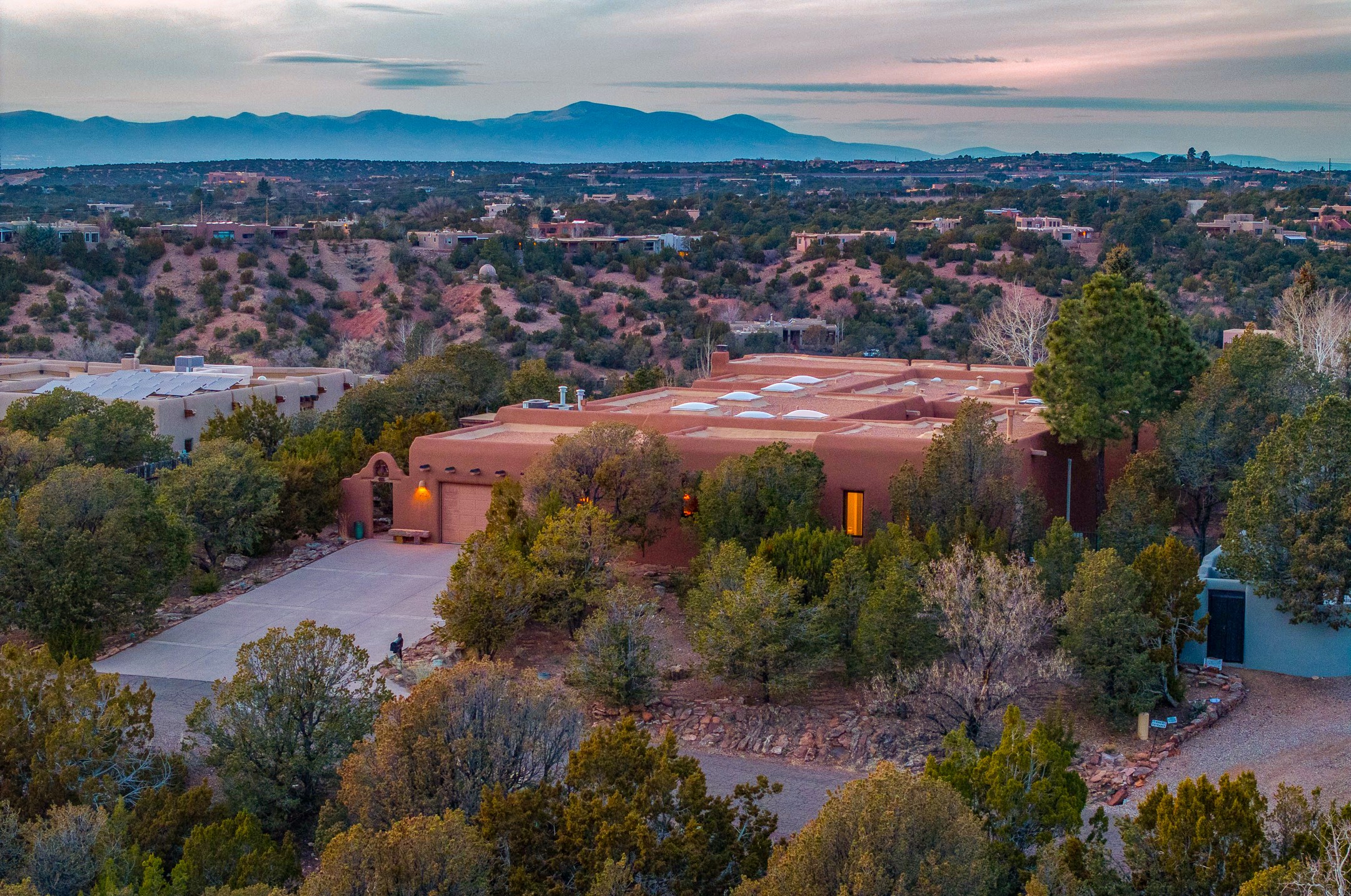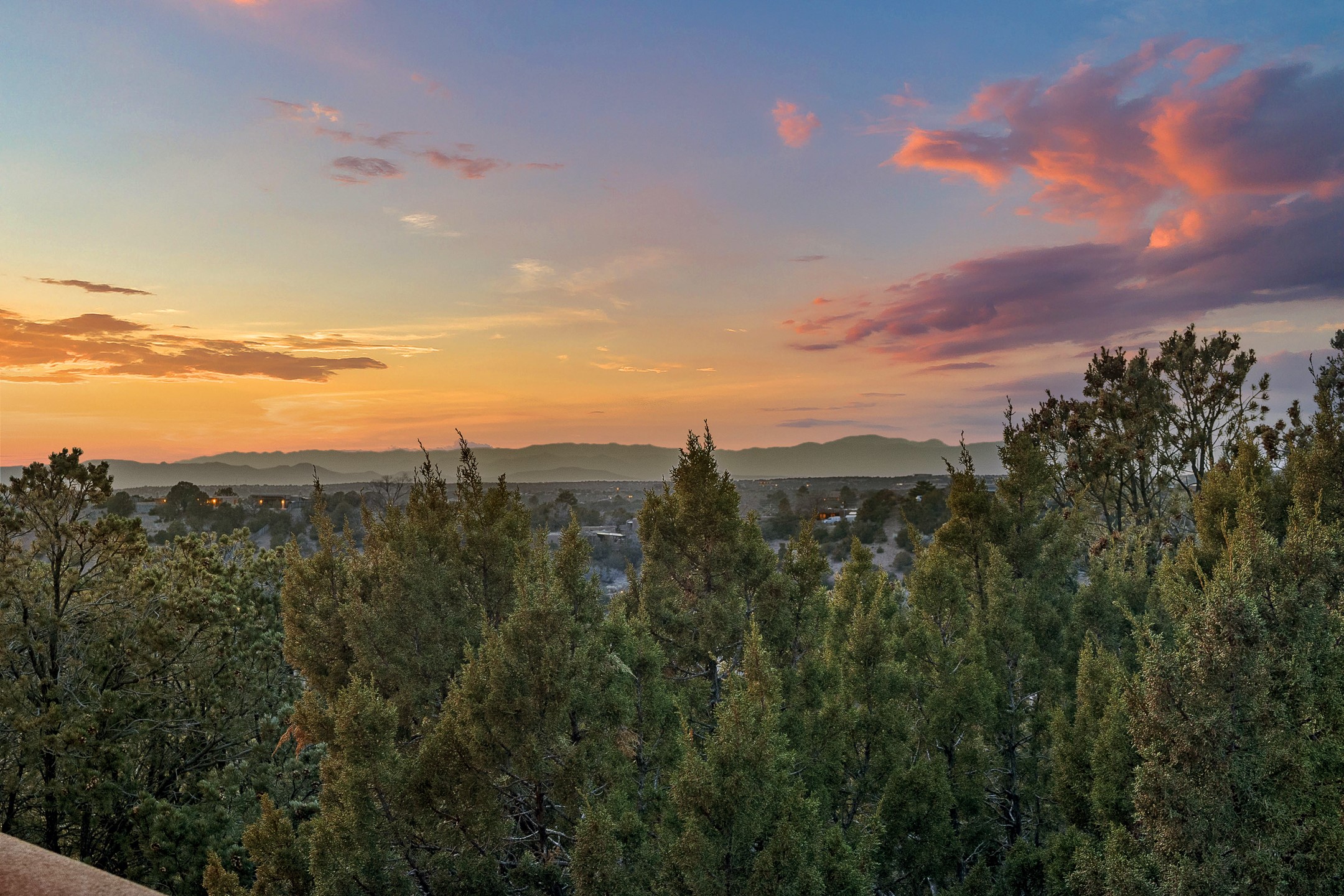 A view-filled Southwestern home on 1.2 acres in the desirable Northeast city limits and just minutes from The Plaza! This warm, single level residence offers four bedrooms, five bathrooms and is a view-filled downtown retreat. Upon arrival, an inviting entry arch, with a traditional bell, ushers you into a world of Southwestern sophistication. The foyer, adorned with high ceilings and wonderful natural light, sets the tone for a home that artfully blends timeless design with modern amenities. The heart of the home is an open-concept living/dining area that is enveloped by the panoramic views of the Jemez mountains. The formal living room features a beautiful gas fireplace and a charming banco designed for sunset views. The adjacent formal dining area seamlessly extends to a west-facing patio, perfect for dining under the Santa Fe skies. The kitchen boasts custom cherry cabinets, an eat-in island, and a cozy breakfast nook for casual family meals. A den provides additional space for a home office or flex room to suit your lifestyle needs. The thoughtfully designed layout includes two expansive bedroom suites--one of which is situated off a private hallway, offering a serene guest casita experience. The main bedroom hallway, with high ceilings and skylights, leads to the primary suite. This private retreat features dual walk-in closets, double vanities, a walk-in shower, and an indulgent soaking tub, creating a spa-like sanctuary. An additional guest bedroom, currently used as an office, includes an ensuite bathroom, while a third room--originally intended as a studio with a water stub-out--offers limitless potential as a creative space or guest room. The surprise of this property is the indoor aquatics room with a heated resistance pool, jacuzzi, sauna, and three-quarter bath. Lovingly maintained, 972 Indian Ridge Rd combines unparalleled views, a wonderful floor plan, and an unbeatable location--perfect for those seeking the ultimate Santa Fe luxury lifestyle.