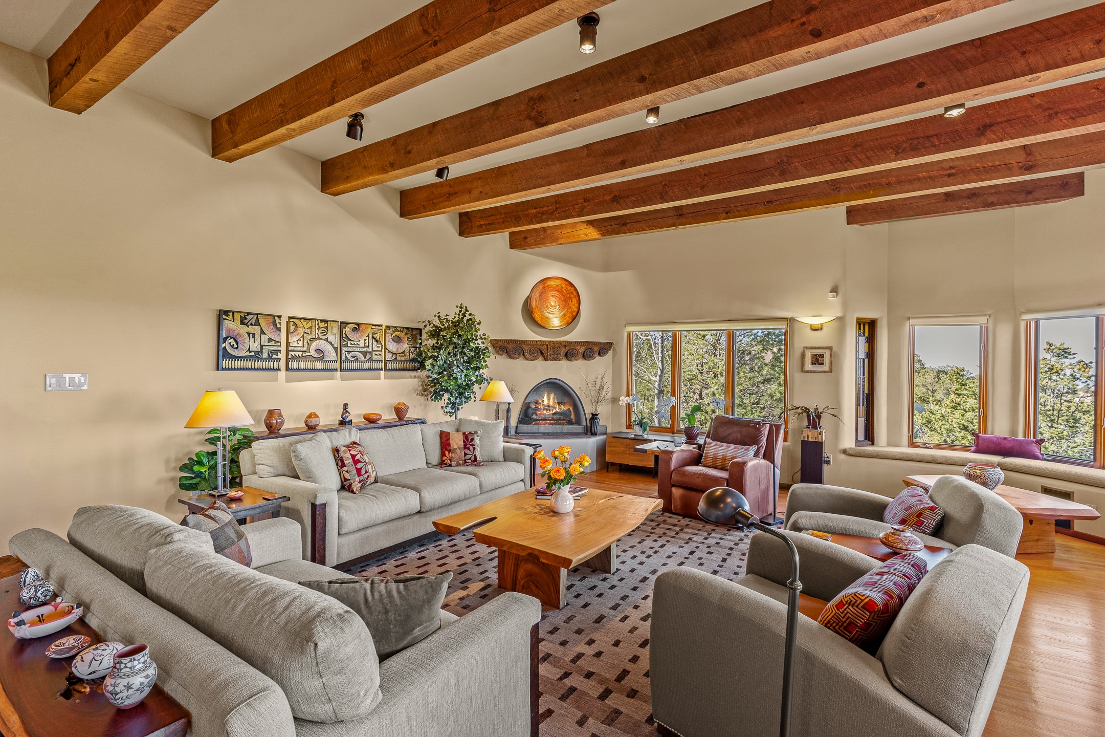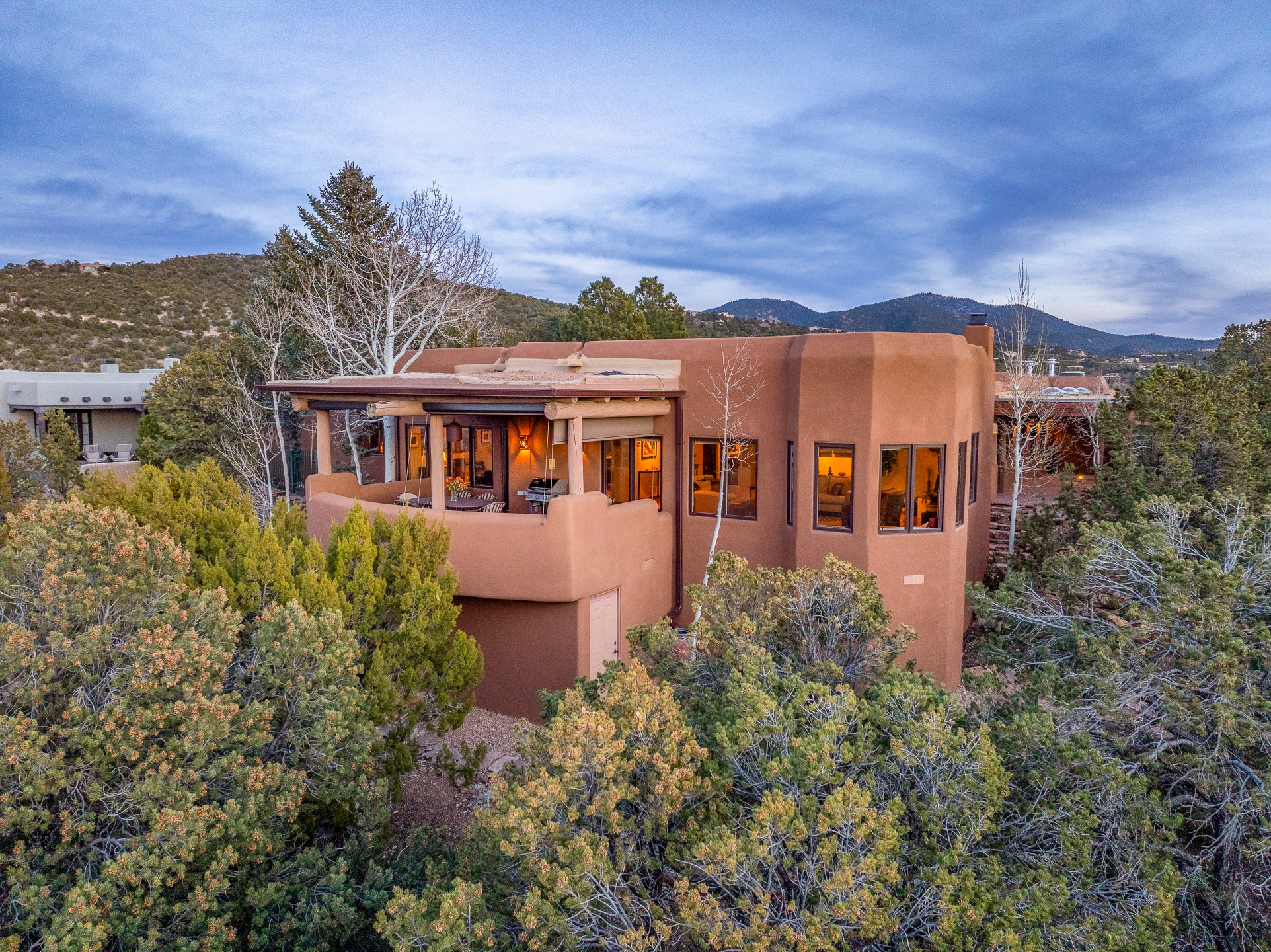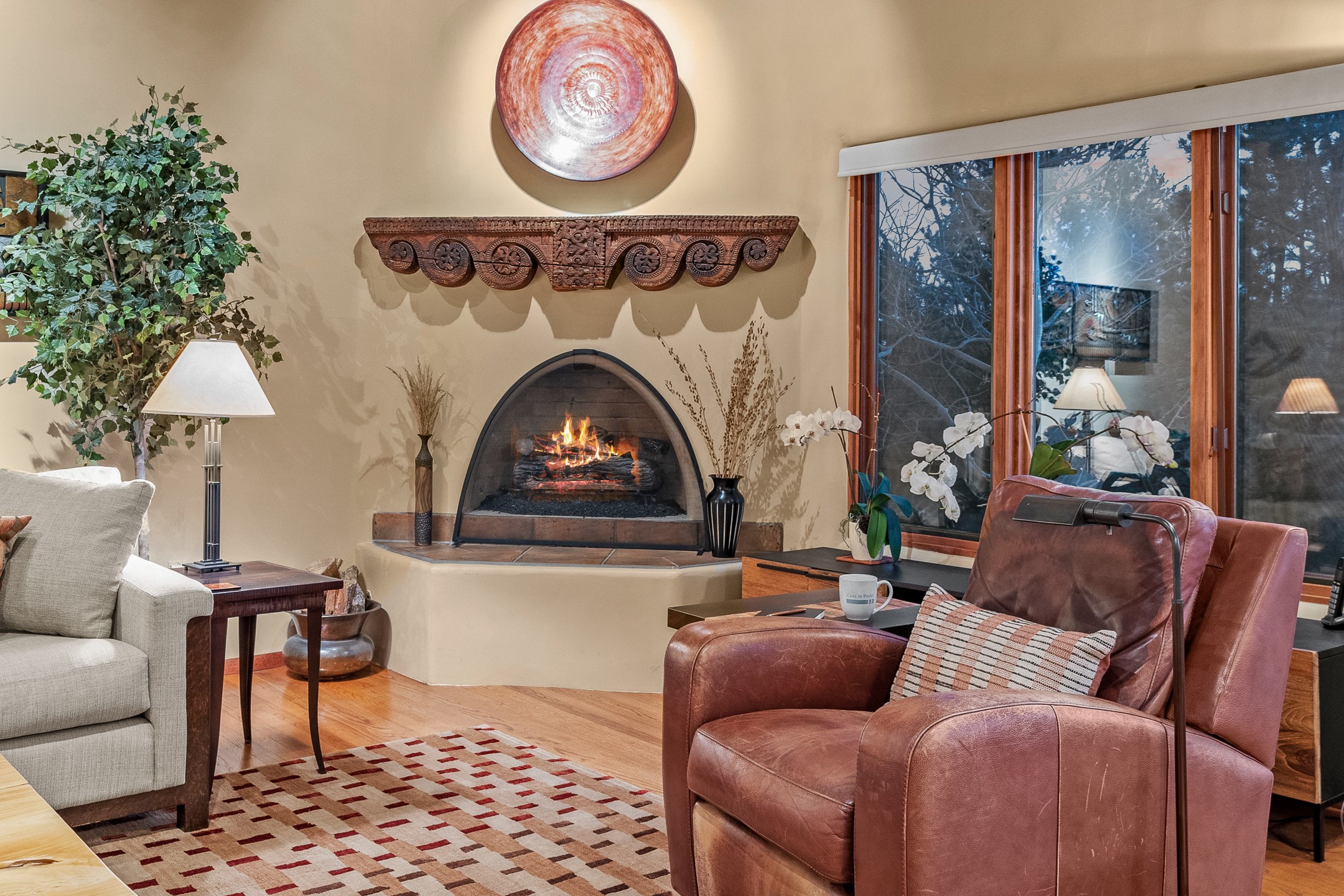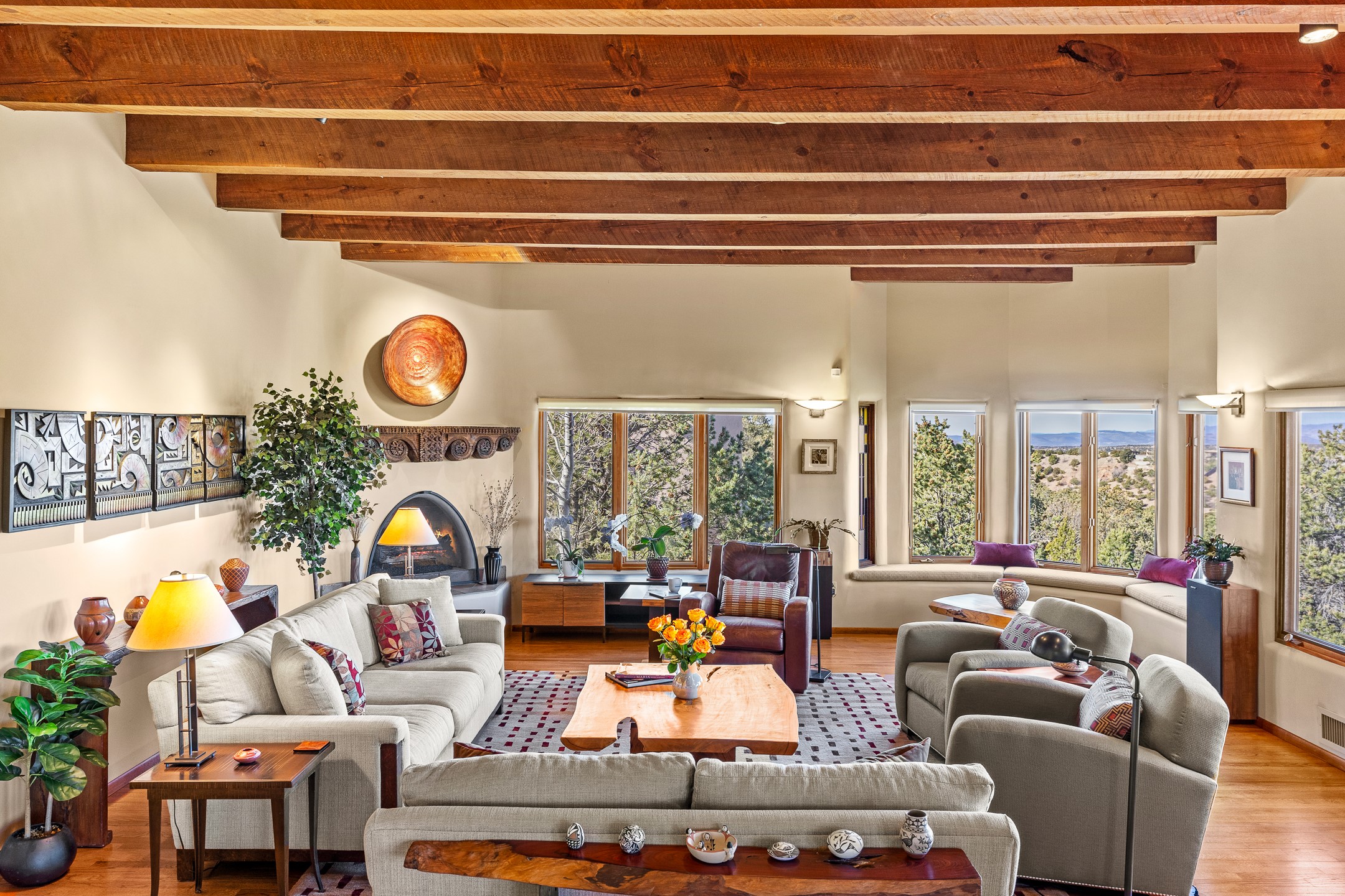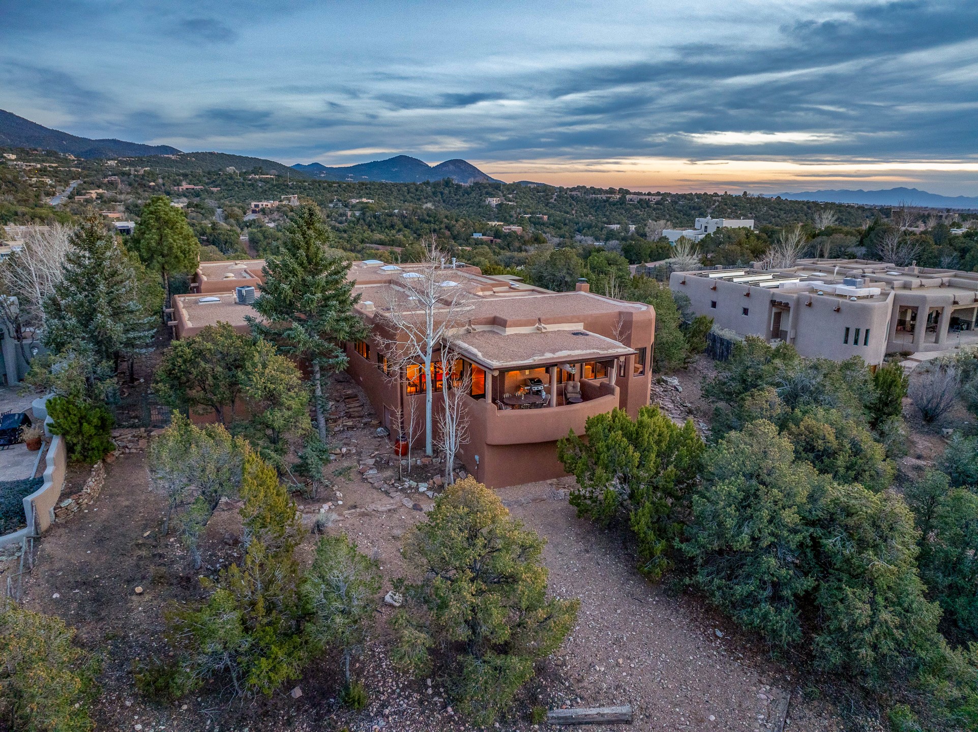 A view-filled Southwestern home on 1.2 acres in the desirable Northeast city limits and just minutes from The Plaza! This warm, single level residence offers four bedrooms, five bathrooms and is a view-filled downtown retreat. Upon arrival, an inviting entry arch, with a traditional bell, ushers you into a world of Southwestern sophistication. The foyer, adorned with high ceilings and wonderful natural light, sets the tone for a home that artfully blends timeless design with modern amenities. The heart of the home is an open-concept living/dining area that is enveloped by the panoramic views of the Jemez mountains. The formal living room features a beautiful gas fireplace and a charming banco designed for sunset views. The adjacent formal dining area seamlessly extends to a west-facing patio, perfect for dining under the Santa Fe skies. The kitchen boasts custom cherry cabinets, an eat-in island, and a cozy breakfast nook for casual family meals. A den provides additional space for a home office or flex room to suit your lifestyle needs. The thoughtfully designed layout includes two expansive bedroom suites--one of which is situated off a private hallway, offering a serene guest casita experience. The main bedroom hallway, with high ceilings and skylights, leads to the primary suite. This private retreat features dual walk-in closets, double vanities, a walk-in shower, and an indulgent soaking tub, creating a spa-like sanctuary. An additional guest bedroom, currently used as an office, includes an ensuite bathroom, while a third room--originally intended as a studio with a water stub-out--offers limitless potential as a creative space or guest room. The surprise of this property is the indoor aquatics room with a heated resistance pool, jacuzzi, sauna, and three-quarter bath. Lovingly maintained, 972 Indian Ridge Rd combines unparalleled views, a wonderful floor plan, and an unbeatable location--perfect for those seeking the ultimate Santa Fe luxury lifestyle.