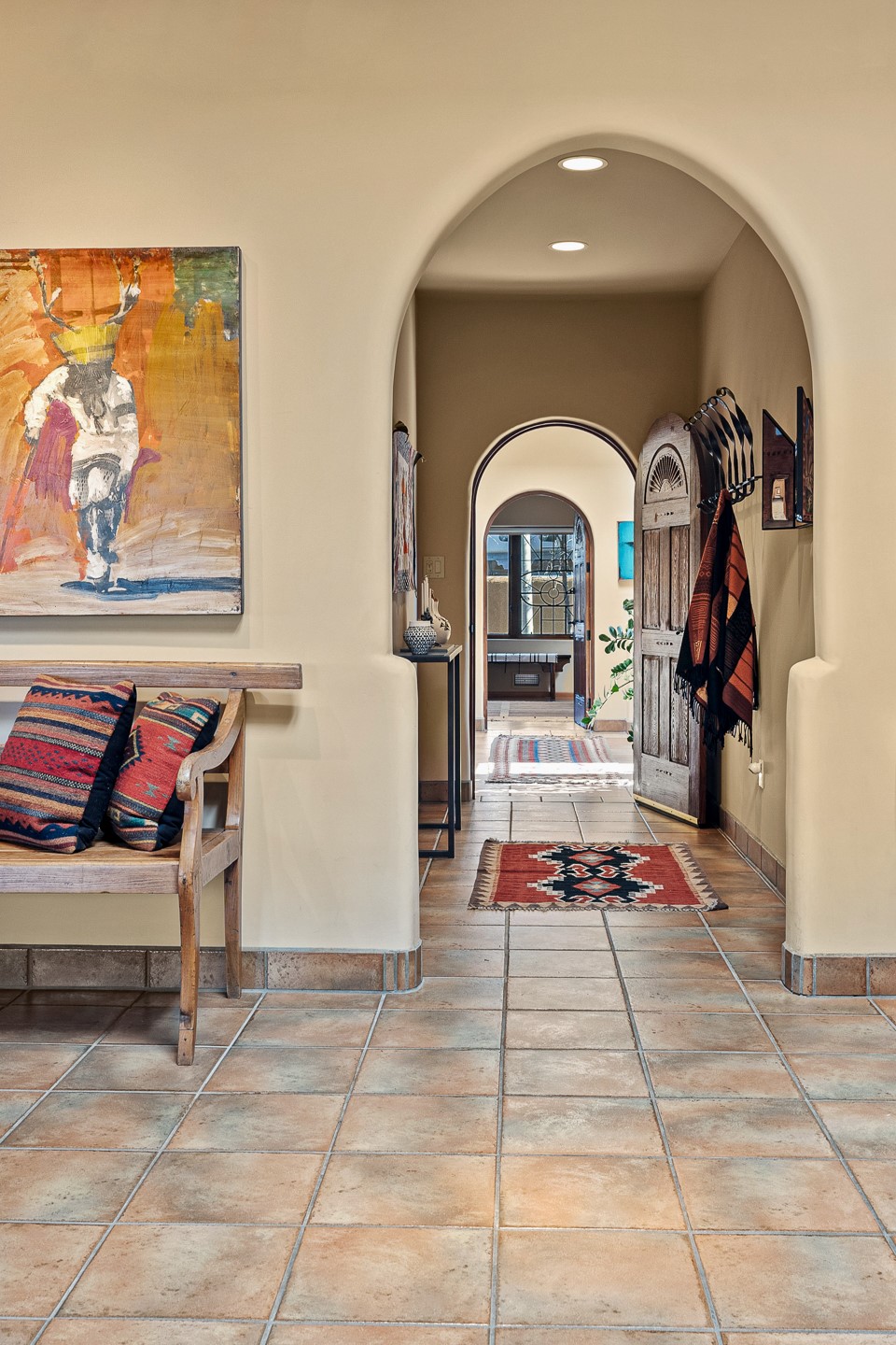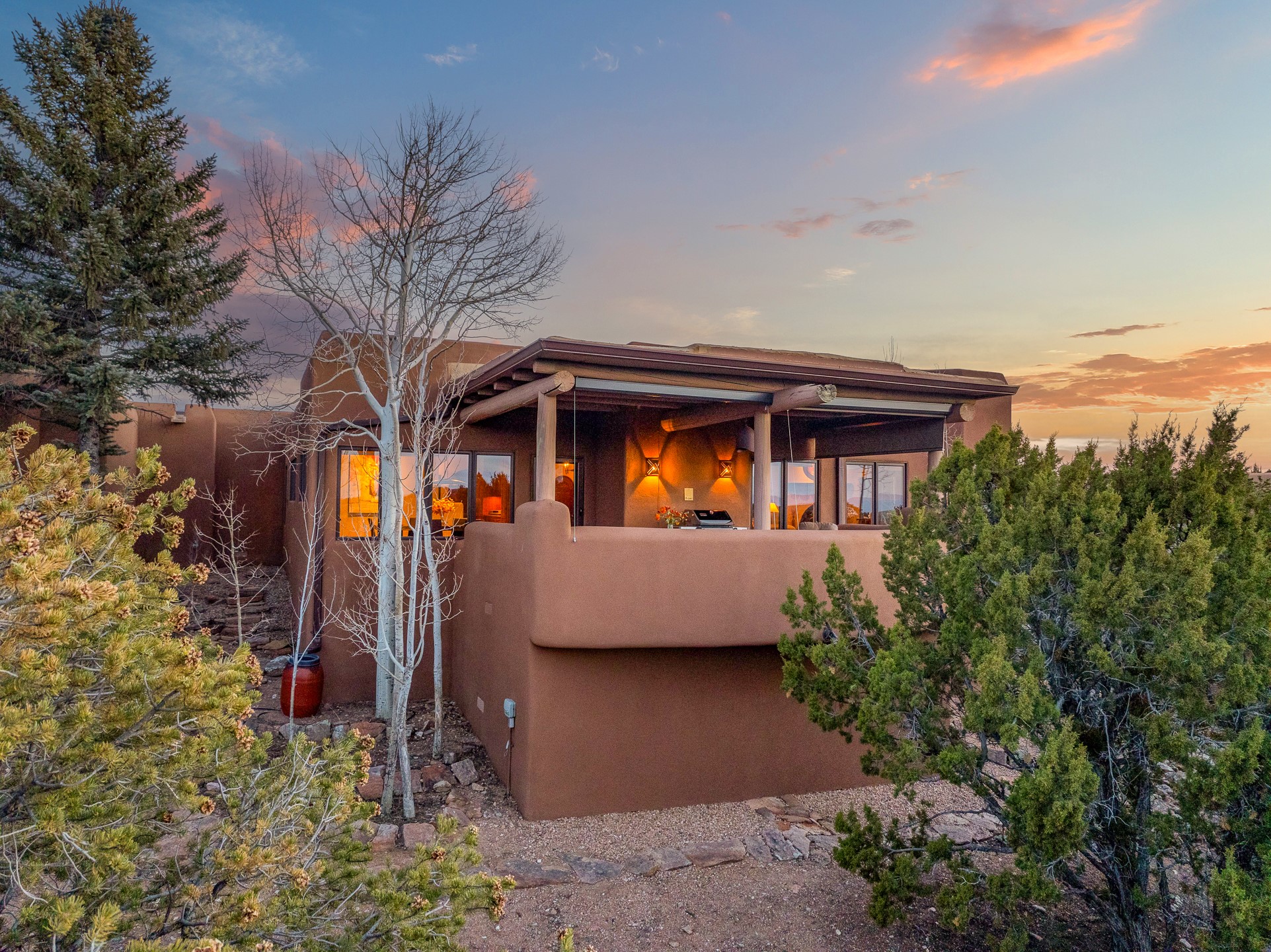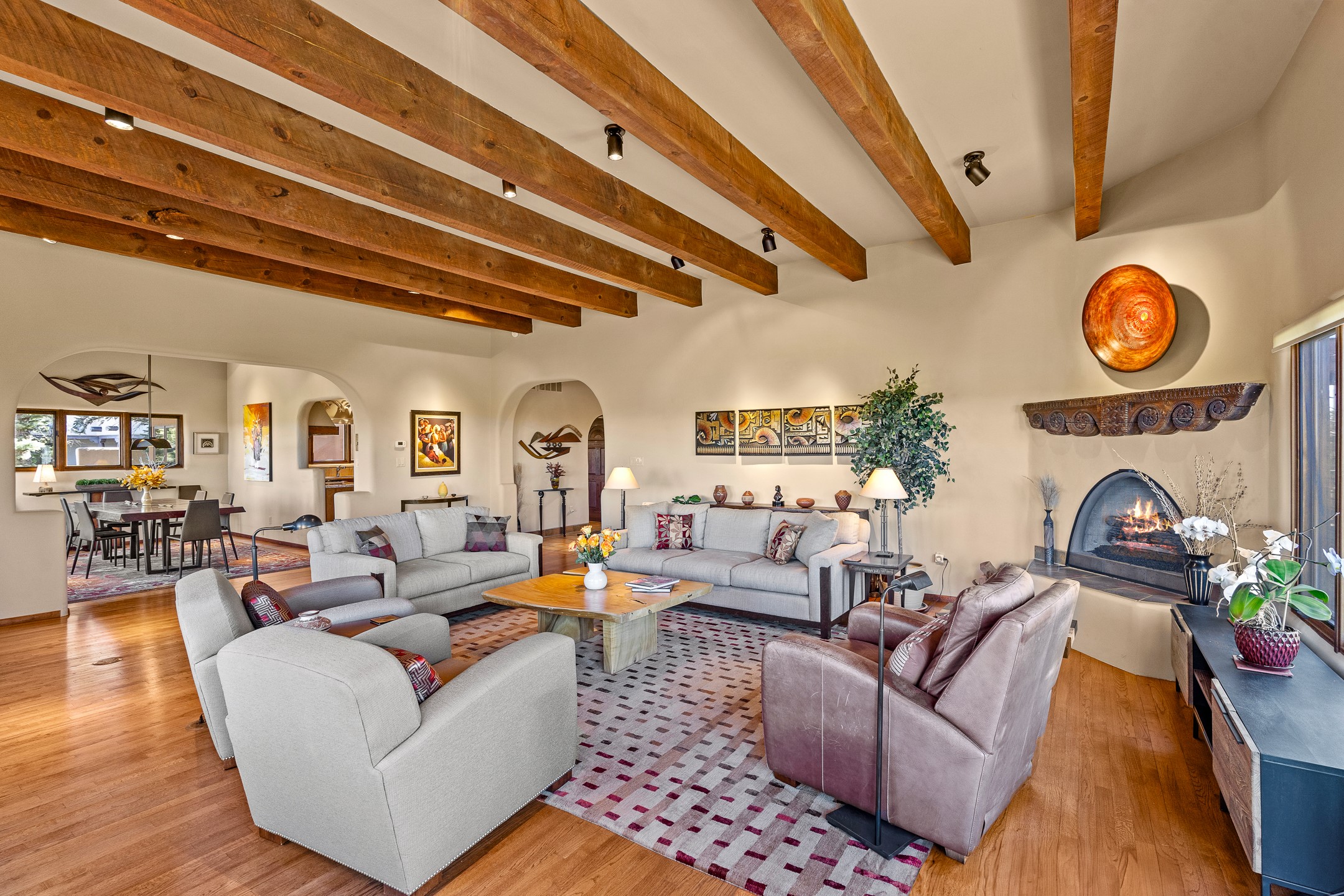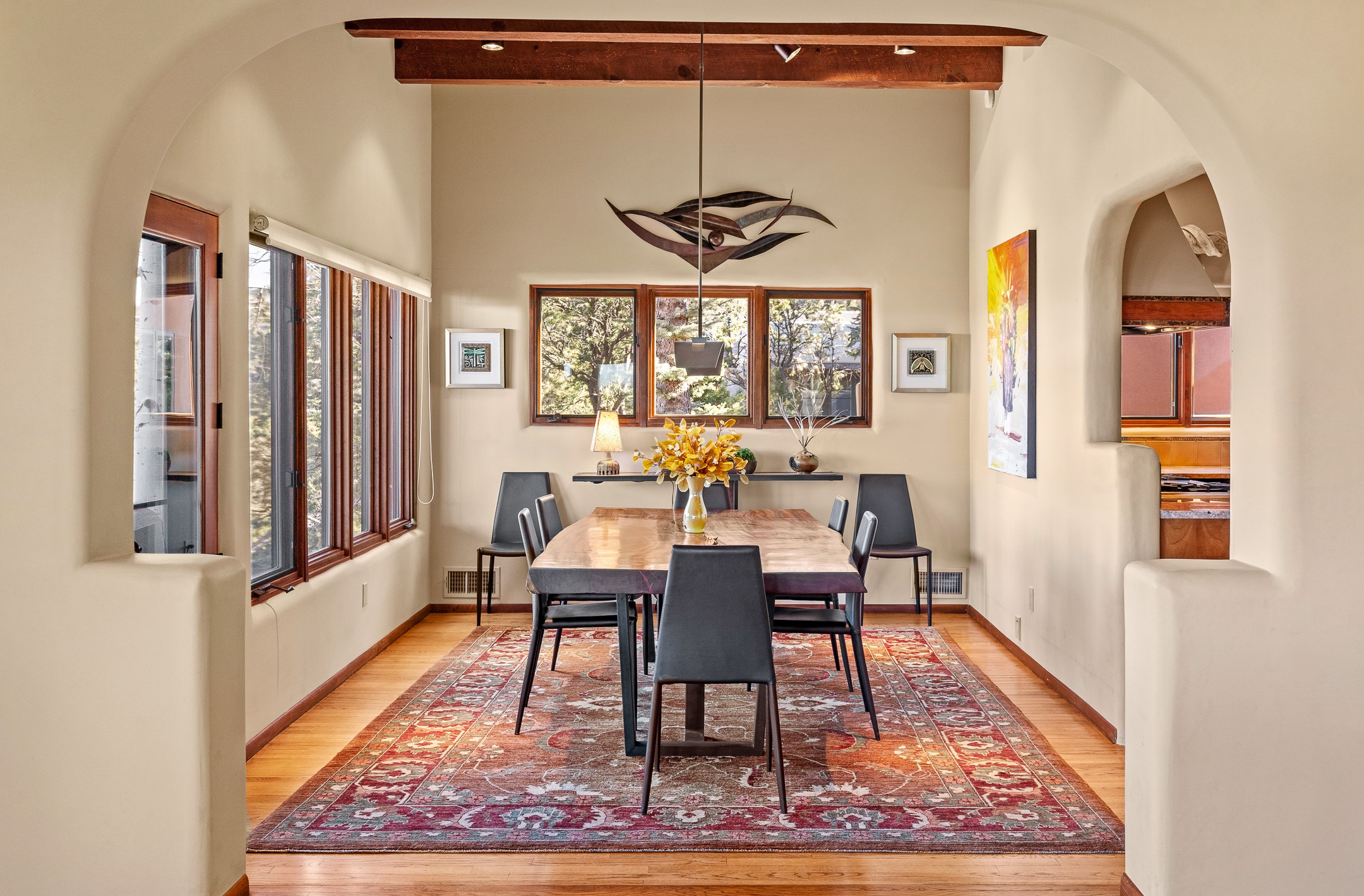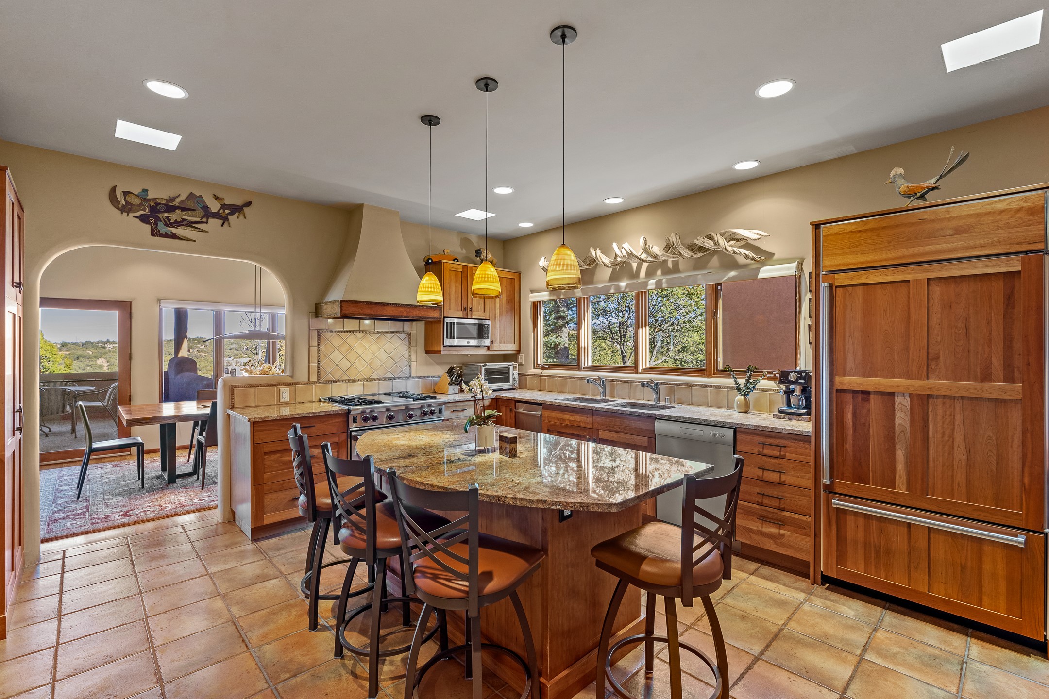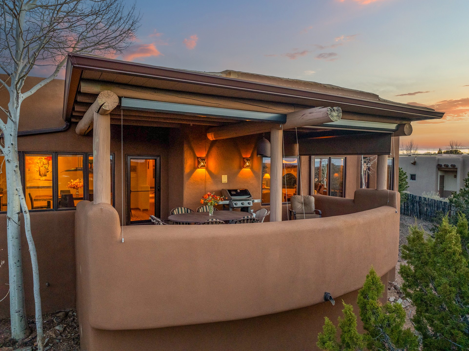 A view-filled Southwestern home on 1.2 acres in the desirable Northeast city limits and just minutes from The Plaza! This warm, single level residence offers four bedrooms, five bathrooms and is a view-filled downtown retreat. Upon arrival, an inviting entry arch, with a traditional bell, ushers you into a world of Southwestern sophistication. The foyer, adorned with high ceilings and wonderful natural light, sets the tone for a home that artfully blends timeless design with modern amenities. The heart of the home is an open-concept living/dining area that is enveloped by the panoramic views of the Jemez mountains. The formal living room features a beautiful gas fireplace and a charming banco designed for sunset views. The adjacent formal dining area seamlessly extends to a west-facing patio, perfect for dining under the Santa Fe skies. The kitchen boasts custom cherry cabinets, an eat-in island, and a cozy breakfast nook for casual family meals. A den provides additional space for a home office or flex room to suit your lifestyle needs. The thoughtfully designed layout includes two expansive bedroom suites--one of which is situated off a private hallway, offering a serene guest casita experience. The main bedroom hallway, with high ceilings and skylights, leads to the primary suite. This private retreat features dual walk-in closets, double vanities, a walk-in shower, and an indulgent soaking tub, creating a spa-like sanctuary. An additional guest bedroom, currently used as an office, includes an ensuite bathroom, while a third room--originally intended as a studio with a water stub-out--offers limitless potential as a creative space or guest room. The surprise of this property is the indoor aquatics room with a heated resistance pool, jacuzzi, sauna, and three-quarter bath. Lovingly maintained, 972 Indian Ridge Rd combines unparalleled views, a wonderful floor plan, and an unbeatable location--perfect for those seeking the ultimate Santa Fe luxury lifestyle.
