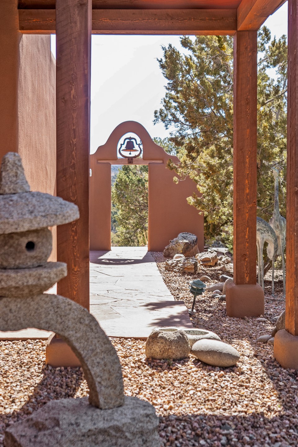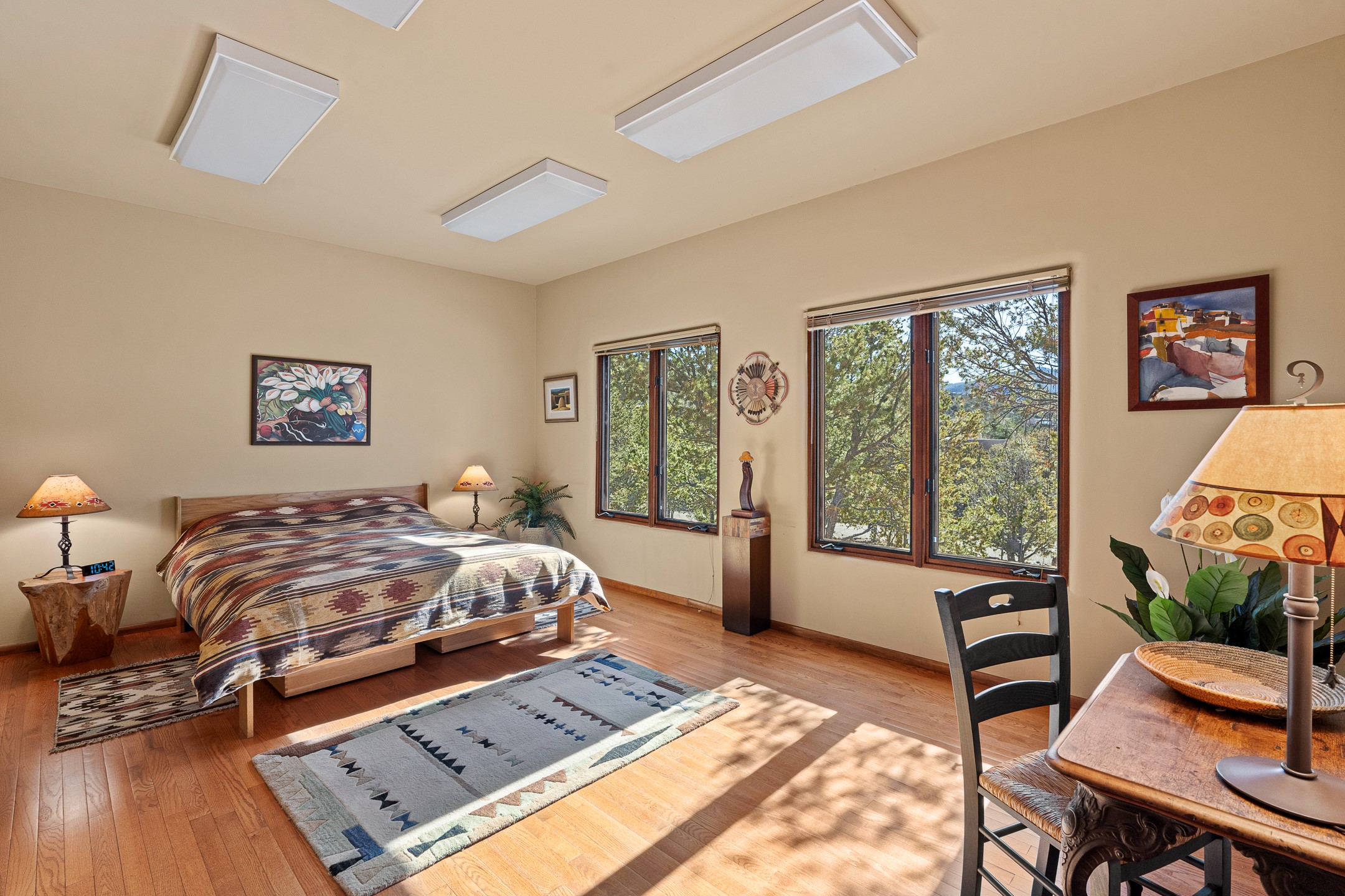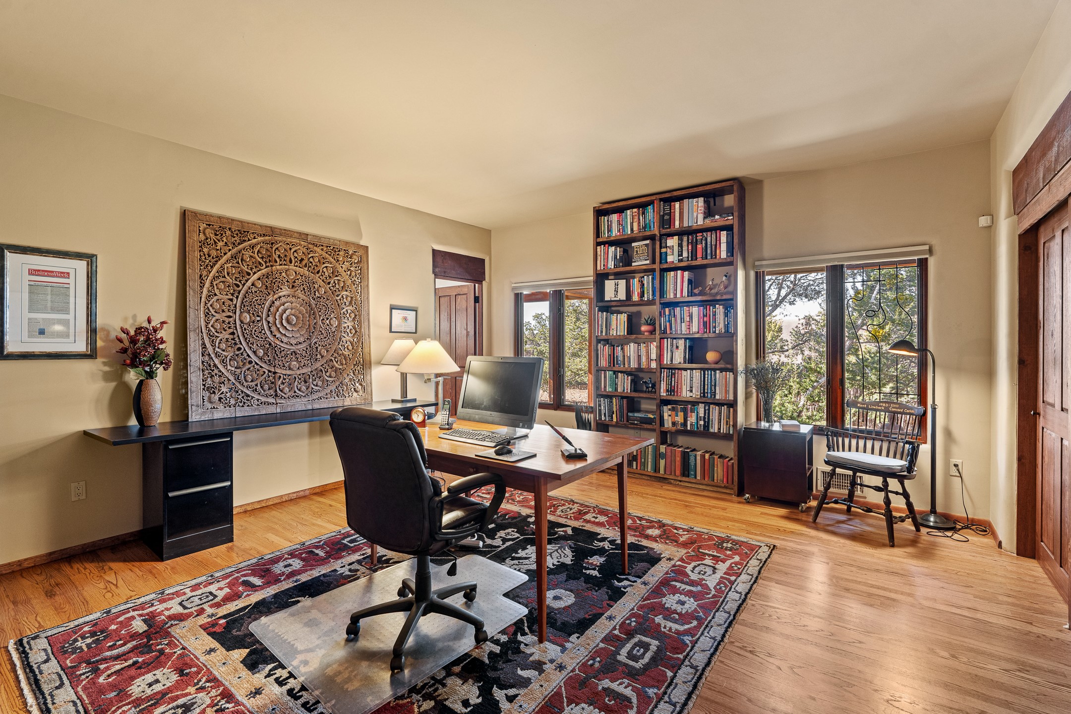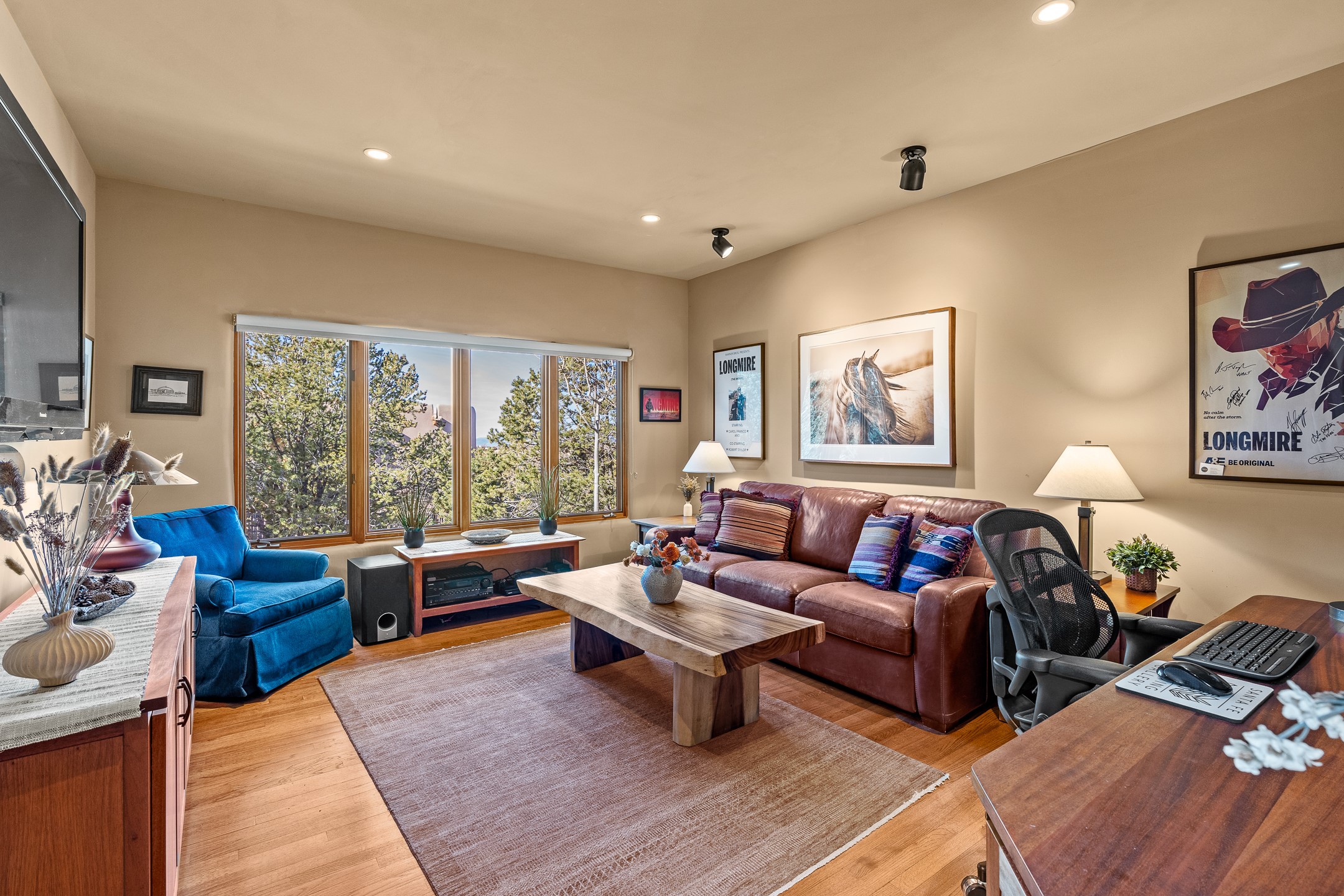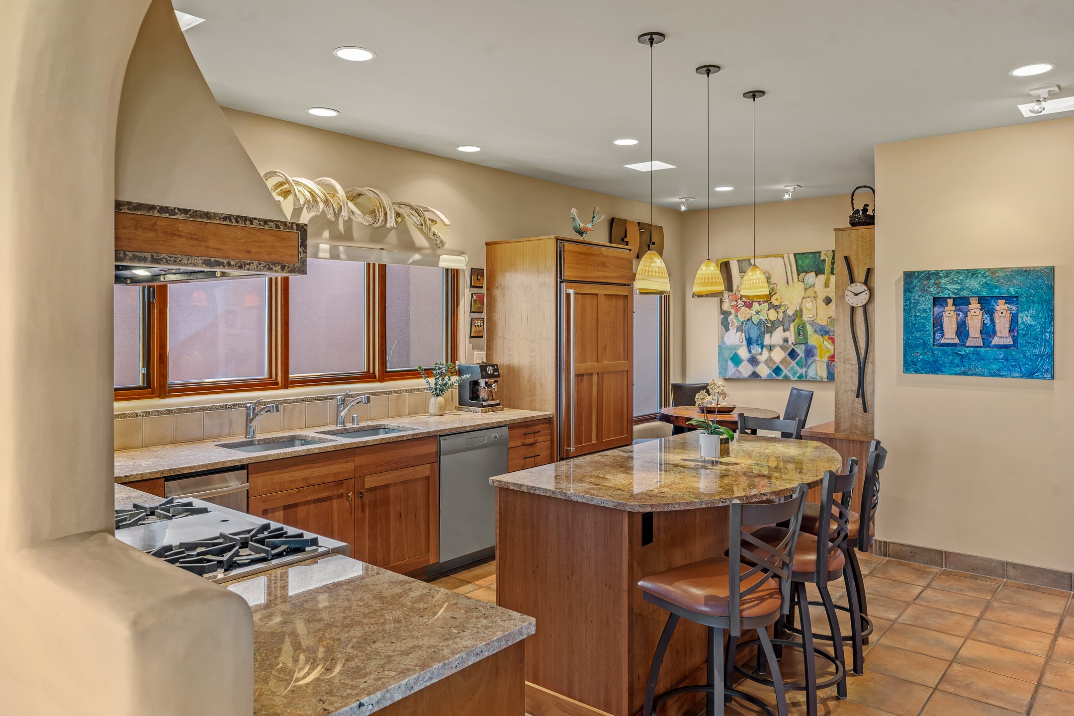 A view-filled Southwestern home on 1.2 acres in the desirable Northeast city limits and just minutes from The Plaza! This warm, single level residence offers four bedrooms, five bathrooms and is a view-filled downtown retreat. Upon arrival, an inviting entry arch, with a traditional bell, ushers you into a world of Southwestern sophistication. The foyer, adorned with high ceilings and wonderful natural light, sets the tone for a home that artfully blends timeless design with modern amenities. The heart of the home is an open-concept living/dining area that is enveloped by the panoramic views of the Jemez mountains. The formal living room features a beautiful gas fireplace and a charming banco designed for sunset views. The adjacent formal dining area seamlessly extends to a west-facing patio, perfect for dining under the Santa Fe skies. The kitchen boasts custom cherry cabinets, an eat-in island, and a cozy breakfast nook for casual family meals. A den provides additional space for a home office or flex room to suit your lifestyle needs. The thoughtfully designed layout includes two expansive bedroom suites--one of which is situated off a private hallway, offering a serene guest casita experience. The main bedroom hallway, with high ceilings and skylights, leads to the primary suite. This private retreat features dual walk-in closets, double vanities, a walk-in shower, and an indulgent soaking tub, creating a spa-like sanctuary. An additional guest bedroom, currently used as an office, includes an ensuite bathroom, while a third room--originally intended as a studio with a water stub-out--offers limitless potential as a creative space or guest room. The surprise of this property is the indoor aquatics room with a heated resistance pool, jacuzzi, sauna, and three-quarter bath. Lovingly maintained, 972 Indian Ridge Rd combines unparalleled views, a wonderful floor plan, and an unbeatable location--perfect for those seeking the ultimate Santa Fe luxury lifestyle.