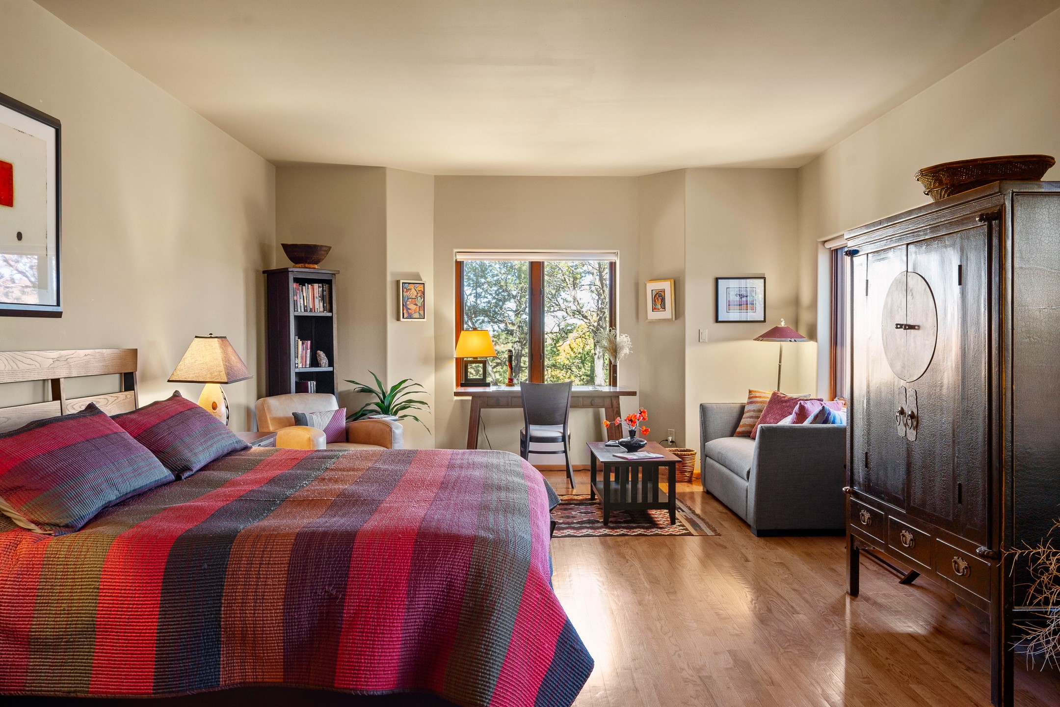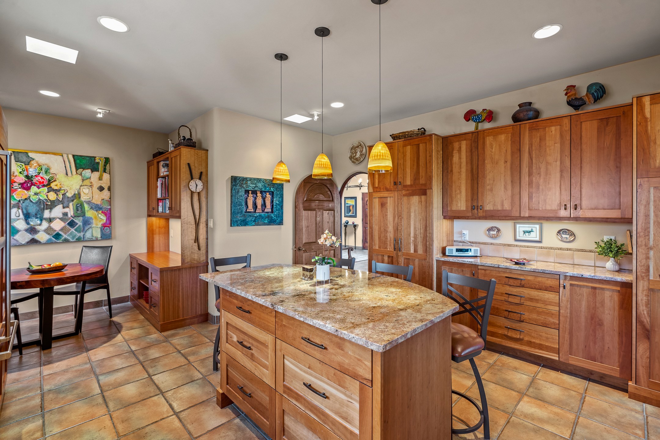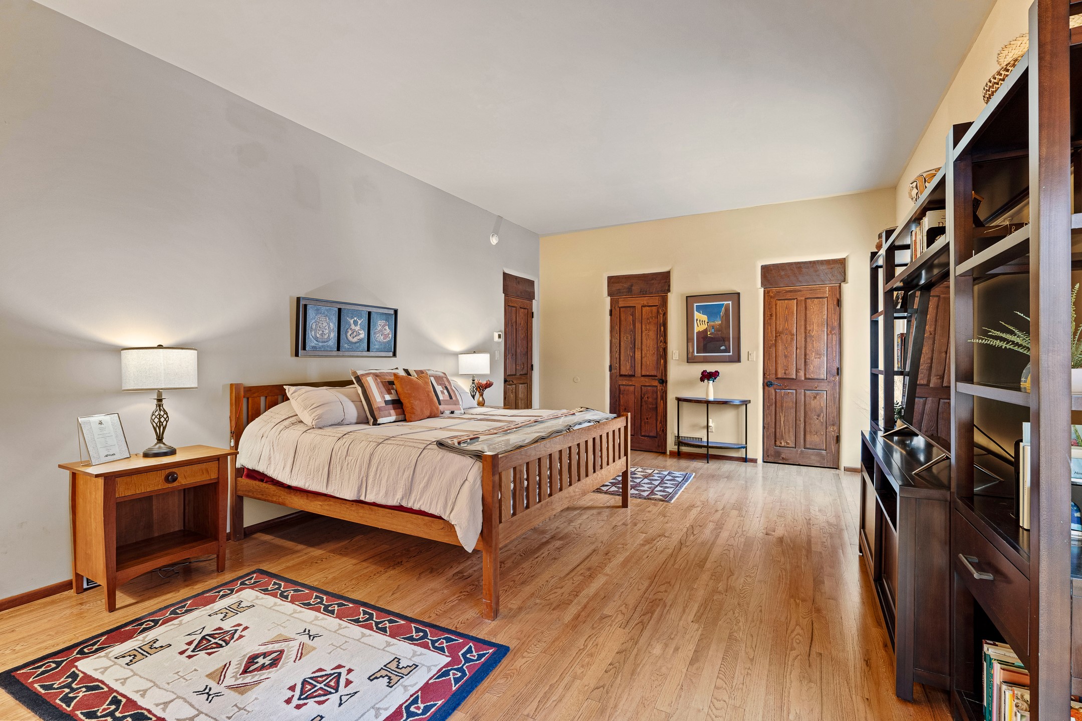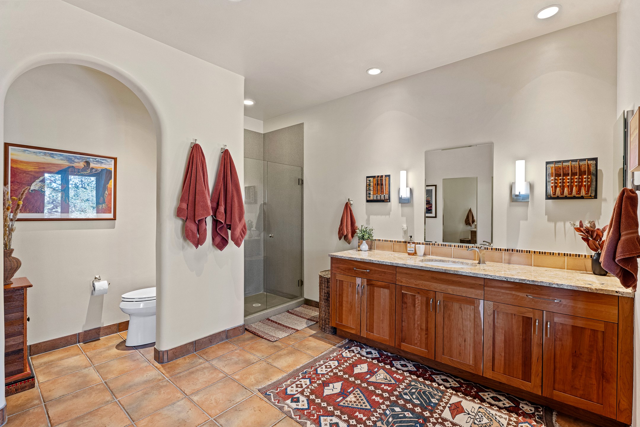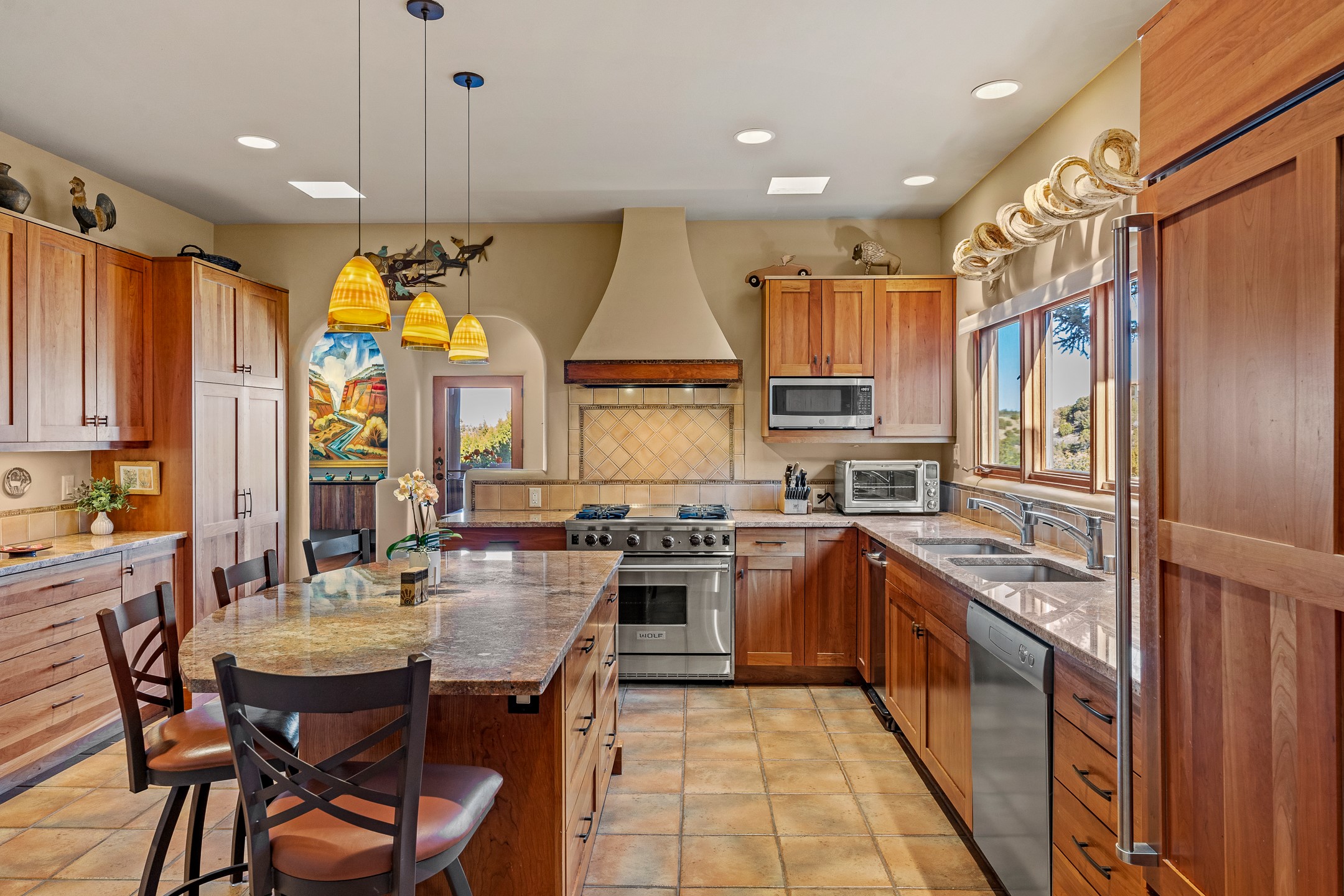A view-filled Southwestern home on 1.2 acres in the desirable Northeast city limits and just minutes from The Plaza! This warm, single level residence offers four bedrooms, five bathrooms and is a view-filled downtown retreat. Upon arrival, an inviting entry arch, with a traditional bell, ushers you into a world of Southwestern sophistication. The foyer, adorned with high ceilings and wonderful natural light, sets the tone for a home that artfully blends timeless design with modern amenities. The heart of the home is an open-concept living/dining area that is enveloped by the panoramic views of the Jemez mountains. The formal living room features a beautiful gas fireplace and a charming banco designed for sunset views. The adjacent formal dining area seamlessly extends to a west-facing patio, perfect for dining under the Santa Fe skies. The kitchen boasts custom cherry cabinets, an eat-in island, and a cozy breakfast nook for casual family meals. A den provides additional space for a home office or flex room to suit your lifestyle needs. The thoughtfully designed layout includes two expansive bedroom suites--one of which is situated off a private hallway, offering a serene guest casita experience. The main bedroom hallway, with high ceilings and skylights, leads to the primary suite. This private retreat features dual walk-in closets, double vanities, a walk-in shower, and an indulgent soaking tub, creating a spa-like sanctuary. An additional guest bedroom, currently used as an office, includes an ensuite bathroom, while a third room--originally intended as a studio with a water stub-out--offers limitless potential as a creative space or guest room. The surprise of this property is the indoor aquatics room with a heated resistance pool, jacuzzi, sauna, and three-quarter bath. Lovingly maintained, 972 Indian Ridge Rd combines unparalleled views, a wonderful floor plan, and an unbeatable location--perfect for those seeking the ultimate Santa Fe luxury lifestyle.