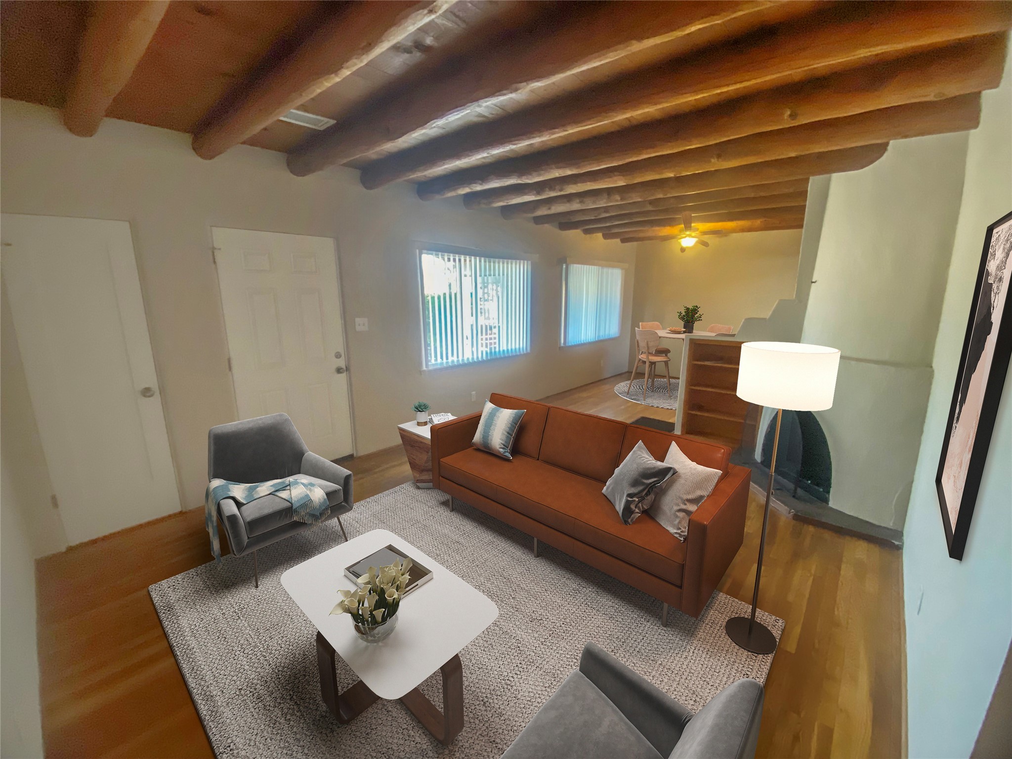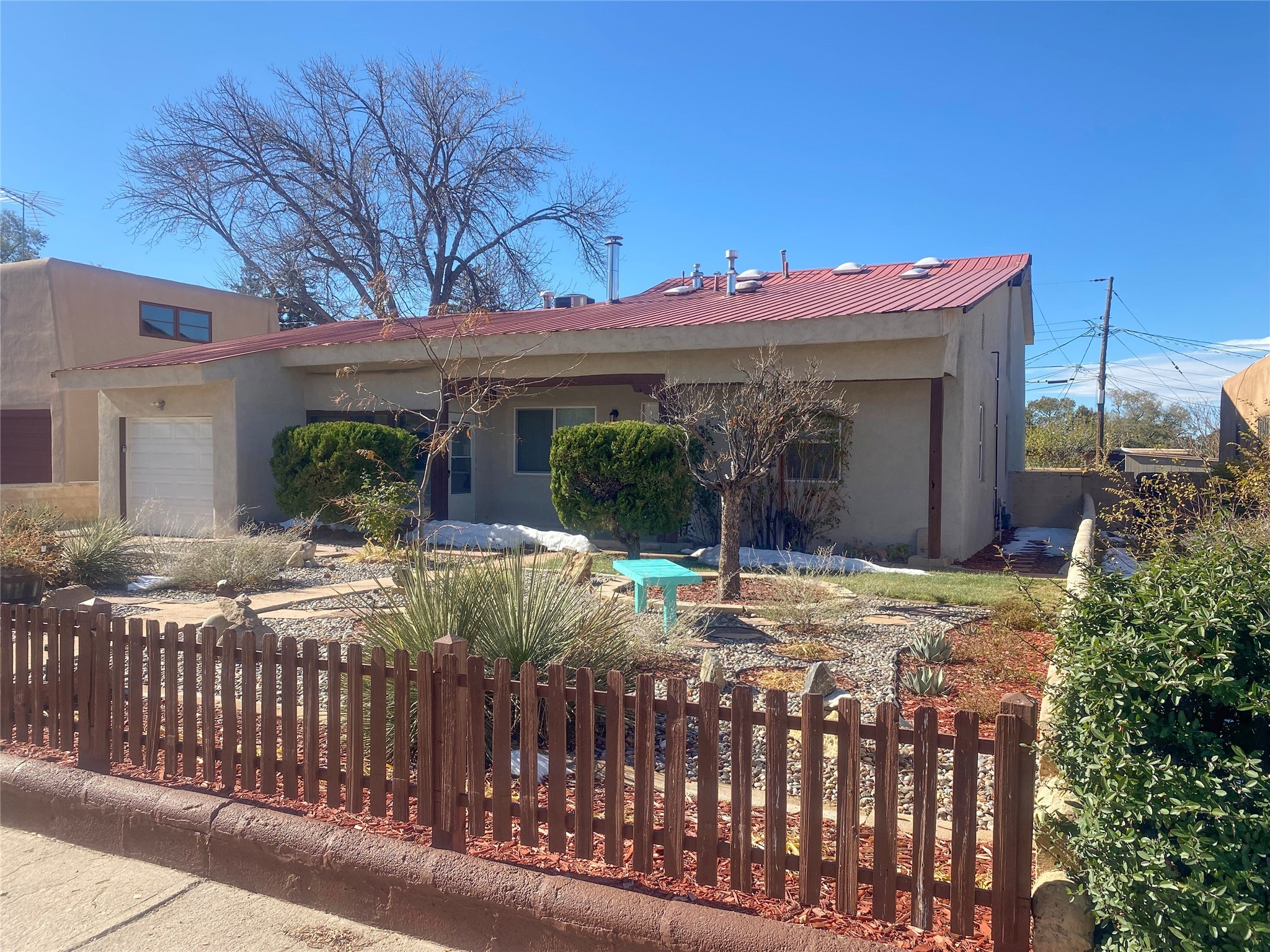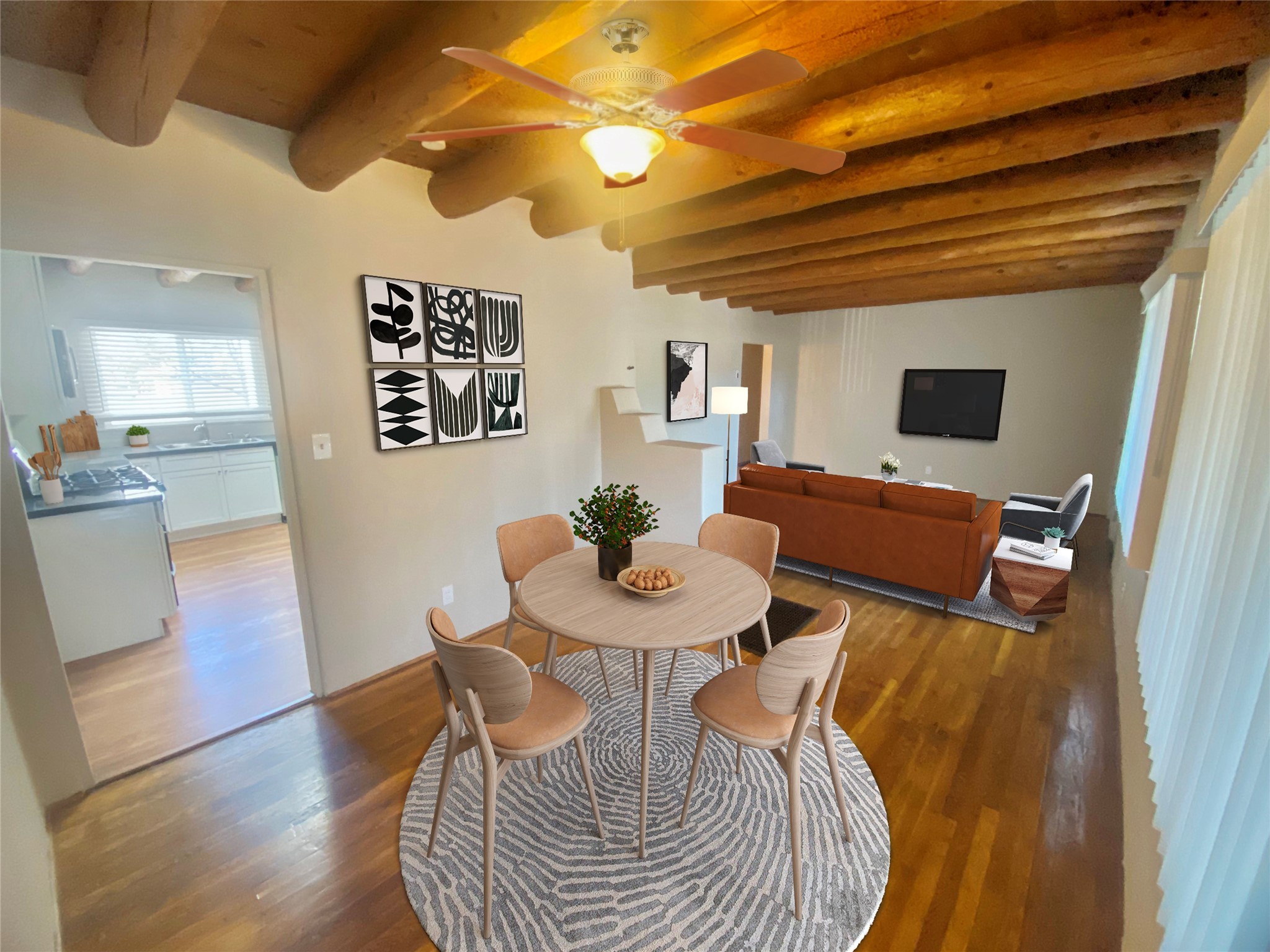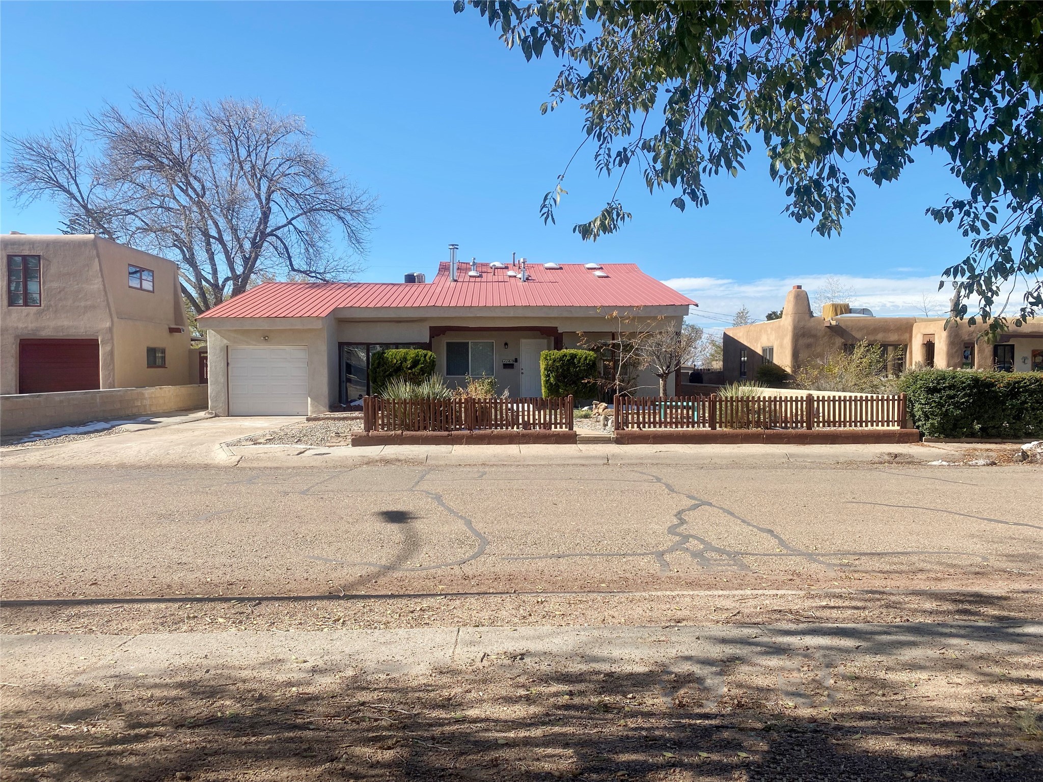 This charming 1.5-story Santa Fe-style home, located in the sought-after Casa Linda Subdivision, offers a blend of classic design and modern comfort. Built in 1949, this 1,958 square-foot residence features 3 spacious bedrooms and 2 bathrooms, making it ideal for families or those seeking extra space. The home's unique character is highlighted by wood vigas, which add rustic appeal, while hardwood floors and Saltillo tile in select areas create a warm, inviting atmosphere throughout the living spaces. The attached garage provides convenience, and the home's well-preserved details reflect its rich architectural history.