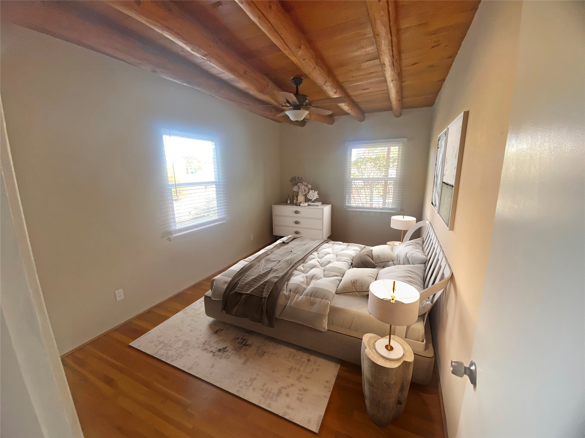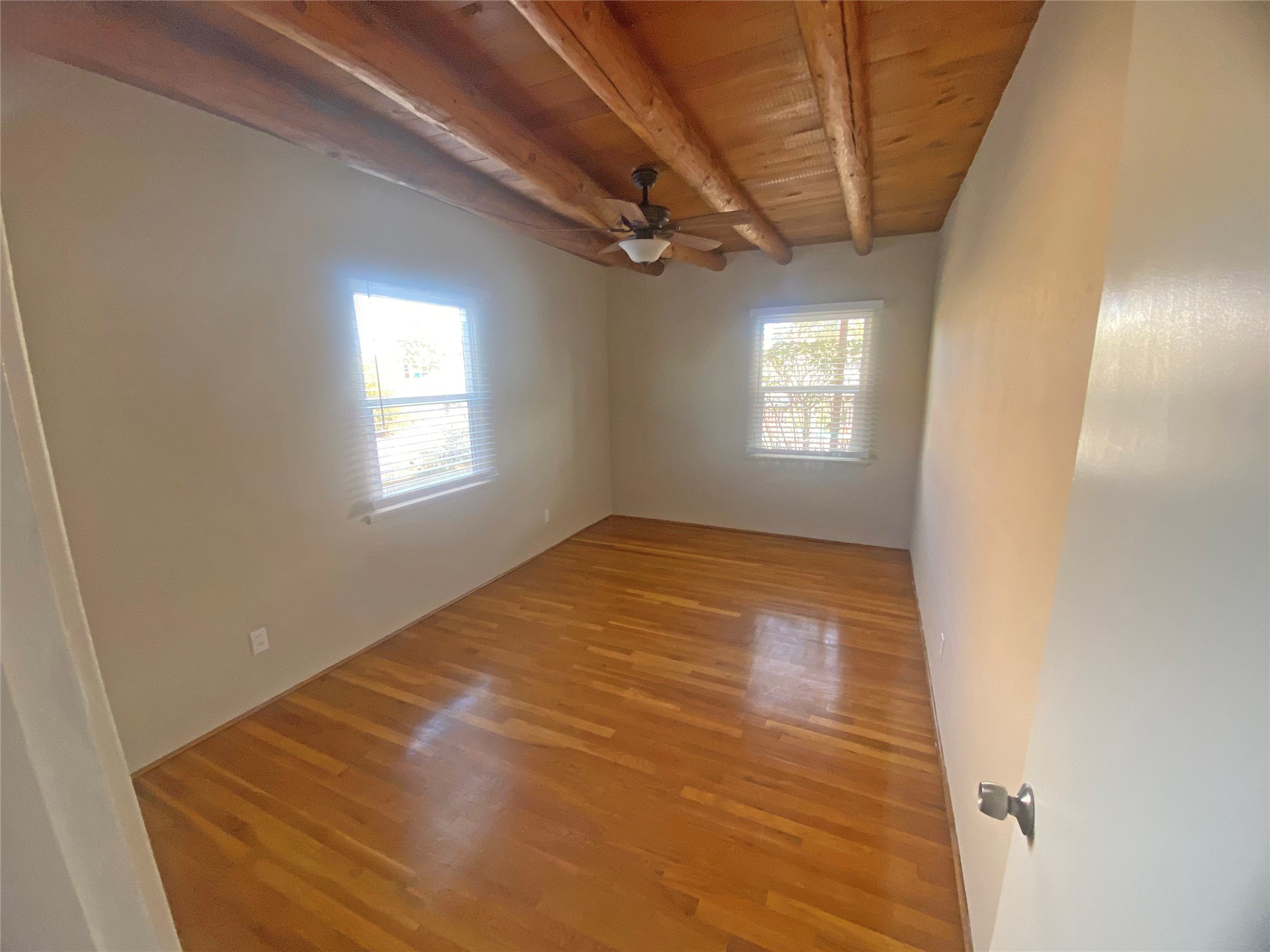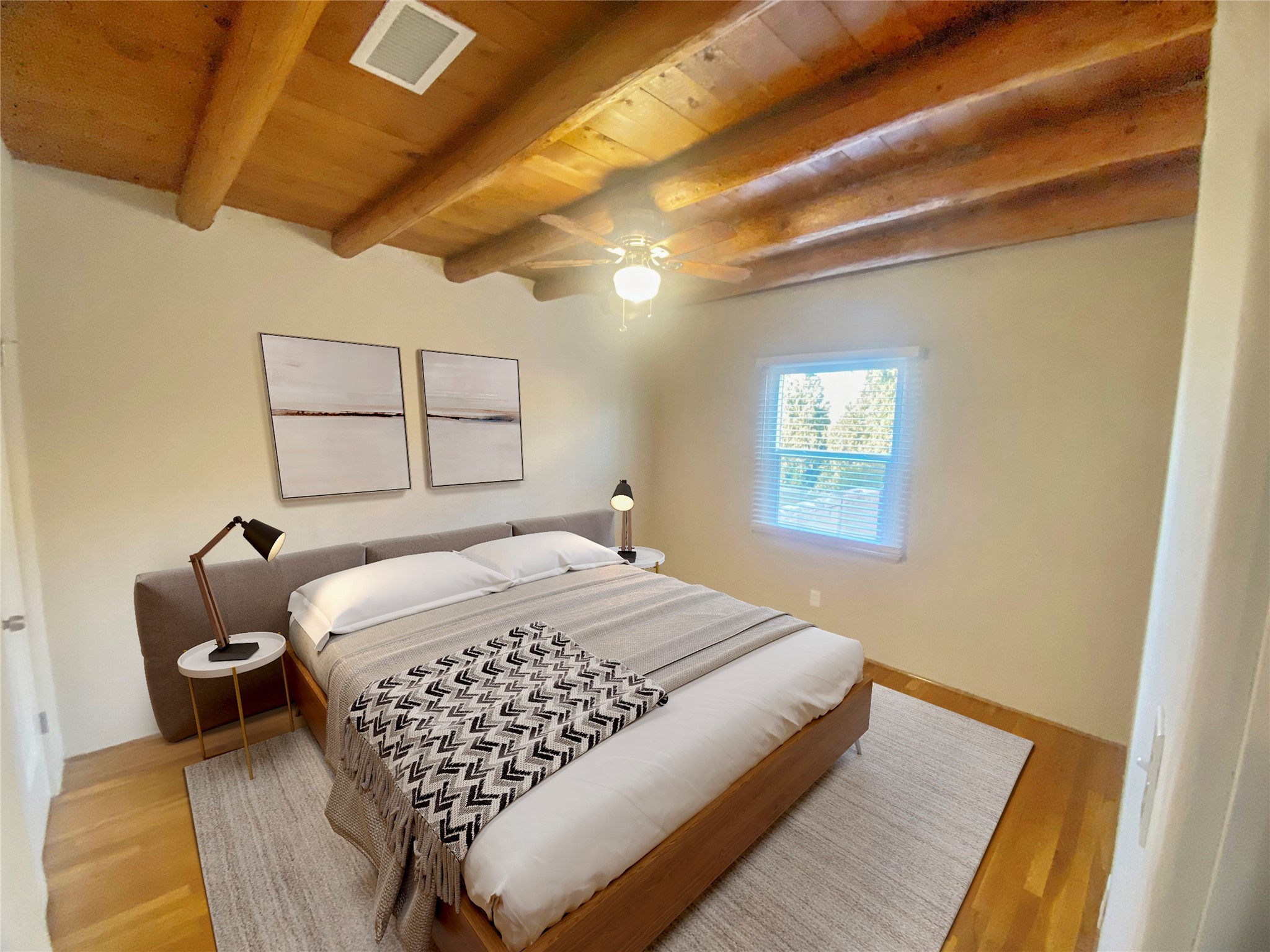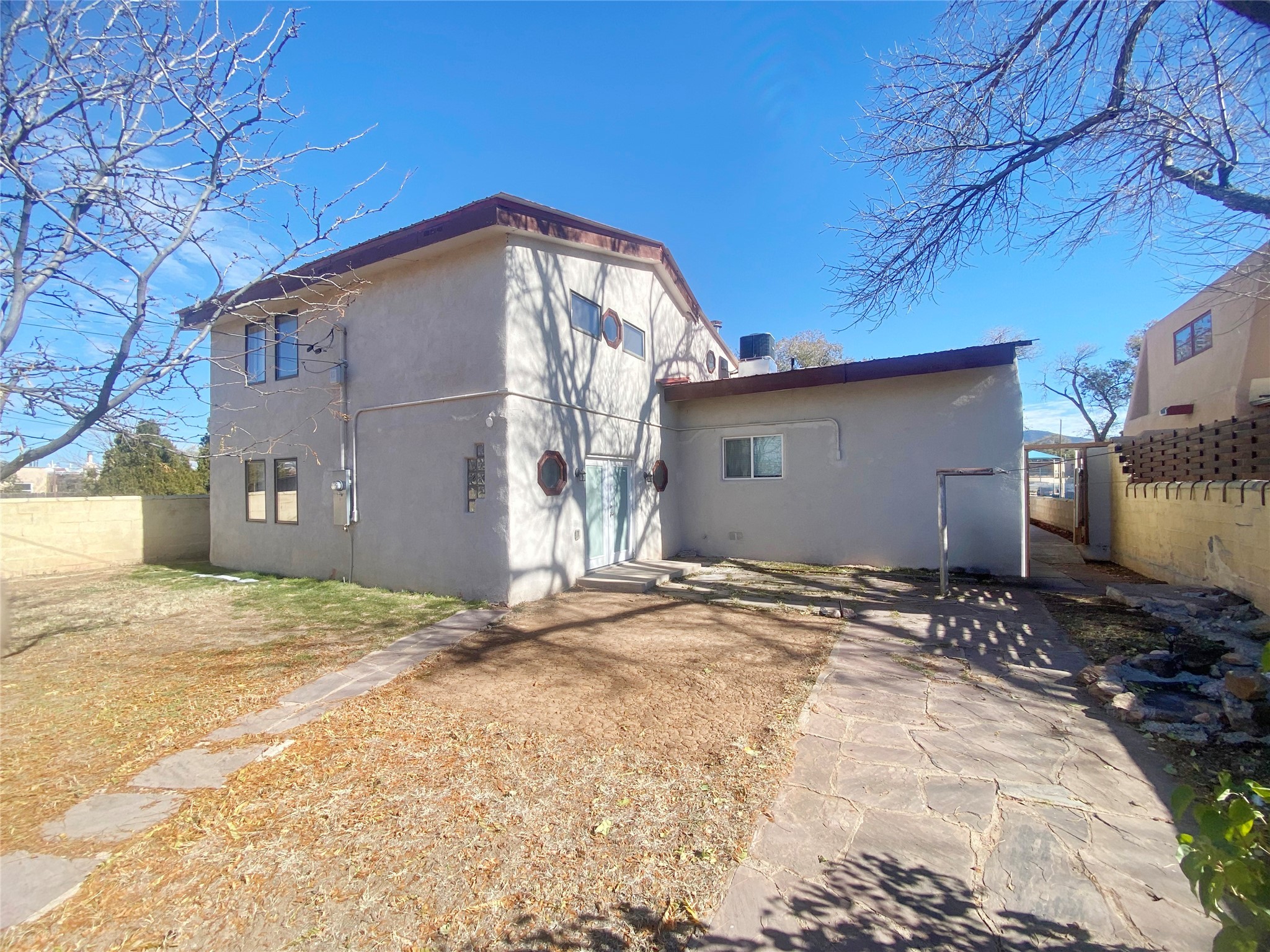 This charming 1.5-story Santa Fe-style home, located in the sought-after Casa Linda Subdivision, offers a blend of classic design and modern comfort. Built in 1949, this 1,958 square-foot residence features 3 spacious bedrooms and 2 bathrooms, making it ideal for families or those seeking extra space. The home's unique character is highlighted by wood vigas, which add rustic appeal, while hardwood floors and Saltillo tile in select areas create a warm, inviting atmosphere throughout the living spaces. The attached garage provides convenience, and the home's well-preserved details reflect its rich architectural history.