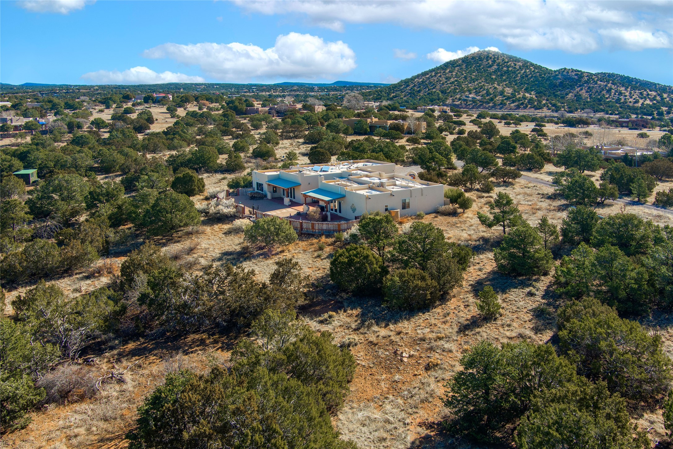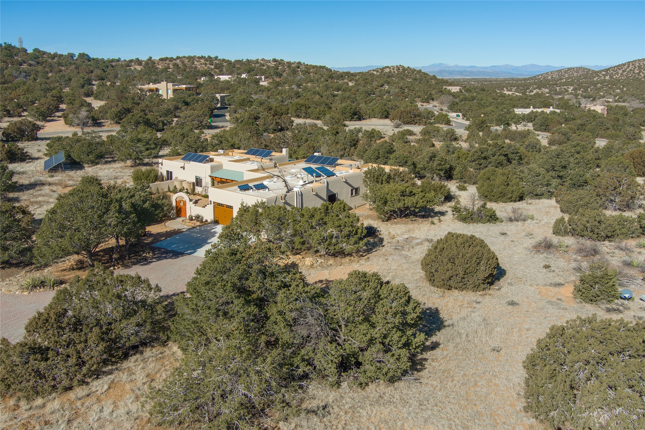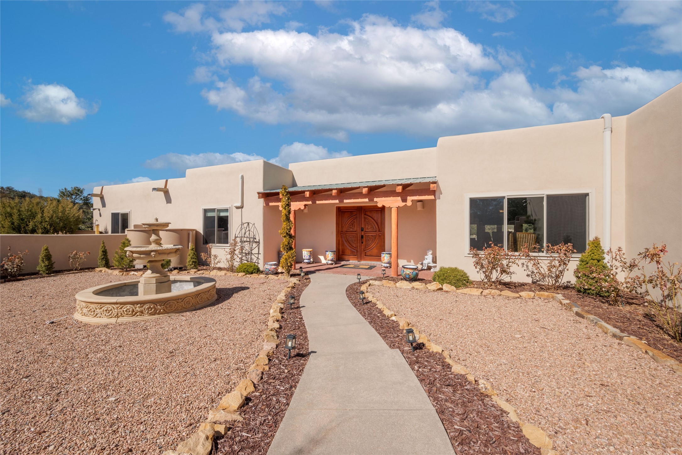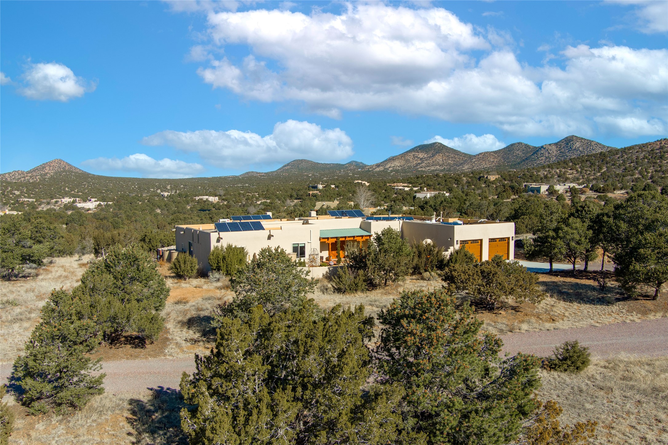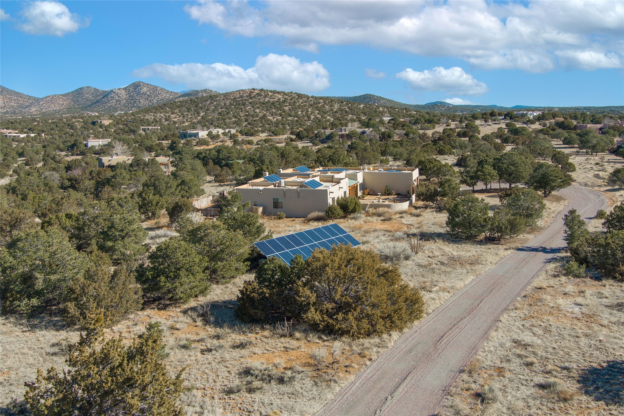 Relaxed southwest elegance in a parklike setting best describes this Dos Griegos home. The hacienda-style floor plan with spacious light-filled living areas is ideal for entertaining or quiet repose. Enclosed courtyards both front and rear offer unrivaled exterior living spaces to enjoy mountain views, starry nights and dramatic New Mexico skies from the private 3+ acre property. Traditional kiva-style fireplaces adorn the living room and primary suite. A spacious and light-filled bonus room with wet-bar and min-frig is ideal for a den, office, studio or media room. The kitchen is a dream featuring expansive granite counters, abundant solid wood cabinetry and top-quality appliances including a Bertazzoni gas range from Italia. The home has been extensively updated both inside and out, from new stucco, windows, landscaping, entry and patio doors to gorgeous bathroom restyling, hardware and fixture upgrades, appliances, and on and on. A complete summary of improvements is available. The home also includes a photovoltaic solar power system providing most if not all of the home's electrical needs. Dos Griegos is located only about 15 minutes from the vibrant and historic City of Santa Fe. Nearby shopping, dining and recreation options are within minutes of the property. This is a special home on a wonderful parcel in a coveted location, the triple crown!