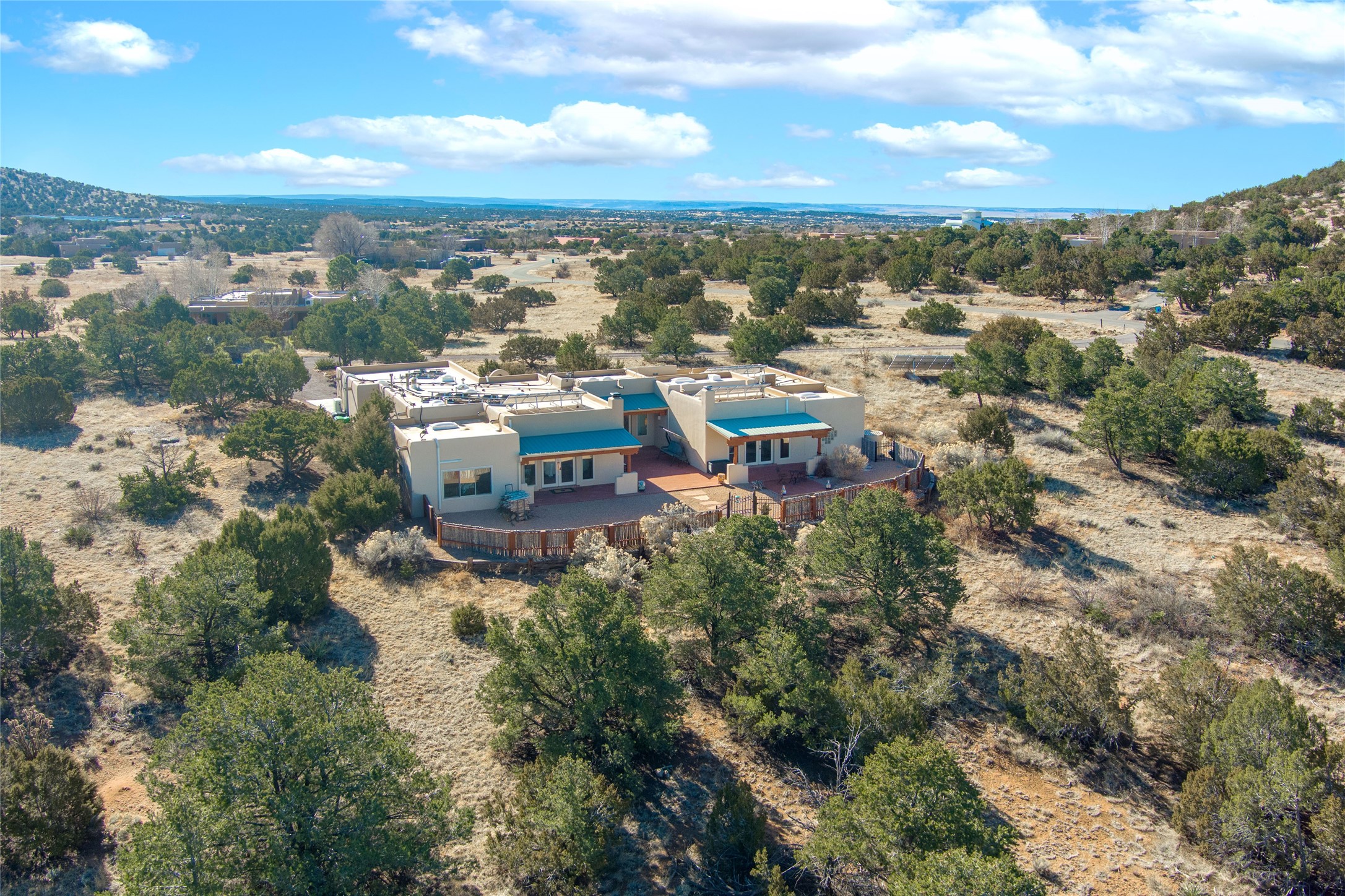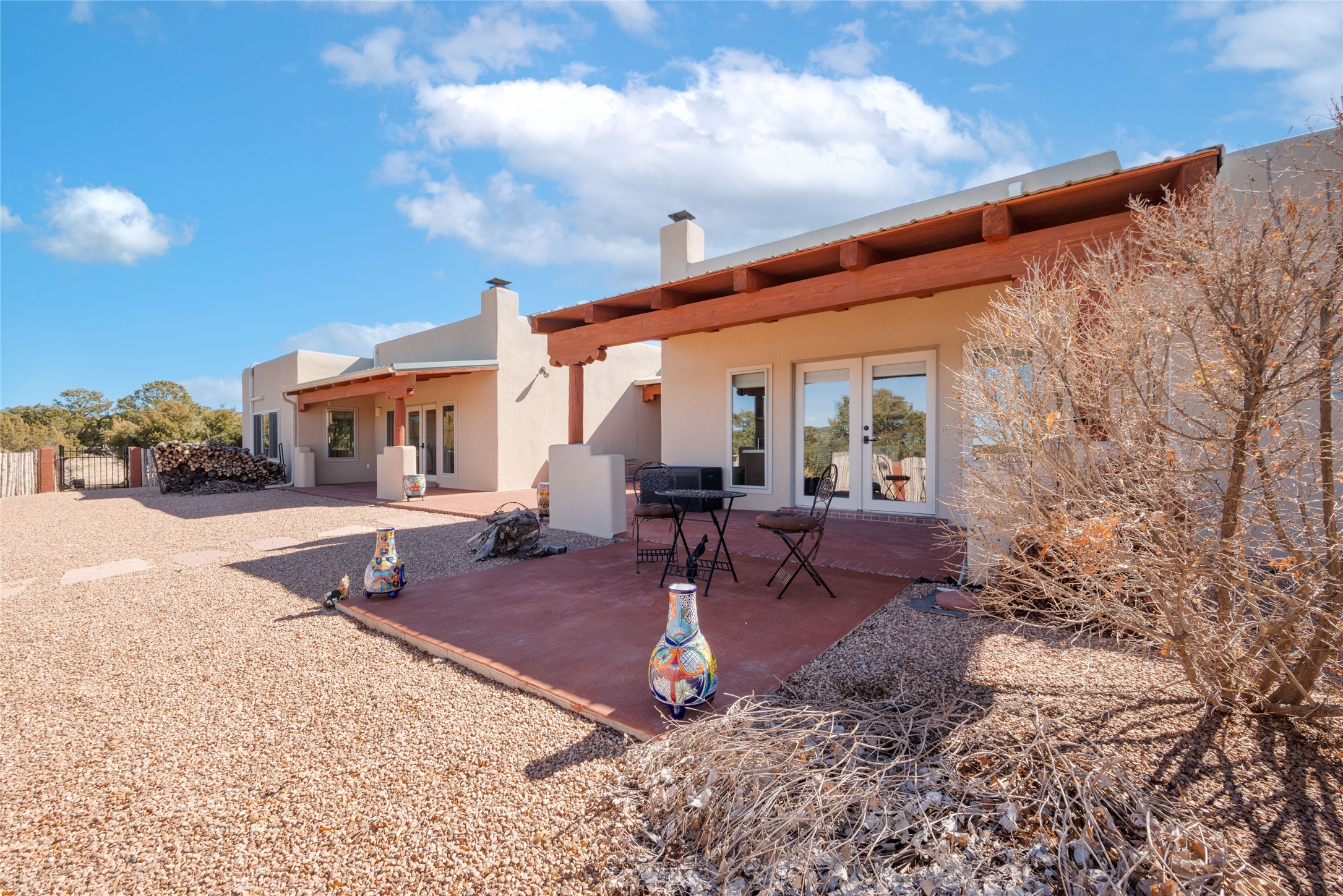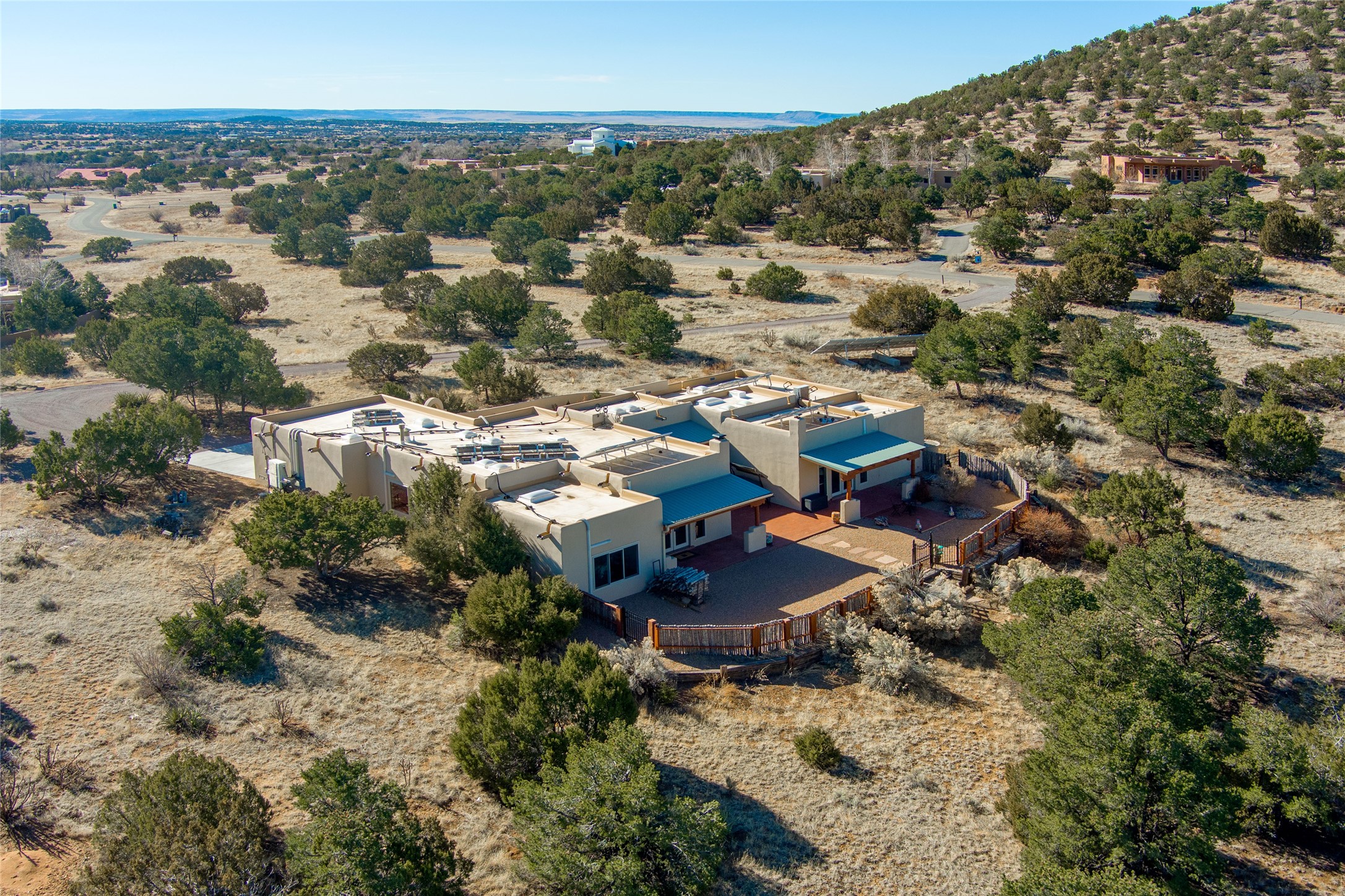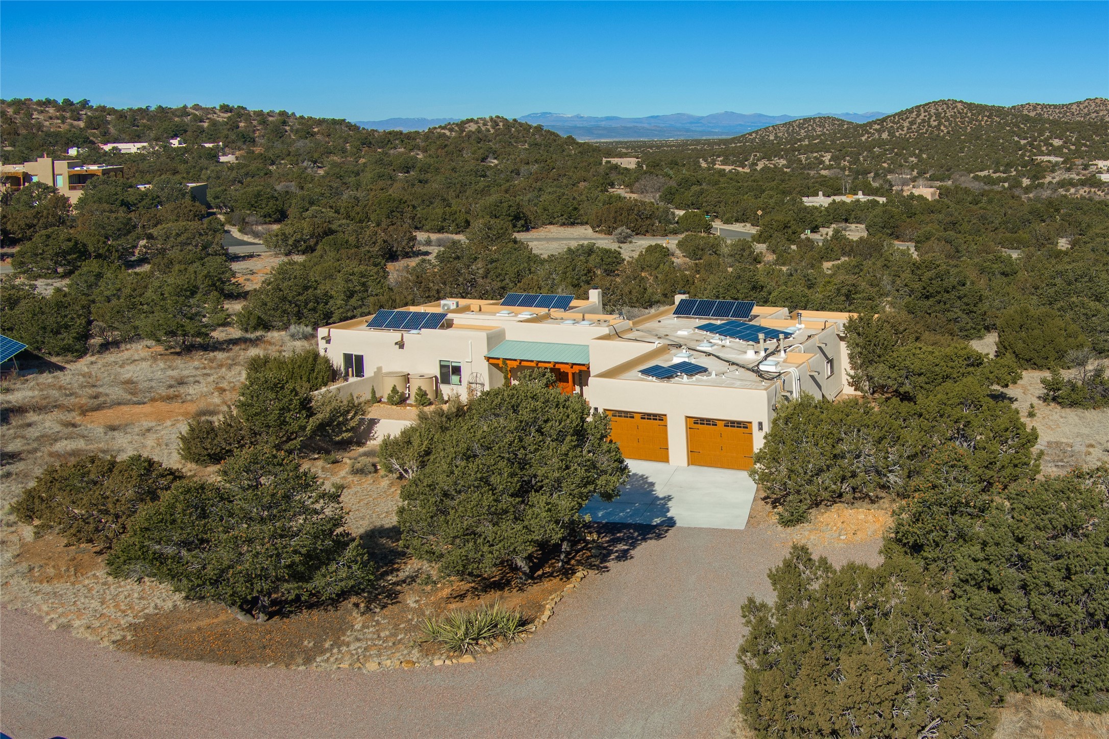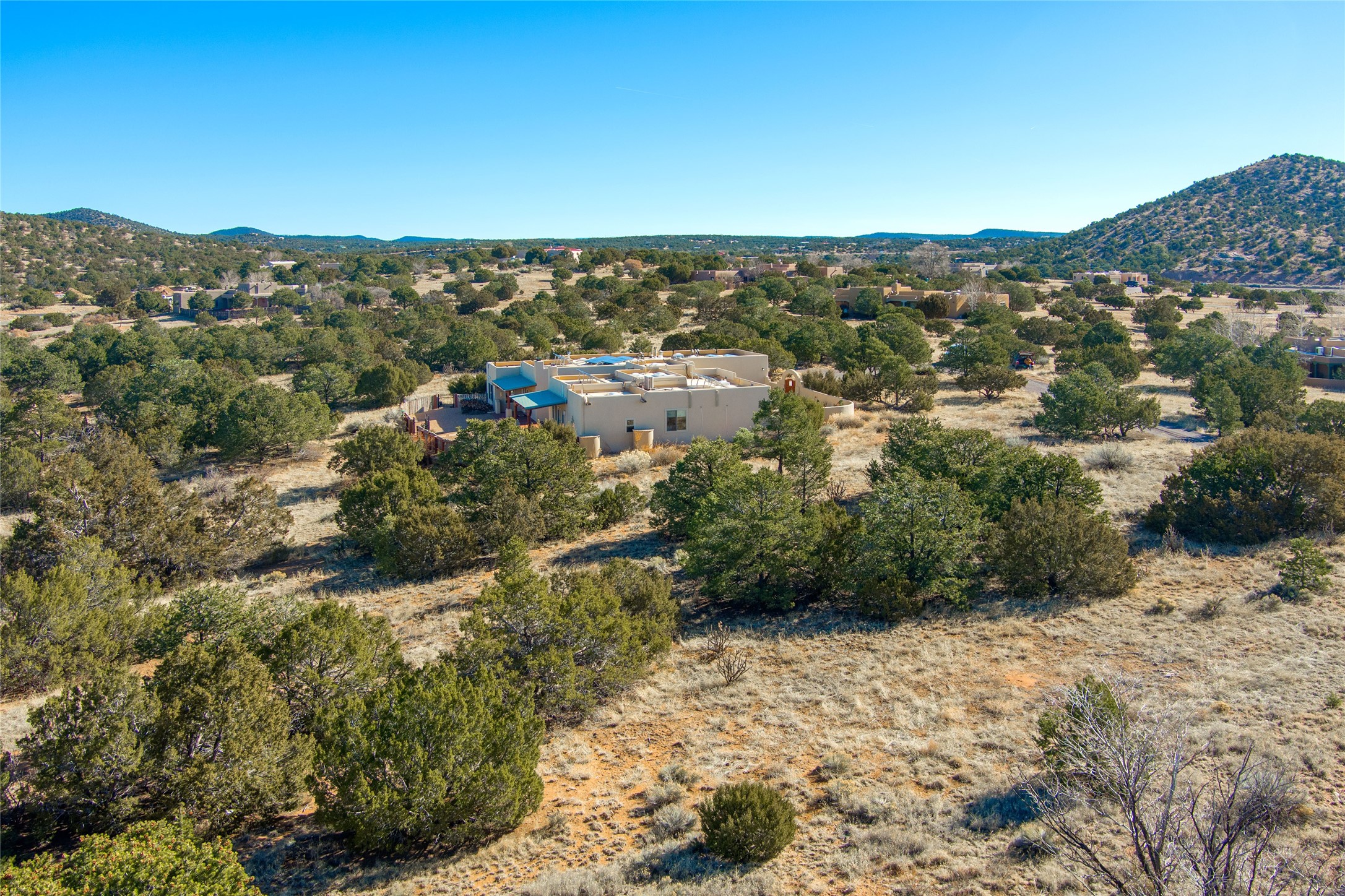Relaxed southwest elegance in a parklike setting best describes this Dos Griegos home. The hacienda-style floor plan with spacious light-filled living areas is ideal for entertaining or quiet repose. Enclosed courtyards both front and rear offer unrivaled exterior living spaces to enjoy mountain views, starry nights and dramatic New Mexico skies from the private 3+ acre property. Traditional kiva-style fireplaces adorn the living room and primary suite. A spacious and light-filled bonus room with wet-bar and min-frig is ideal for a den, office, studio or media room. The kitchen is a dream featuring expansive granite counters, abundant solid wood cabinetry and top-quality appliances including a Bertazzoni gas range from Italia. The home has been extensively updated both inside and out, from new stucco, windows, landscaping, entry and patio doors to gorgeous bathroom restyling, hardware and fixture upgrades, appliances, and on and on. A complete summary of improvements is available. The home also includes a photovoltaic solar power system providing most if not all of the home's electrical needs. Dos Griegos is located only about 15 minutes from the vibrant and historic City of Santa Fe. Nearby shopping, dining and recreation options are within minutes of the property. This is a special home on a wonderful parcel in a coveted location, the triple crown!