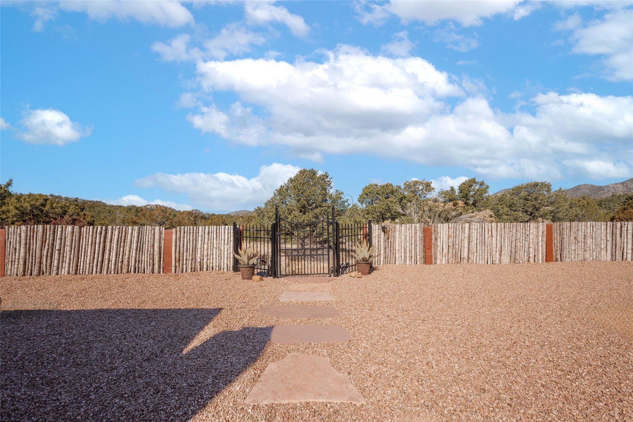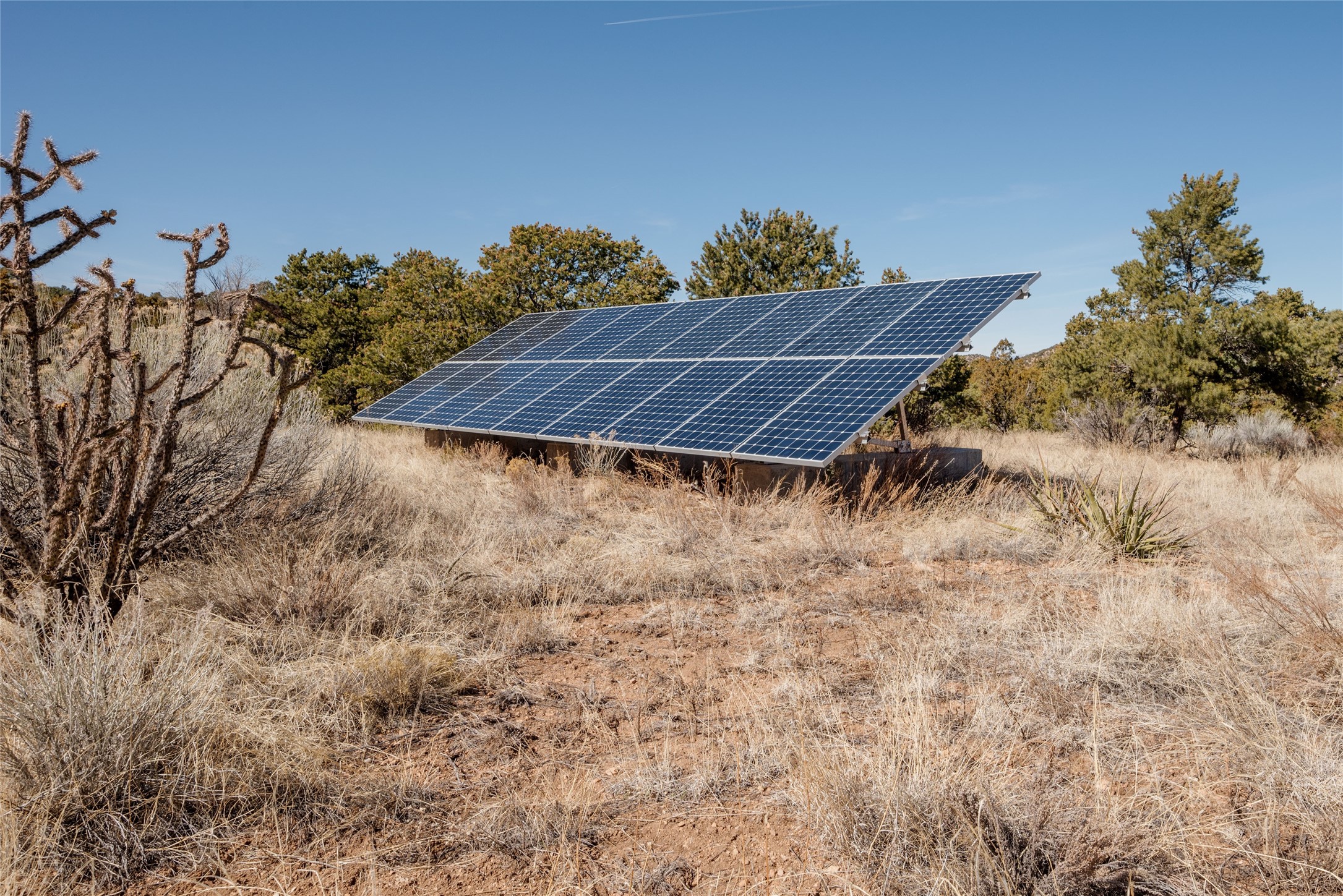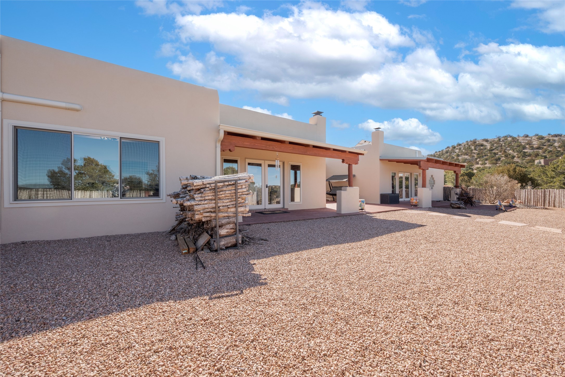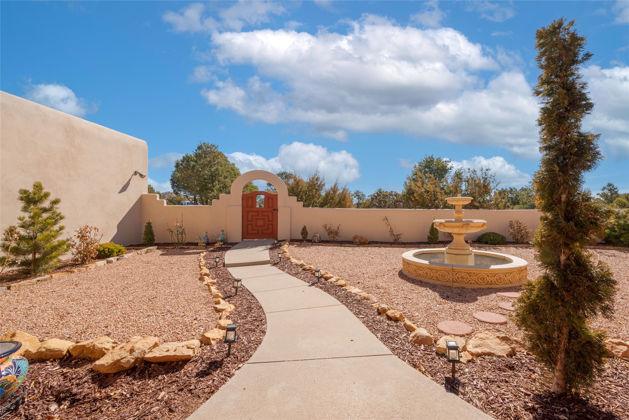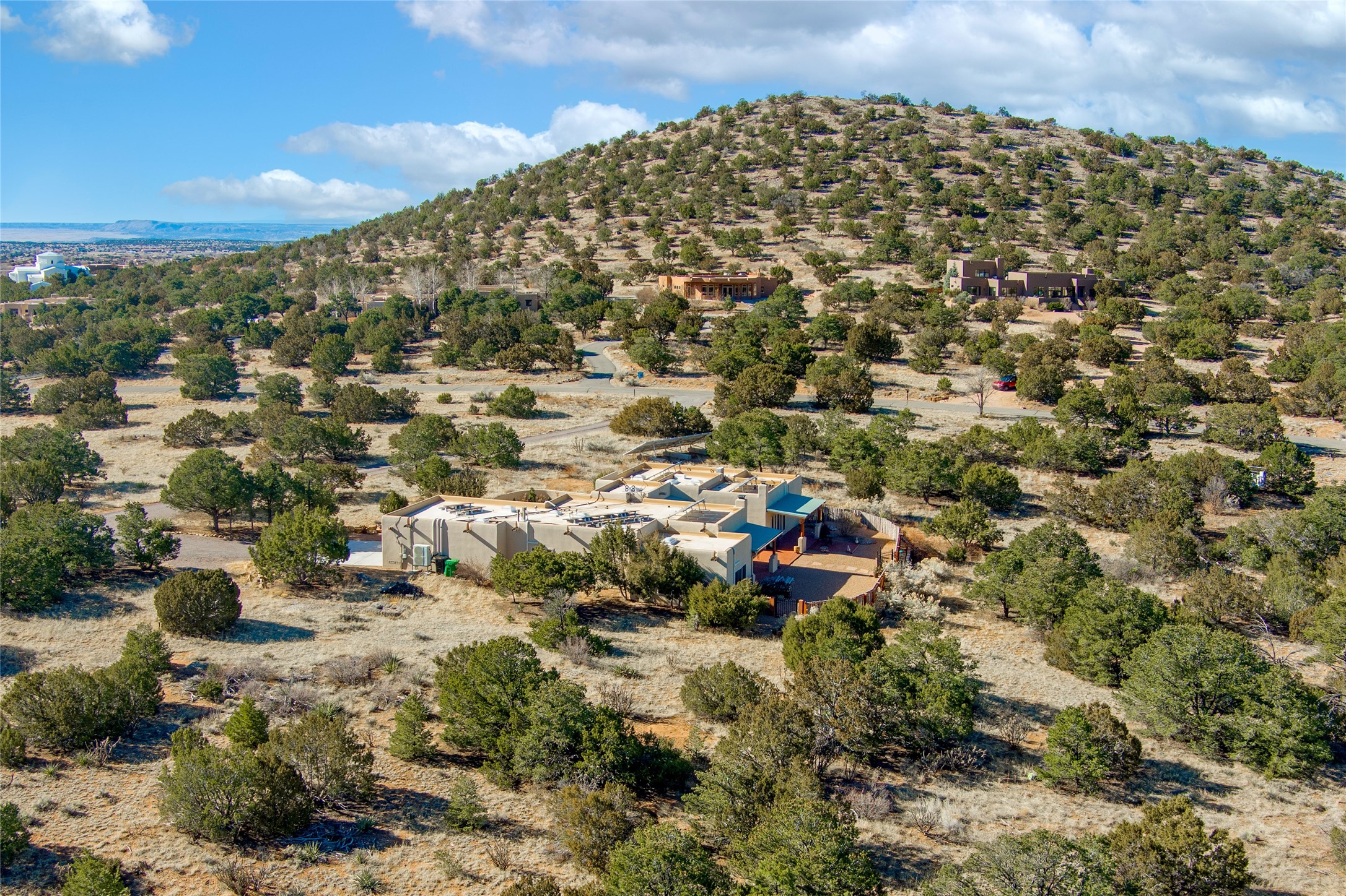 Relaxed southwest elegance in a parklike setting best describes this Dos Griegos home. The hacienda-style floor plan with spacious light-filled living areas is ideal for entertaining or quiet repose. Enclosed courtyards both front and rear offer unrivaled exterior living spaces to enjoy mountain views, starry nights and dramatic New Mexico skies from the private 3+ acre property. Traditional kiva-style fireplaces adorn the living room and primary suite. A spacious and light-filled bonus room with wet-bar and min-frig is ideal for a den, office, studio or media room. The kitchen is a dream featuring expansive granite counters, abundant solid wood cabinetry and top-quality appliances including a Bertazzoni gas range from Italia. The home has been extensively updated both inside and out, from new stucco, windows, landscaping, entry and patio doors to gorgeous bathroom restyling, hardware and fixture upgrades, appliances, and on and on. A complete summary of improvements is available. The home also includes a photovoltaic solar power system providing most if not all of the home's electrical needs. Dos Griegos is located only about 15 minutes from the vibrant and historic City of Santa Fe. Nearby shopping, dining and recreation options are within minutes of the property. This is a special home on a wonderful parcel in a coveted location, the triple crown!