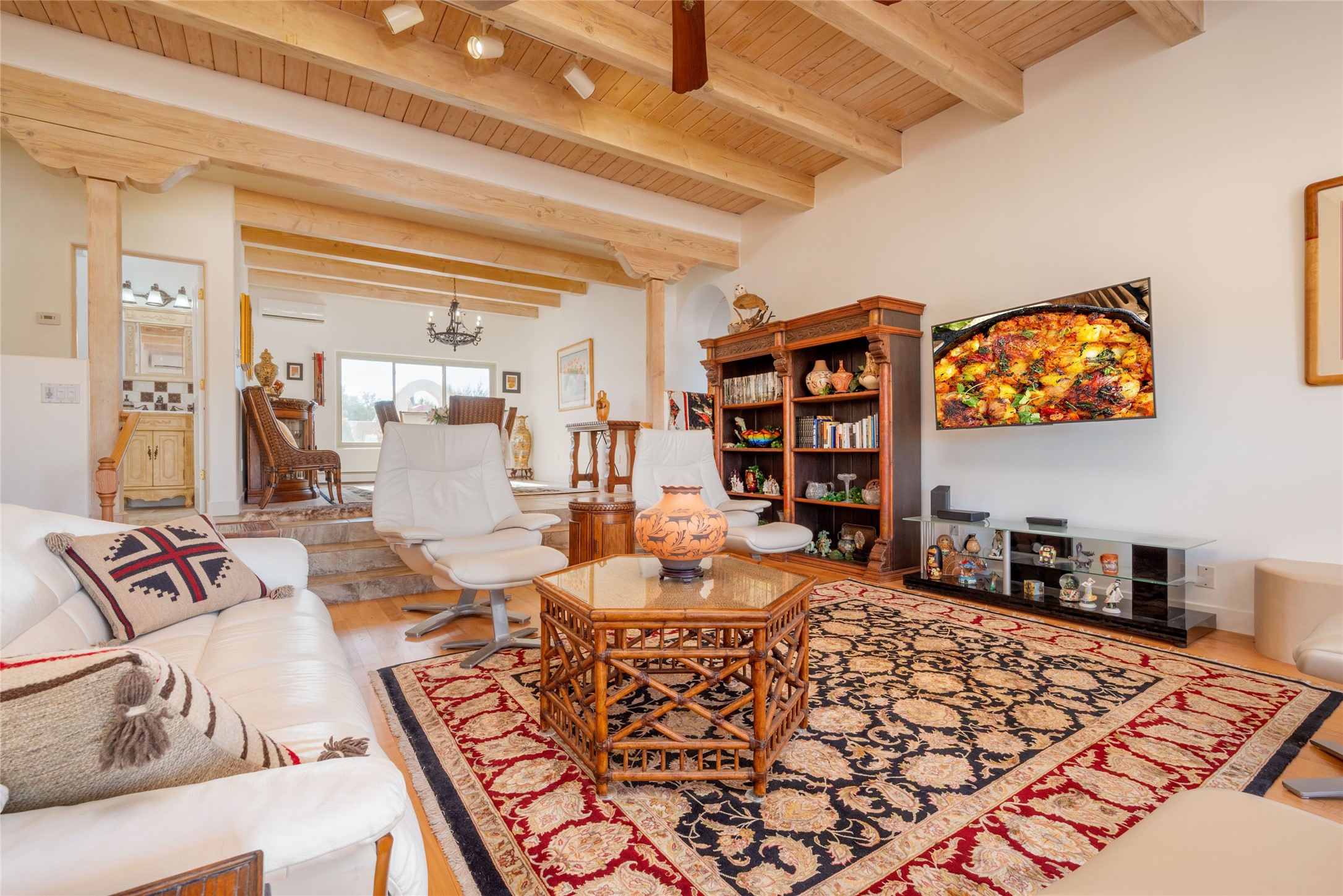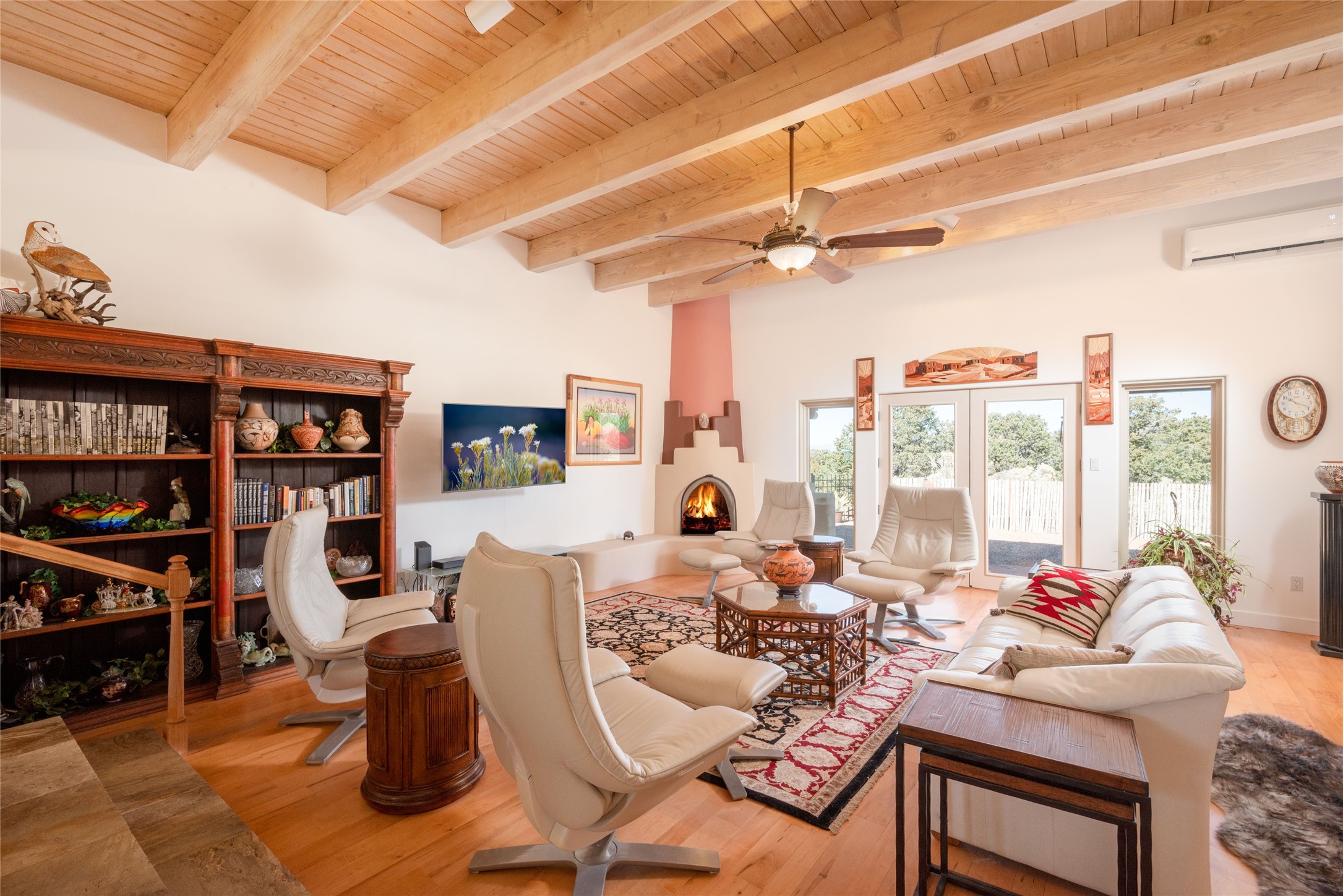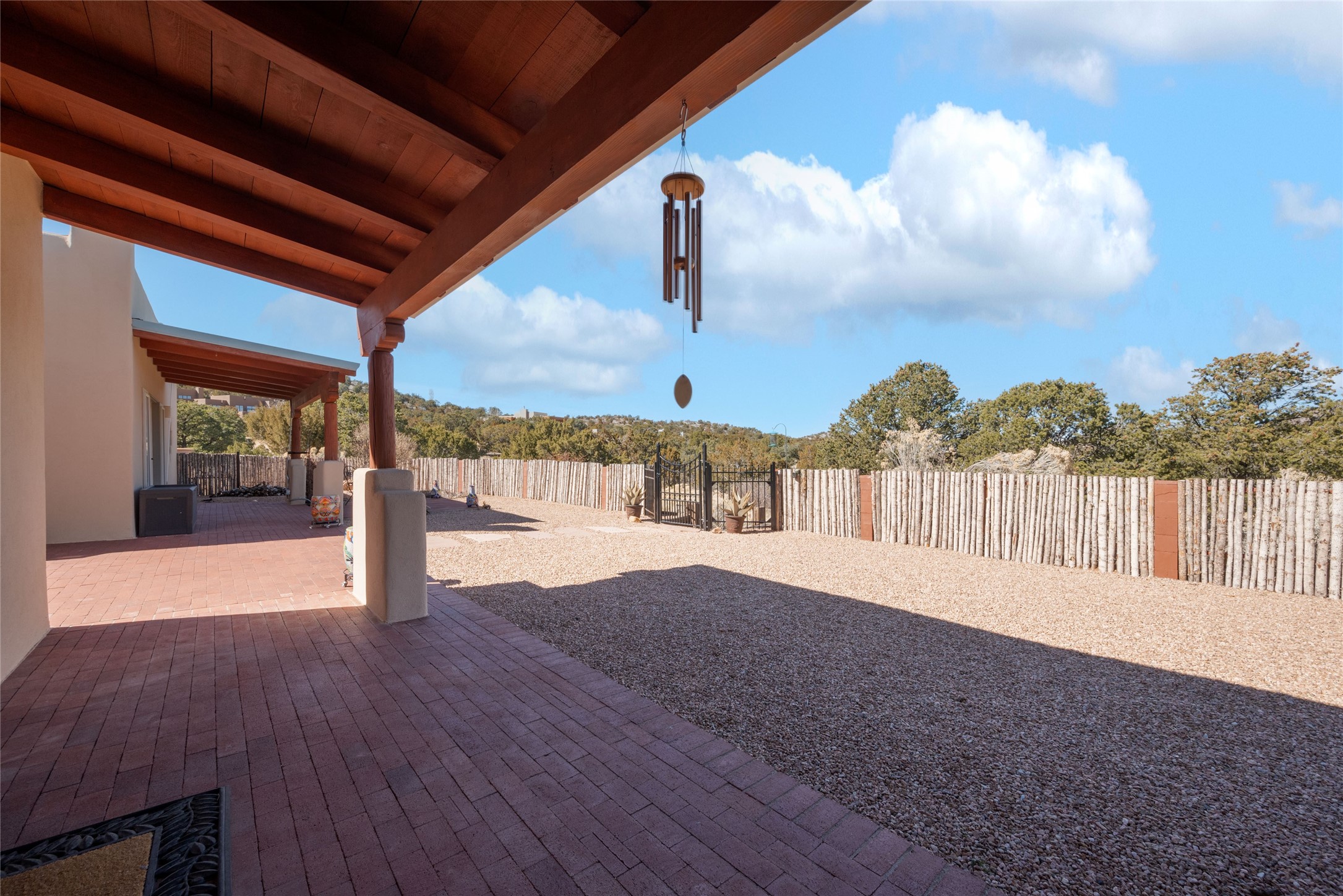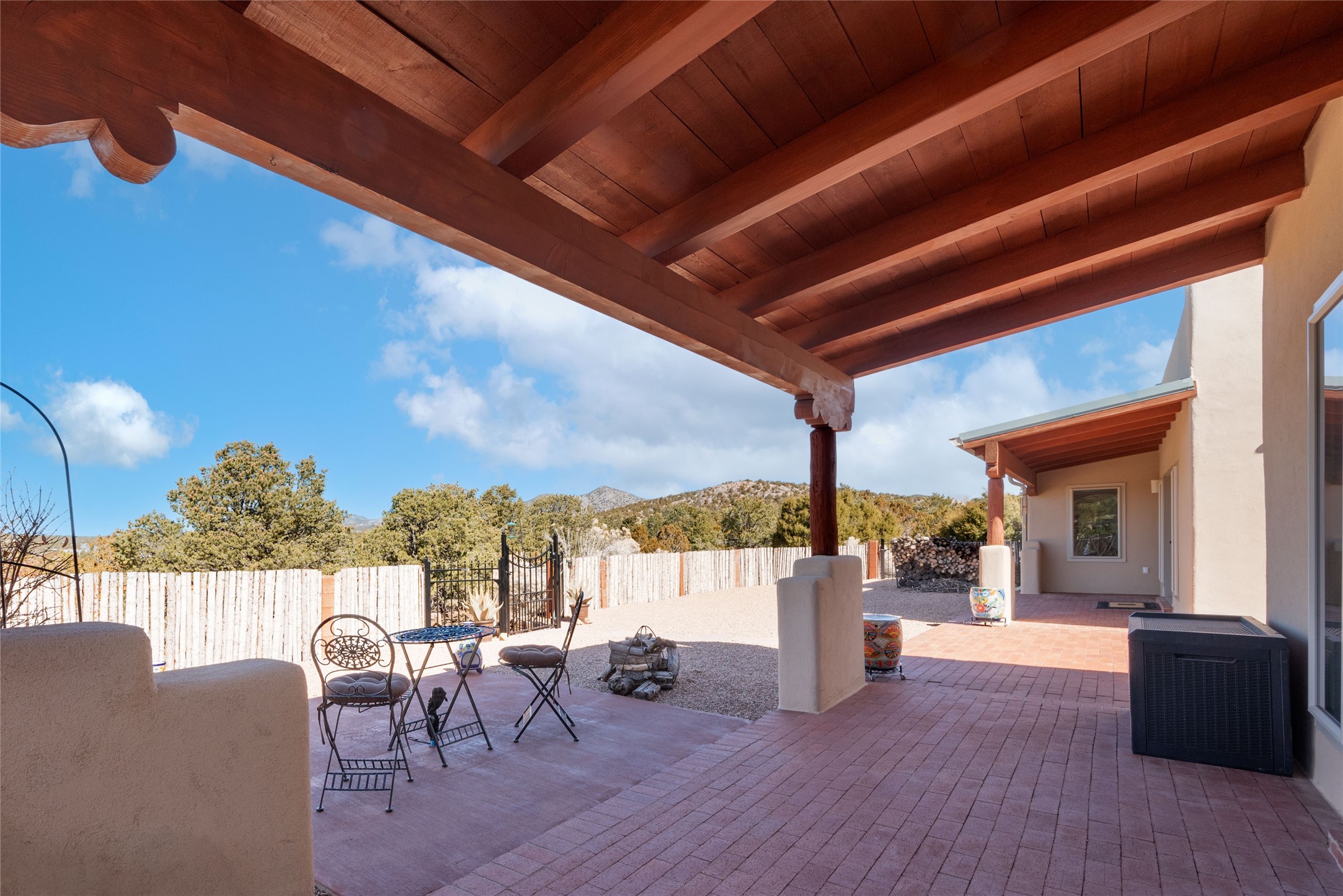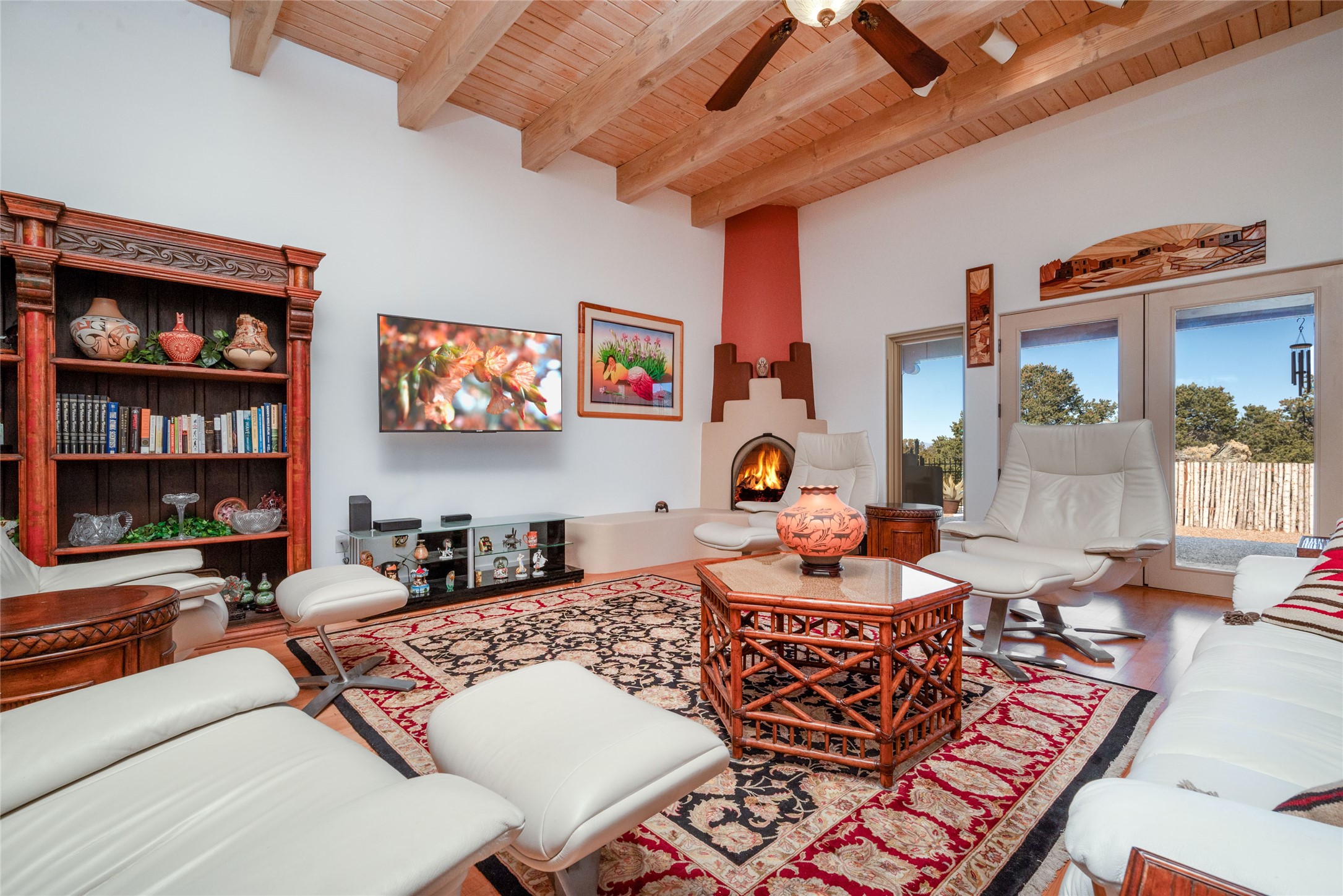 Relaxed southwest elegance in a parklike setting best describes this Dos Griegos home. The hacienda-style floor plan with spacious light-filled living areas is ideal for entertaining or quiet repose. Enclosed courtyards both front and rear offer unrivaled exterior living spaces to enjoy mountain views, starry nights and dramatic New Mexico skies from the private 3+ acre property. Traditional kiva-style fireplaces adorn the living room and primary suite. A spacious and light-filled bonus room with wet-bar and min-frig is ideal for a den, office, studio or media room. The kitchen is a dream featuring expansive granite counters, abundant solid wood cabinetry and top-quality appliances including a Bertazzoni gas range from Italia. The home has been extensively updated both inside and out, from new stucco, windows, landscaping, entry and patio doors to gorgeous bathroom restyling, hardware and fixture upgrades, appliances, and on and on. A complete summary of improvements is available. The home also includes a photovoltaic solar power system providing most if not all of the home's electrical needs. Dos Griegos is located only about 15 minutes from the vibrant and historic City of Santa Fe. Nearby shopping, dining and recreation options are within minutes of the property. This is a special home on a wonderful parcel in a coveted location, the triple crown!