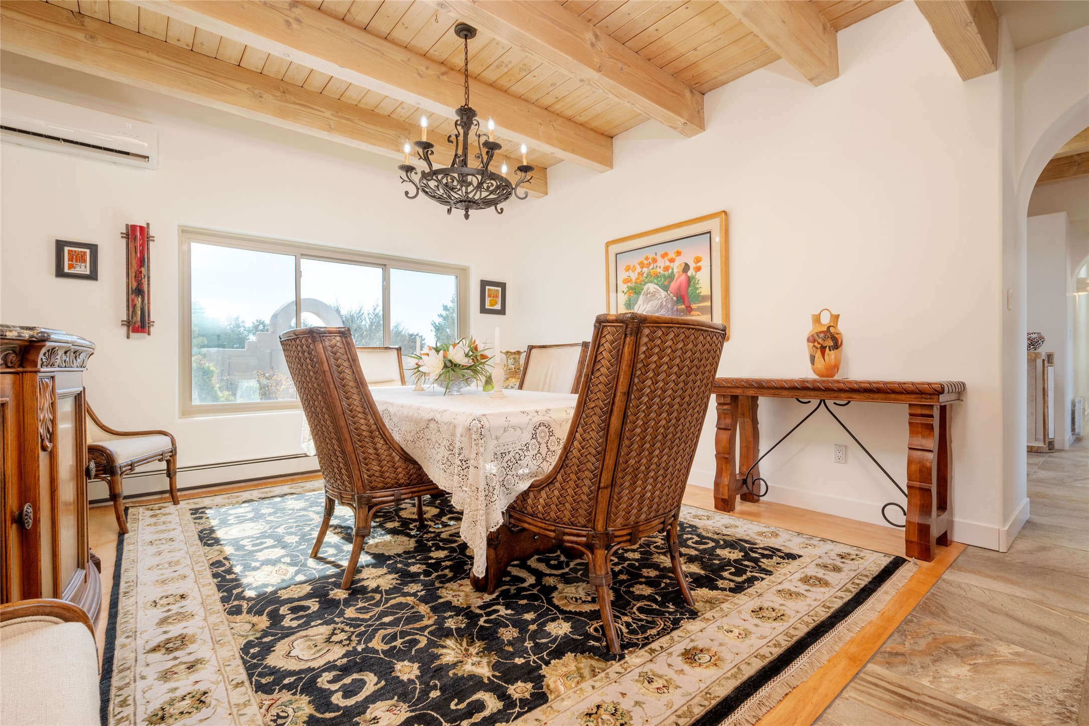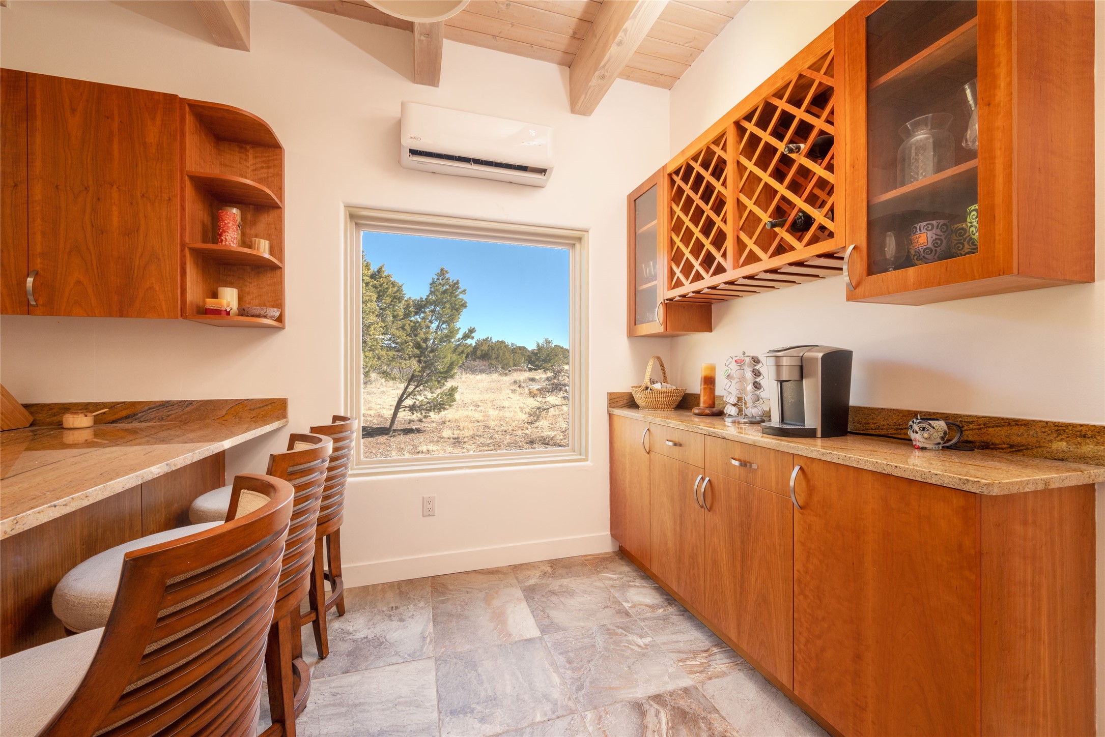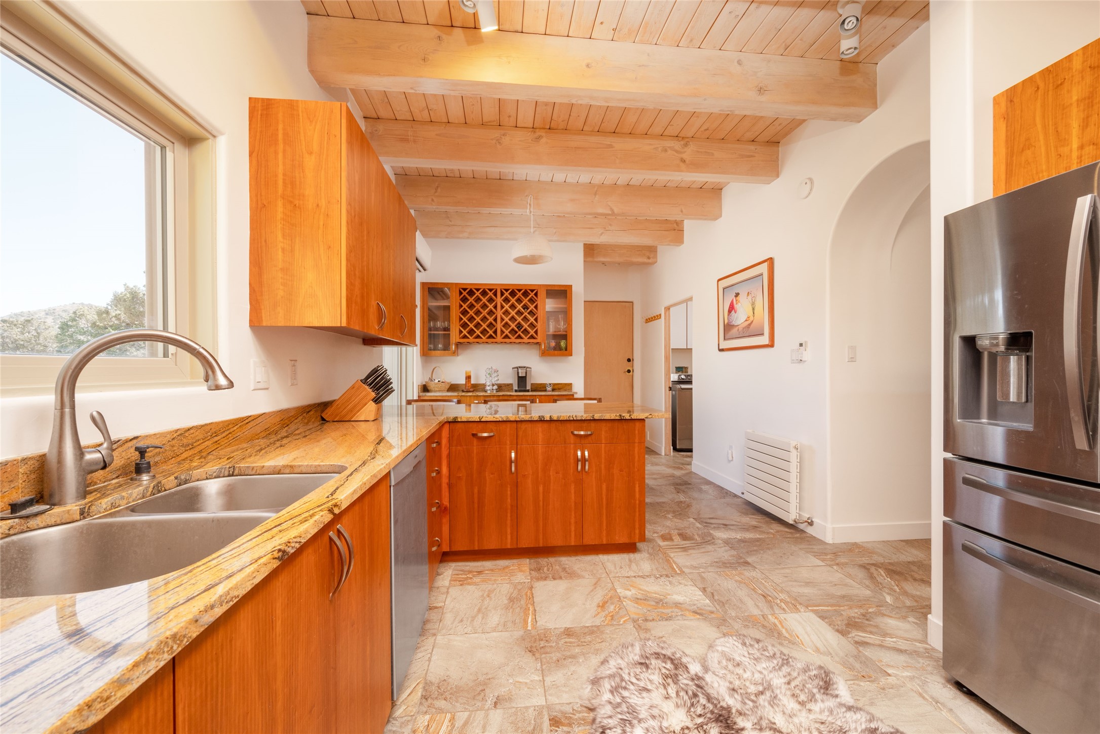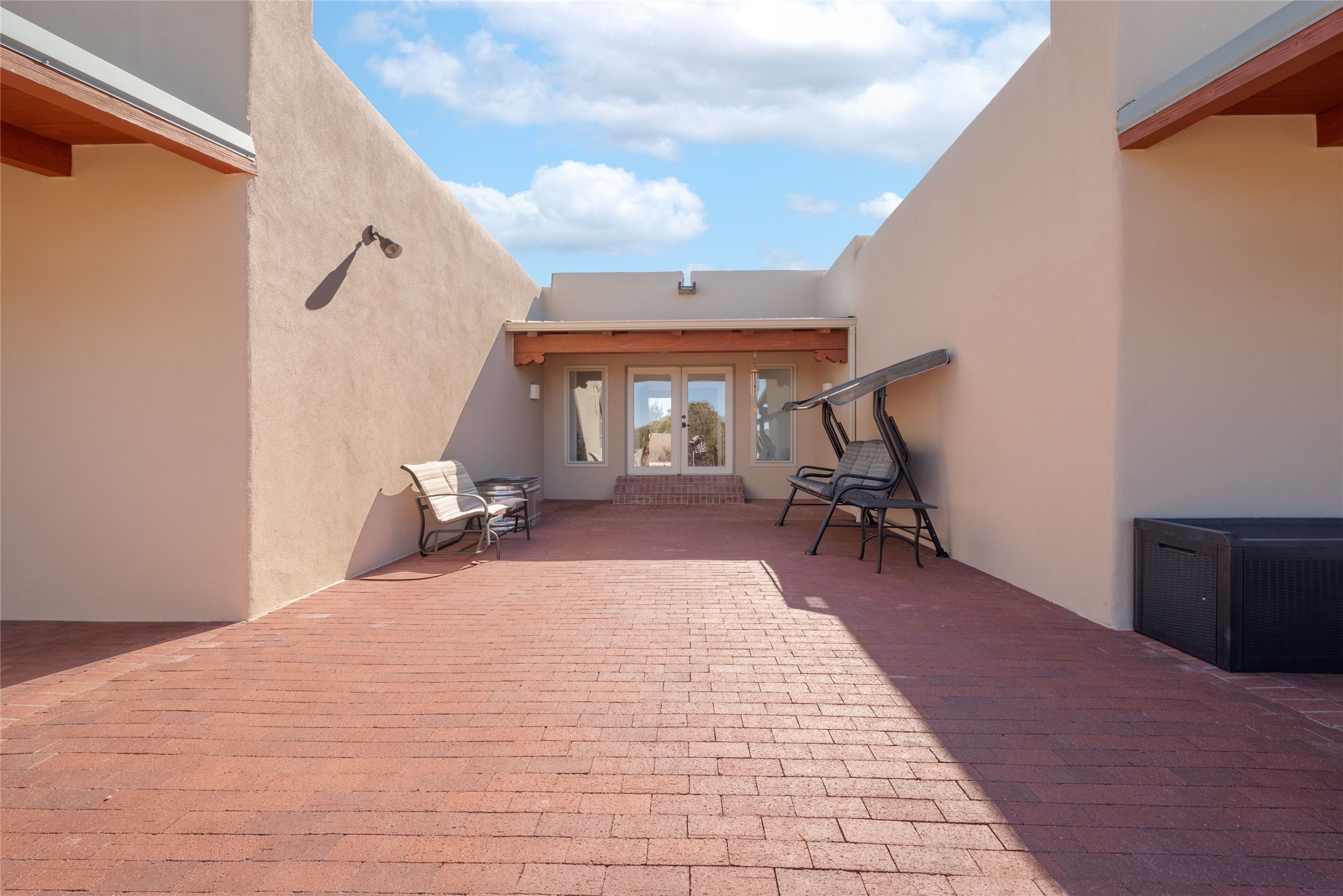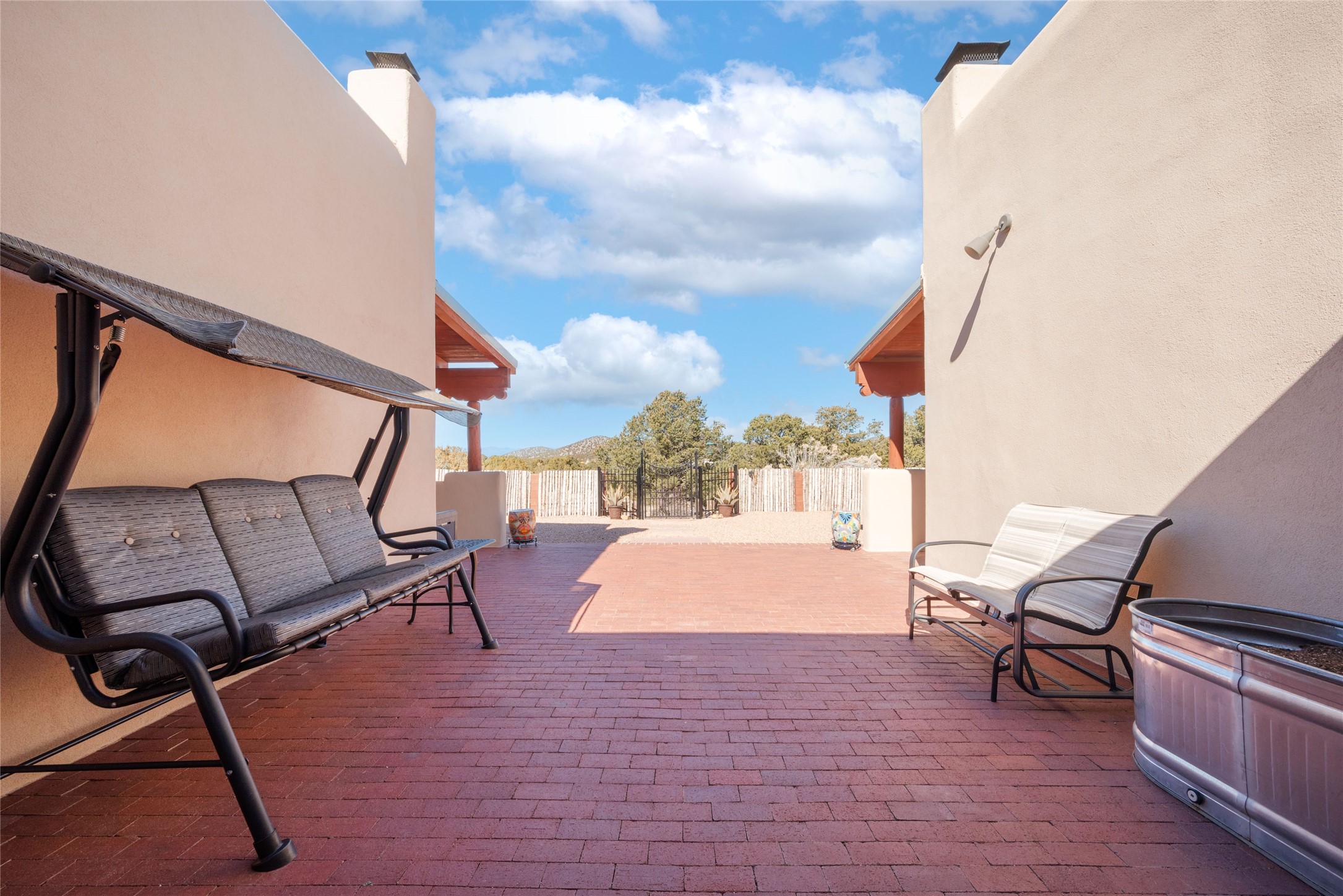 Relaxed southwest elegance in a parklike setting best describes this Dos Griegos home. The hacienda-style floor plan with spacious light-filled living areas is ideal for entertaining or quiet repose. Enclosed courtyards both front and rear offer unrivaled exterior living spaces to enjoy mountain views, starry nights and dramatic New Mexico skies from the private 3+ acre property. Traditional kiva-style fireplaces adorn the living room and primary suite. A spacious and light-filled bonus room with wet-bar and min-frig is ideal for a den, office, studio or media room. The kitchen is a dream featuring expansive granite counters, abundant solid wood cabinetry and top-quality appliances including a Bertazzoni gas range from Italia. The home has been extensively updated both inside and out, from new stucco, windows, landscaping, entry and patio doors to gorgeous bathroom restyling, hardware and fixture upgrades, appliances, and on and on. A complete summary of improvements is available. The home also includes a photovoltaic solar power system providing most if not all of the home's electrical needs. Dos Griegos is located only about 15 minutes from the vibrant and historic City of Santa Fe. Nearby shopping, dining and recreation options are within minutes of the property. This is a special home on a wonderful parcel in a coveted location, the triple crown!