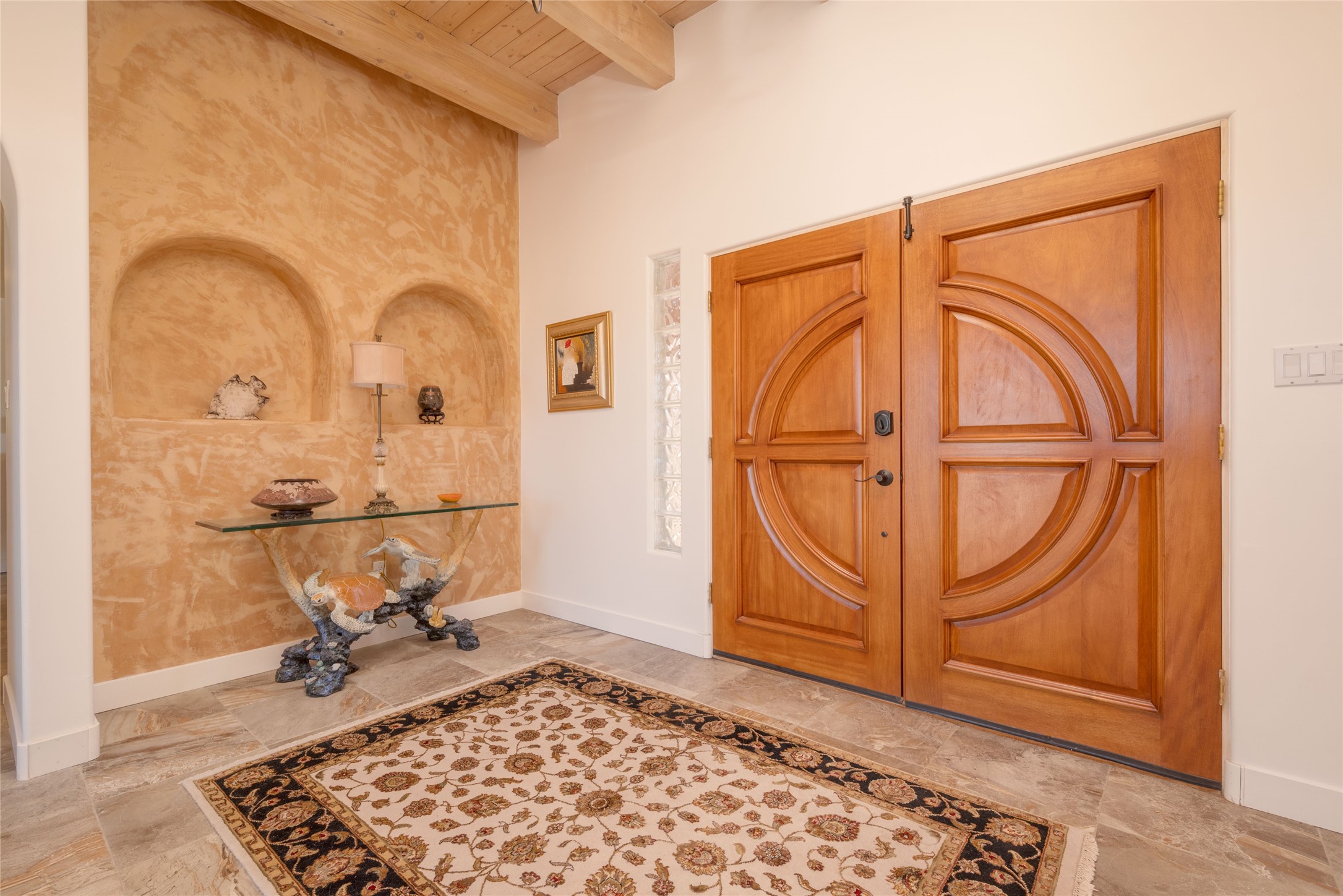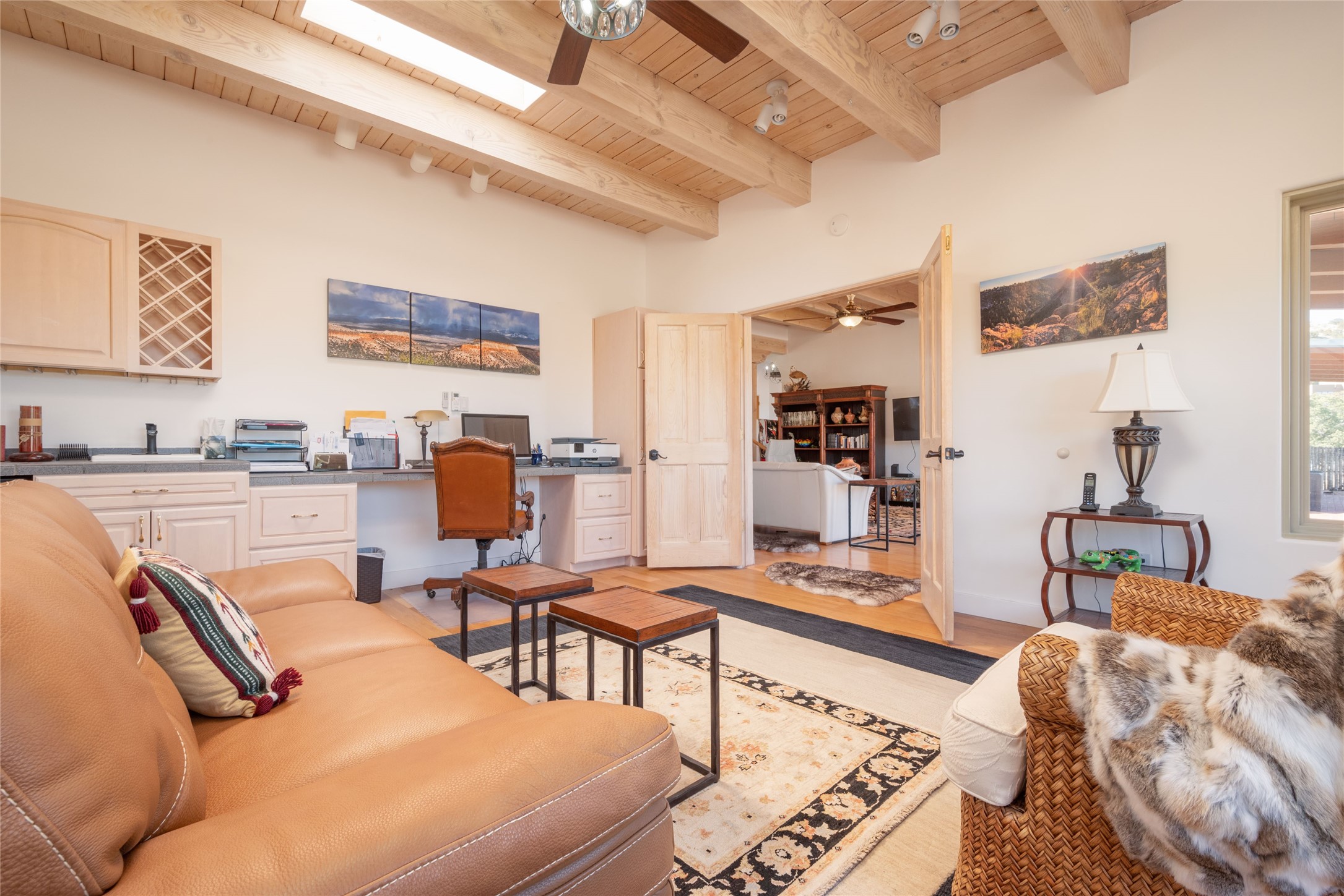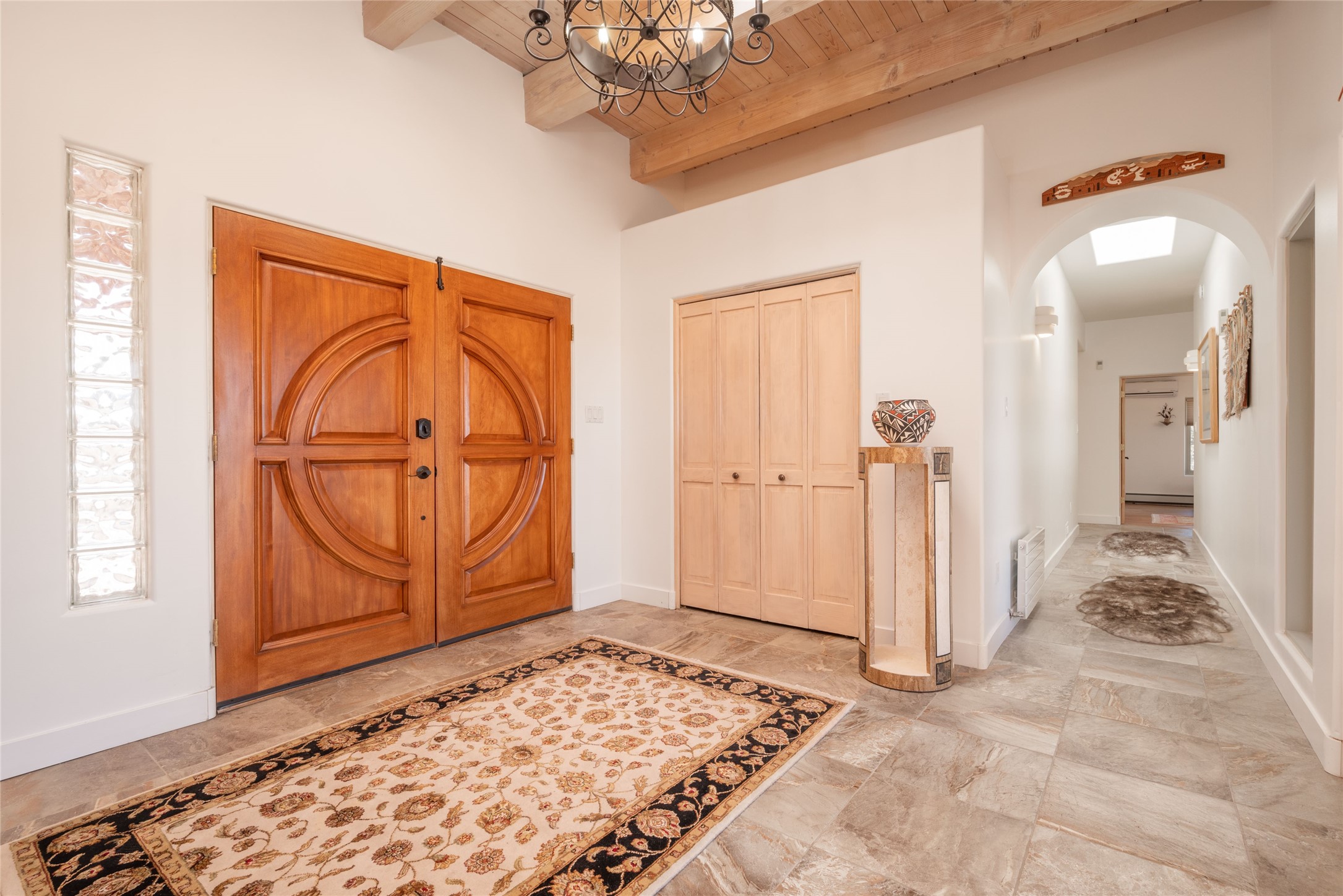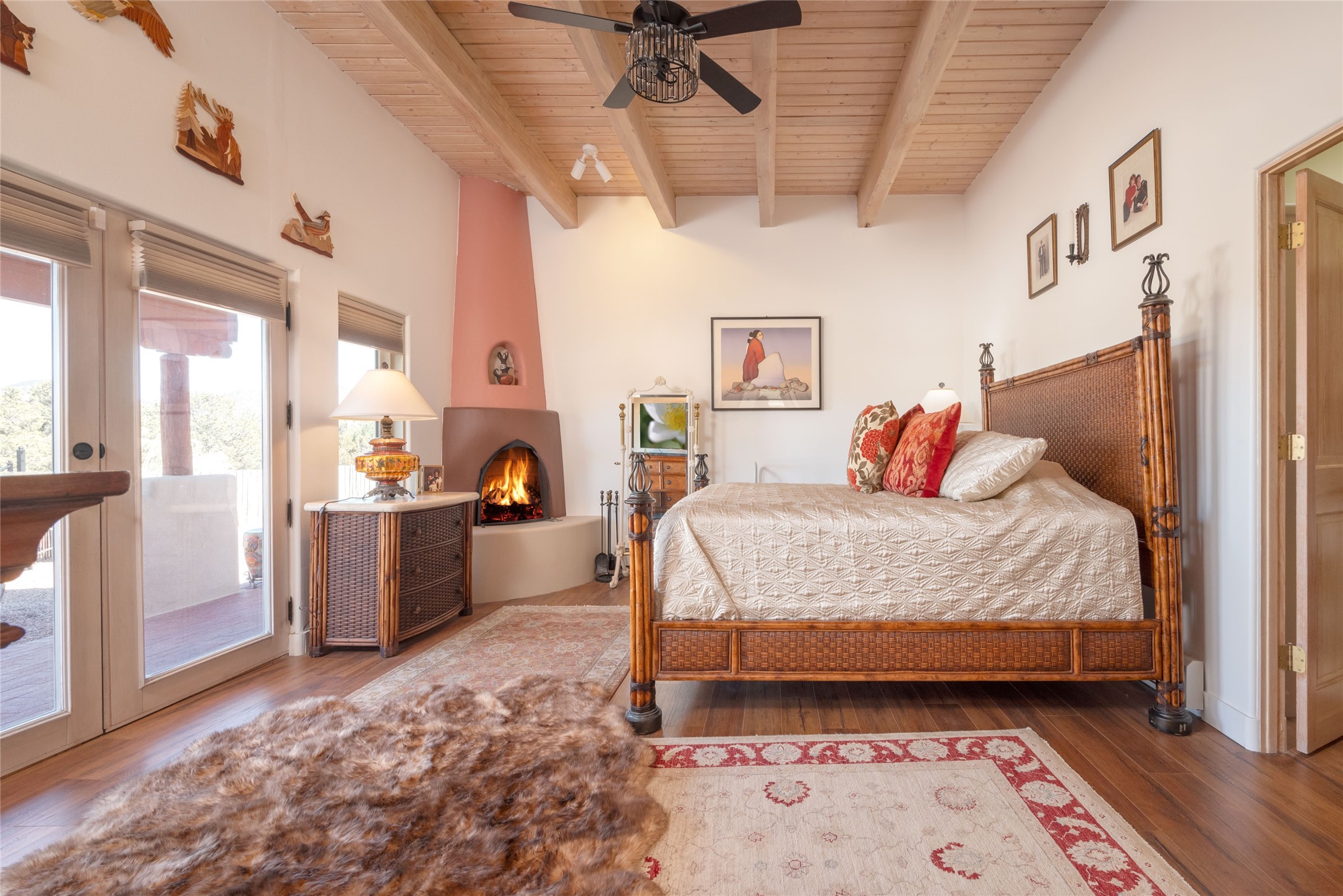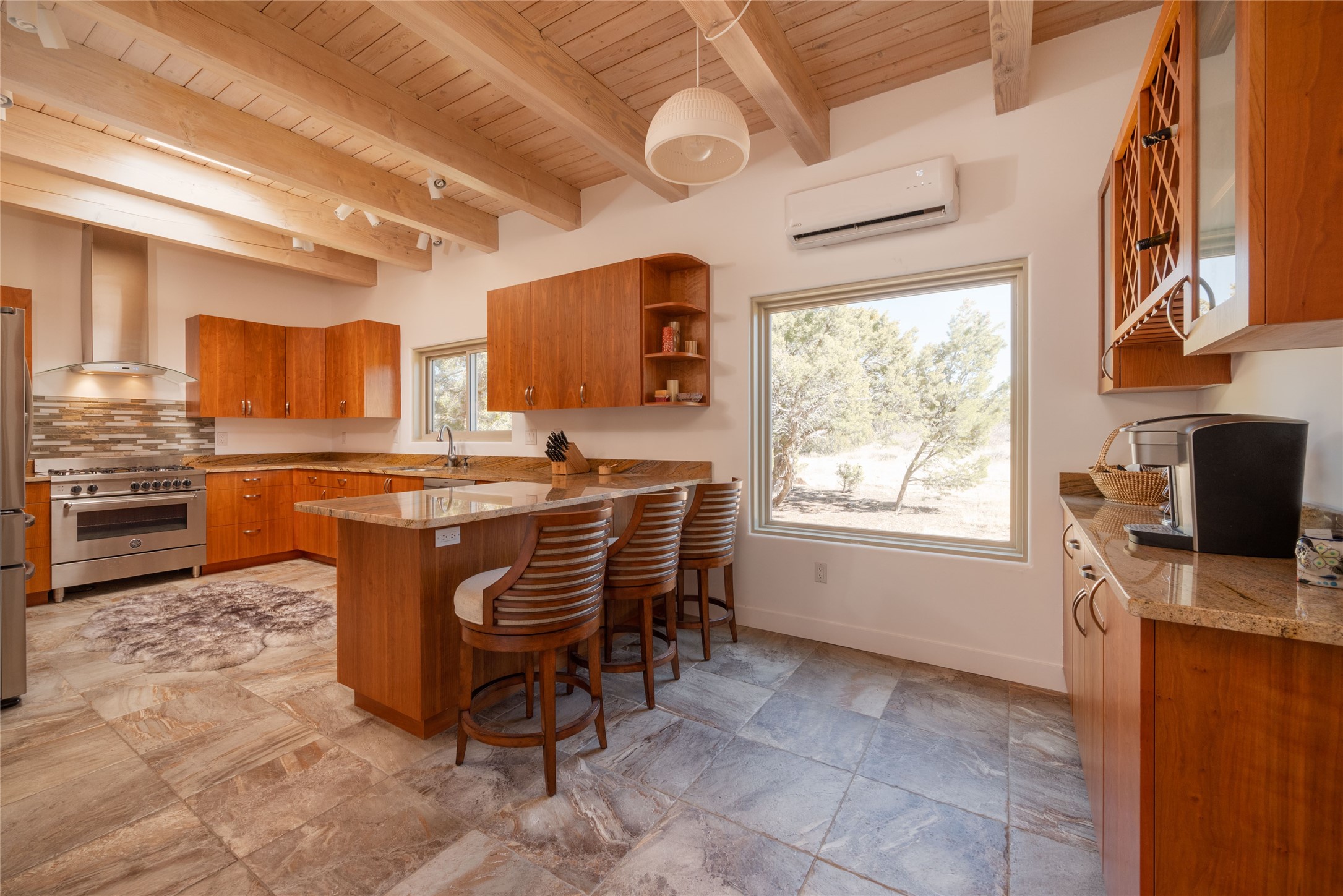 Relaxed southwest elegance in a parklike setting best describes this Dos Griegos home. The hacienda-style floor plan with spacious light-filled living areas is ideal for entertaining or quiet repose. Enclosed courtyards both front and rear offer unrivaled exterior living spaces to enjoy mountain views, starry nights and dramatic New Mexico skies from the private 3+ acre property. Traditional kiva-style fireplaces adorn the living room and primary suite. A spacious and light-filled bonus room with wet-bar and min-frig is ideal for a den, office, studio or media room. The kitchen is a dream featuring expansive granite counters, abundant solid wood cabinetry and top-quality appliances including a Bertazzoni gas range from Italia. The home has been extensively updated both inside and out, from new stucco, windows, landscaping, entry and patio doors to gorgeous bathroom restyling, hardware and fixture upgrades, appliances, and on and on. A complete summary of improvements is available. The home also includes a photovoltaic solar power system providing most if not all of the home's electrical needs. Dos Griegos is located only about 15 minutes from the vibrant and historic City of Santa Fe. Nearby shopping, dining and recreation options are within minutes of the property. This is a special home on a wonderful parcel in a coveted location, the triple crown!
