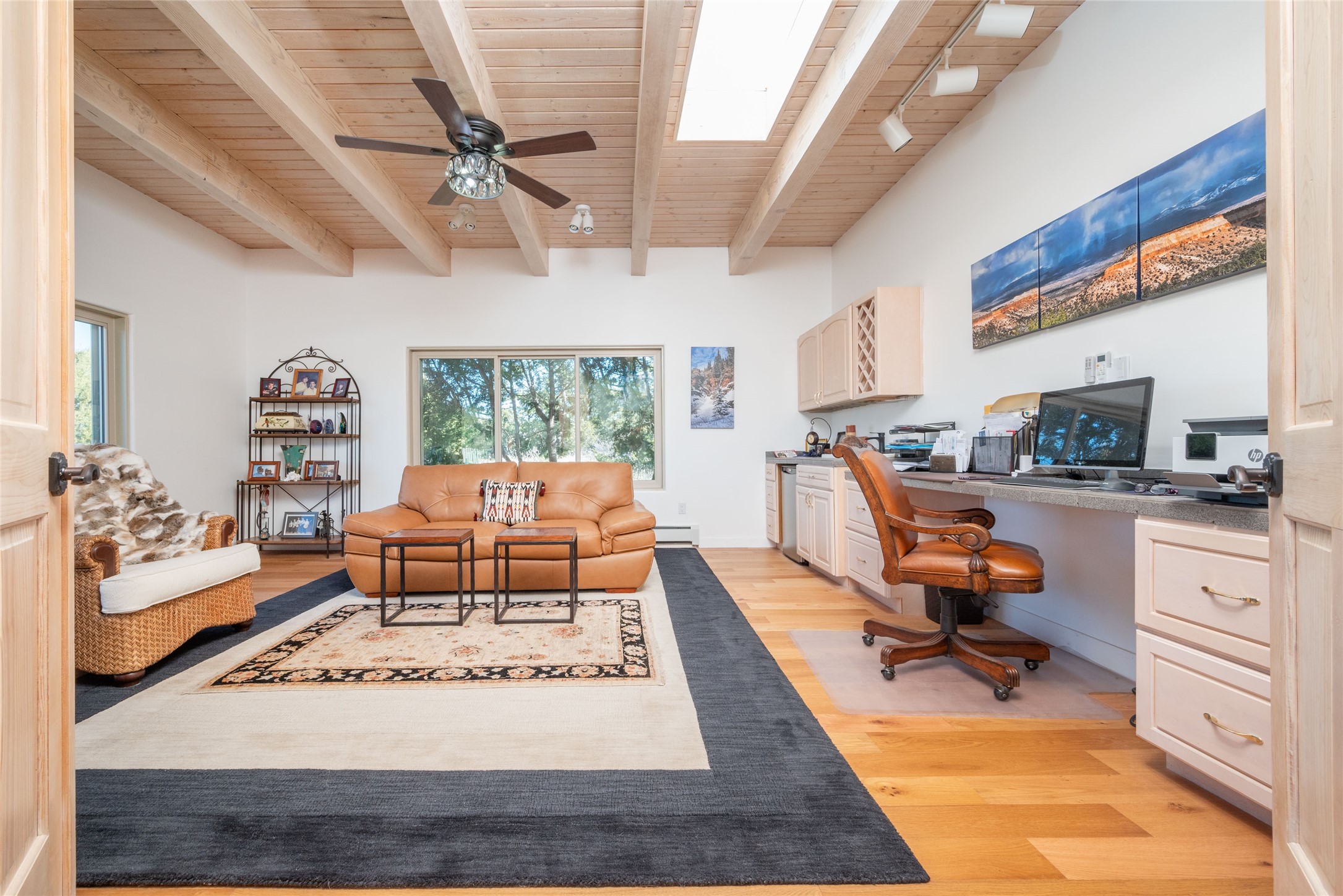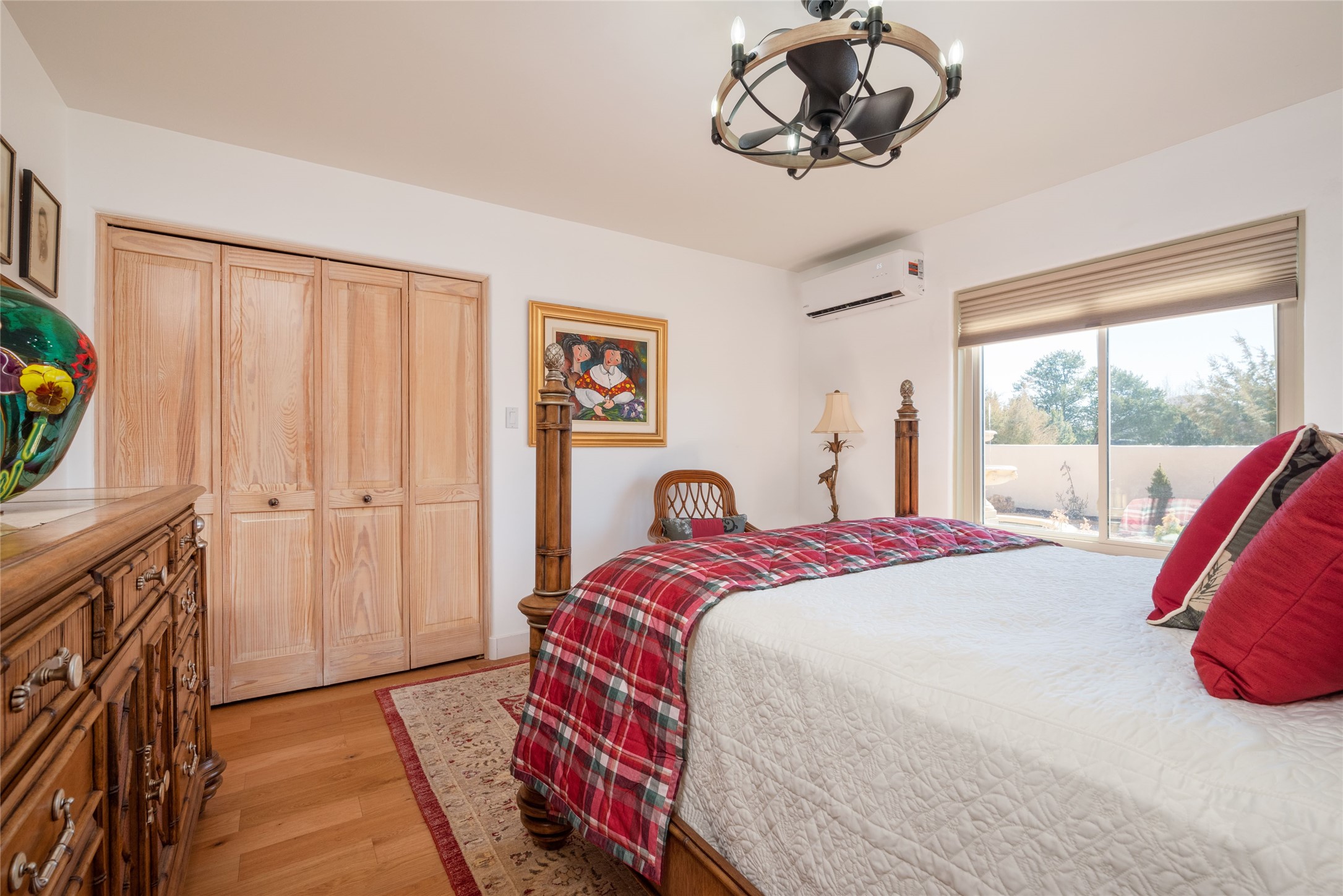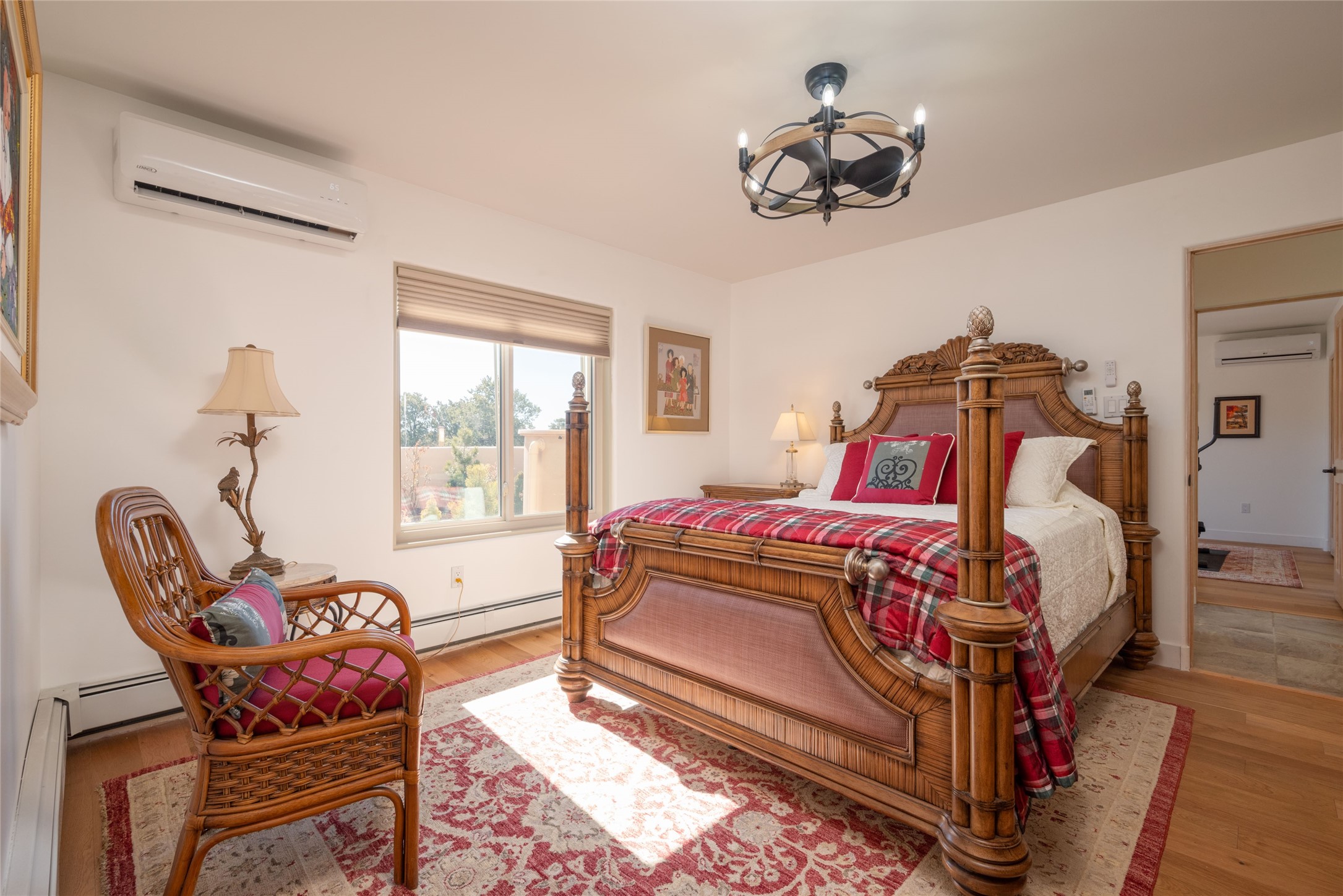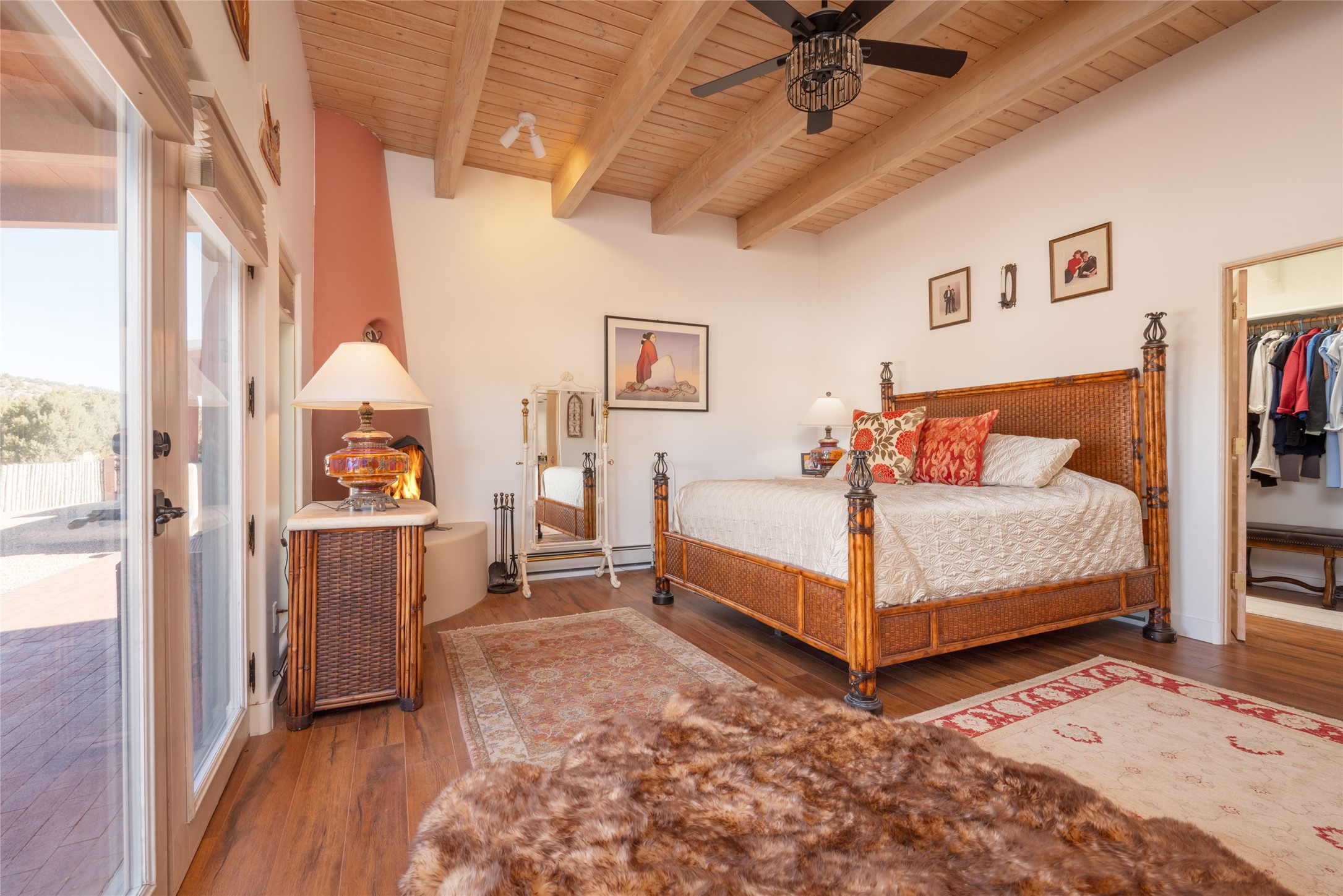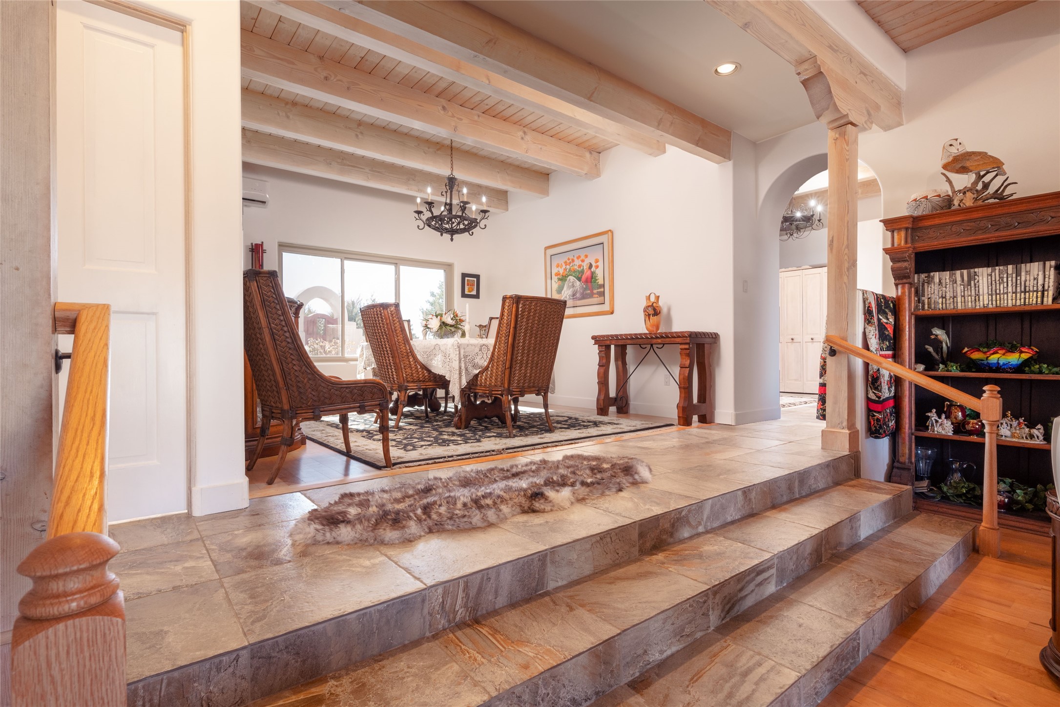 Relaxed southwest elegance in a parklike setting best describes this Dos Griegos home. The hacienda-style floor plan with spacious light-filled living areas is ideal for entertaining or quiet repose. Enclosed courtyards both front and rear offer unrivaled exterior living spaces to enjoy mountain views, starry nights and dramatic New Mexico skies from the private 3+ acre property. Traditional kiva-style fireplaces adorn the living room and primary suite. A spacious and light-filled bonus room with wet-bar and min-frig is ideal for a den, office, studio or media room. The kitchen is a dream featuring expansive granite counters, abundant solid wood cabinetry and top-quality appliances including a Bertazzoni gas range from Italia. The home has been extensively updated both inside and out, from new stucco, windows, landscaping, entry and patio doors to gorgeous bathroom restyling, hardware and fixture upgrades, appliances, and on and on. A complete summary of improvements is available. The home also includes a photovoltaic solar power system providing most if not all of the home's electrical needs. Dos Griegos is located only about 15 minutes from the vibrant and historic City of Santa Fe. Nearby shopping, dining and recreation options are within minutes of the property. This is a special home on a wonderful parcel in a coveted location, the triple crown!